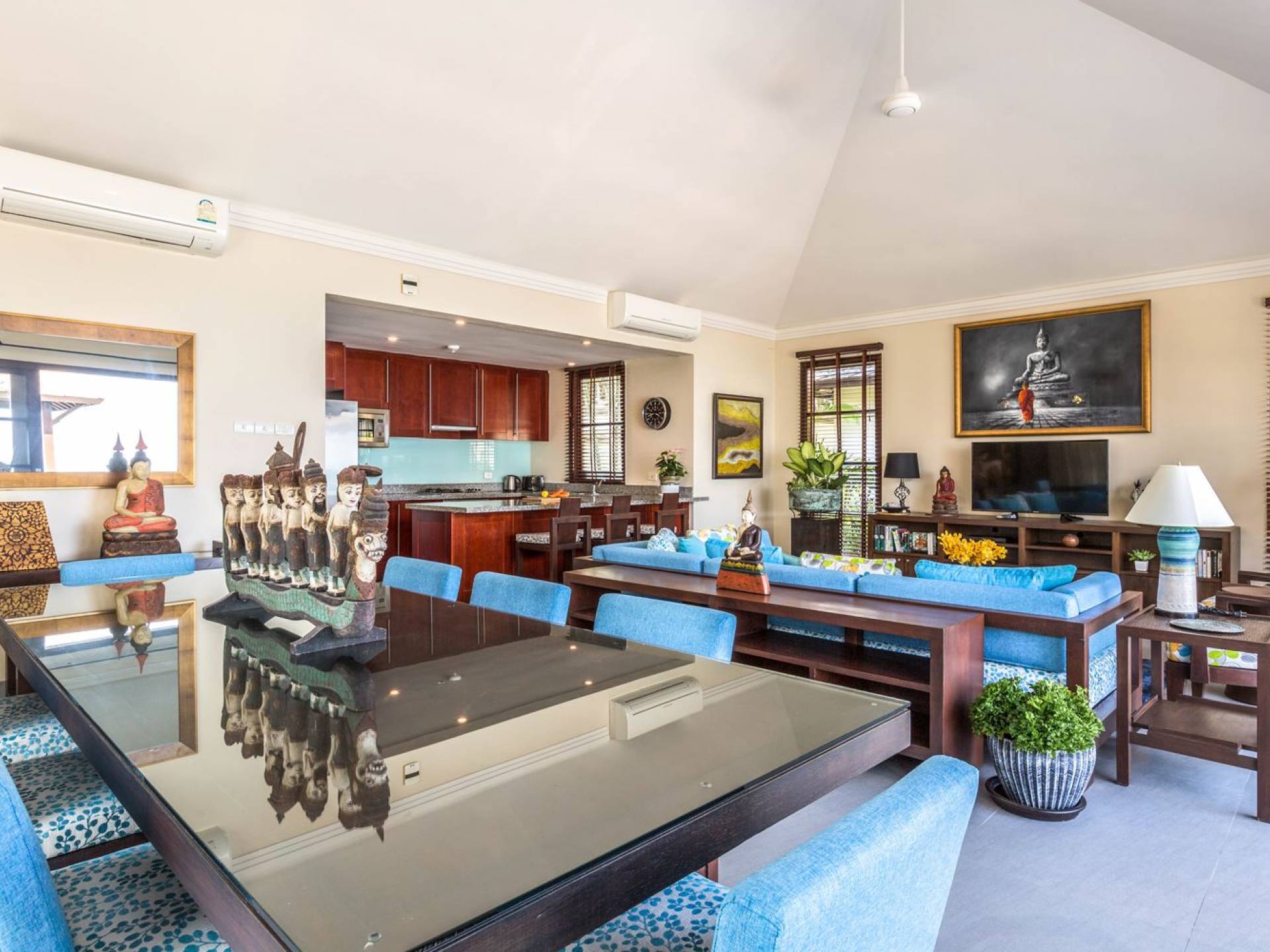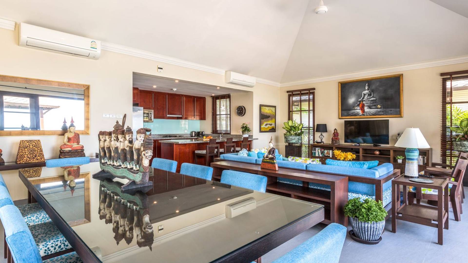 Just 10m to the sand and water’s edge, This exquisite property sprawls over four separate pavilions laid out in a U-pattern overlooking the vast outside terrace area and infinity pool – all at ground level for ease of access, and with beautiful sea panoramas. The main pavilion comprises the spacious LDK (Lounge, Dining Room, and Kitchen). Having ample seating for up to 9 guests, a full Western-style kitchen, satellite Smart TV, DVD player, and full-width sliding doors onto the pool terrace boasting the stunning panoramic vistas over the sparkling Gulf of Thailand! Attached to the LDK is a utility room with an automatic washing machine.