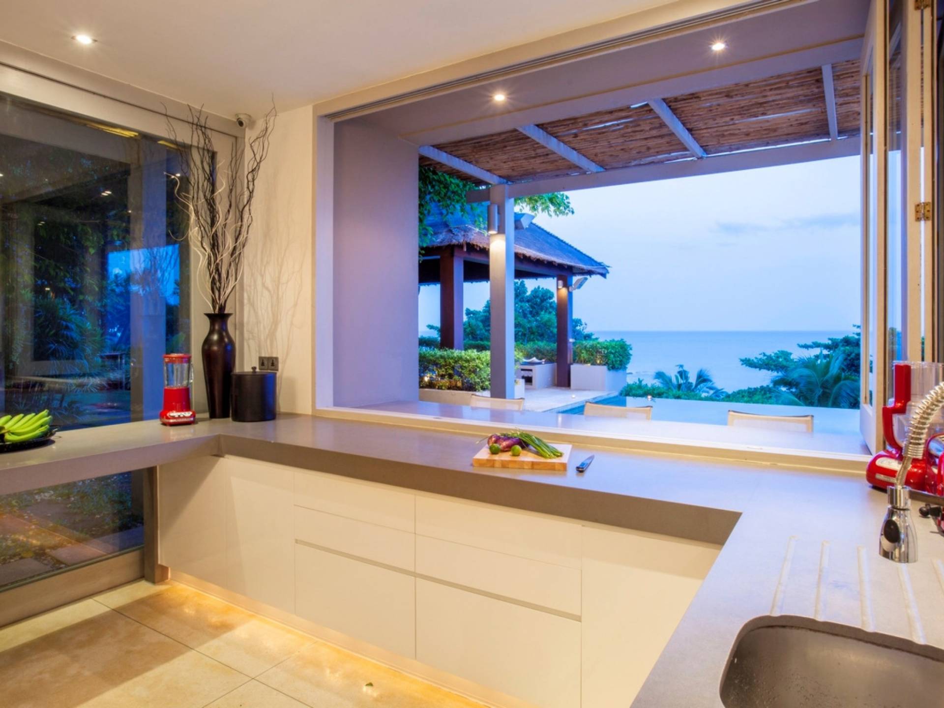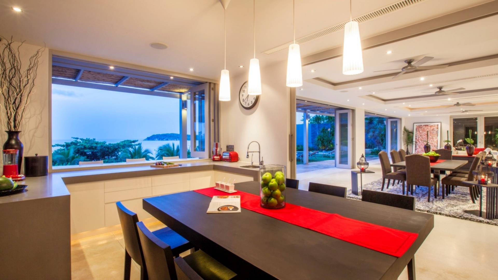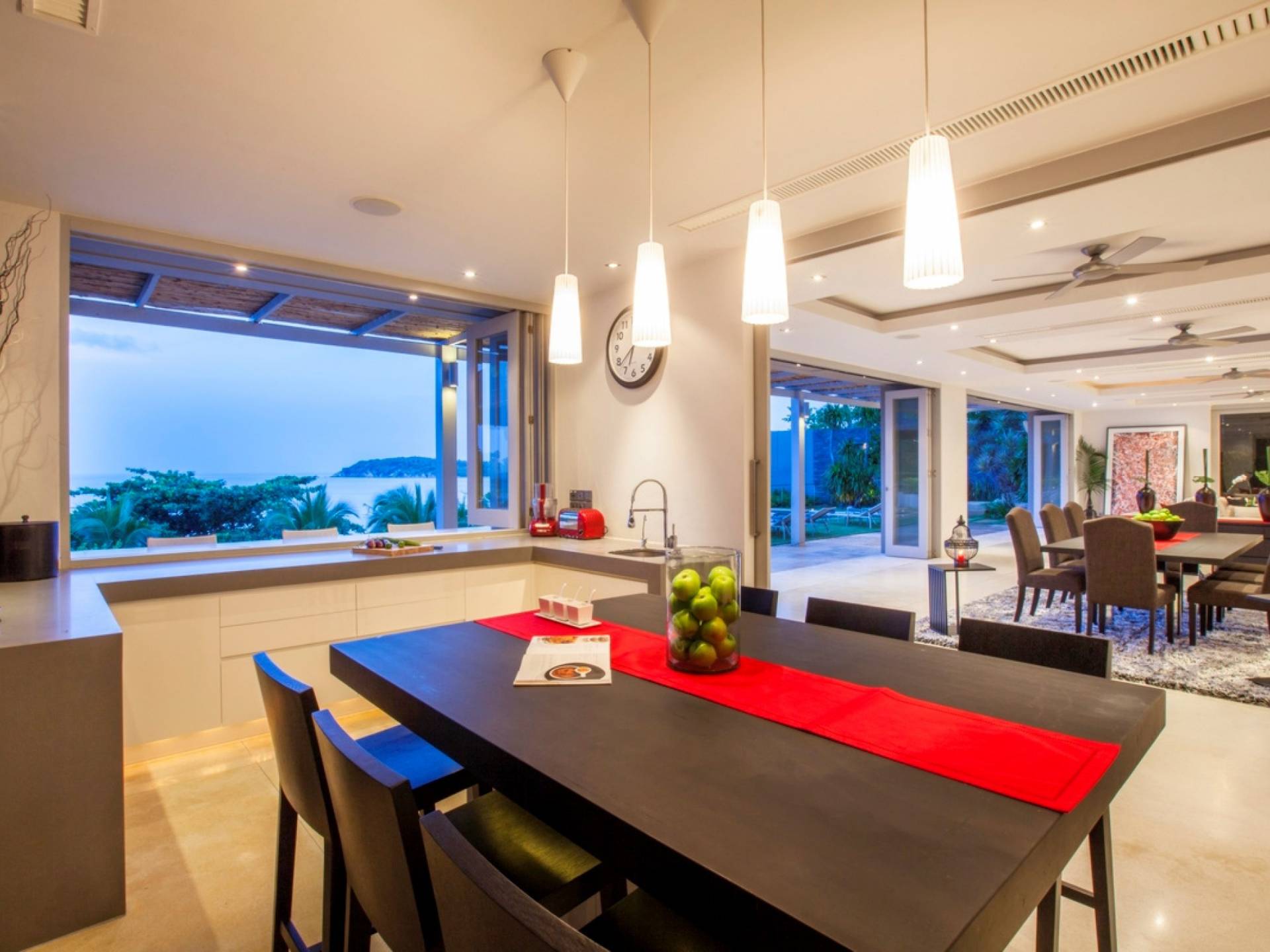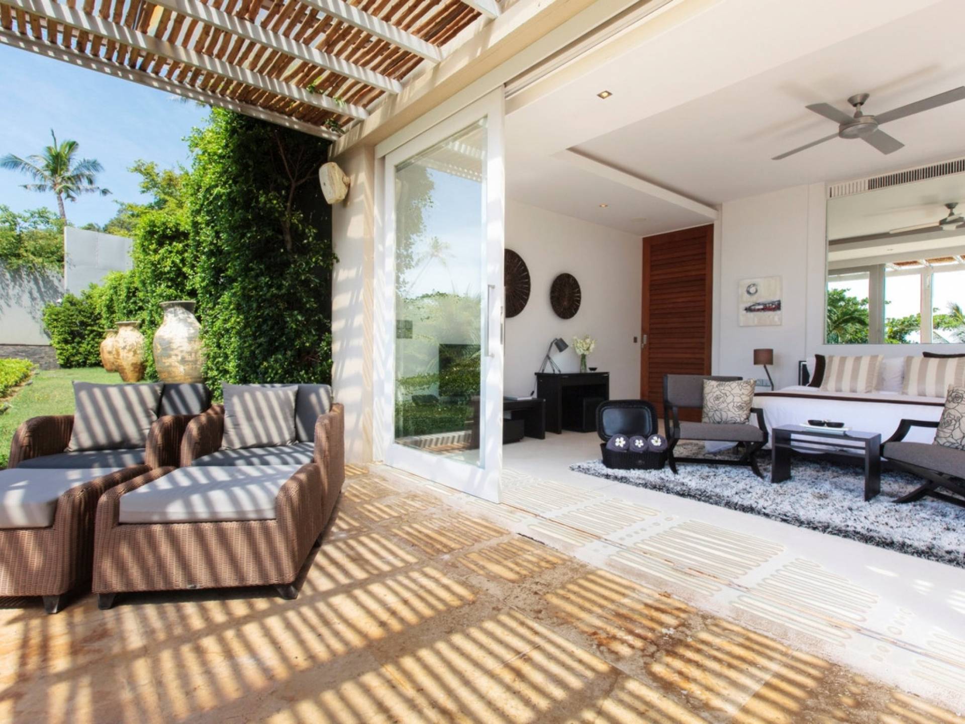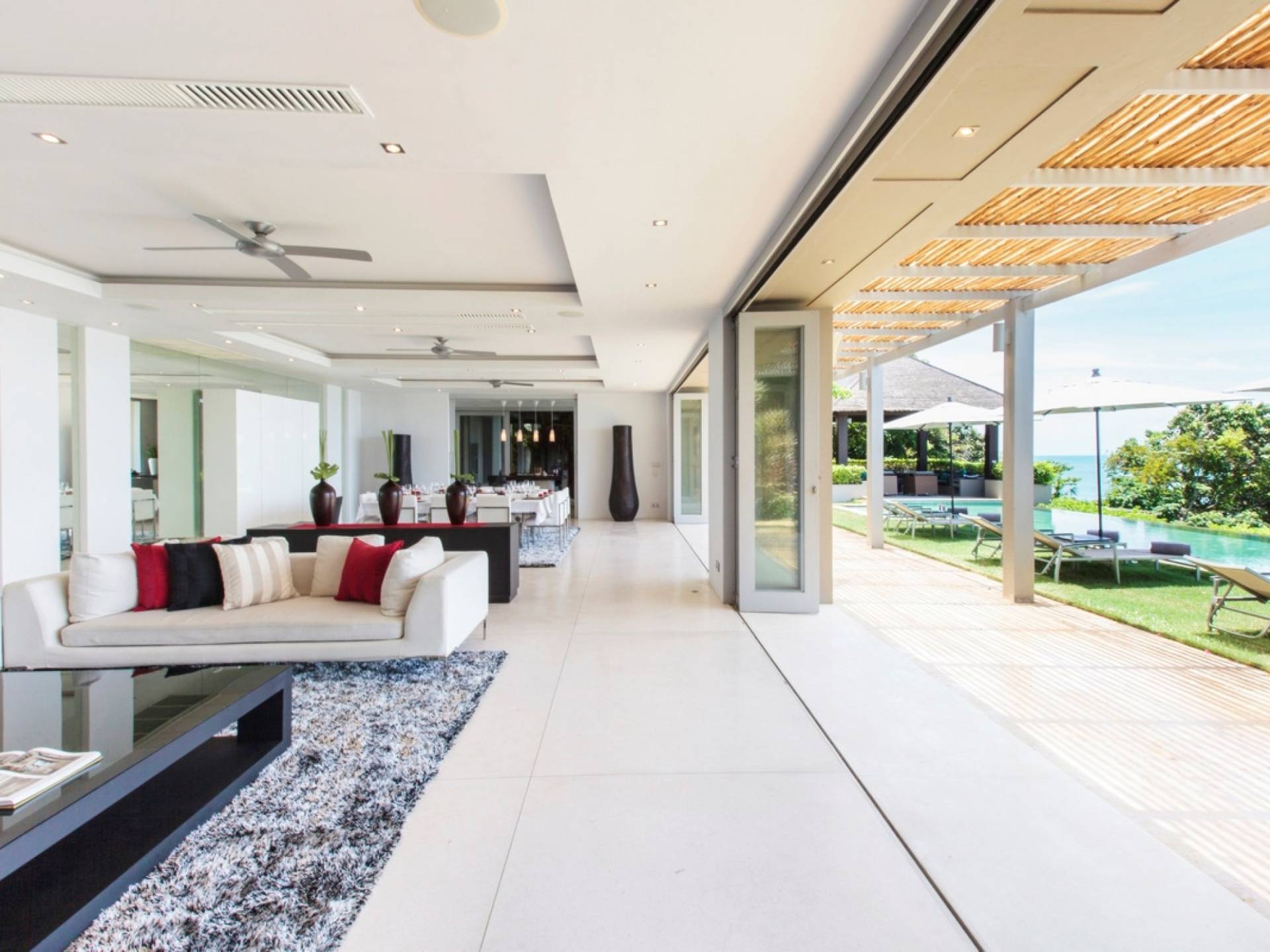 One more level down leads to the villa's open-plan lounge, dining space, and double kitchen, all fronted by wood and glass doors that open onto a lawned terrace and generous seaview pool. The living space is furnished in a contemporary style with three comfortable sofas, a coffee table, as well as two dining tables that provide mealtime seating for up to 16 people. A resort-style kitchen, breakfast area, built-in barbecue and covered, furnished relaxation sala – plus a separate guest bathroom – not only make this space an indulgent private lounge, but also an ideal venue for entertaining guests.