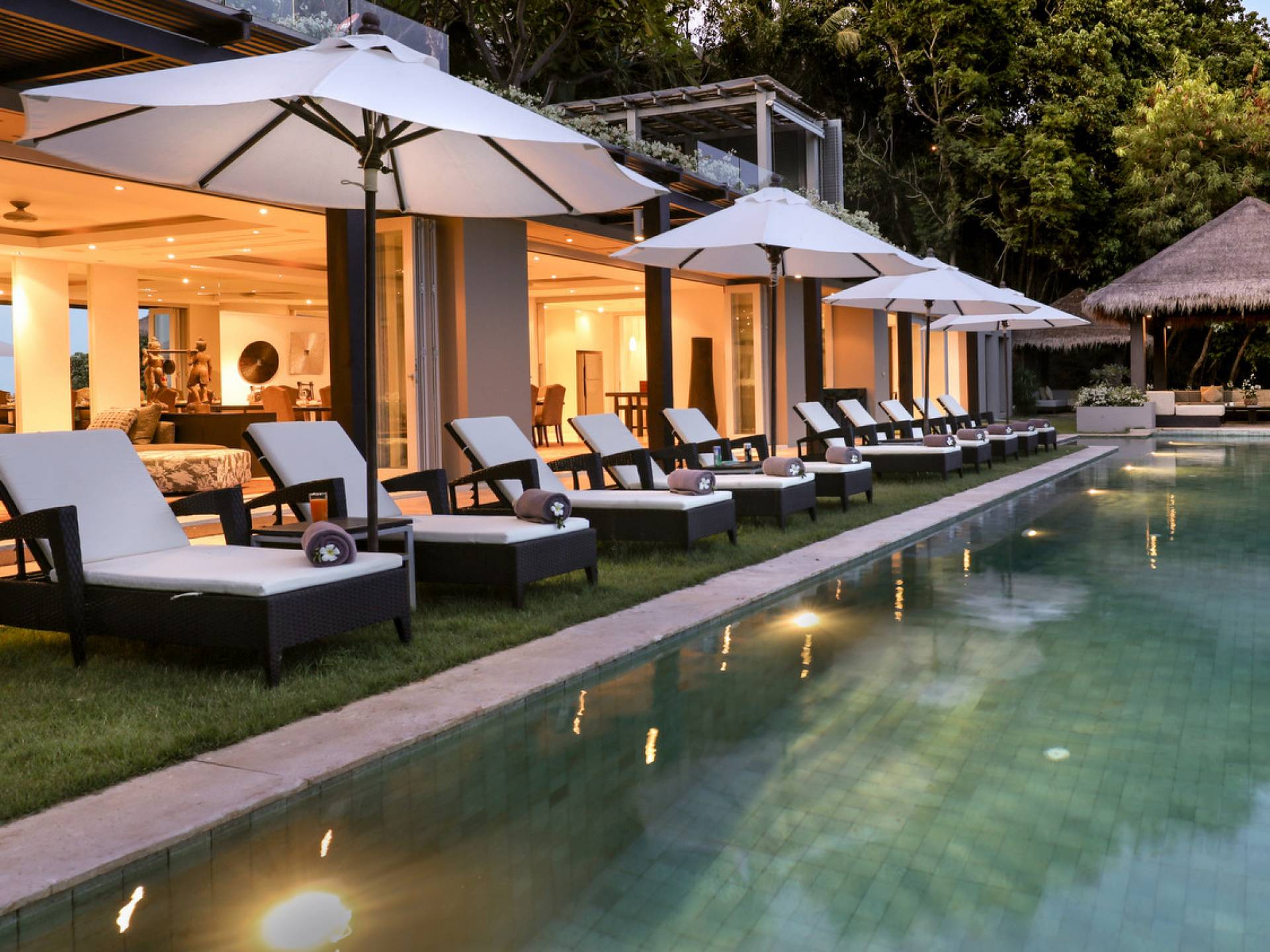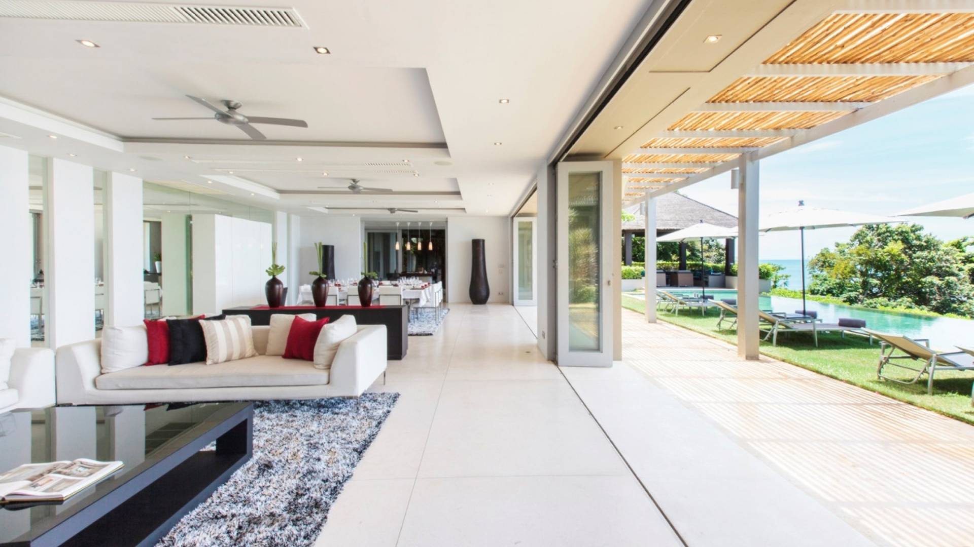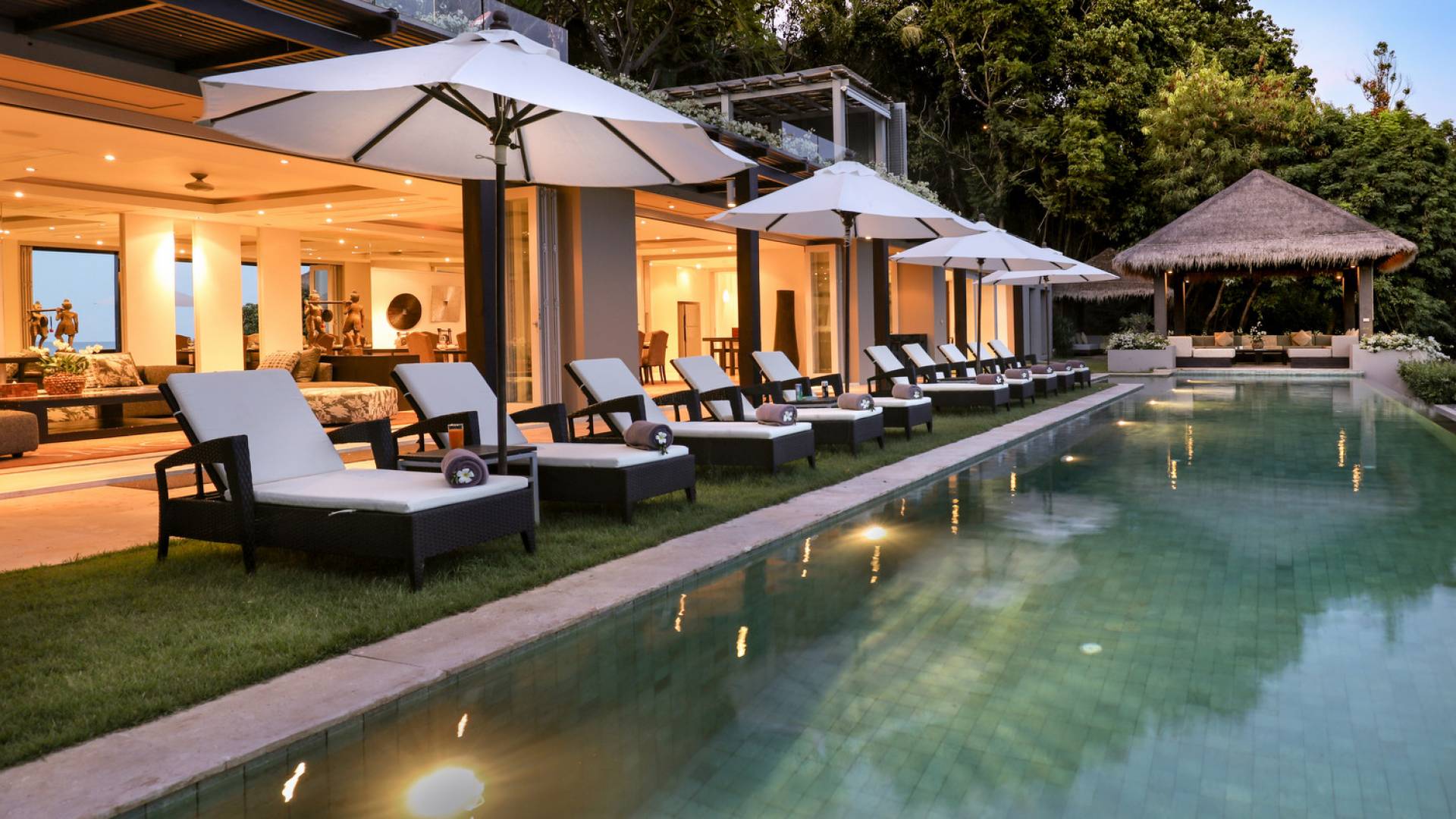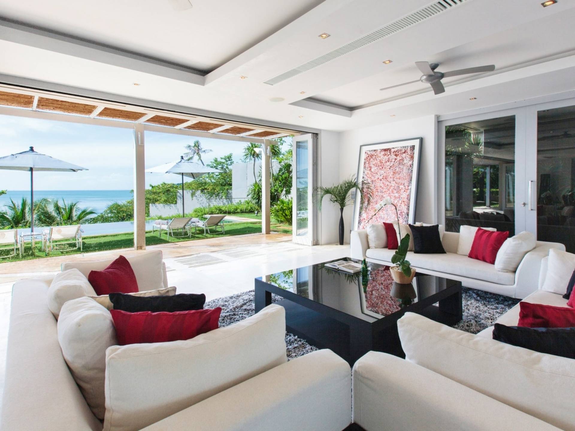 One more level down leads to the villa's open-plan lounge, dining space, and double kitchen, all fronted by wood and glass doors that open onto a lawned terrace and generous seaview pool. The living space is furnished in a contemporary style with three comfortable sofas, a coffee table, as well as two dining tables that provide mealtime seating for up to 16 people. A resort-style kitchen, breakfast area, built-in barbecue and covered, furnished relaxation sala – plus a separate guest bathroom – not only make this space an indulgent private lounge, but also an ideal venue for entertaining guests.
