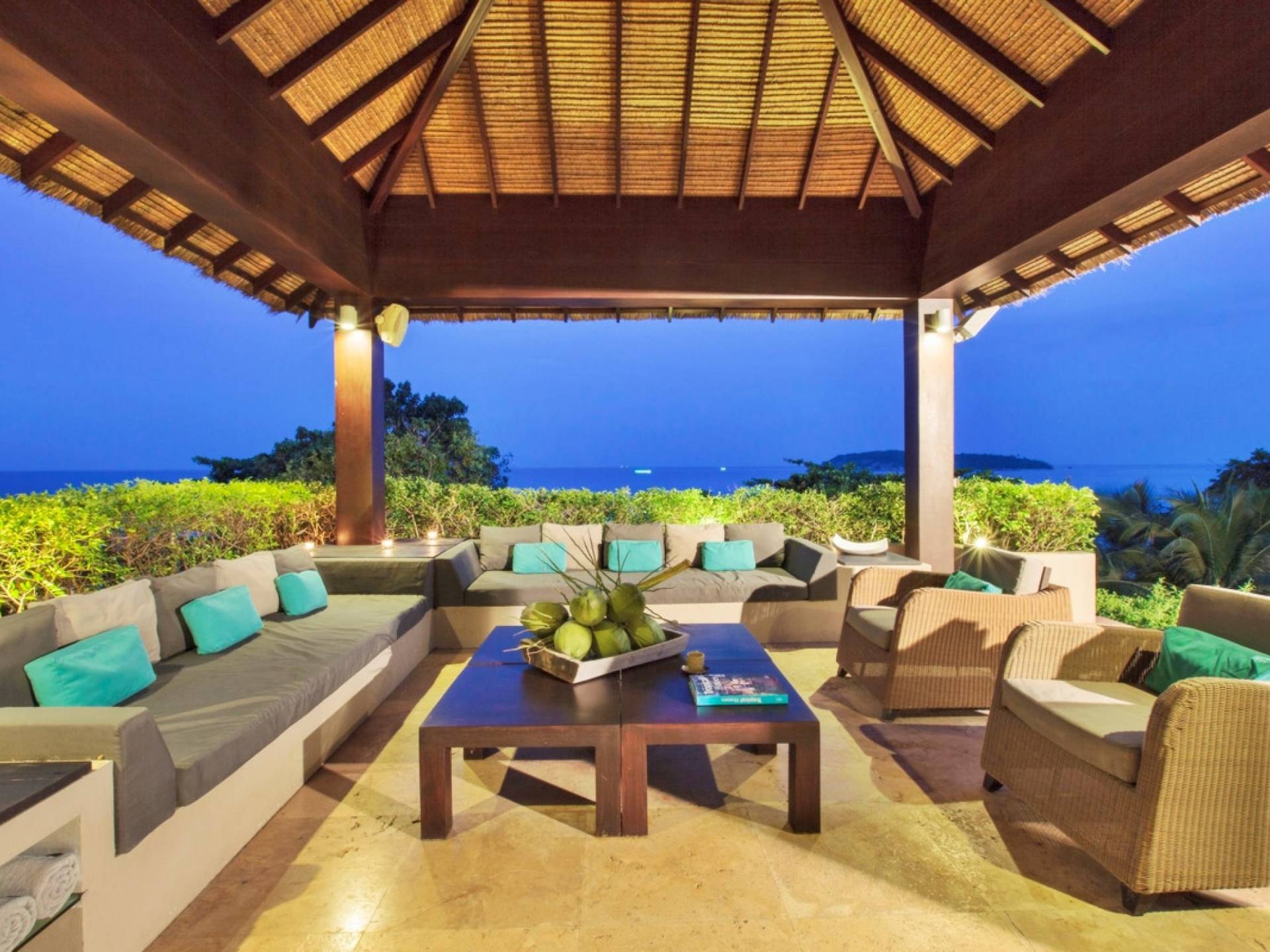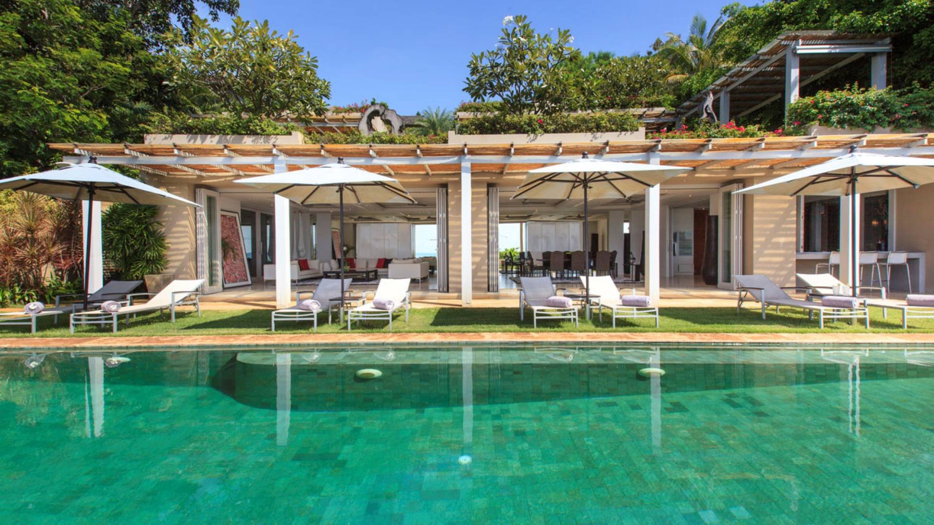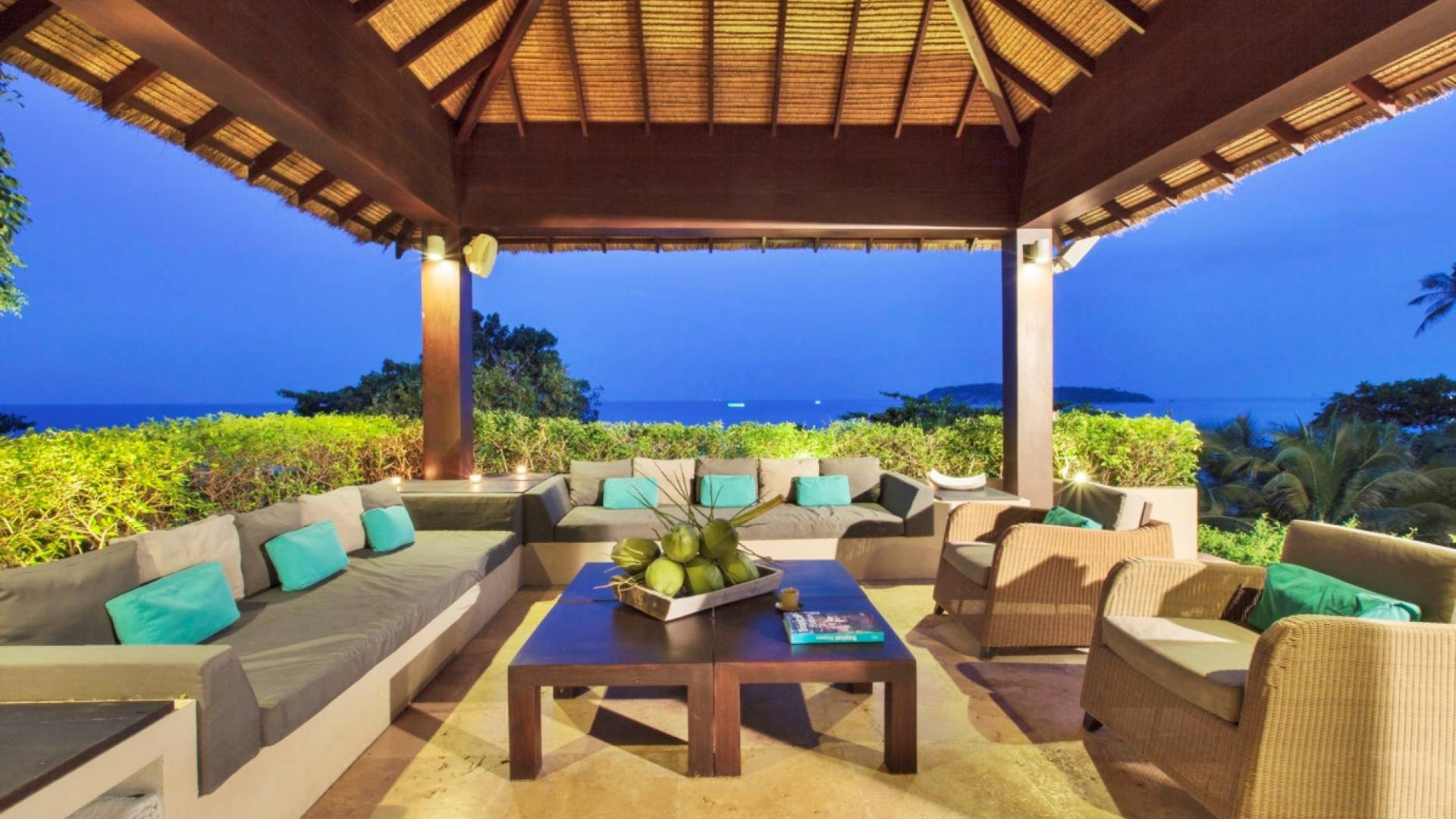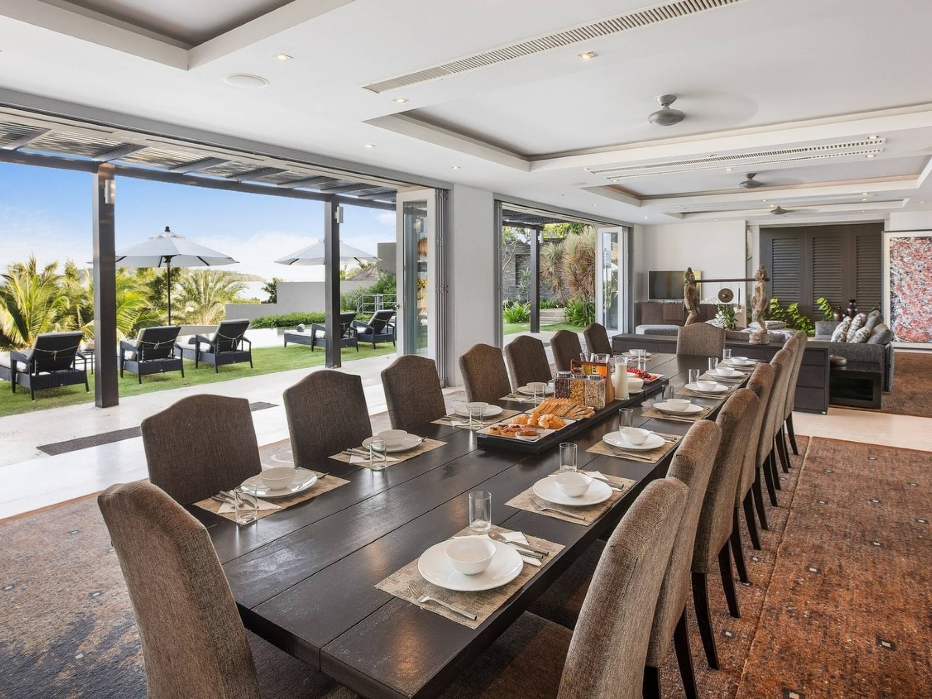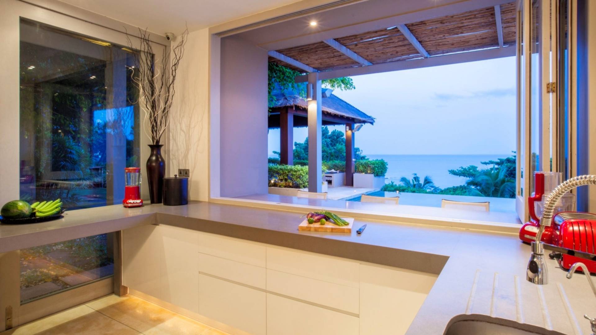 One more level down leads to the villa's open-plan lounge, dining space, and double kitchen, all fronted by wood and glass doors that open onto a lawned terrace and generous seaview pool. The living space is furnished in a contemporary style with three comfortable sofas, a coffee table, as well as two dining tables that provide mealtime seating for up to 16 people. A resort-style kitchen, breakfast area, built-in barbecue and covered, furnished relaxation sala – plus a separate guest bathroom – not only make this space an indulgent private lounge, but also an ideal venue for entertaining guests.