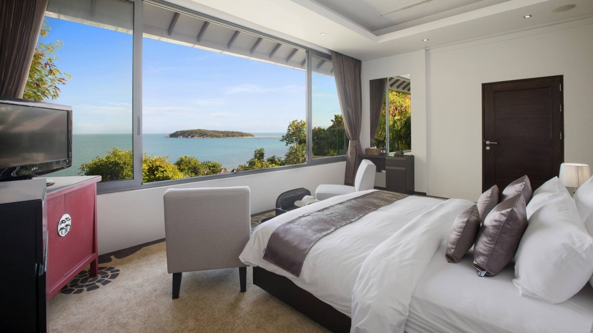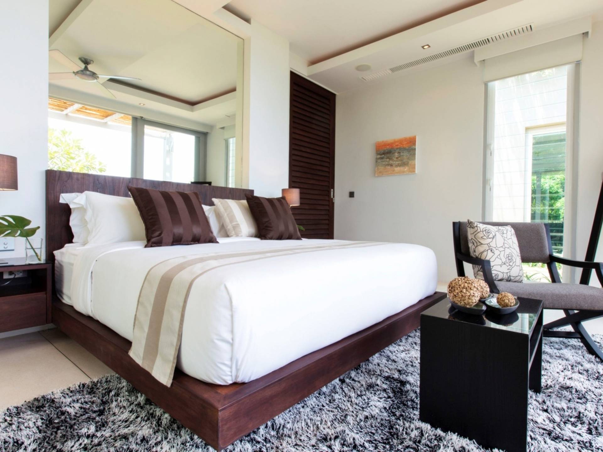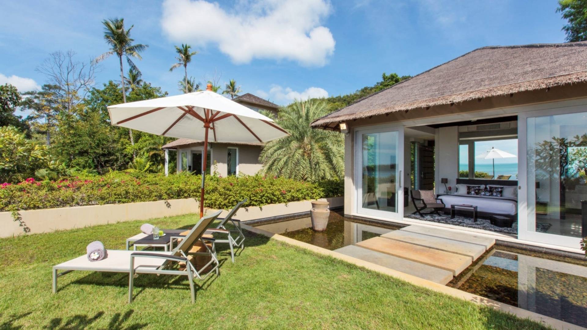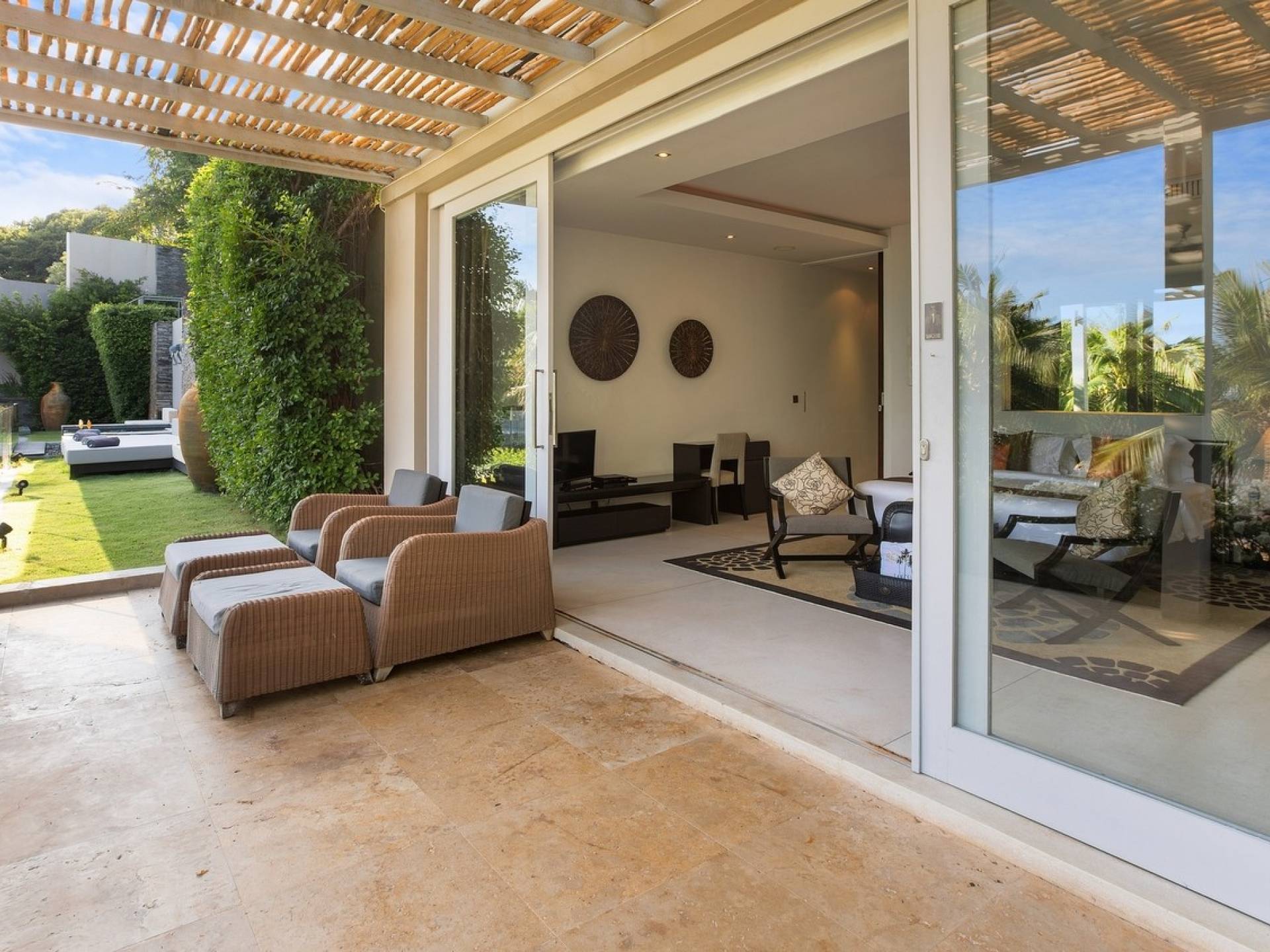 One more level down leads to the villa's open-plan lounge, dining space, and double kitchen, all fronted by wood and glass doors that open onto a lawned terrace and generous seaview pool. The living space is furnished in a contemporary style with three comfortable sofas, a coffee table, as well as two dining tables that provide mealtime seating for up to 16 people. A resort-style kitchen, breakfast area, built-in barbecue and covered, furnished relaxation sala – plus a separate guest bathroom – not only make this space an indulgent private lounge, but also an ideal venue for entertaining guests.