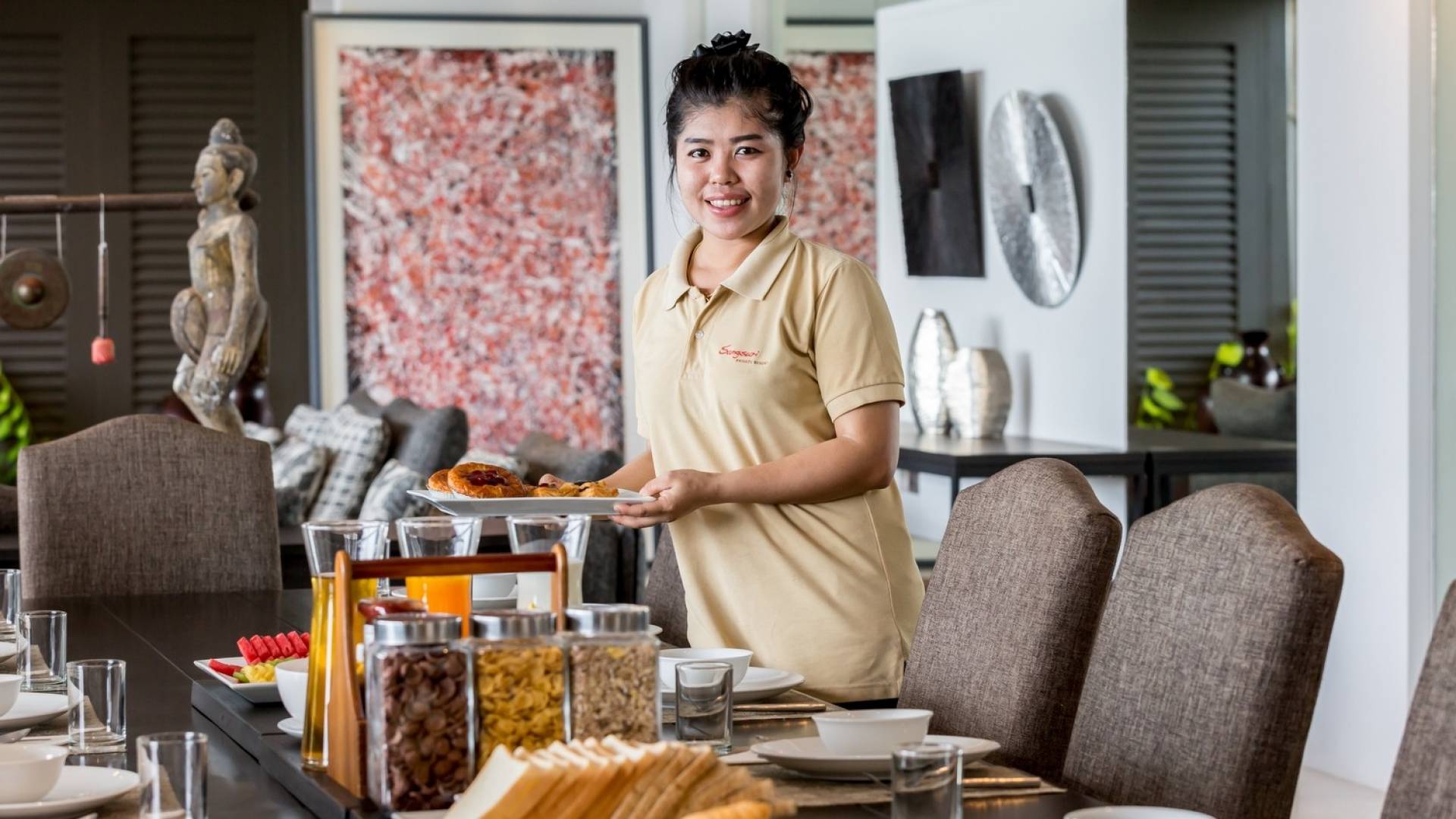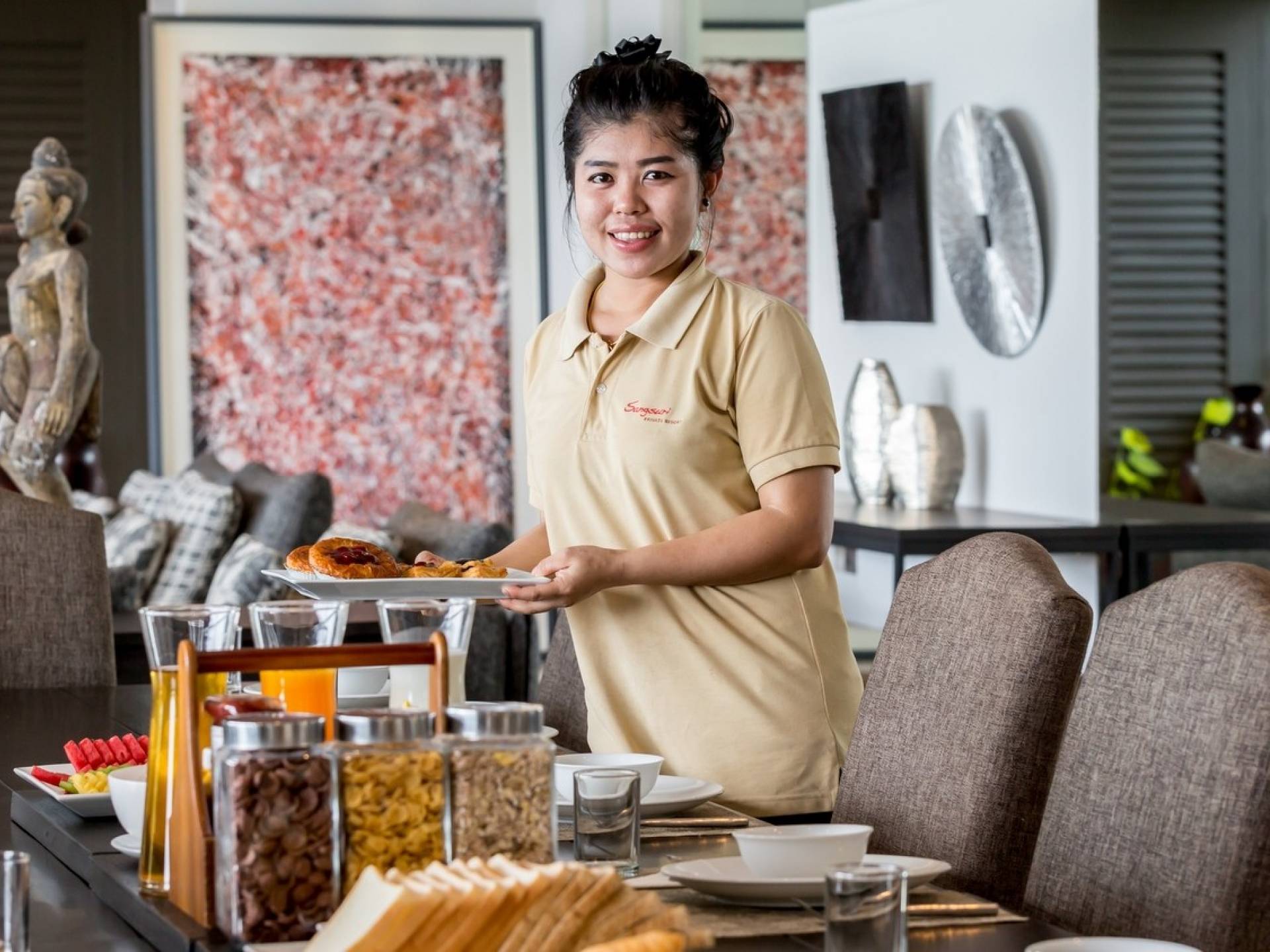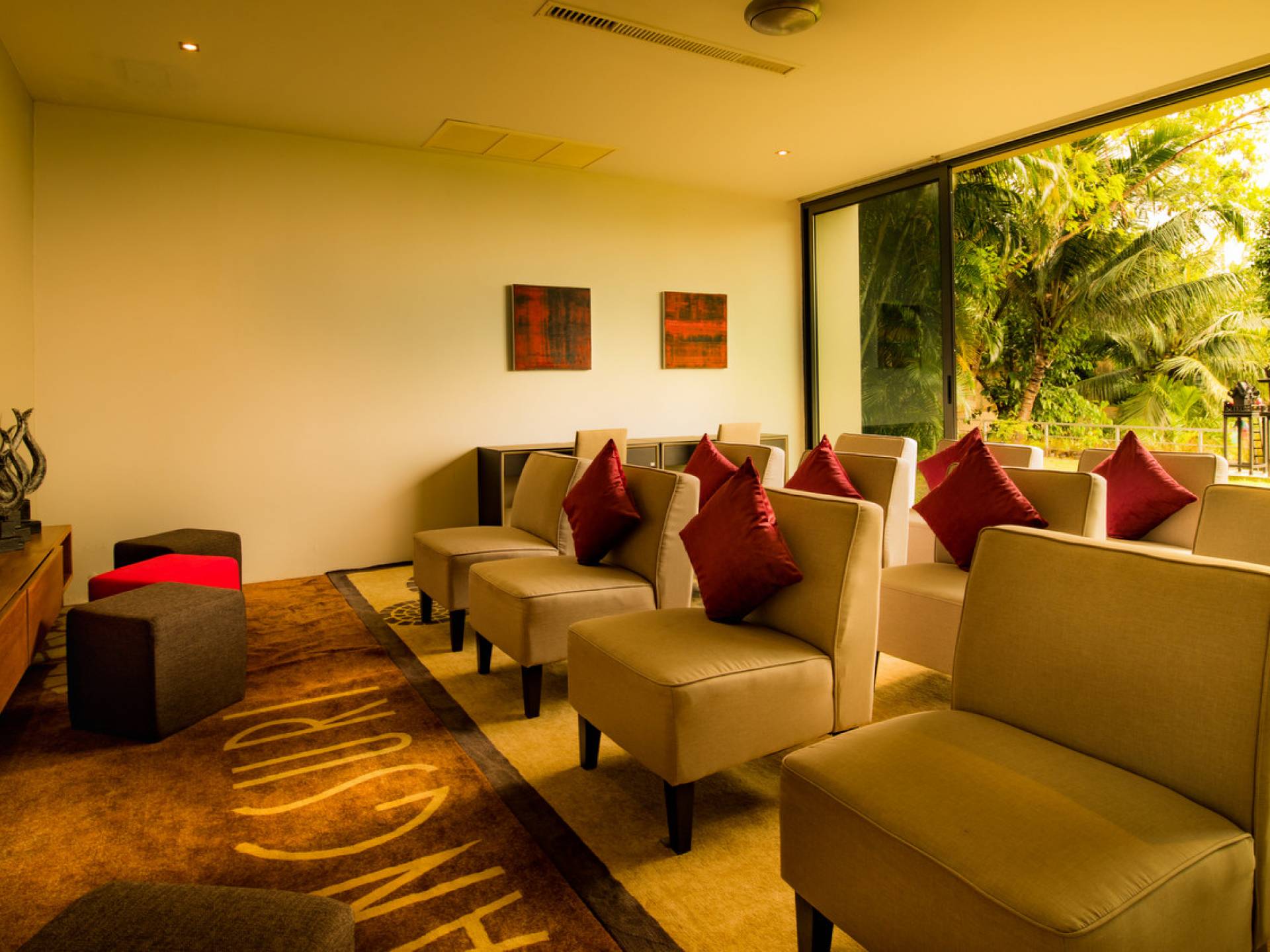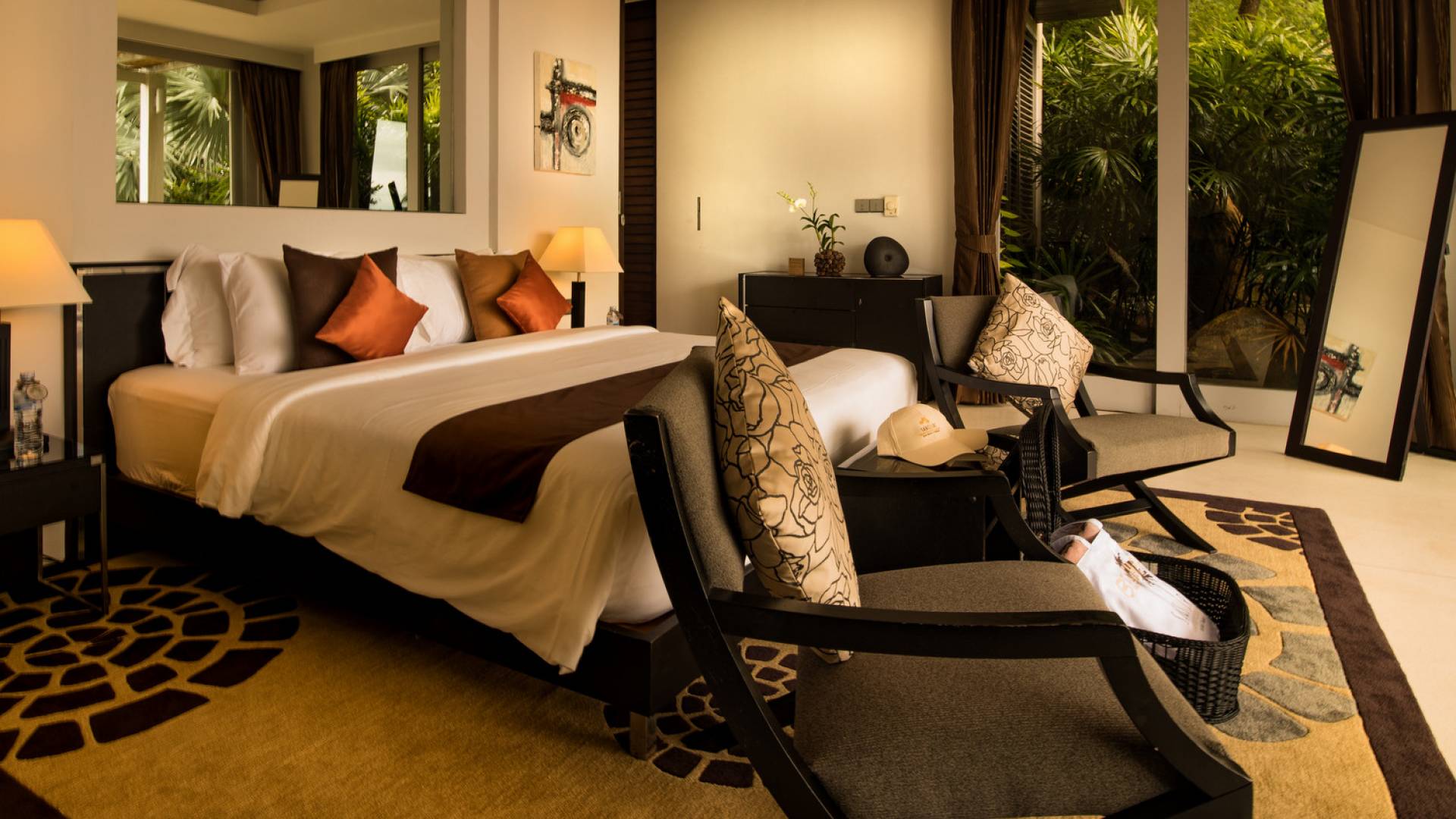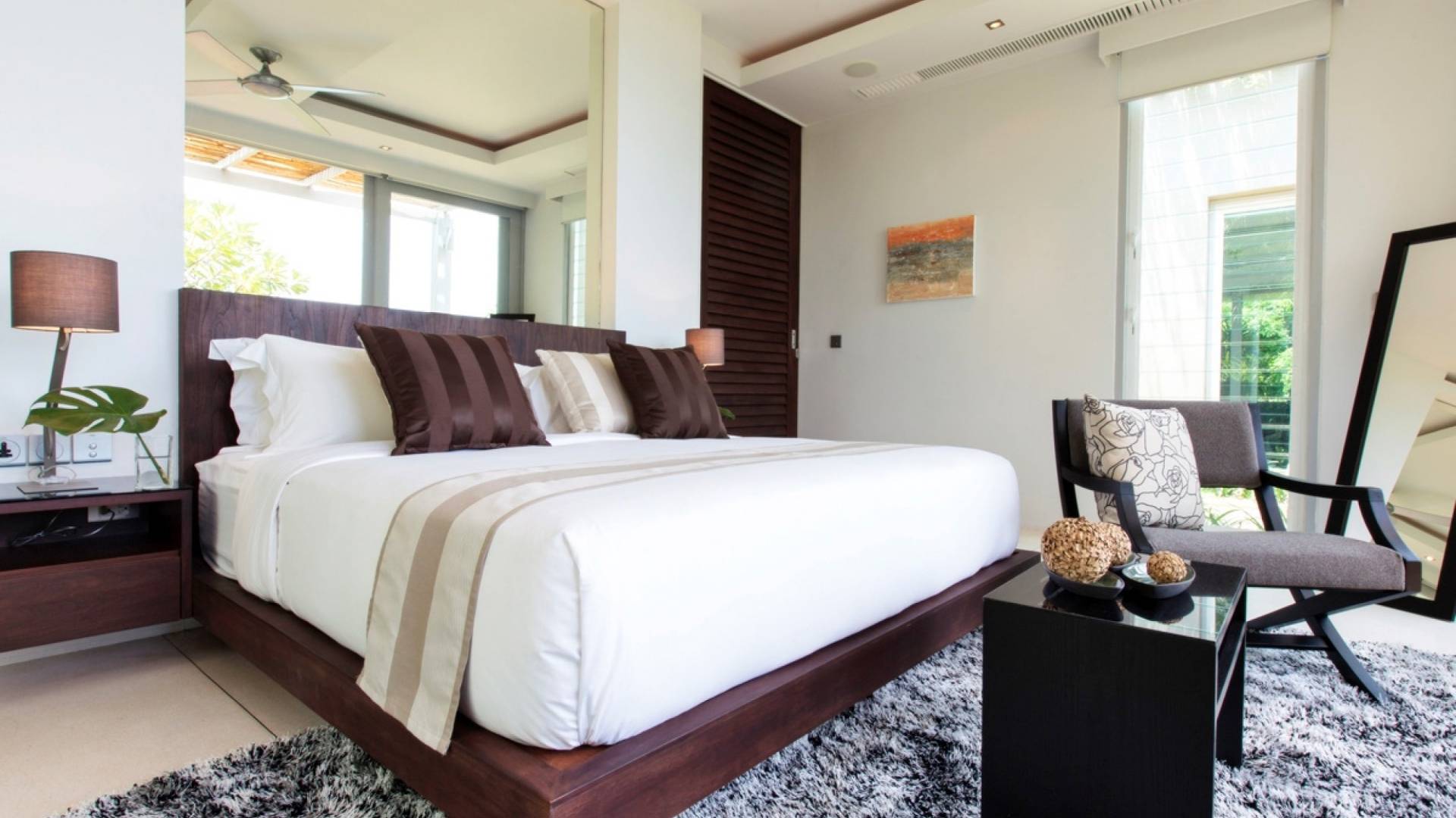 One more level down leads to the villa's open-plan lounge, dining space, and double kitchen, all fronted by wood and glass doors that open onto a lawned terrace and generous seaview pool. The living space is furnished in a contemporary style with three comfortable sofas, a coffee table, as well as two dining tables that provide mealtime seating for up to 16 people. A resort-style kitchen, breakfast area, built-in barbecue and covered, furnished relaxation sala – plus a separate guest bathroom – not only make this space an indulgent private lounge, but also an ideal venue for entertaining guests.