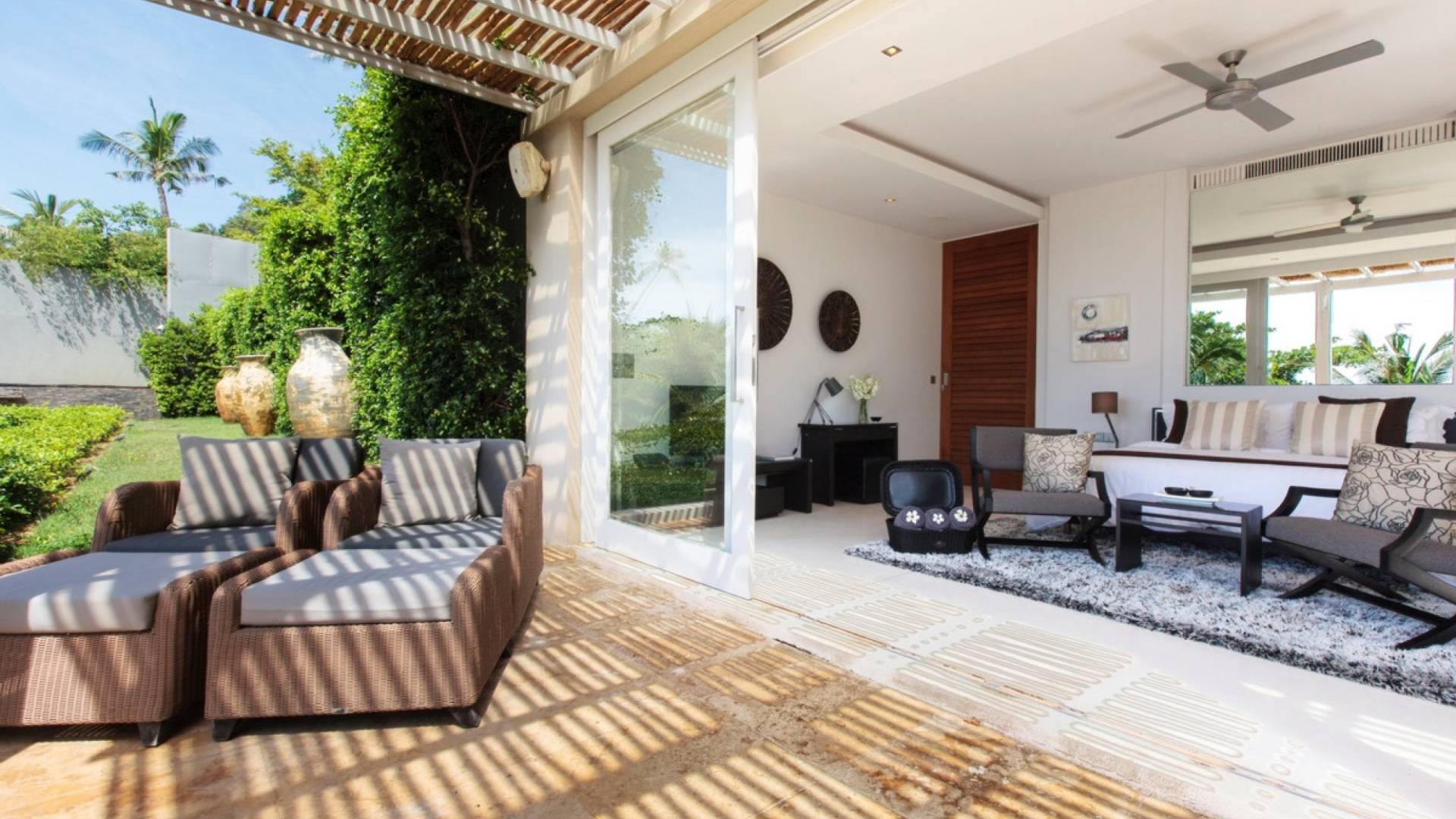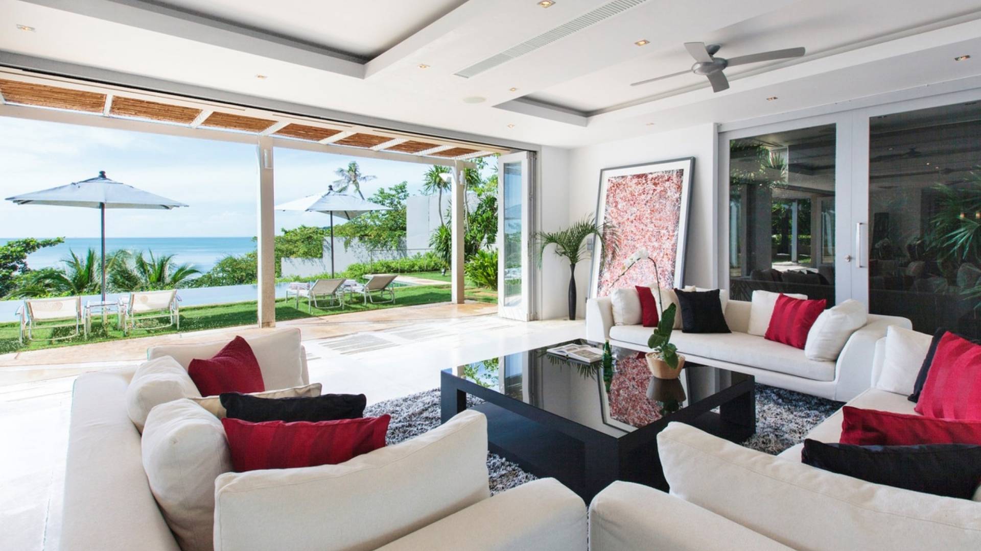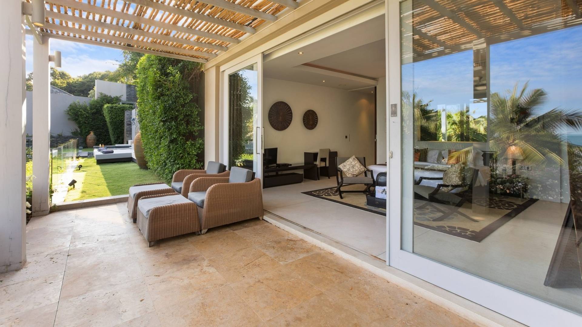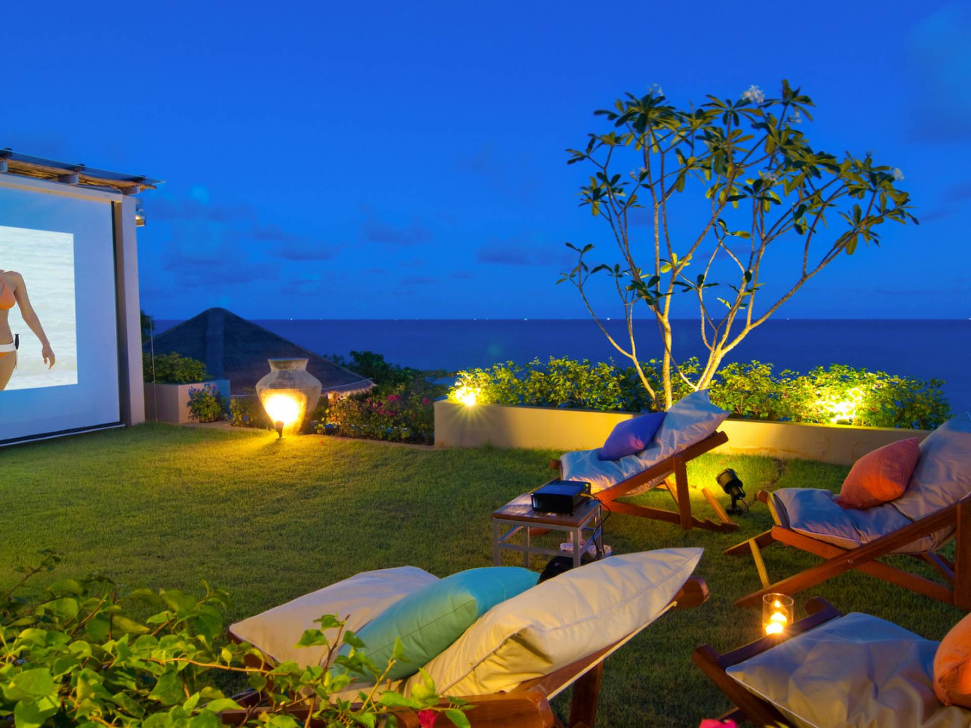 The villa's penultimate level houses the fabulous master suite, which also opens onto a private covered oceanview terrace and boasts two bathrooms, one with a shower, the other home to an indulgent standing bathtub for a soothing sea view soak. From there, steps lead down to the oceanside lawn, furnished with sun loungers overlooking the beach. A high wall at one end features a built-in projector screen so the garden can be transformed into an outdoor cinema.