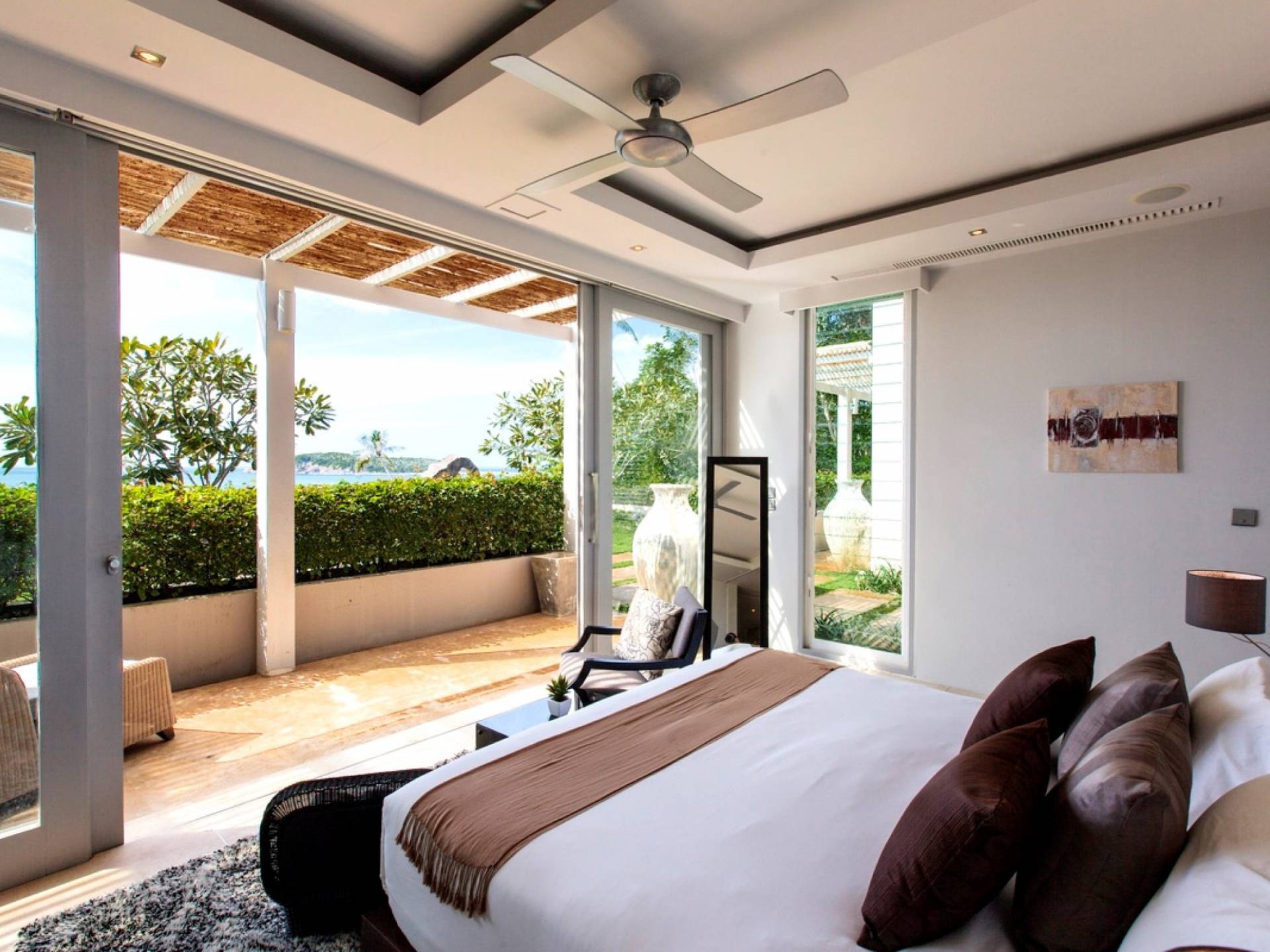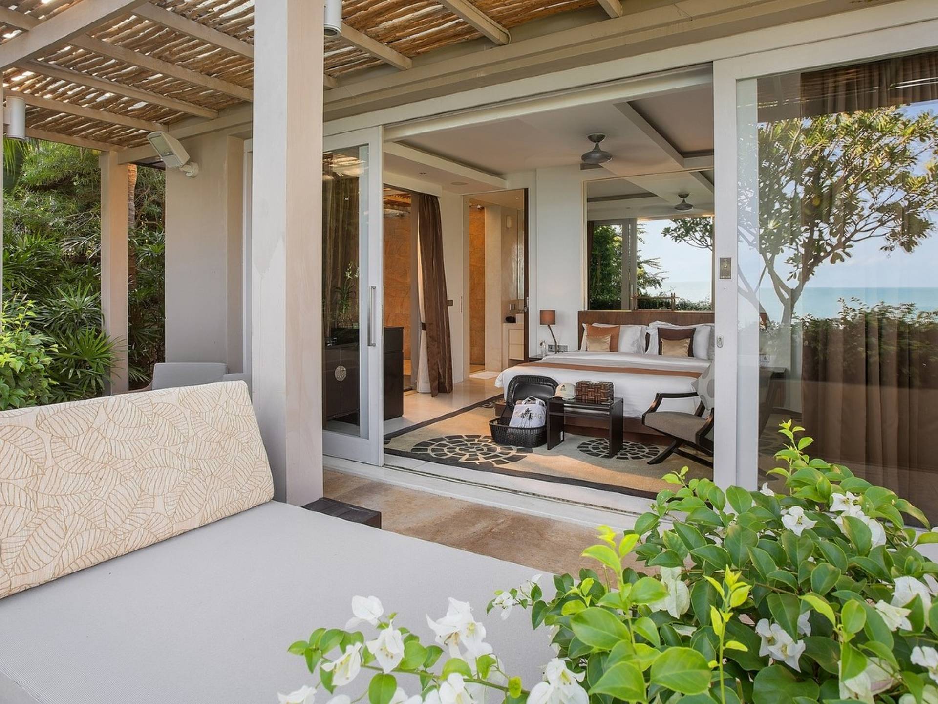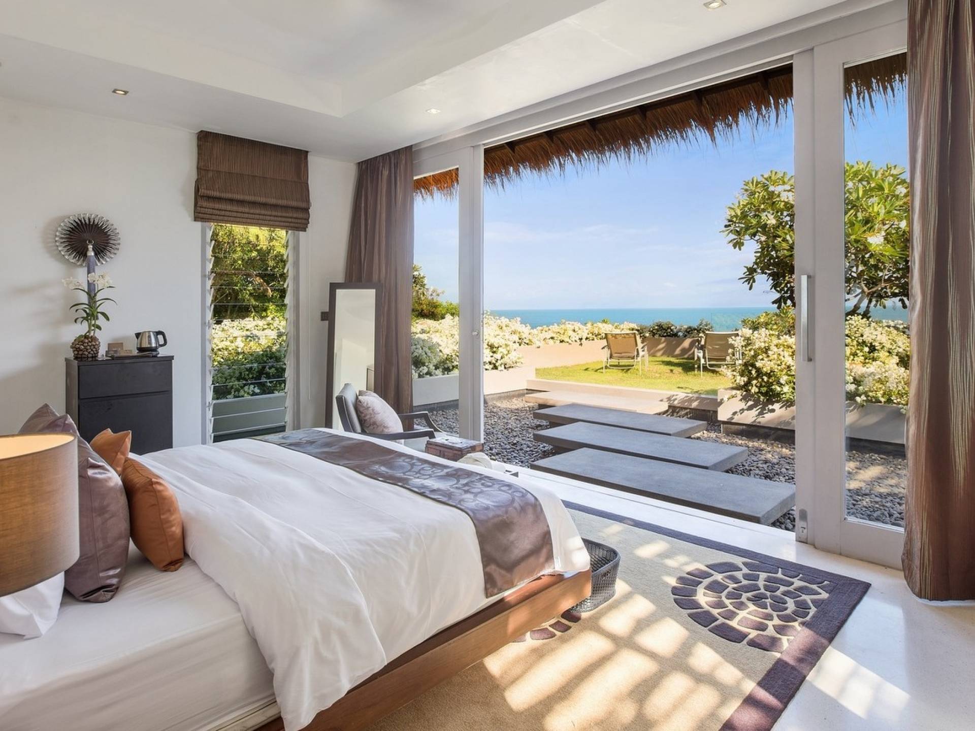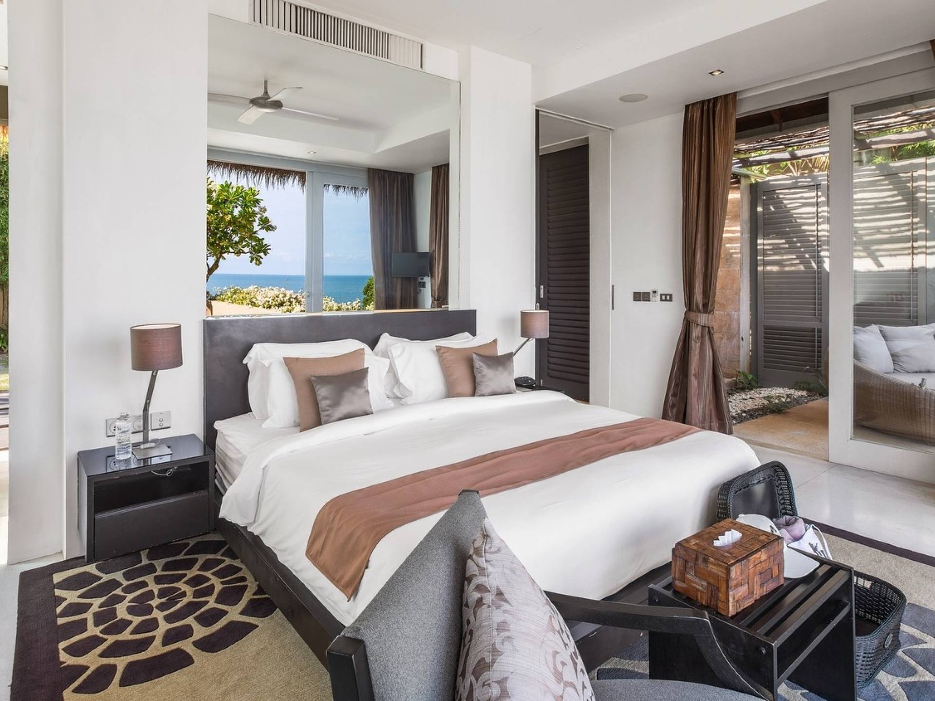 The villa's penultimate level houses the fabulous master suite, which also opens onto a private covered oceanview terrace and boasts two bathrooms, one with a shower, the other home to an indulgent standing bathtub for a soothing sea view soak. From there, steps lead down to the oceanside lawn, furnished with sun loungers overlooking the beach. A high wall at one end features a built-in projector screen so the garden can be transformed into an outdoor cinema.