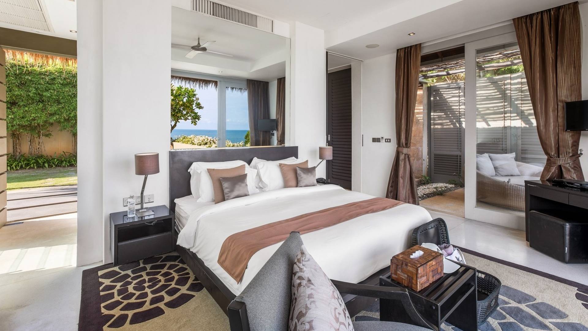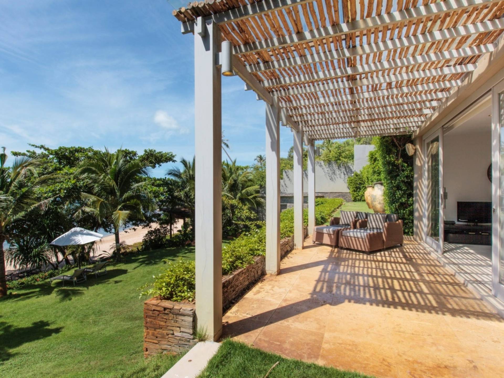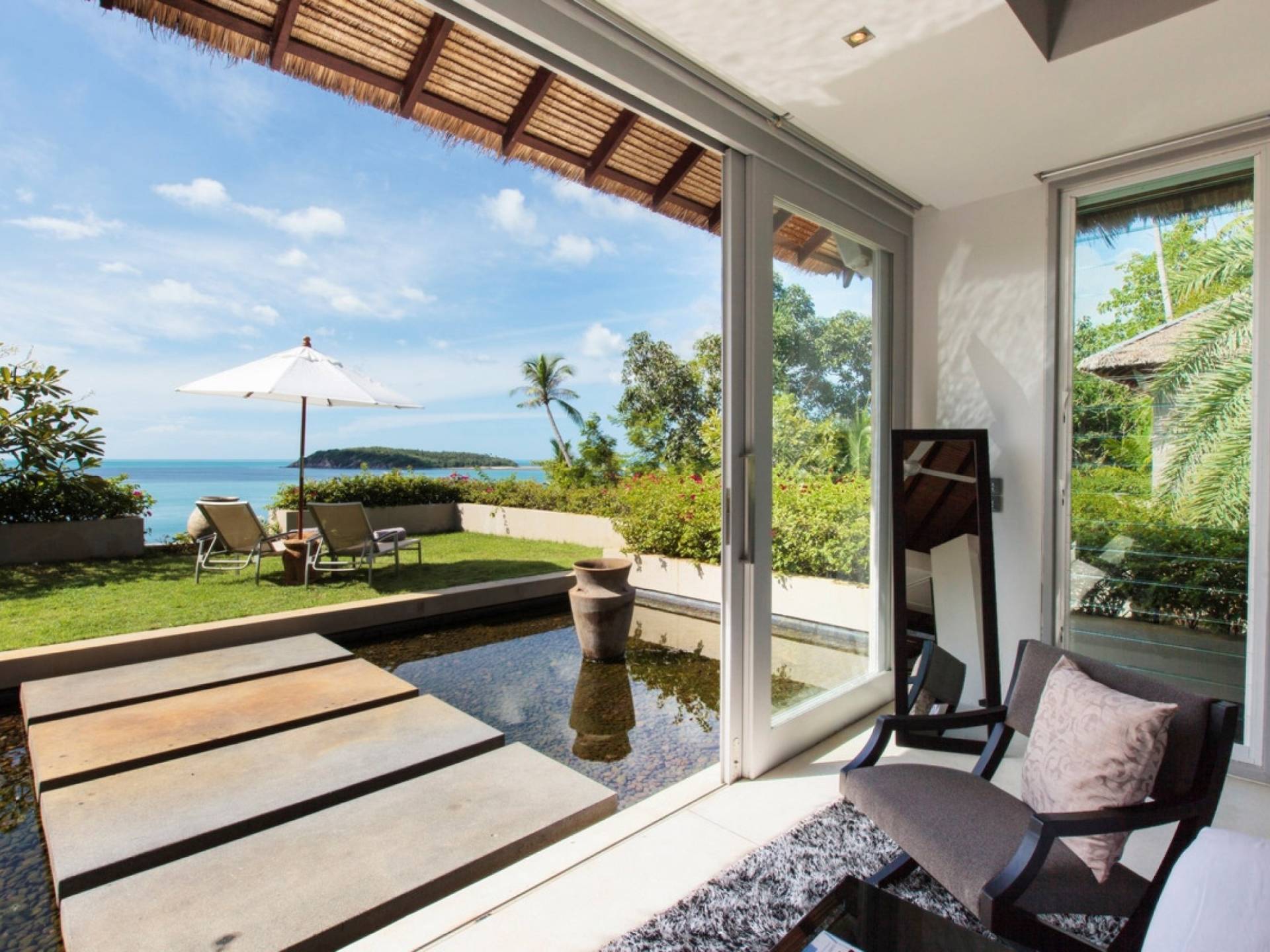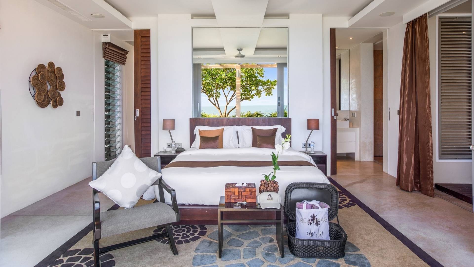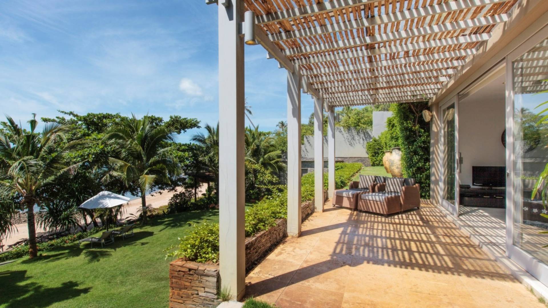 The villa's penultimate level houses the fabulous master suite, which also opens onto a private covered oceanview terrace and boasts two bathrooms, one with a shower, the other home to an indulgent standing bathtub for a soothing sea view soak. From there, steps lead down to the oceanside lawn, furnished with sun loungers overlooking the beach. A high wall at one end features a built-in projector screen so the garden can be transformed into an outdoor cinema.
