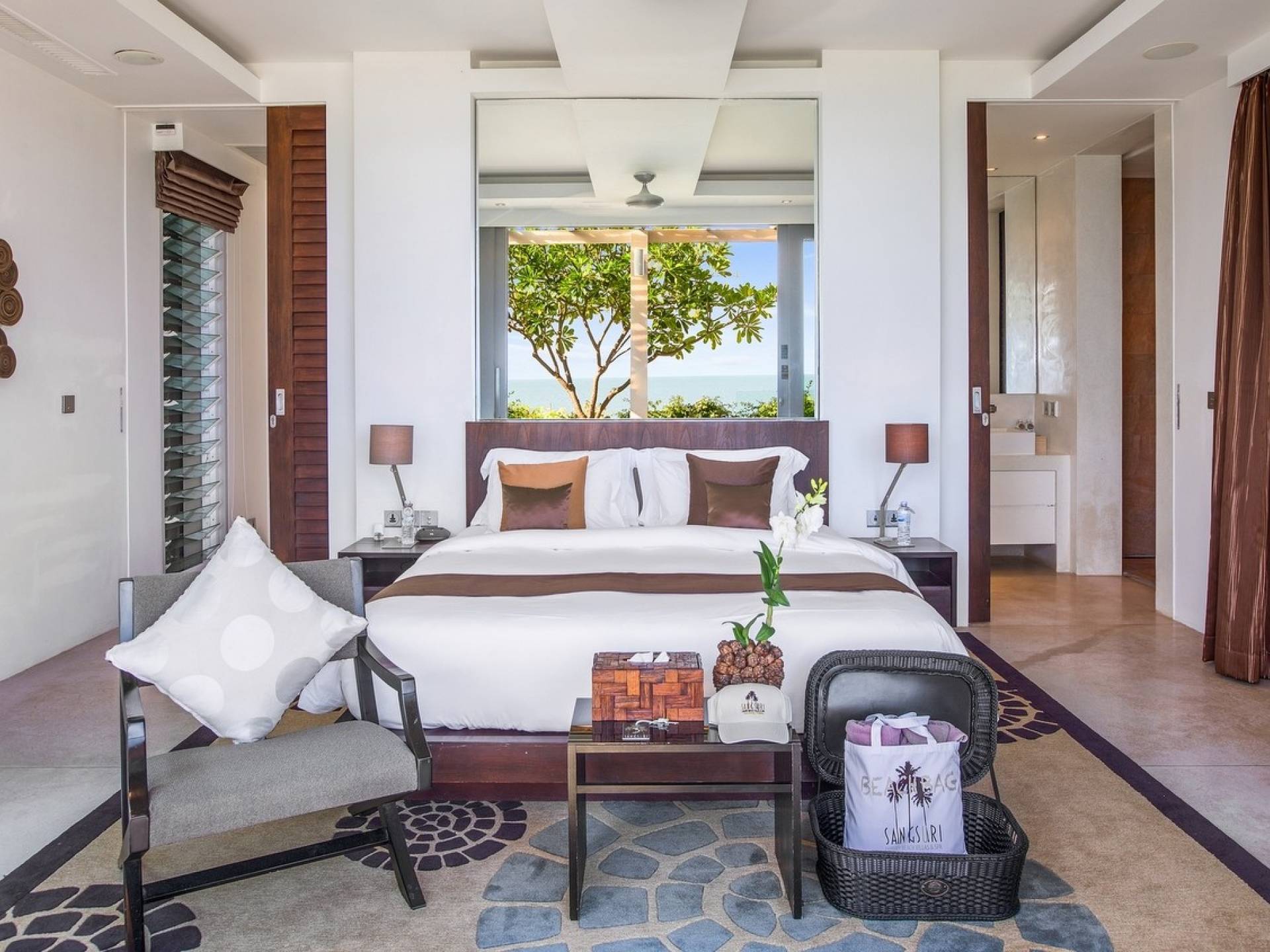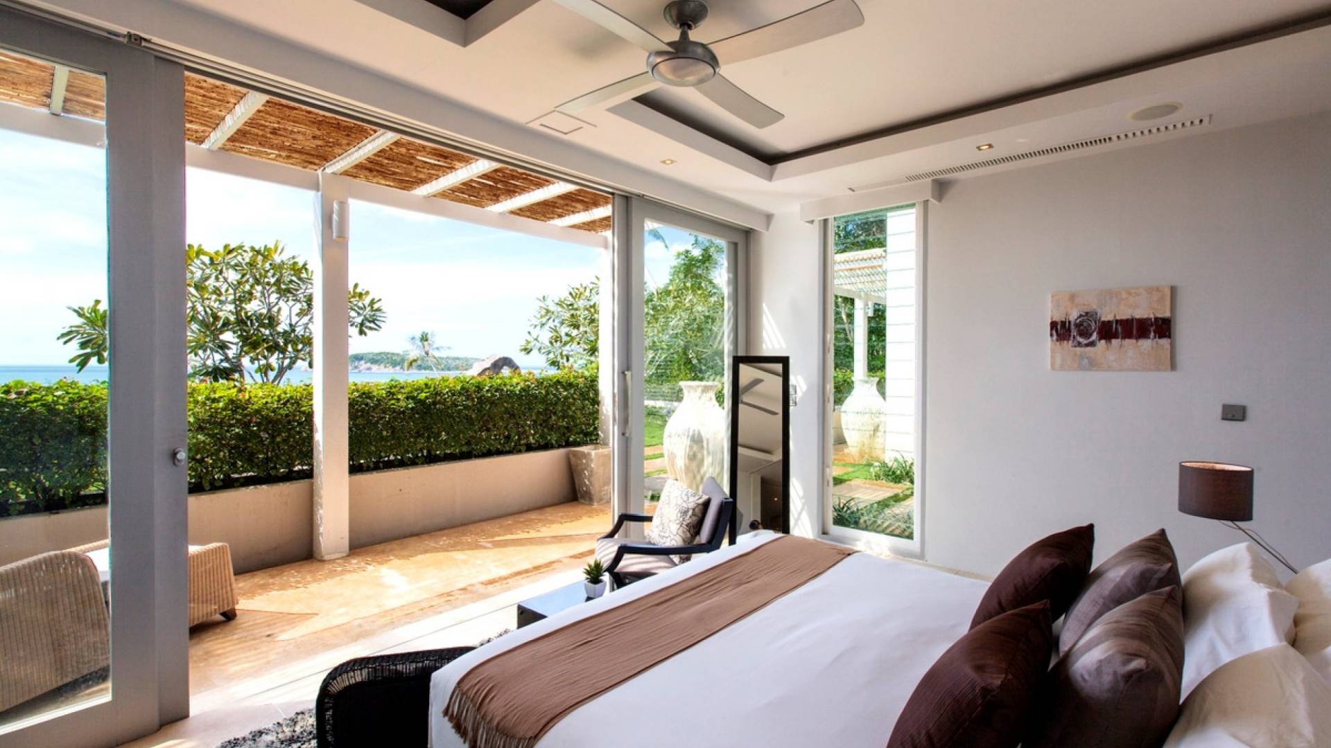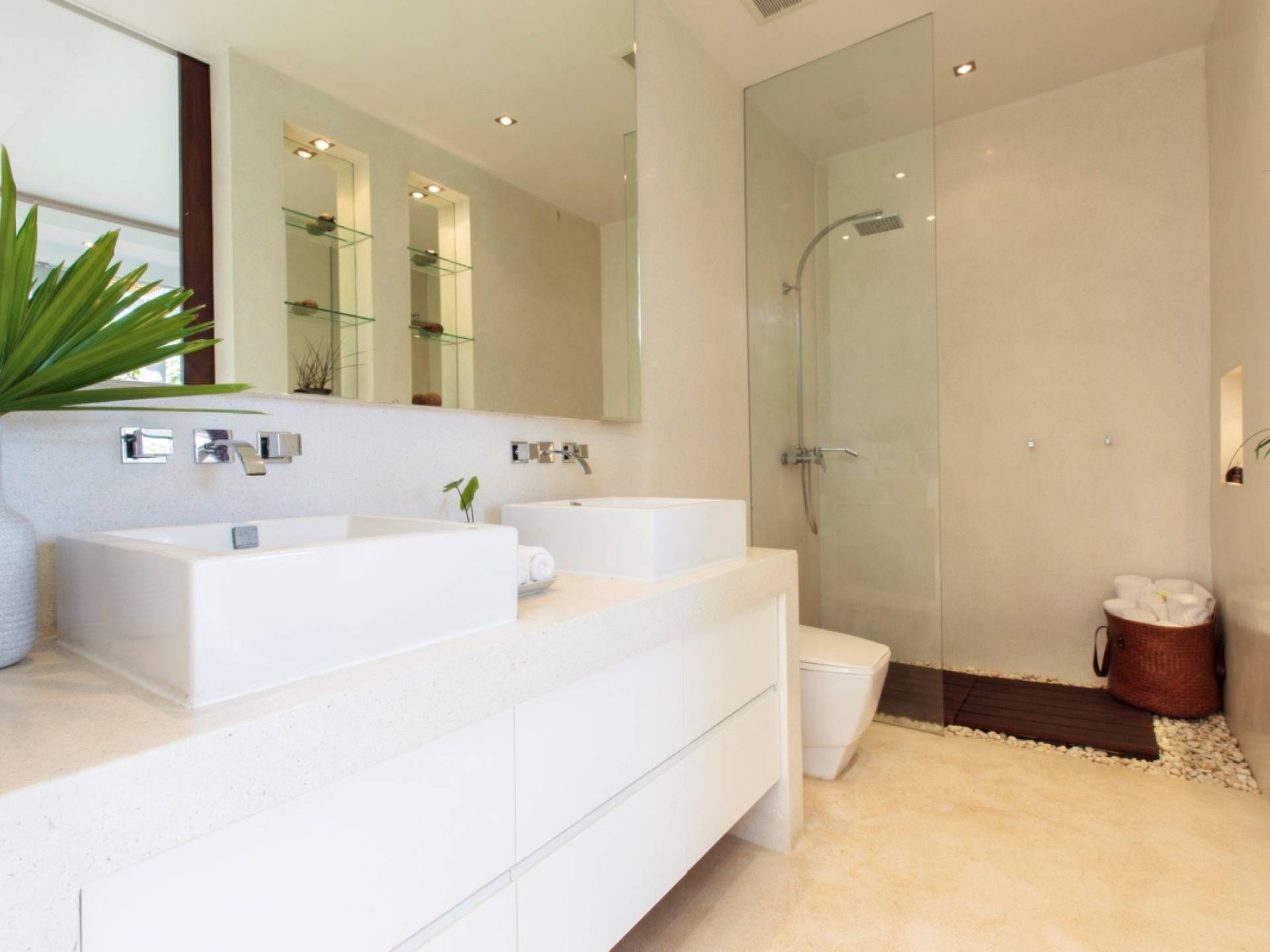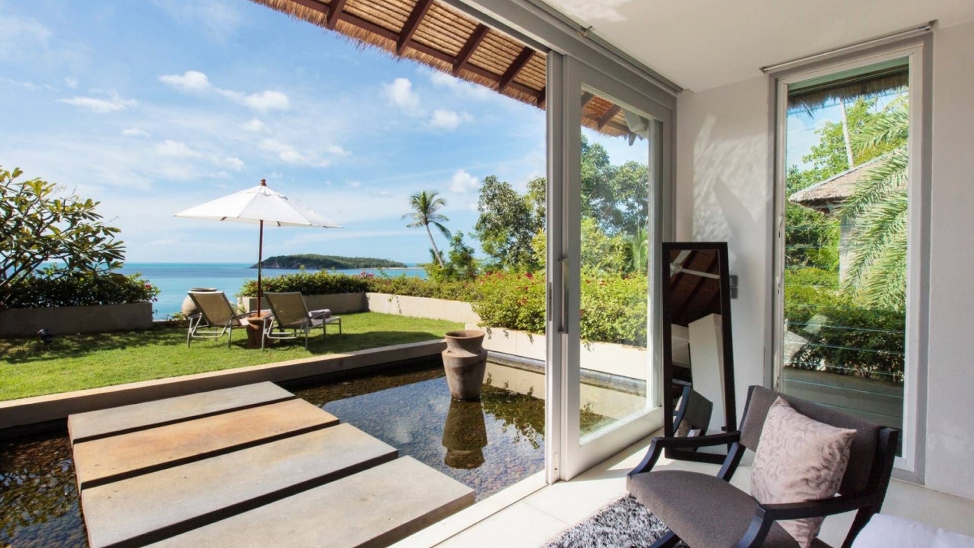 The villa's penultimate level houses the fabulous master suite, which also opens onto a private covered oceanview terrace and boasts two bathrooms, one with a shower, the other home to an indulgent standing bathtub for a soothing sea view soak. From there, steps lead down to the oceanside lawn, furnished with sun loungers overlooking the beach. A high wall at one end features a built-in projector screen so the garden can be transformed into an outdoor cinema.