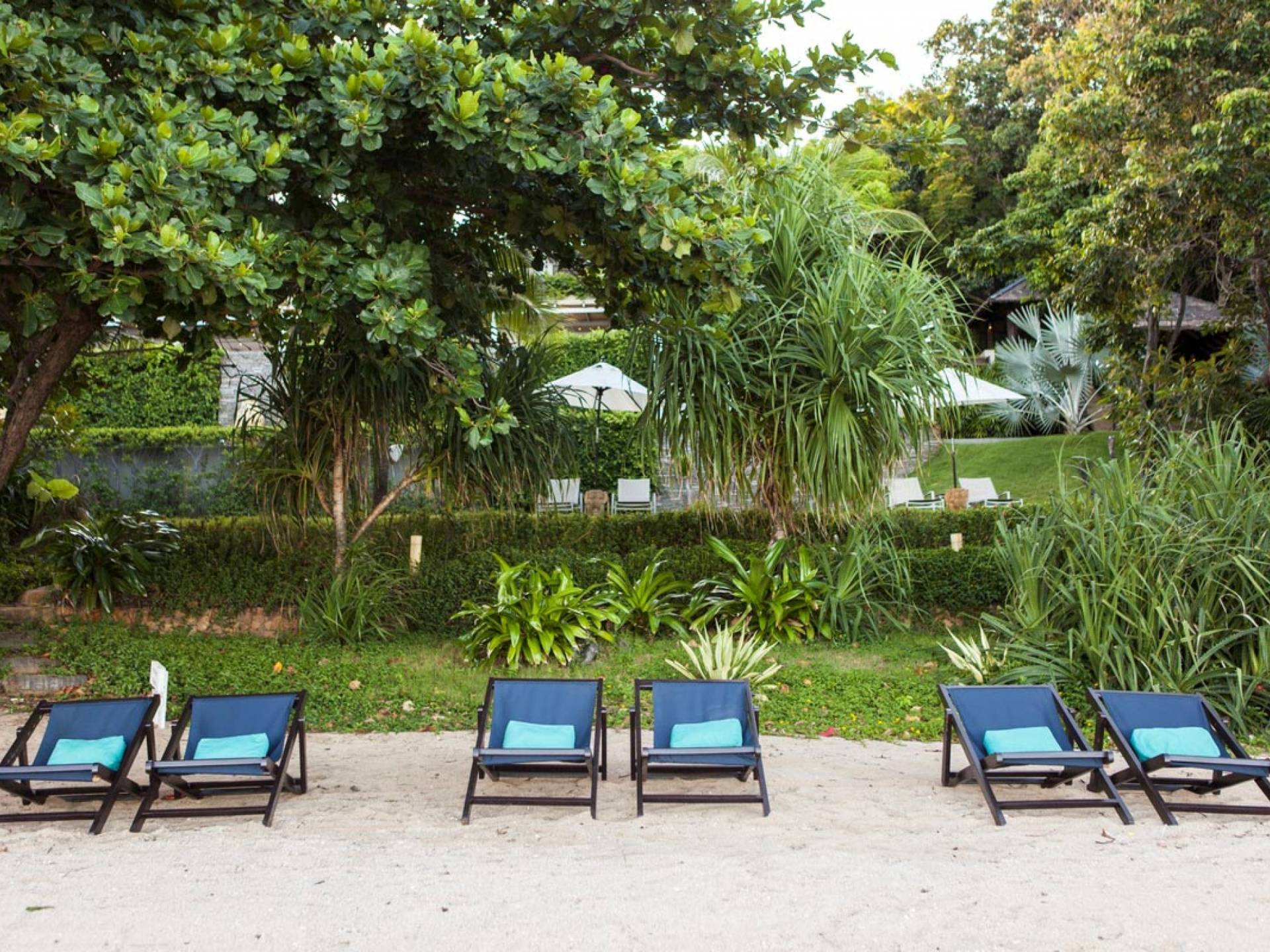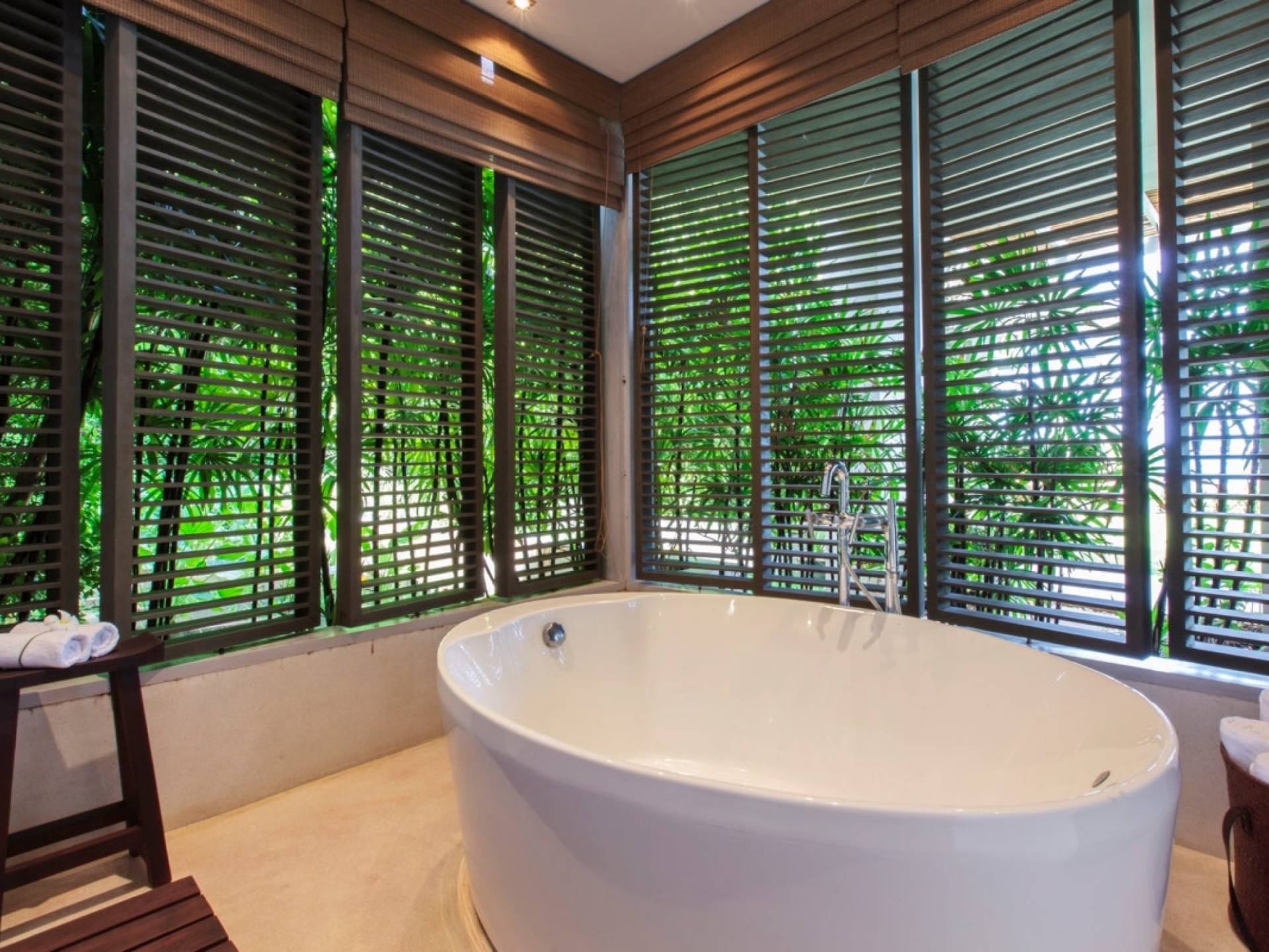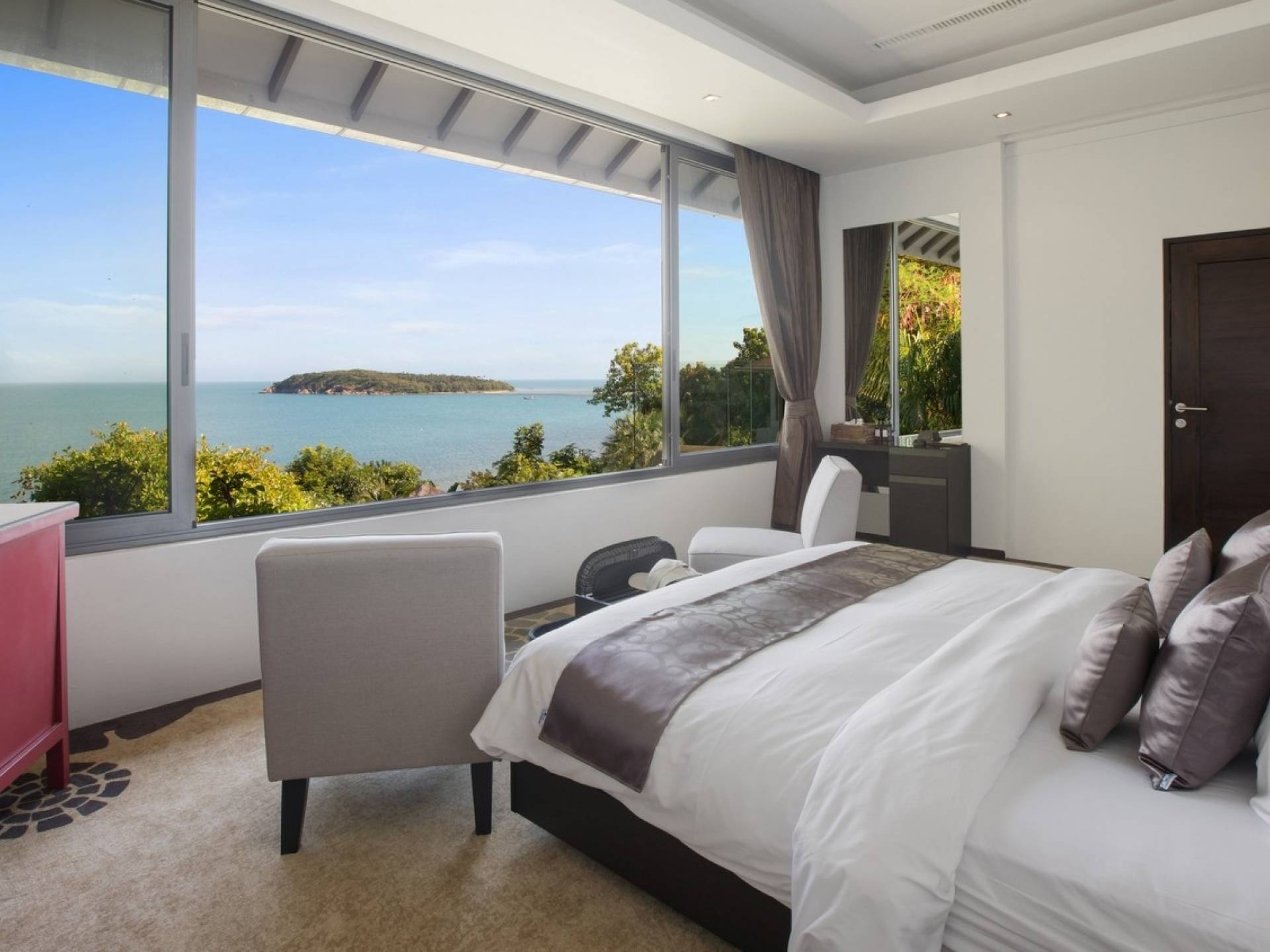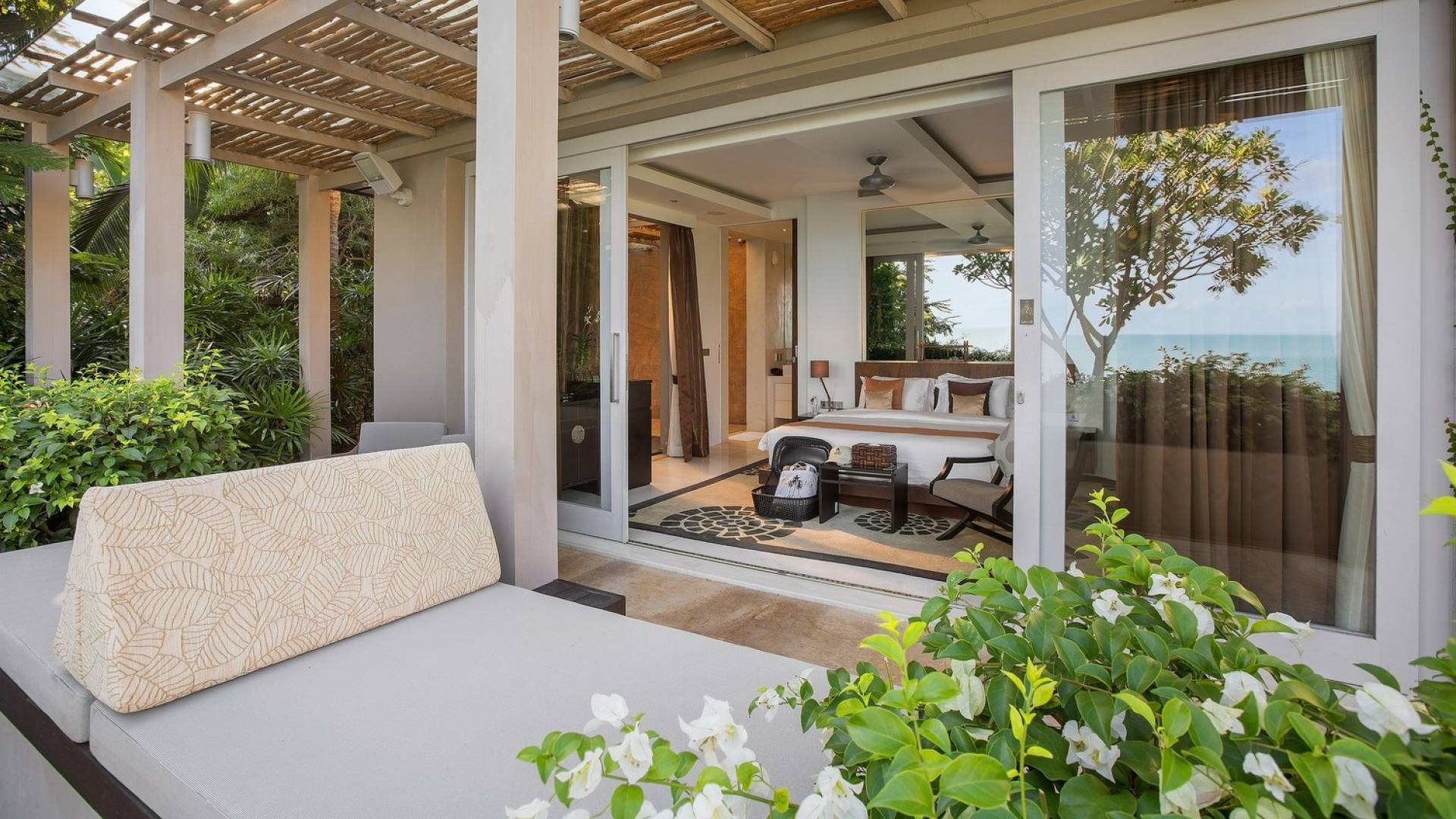 The villa's penultimate level houses the fabulous master suite, which also opens onto a private covered oceanview terrace and boasts two bathrooms, one with a shower, the other home to an indulgent standing bathtub for a soothing sea view soak. From there, steps lead down to the oceanside lawn, furnished with sun loungers overlooking the beach. A high wall at one end features a built-in projector screen so the garden can be transformed into an outdoor cinema.
