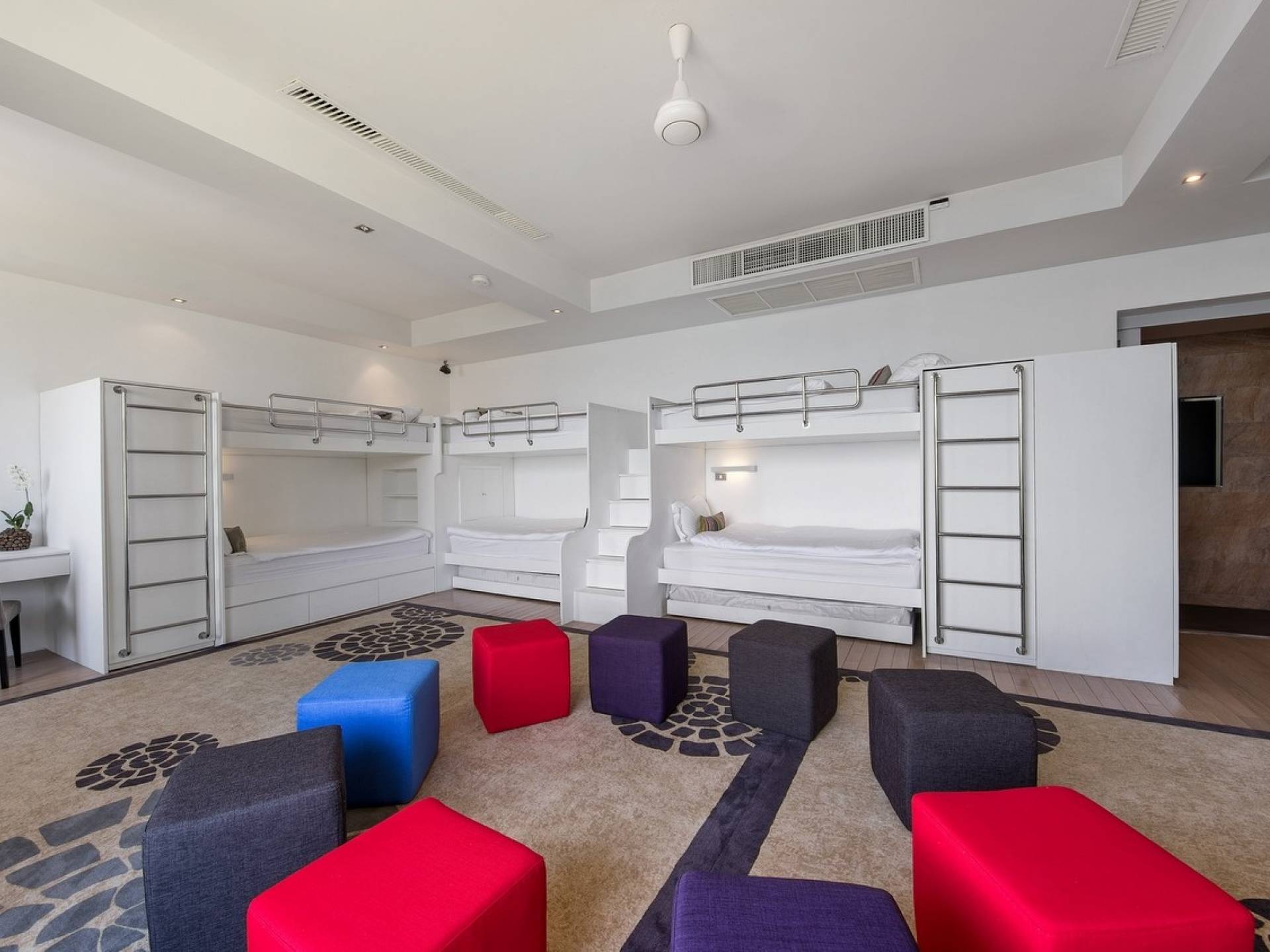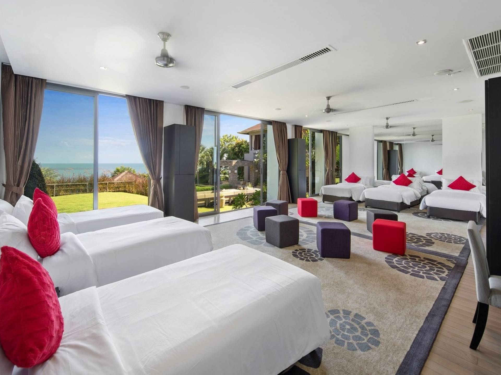 An automated gate at the villa's roadside entrance opens onto a car park area and staff quarters with the villa's only two-story accommodation occupying the top level of the grounds to the left. This building houses a yoga studio and comfortable AV room on the lower floor, the latter furnished with a sizeable sofa and wall-mounted flatscreen TV with DVD, satellite channels, and a powerful sound system. The upper floor is home to a spacious and colorful children's dorm with comfortable, contemporary bunk beds for eight children and an ensuite bathroom with a shower room and toilet. A guest or nanny's bedroom is directly opposite the dorm, also with its own bathroom, and all offer stunning views of the coast and ocean below.