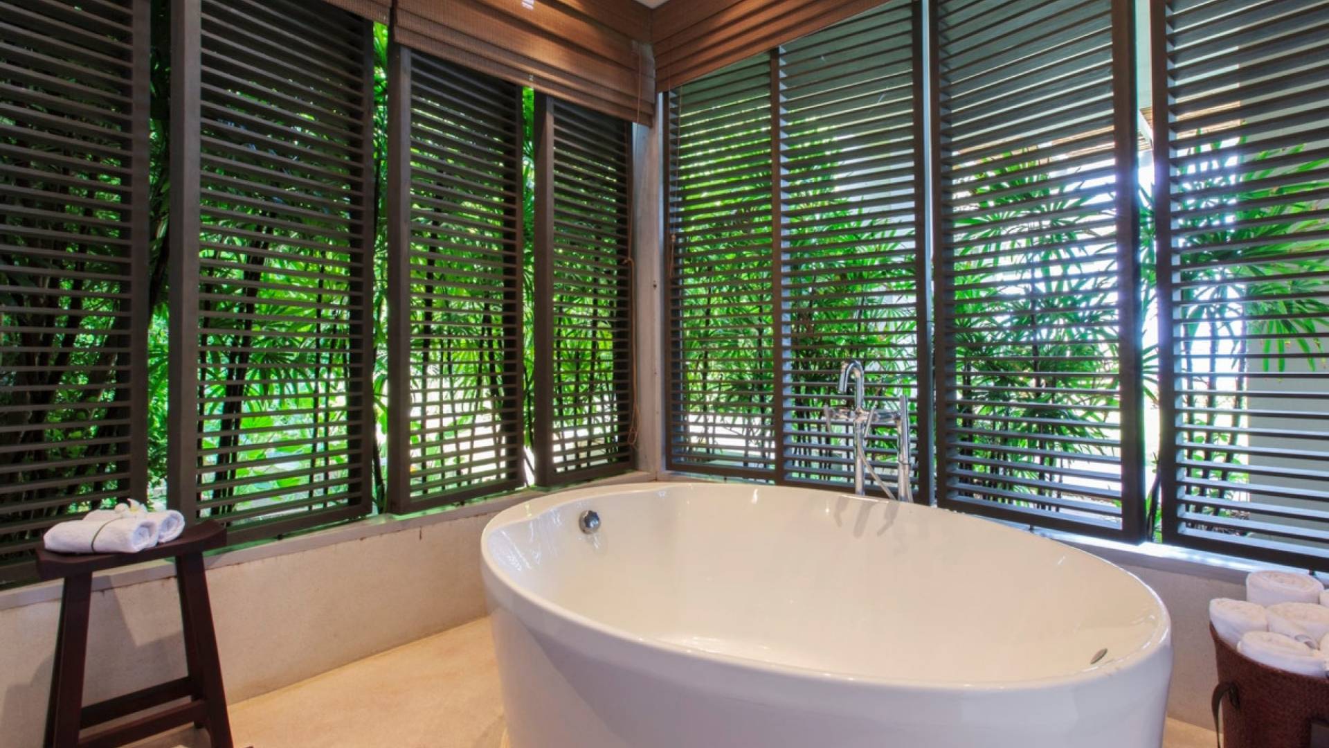 Wide central stone steps then lead down to another bedroom level, where Bedrooms 2 and 3 both slide open onto their own covered terraces and lawns. Both bedrooms feature walk-in wardrobes and a choice of indulgent bathing options. Bedroom 3 opens onto an outdoor bathtub, Bedroom 2 onto an outdoor shower.
