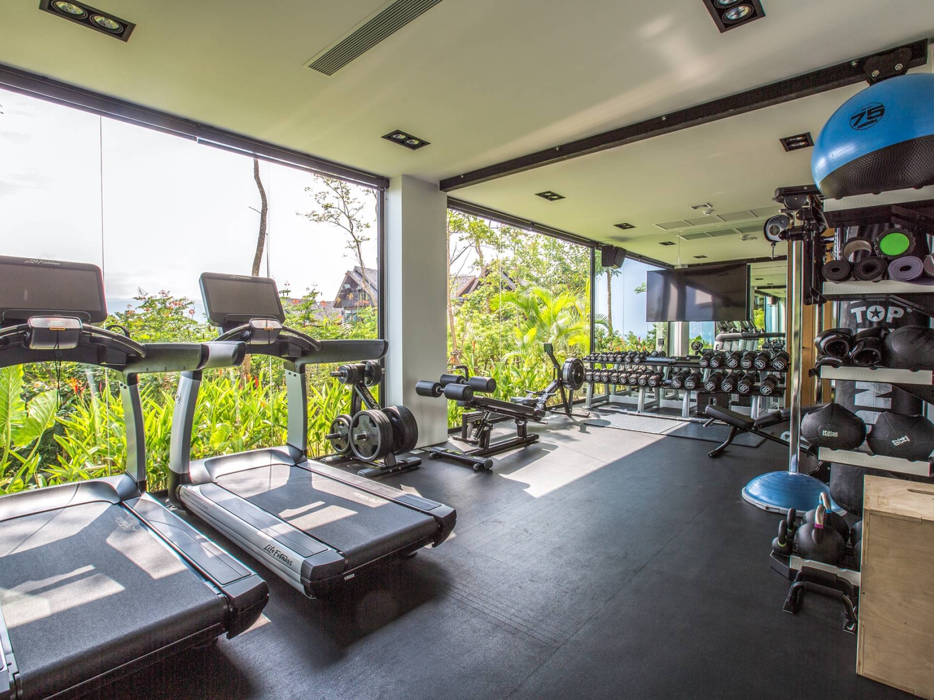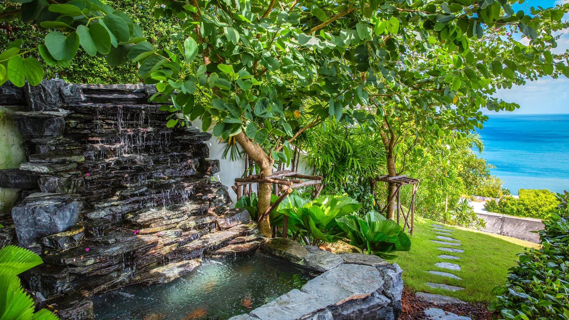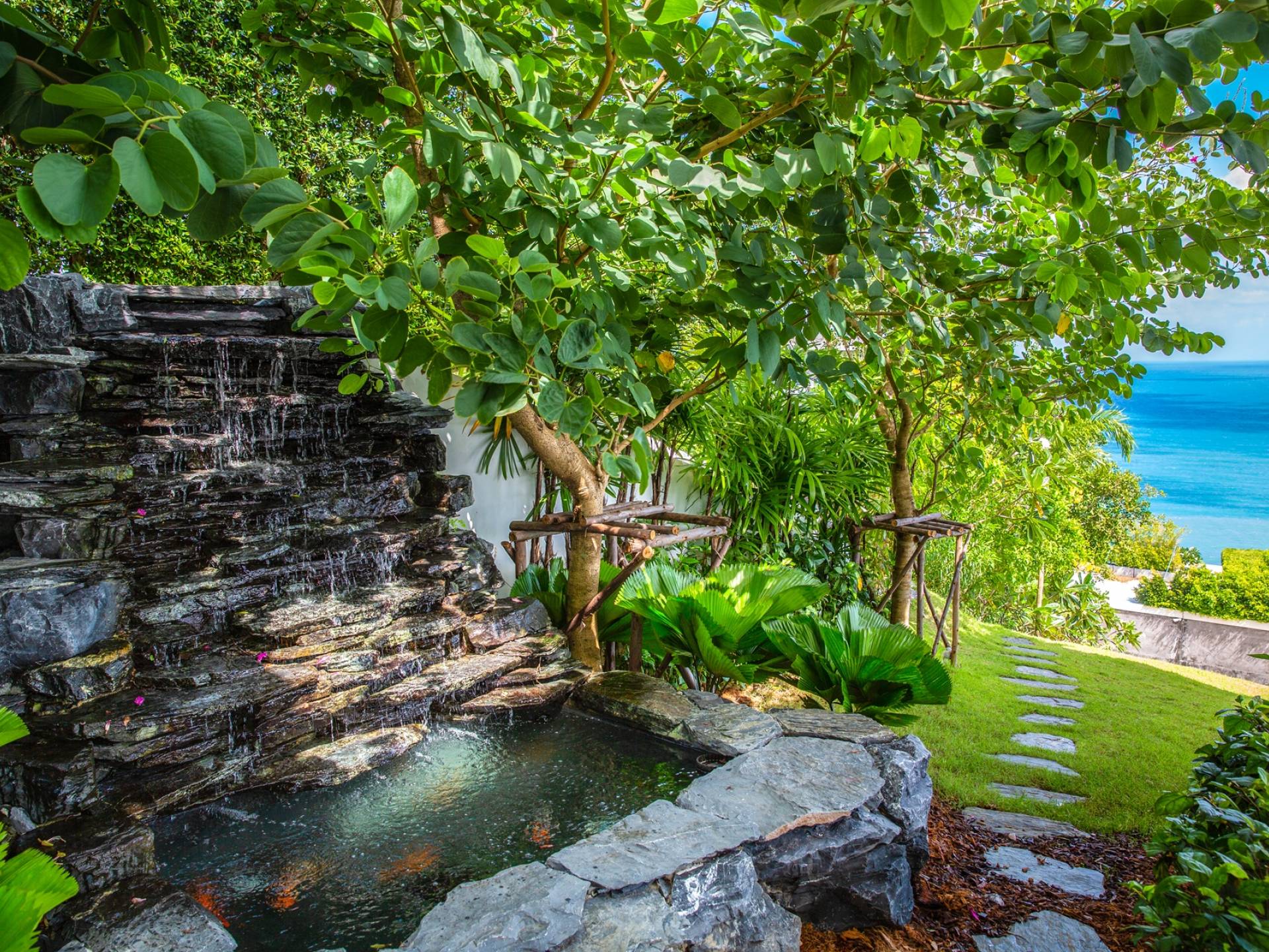 The outdoors of Villa Amylia Emerald features spacious pool decks and terraces to embrace a view like no other, overlooking the sea and the island of Koh Matlang, with each deck boasting multiple seating and lounge areas, besides the designer sunbeds. Villa Amylia Emerald has a large covered dining table and a sunken sala seating 14, the relaxing place to be with the background noise of the waterfall from the fish pond in the tropical garden. The rooftop terrace, accessible from that deck, can host up to 40 guests, or a more private family dinner.