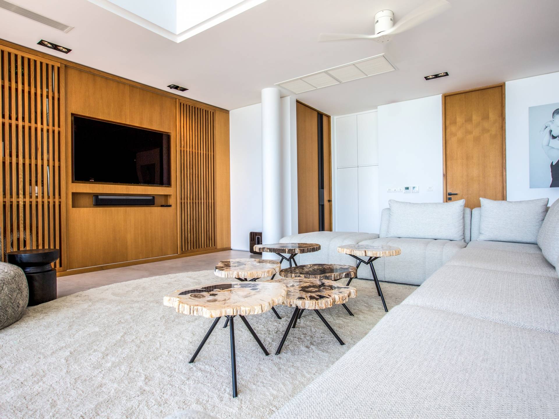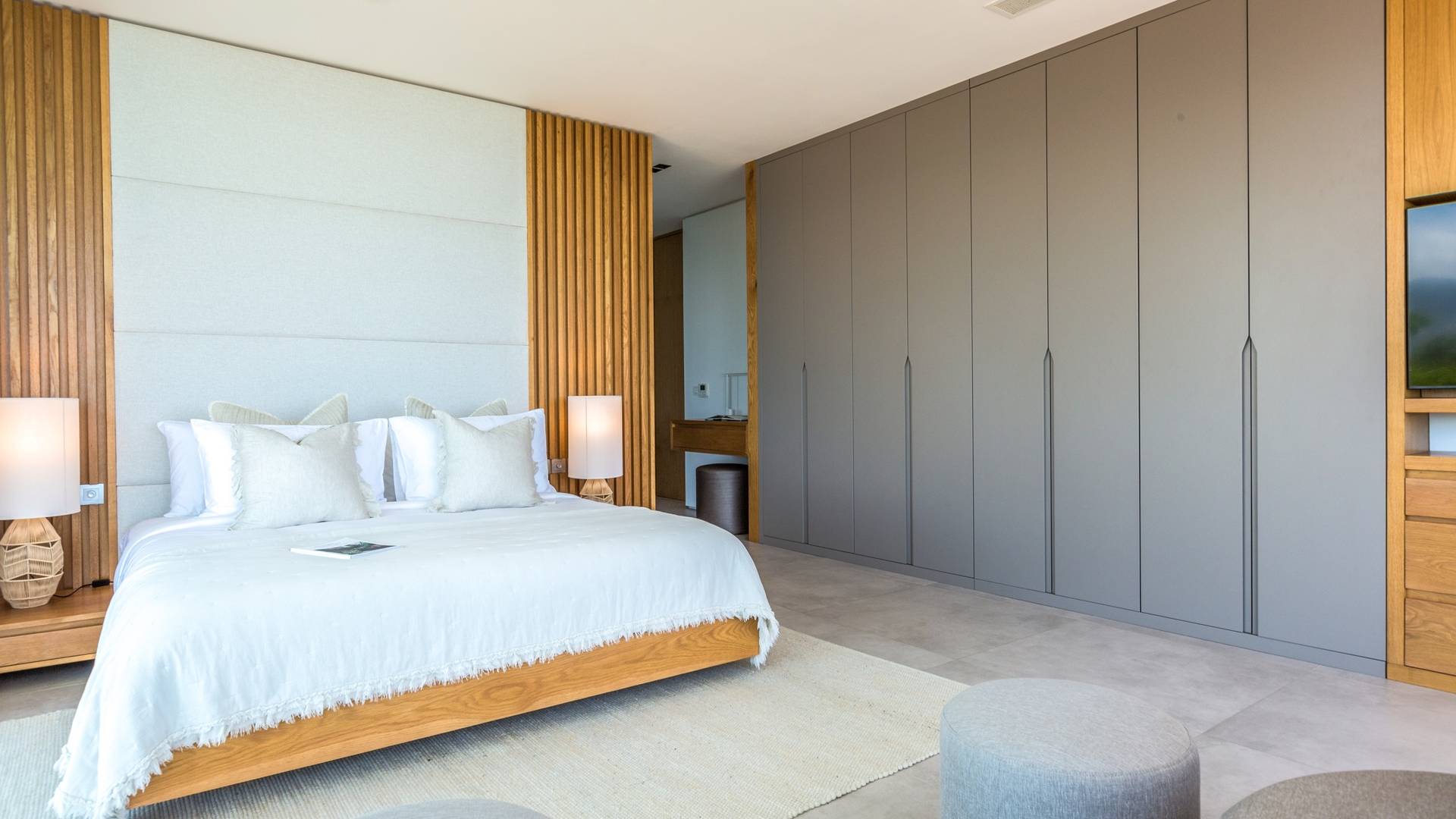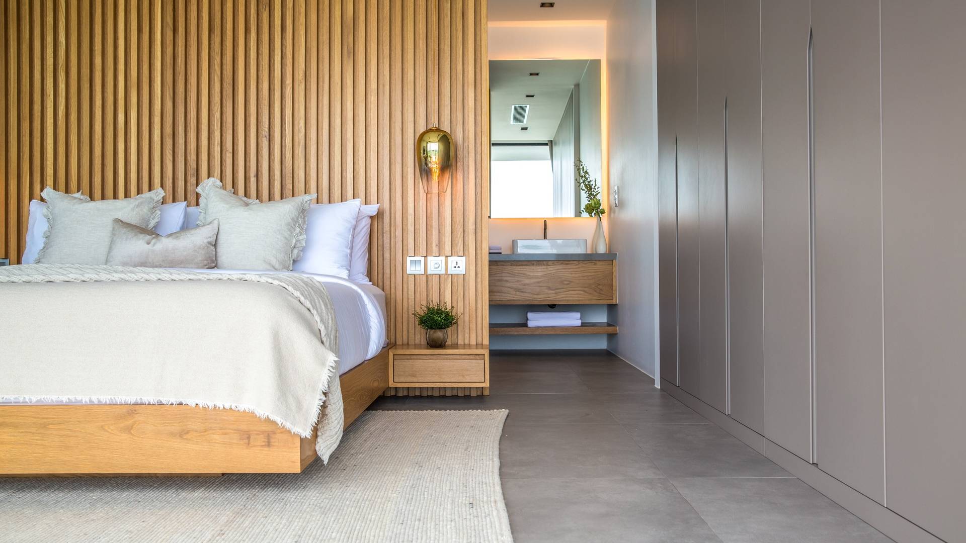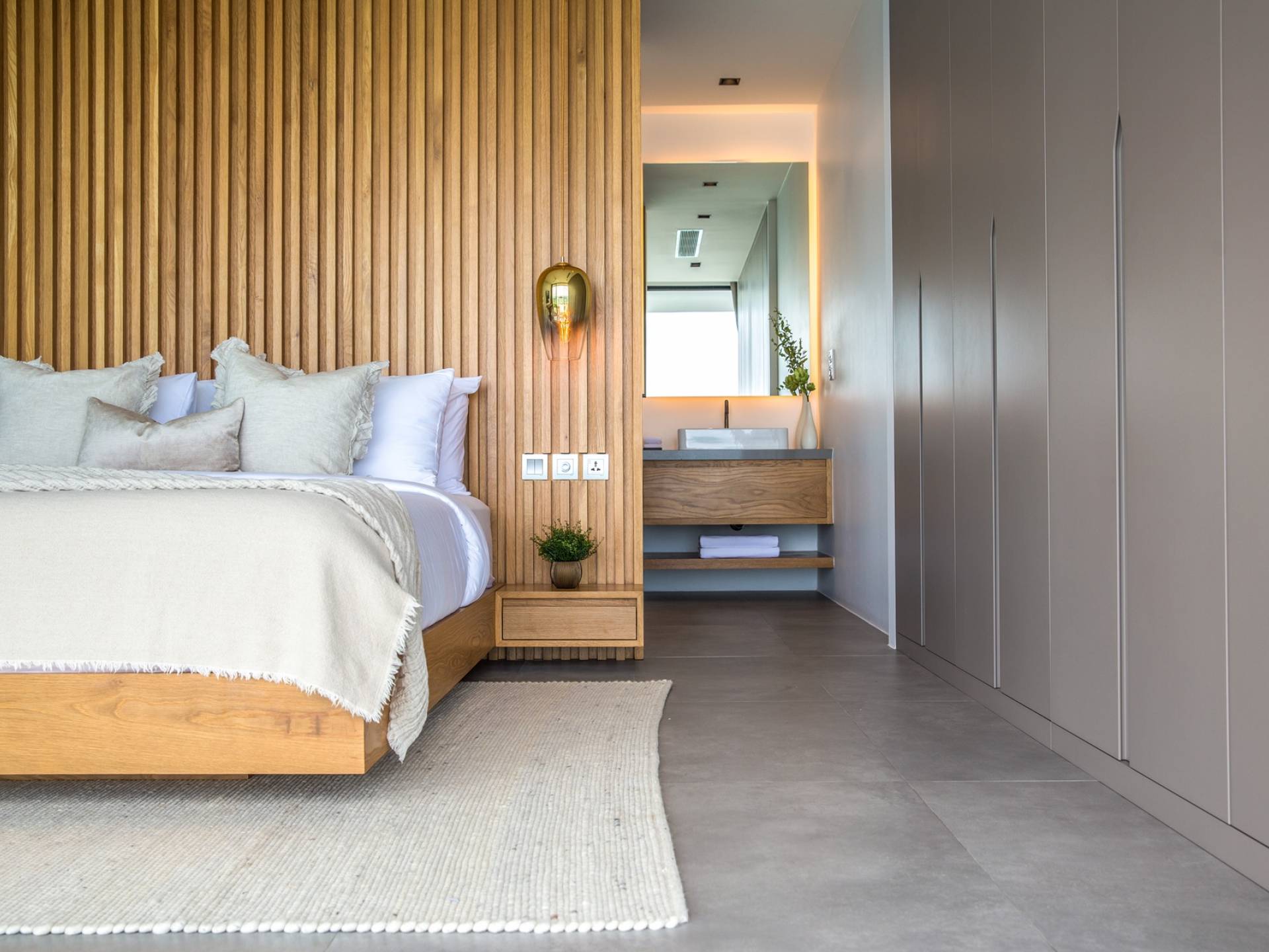 The facilities are complete with a dedicated massage and treatment room for two guests, a fully-equipped gym, and a home cinema seating 8-12. Villa Amylia Emerald is available in its entirety for groups up to 10 guests in 5 bedrooms. Villa Amylia Emerald's open-plan main floor features a soft grey stone floor, that goes effortlessly through all the bedrooms, balconies, and connecting en-suites. All the wooden furniture was custom made to bring a beautiful well integrated finished look throughout, especially when combined with the custom-made wardrobes.