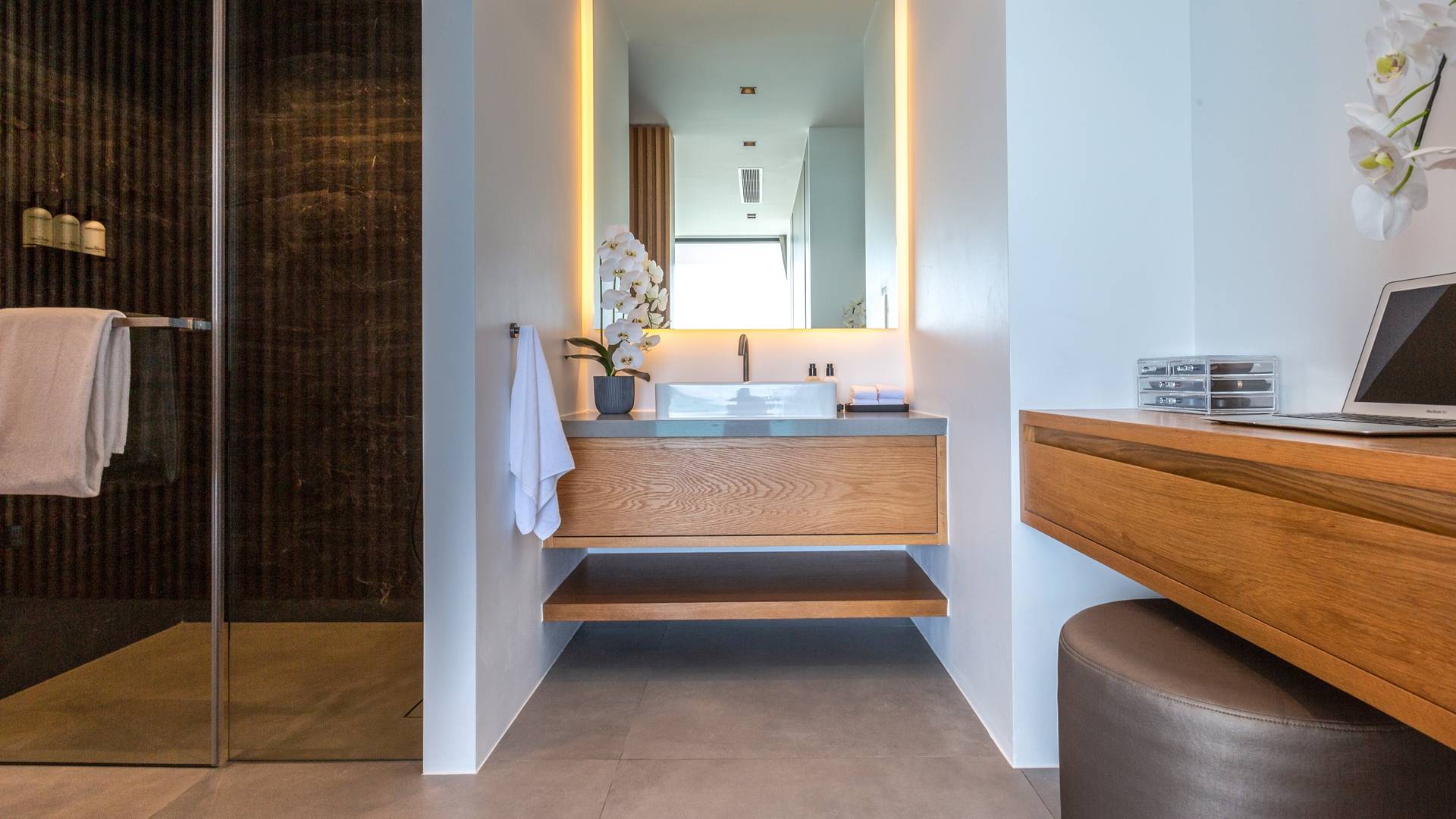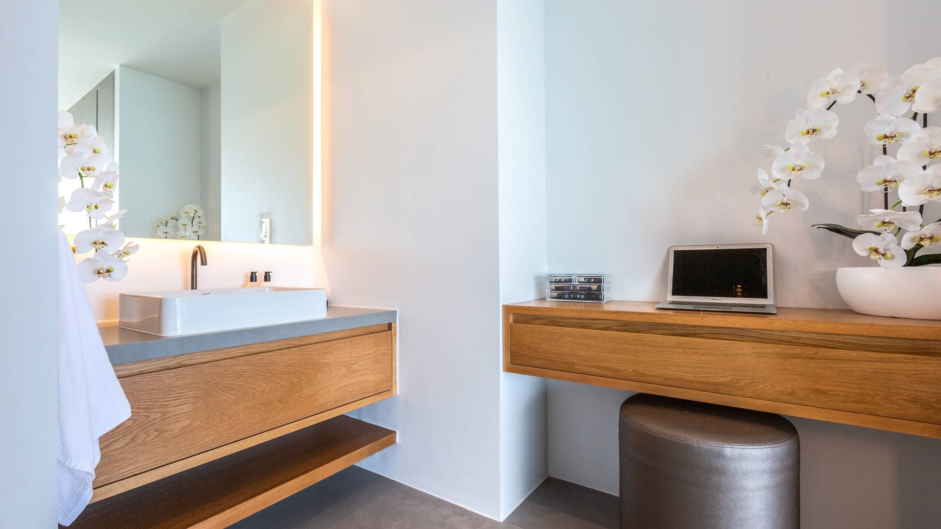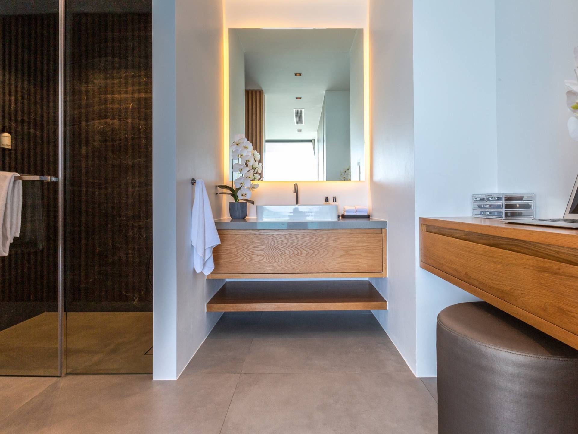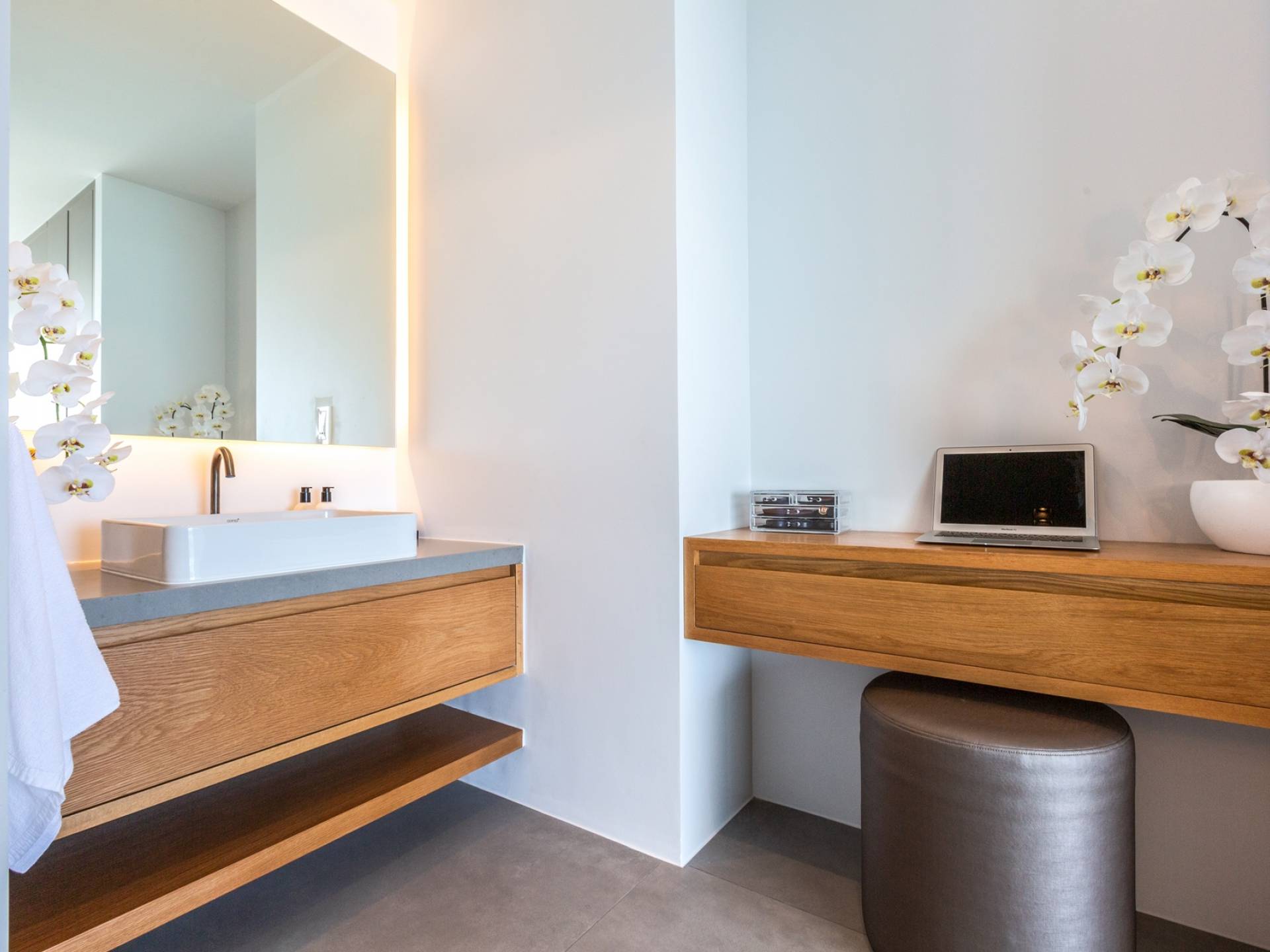 The facilities are complete with a dedicated massage and treatment room for two guests, a fully-equipped gym, and a home cinema seating 8-12. Villa Amylia Emerald is available in its entirety for groups up to 10 guests in 5 bedrooms. Villa Amylia Emerald's open-plan main floor features a soft grey stone floor, that goes effortlessly through all the bedrooms, balconies, and connecting en-suites. All the wooden furniture was custom made to bring a beautiful well integrated finished look throughout, especially when combined with the custom-made wardrobes.