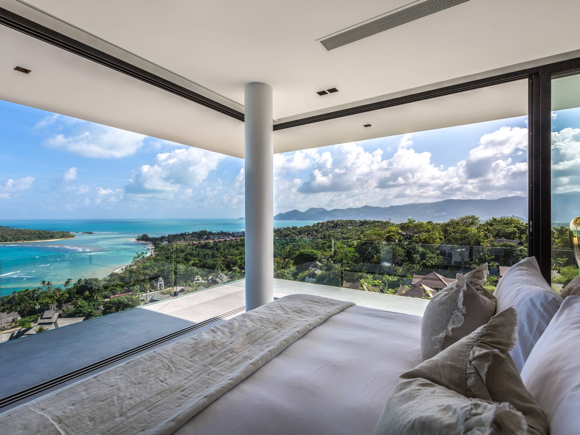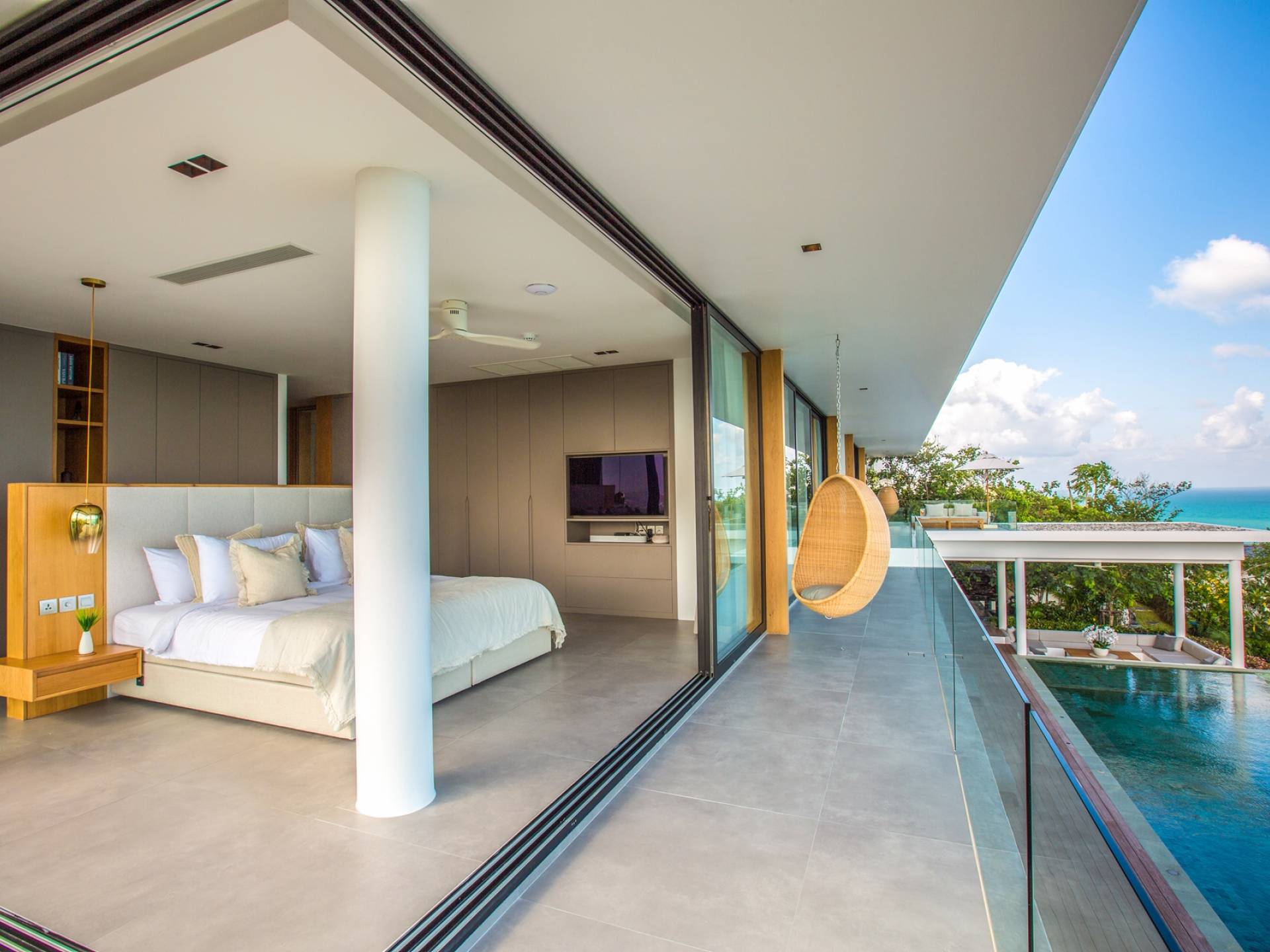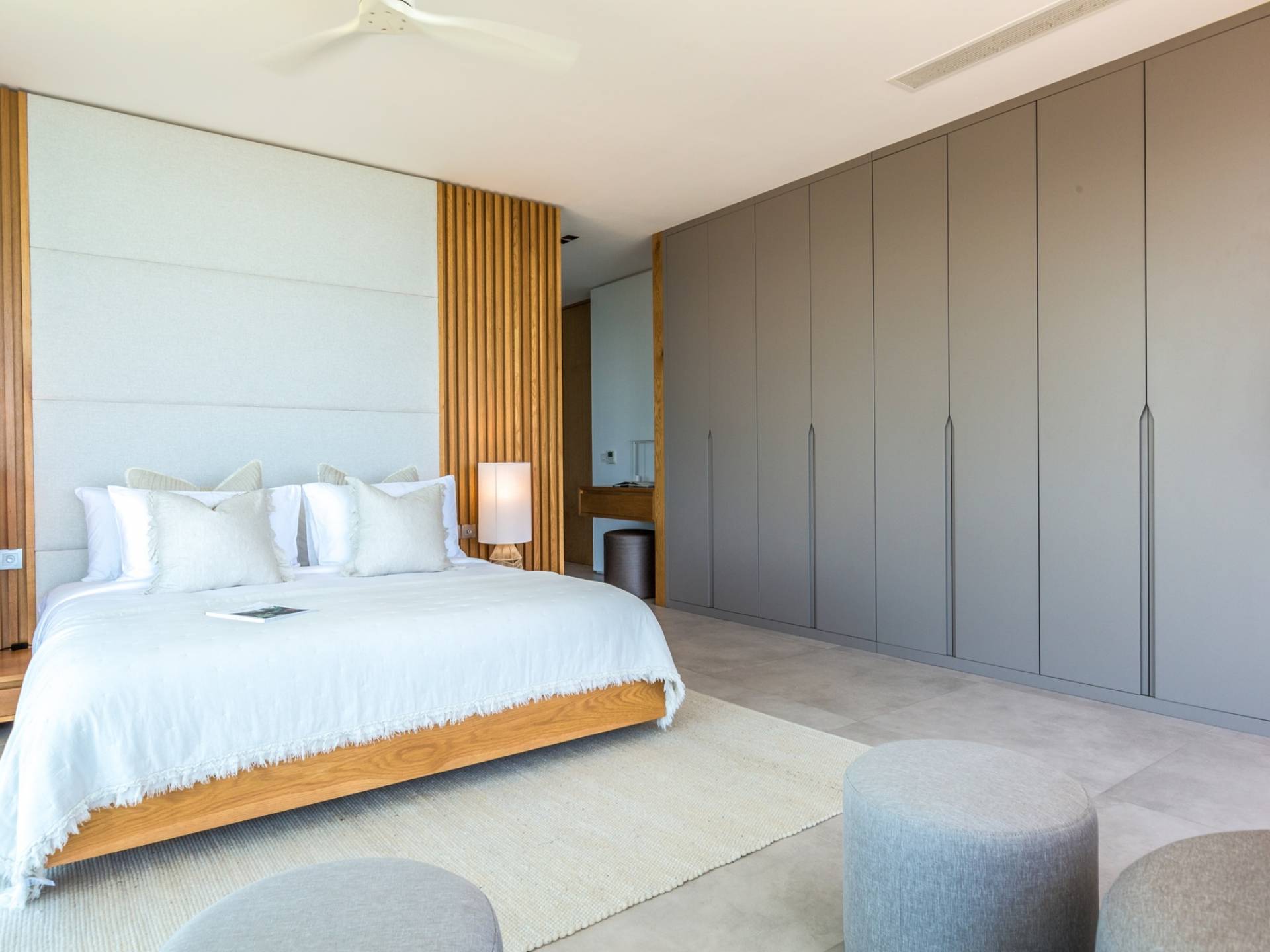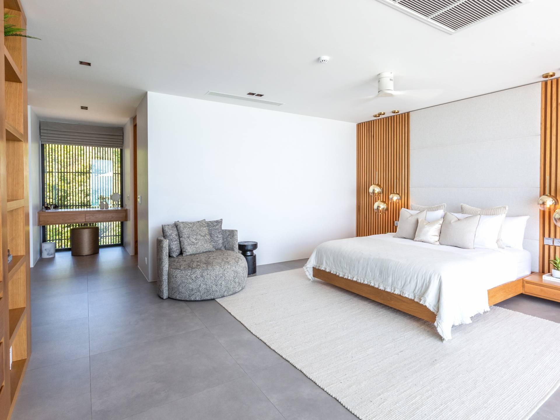 The wooden slats are a recurring feature in the living areas and bedrooms to create dimension and texture. Combined with the natural color scheme of the rest of the interior, the villa exudes a sense of peace and simplicity. All 5 bedrooms have a world-class sea view facing East, with 1of the master bedroom boasting a rare 270 degrees sea view also partially overlooking Koh Samui’s beautiful mountains.