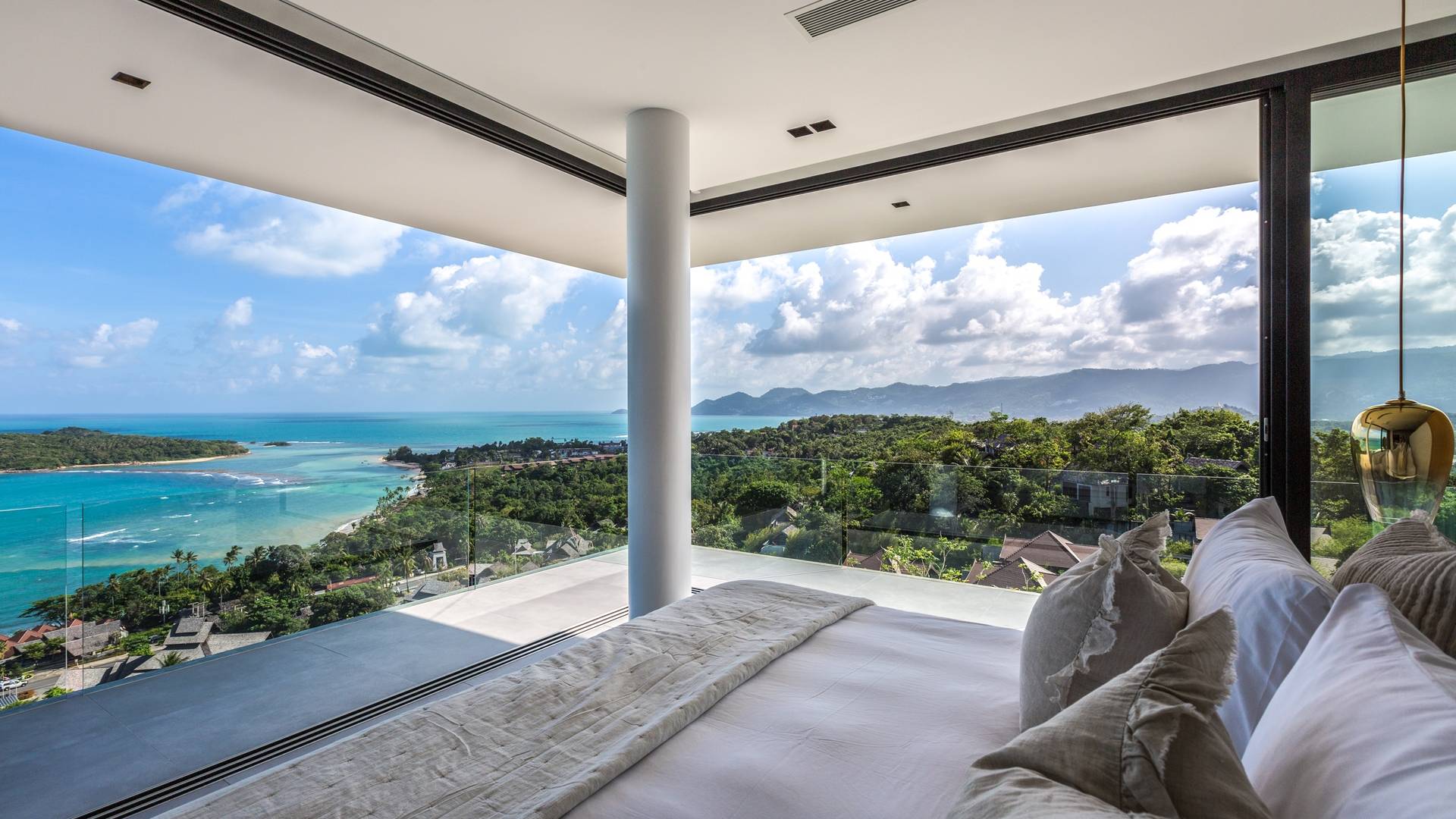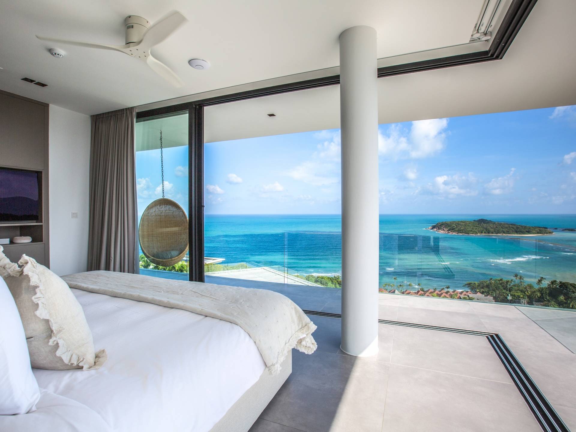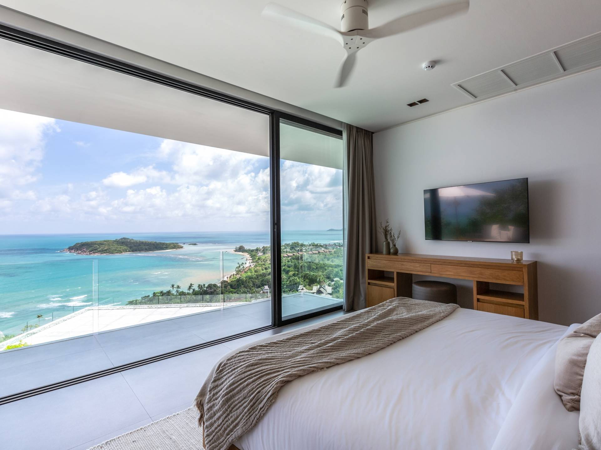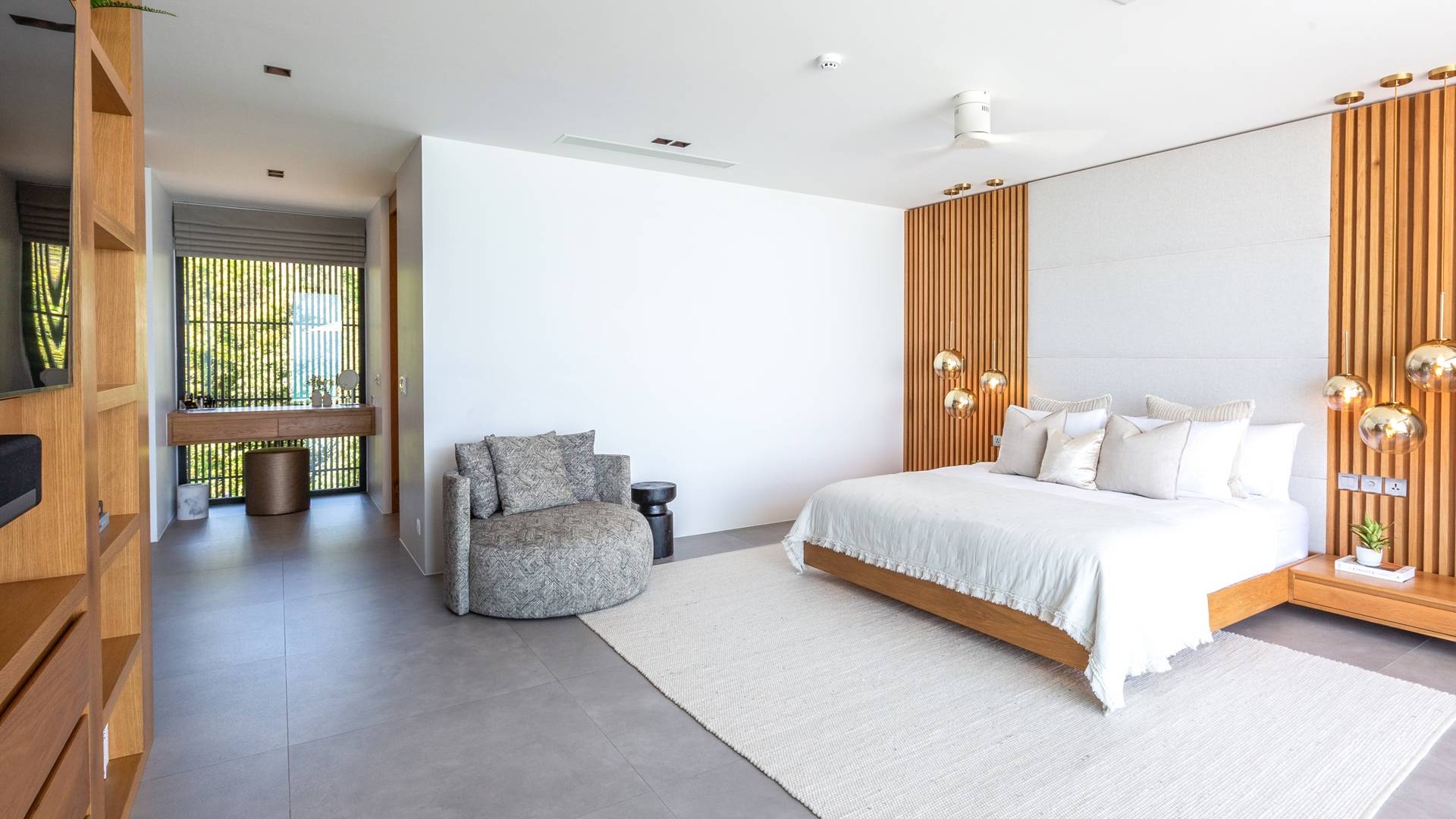 The wooden slats are a recurring feature in the living areas and bedrooms to create dimension and texture. Combined with the natural color scheme of the rest of the interior, the villa exudes a sense of peace and simplicity. All 5 bedrooms have a world-class sea view facing East, with 1of the master bedroom boasting a rare 270 degrees sea view also partially overlooking Koh Samui’s beautiful mountains.