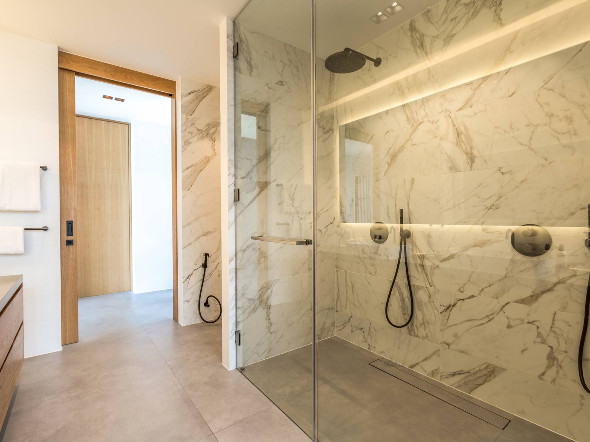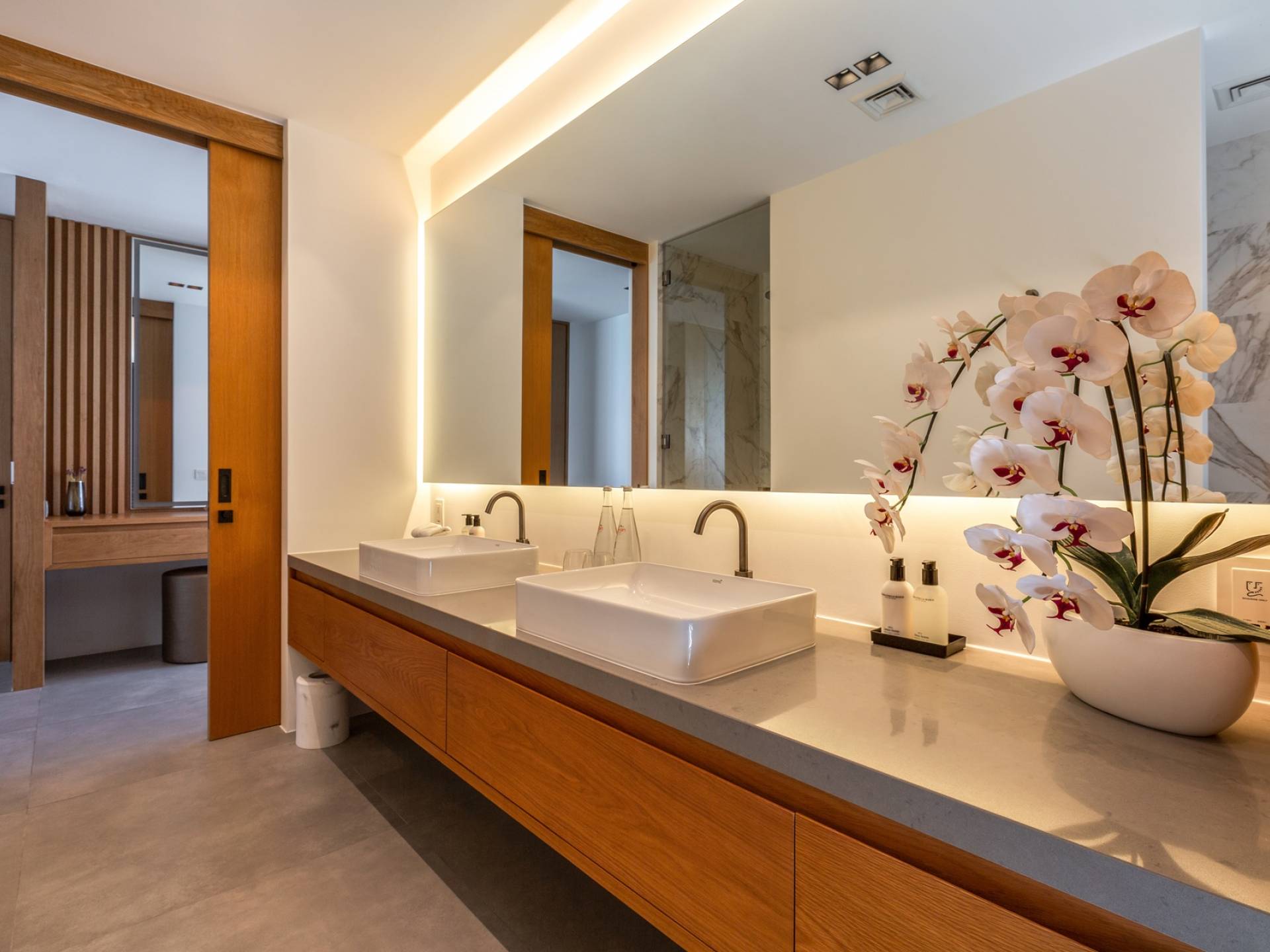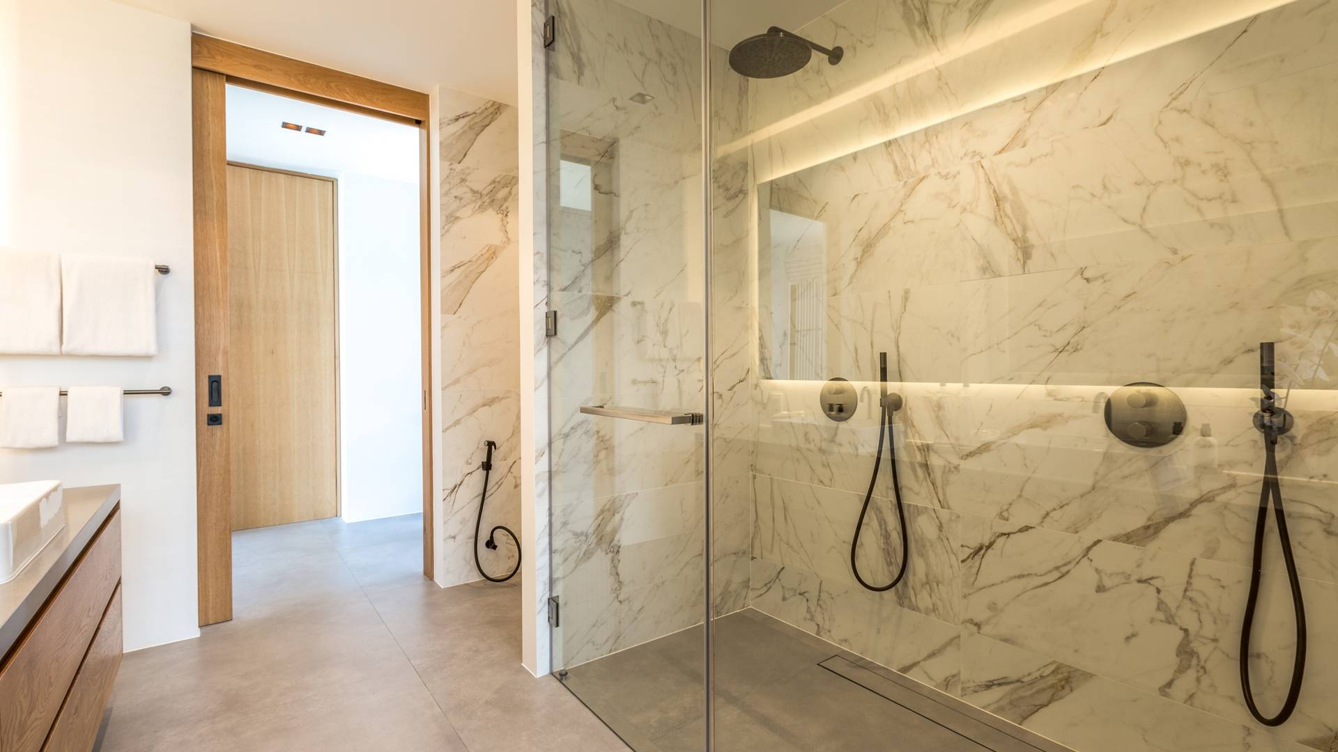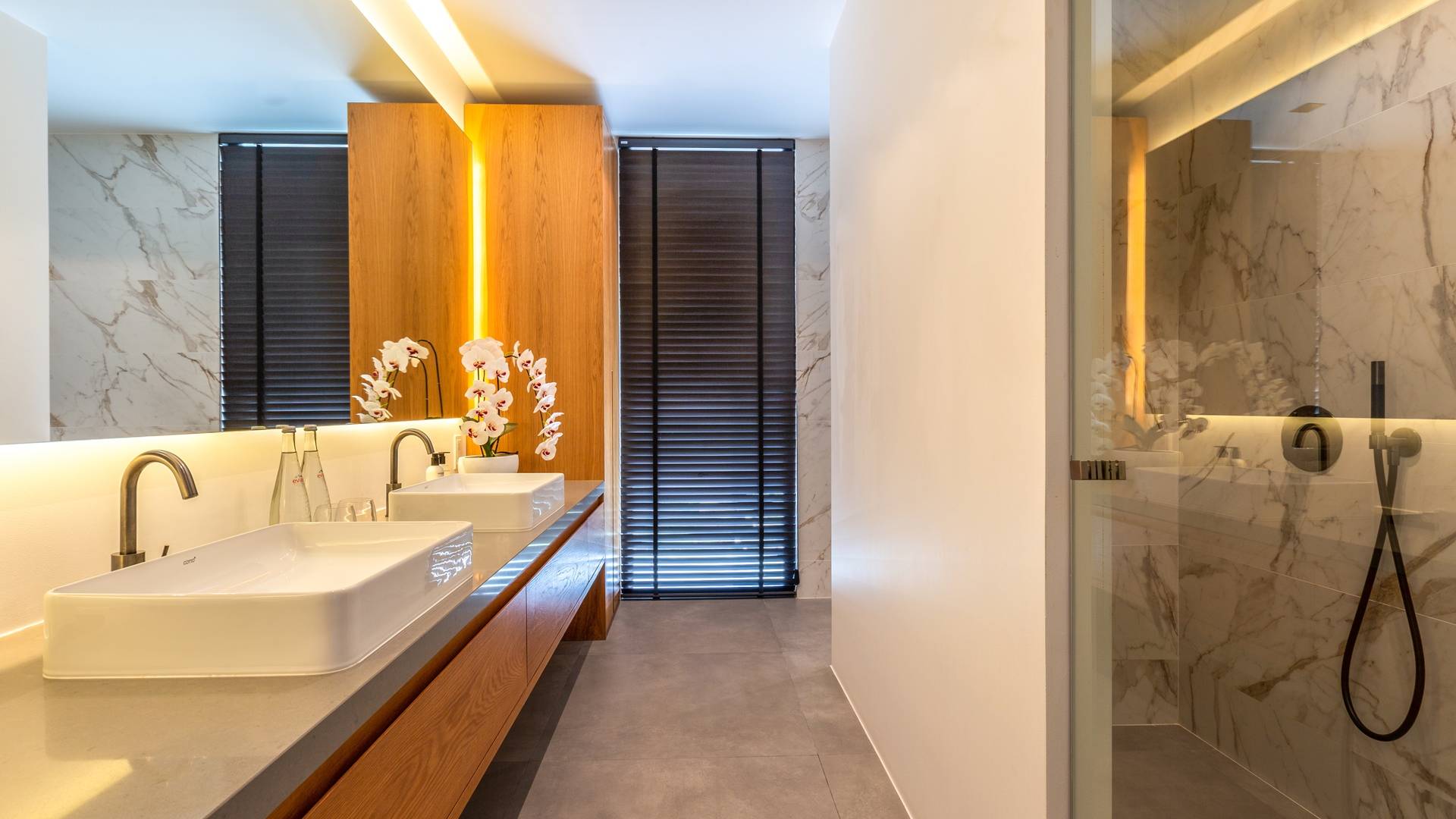 Each bedroom has its own generous en-suite bath or shower rooms that showcase high-quality amenities such as walk-in rain showers, and imported tiles from Italy. One of the master bedrooms in each villa has a stand-alone bath. Technology is also a pivotal feature of this spectacular villa from integrated B&W speakers, Sonos bars, superfast WI-FI, electrical curtains, and a modern security system. Conscious of the impact such a generous property has, the villa is fully powered by solar panels located on the top flat roof and invisible to the Guests. Breathtaking views