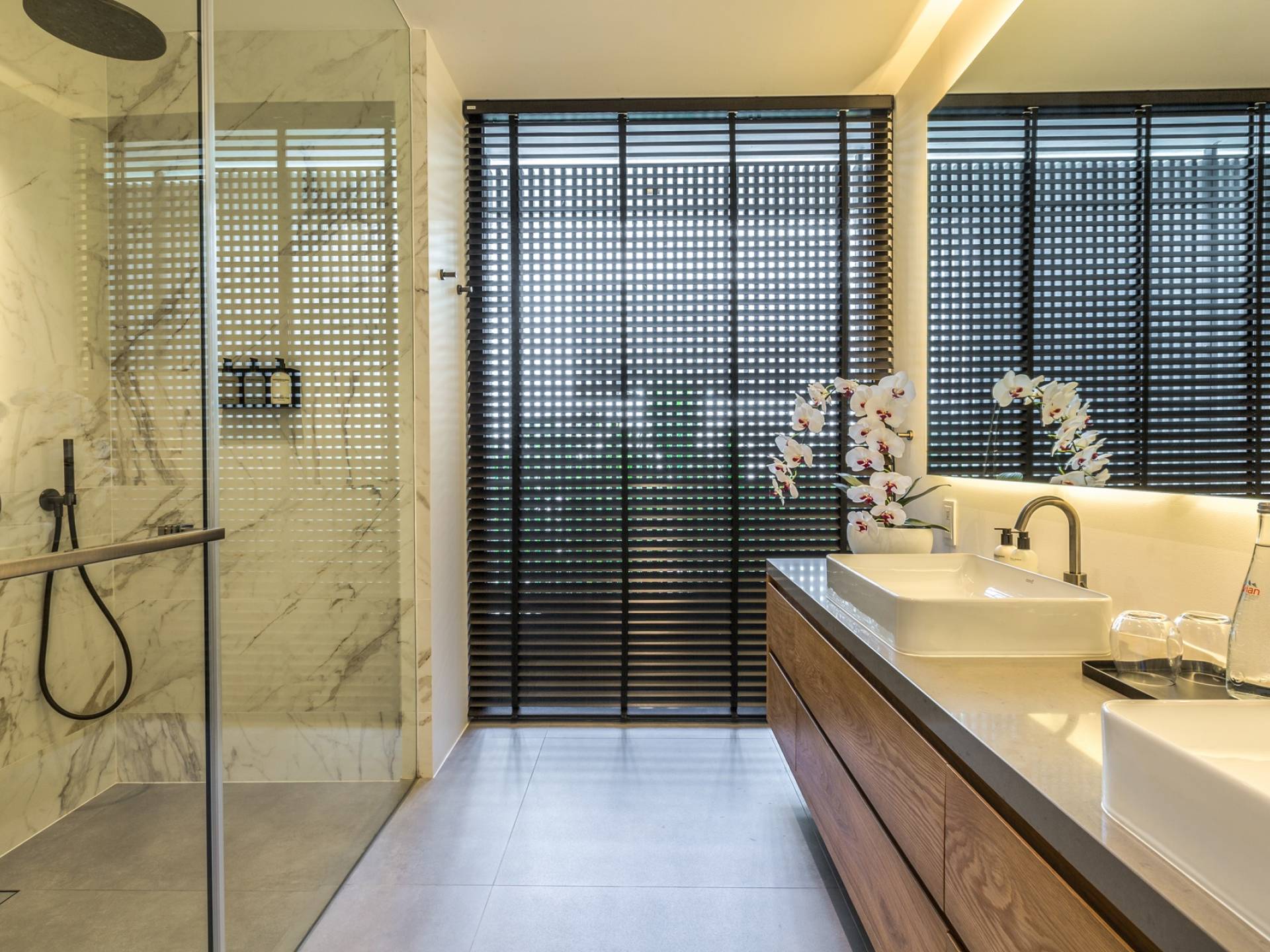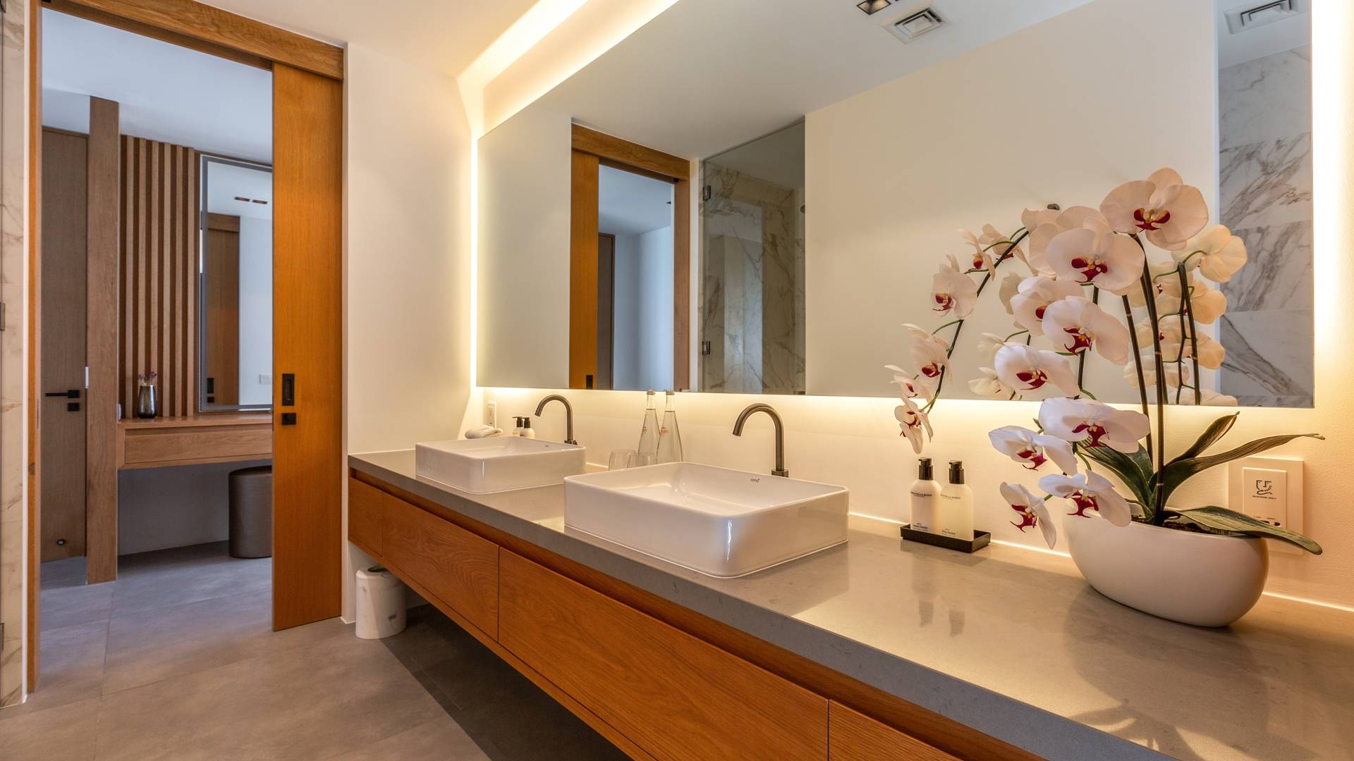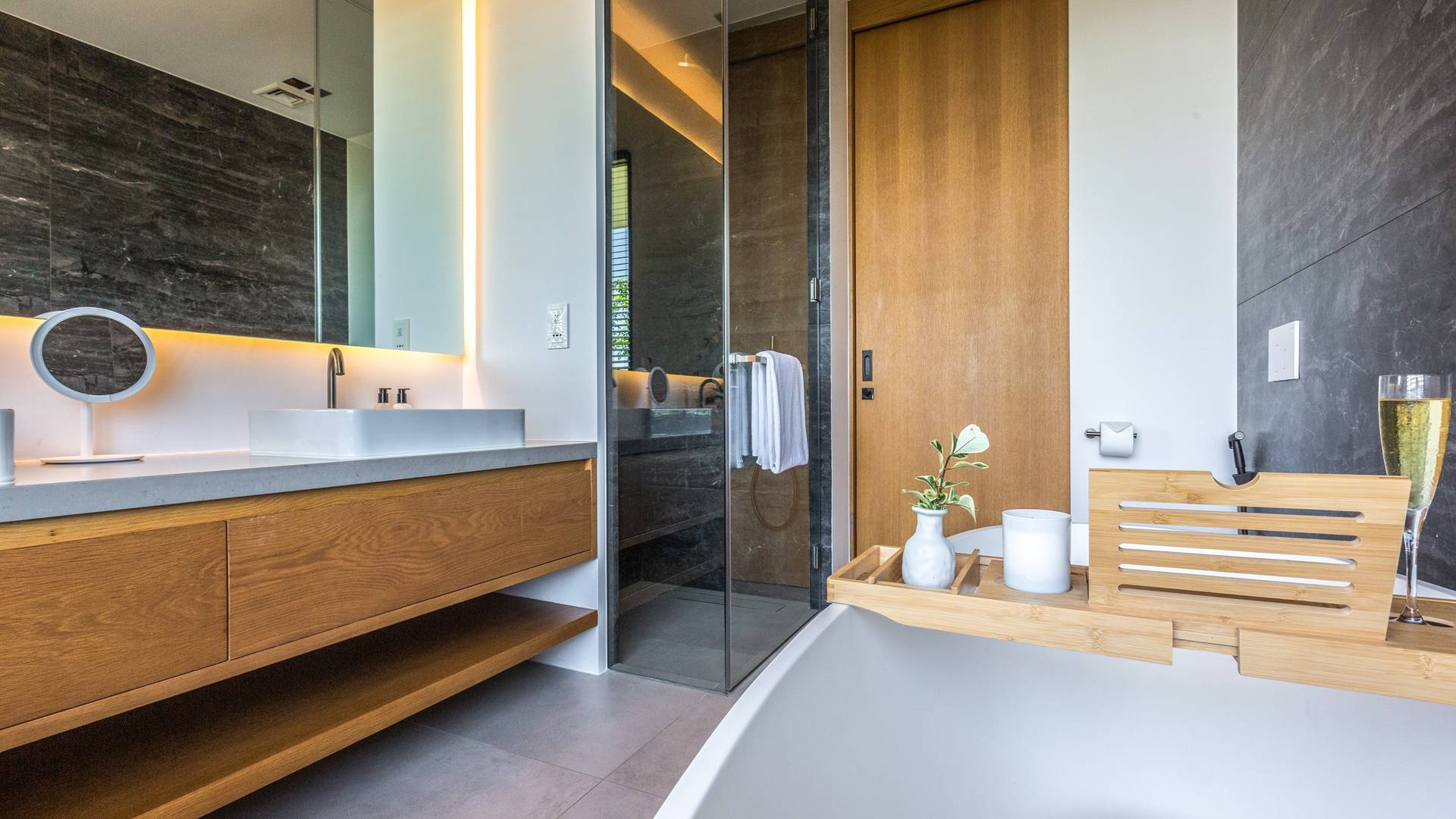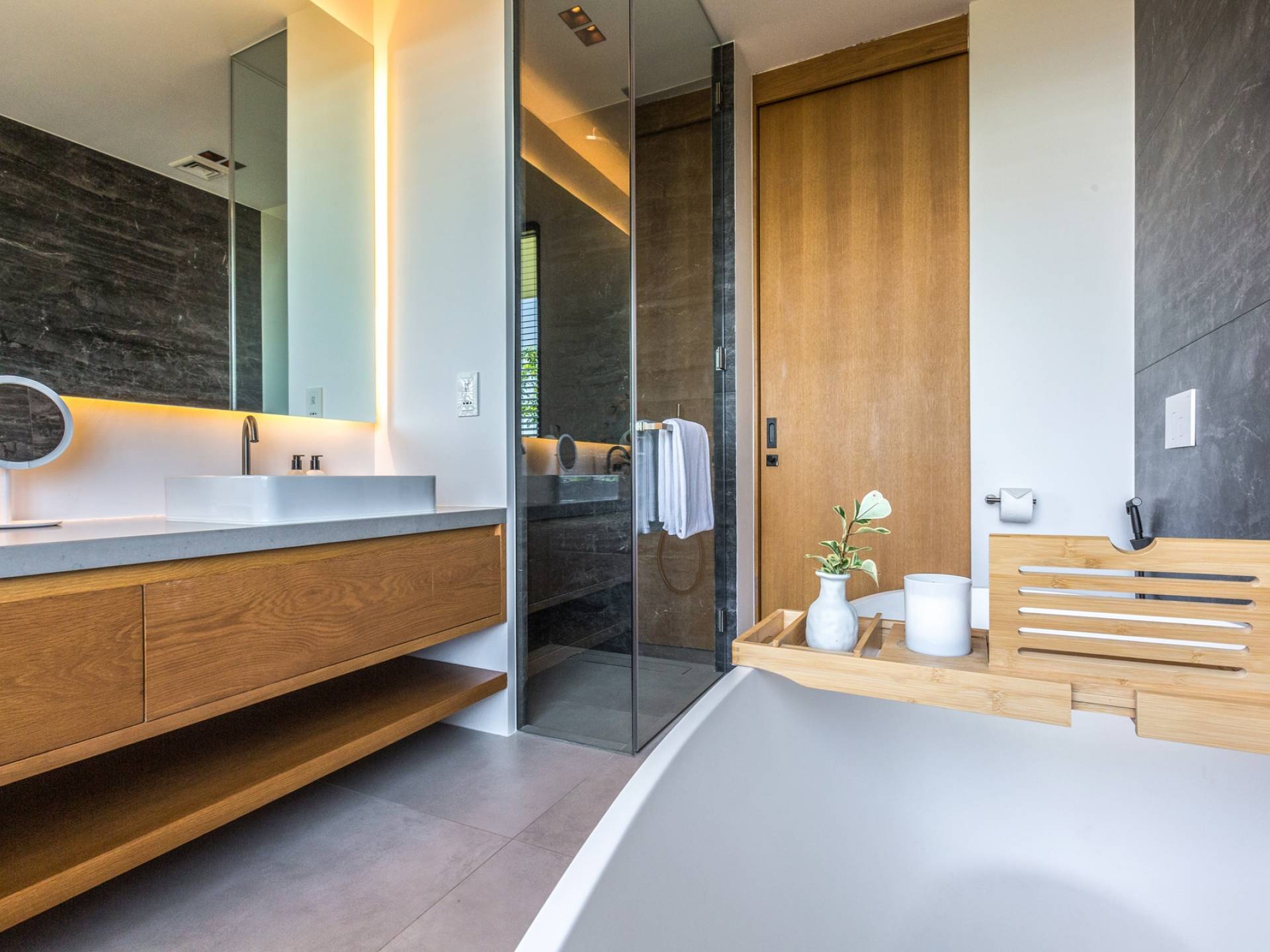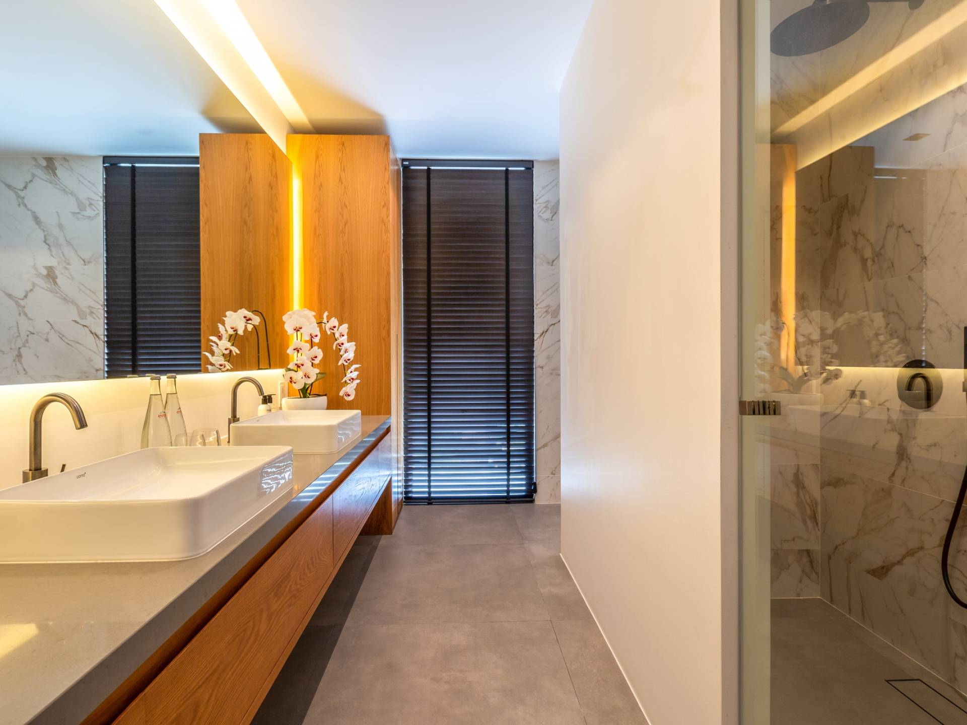 Each bedroom has its own generous en-suite bath or shower rooms that showcase high-quality amenities such as walk-in rain showers, and imported tiles from Italy. One of the master bedrooms in each villa has a stand-alone bath. Technology is also a pivotal feature of this spectacular villa from integrated B&W speakers, Sonos bars, superfast WI-FI, electrical curtains, and a modern security system. Conscious of the impact such a generous property has, the villa is fully powered by solar panels located on the top flat roof and invisible to the Guests. Breathtaking views