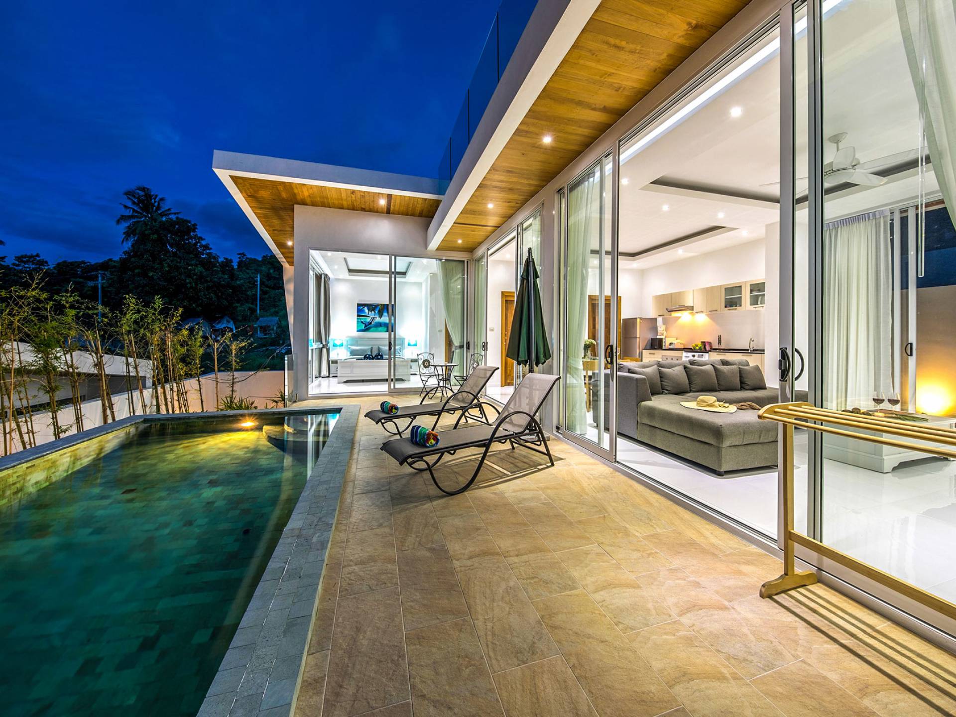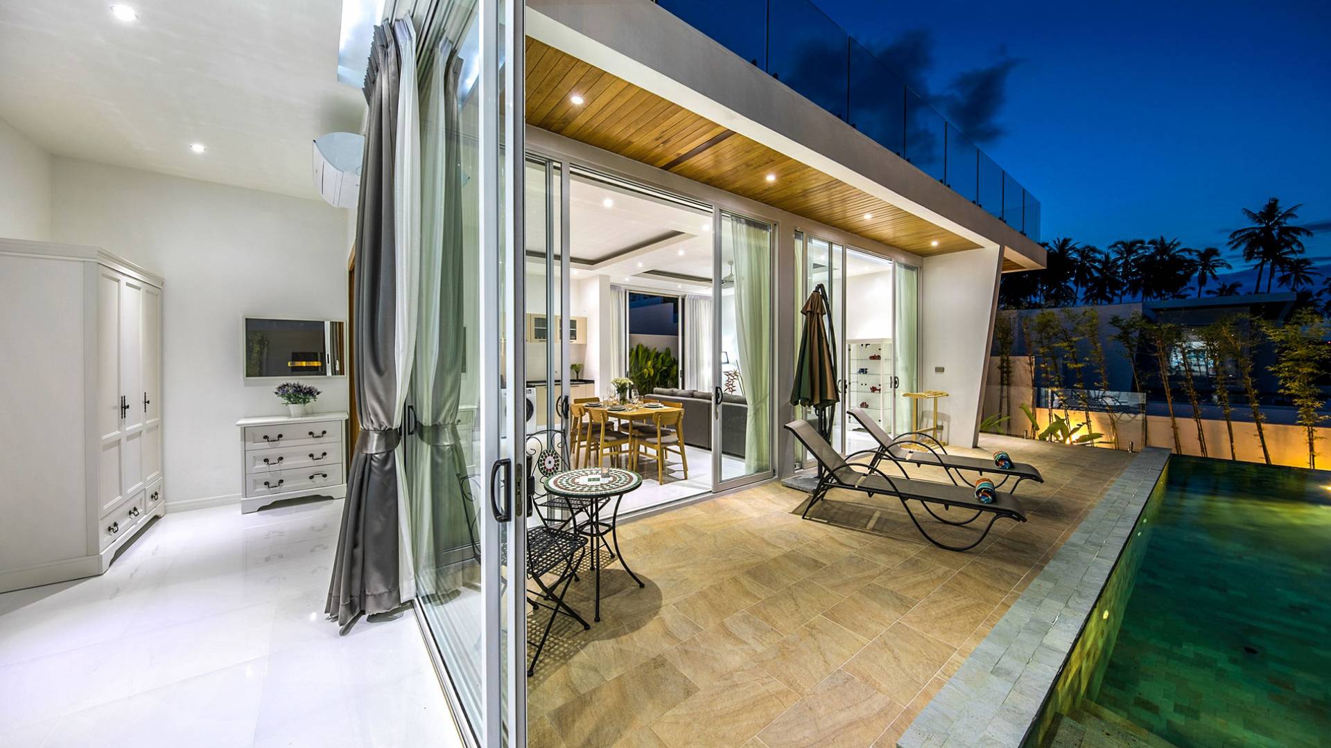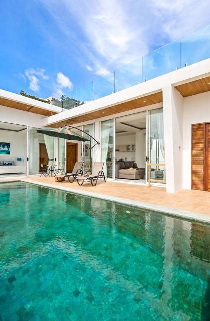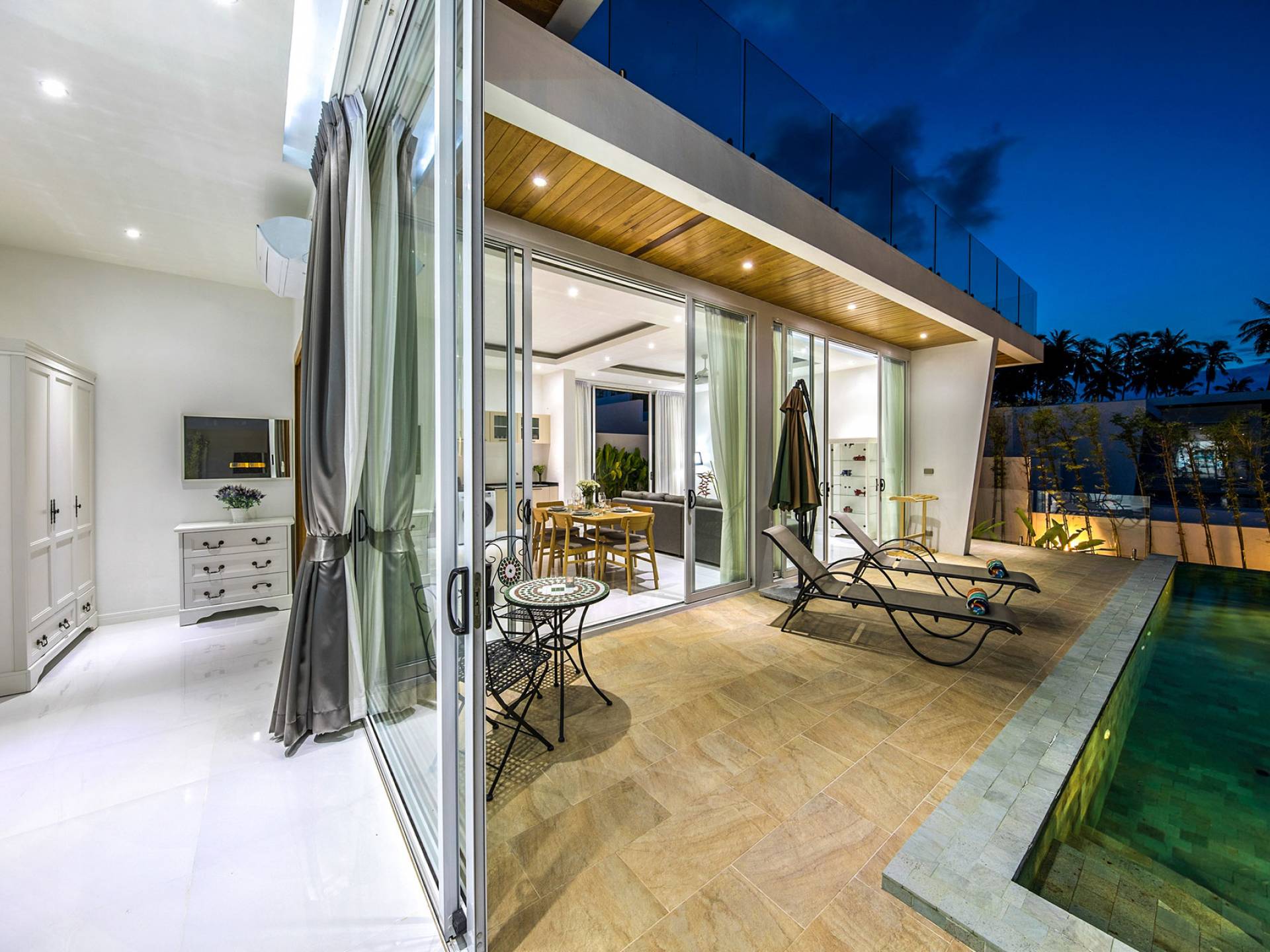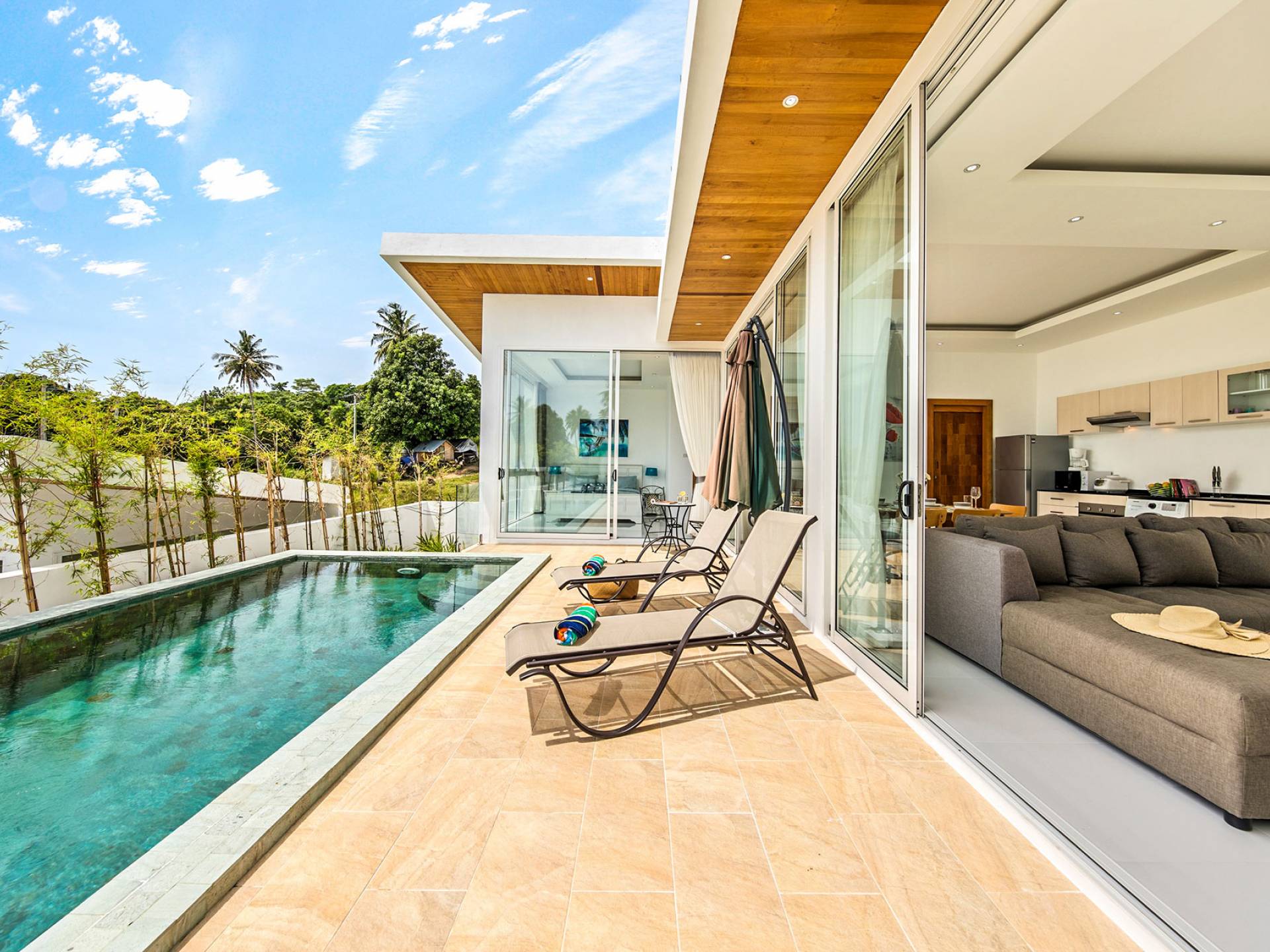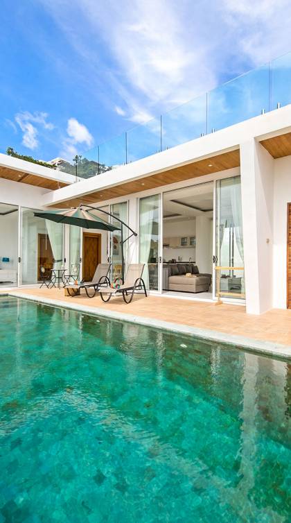 Nestled in a quaint modern development at the foot of Samui's lesser-known White Buddha, Villa Namo is the ideal holiday home for friends, couples, or small families. As you enter into the large open plan living and dining area you are surrounded by floor-to-ceiling windows and sliding doors giving a bright and warm feeling. Open the large sliding doors and step out on the large poolside patio with the pool mere feet away from the living room.