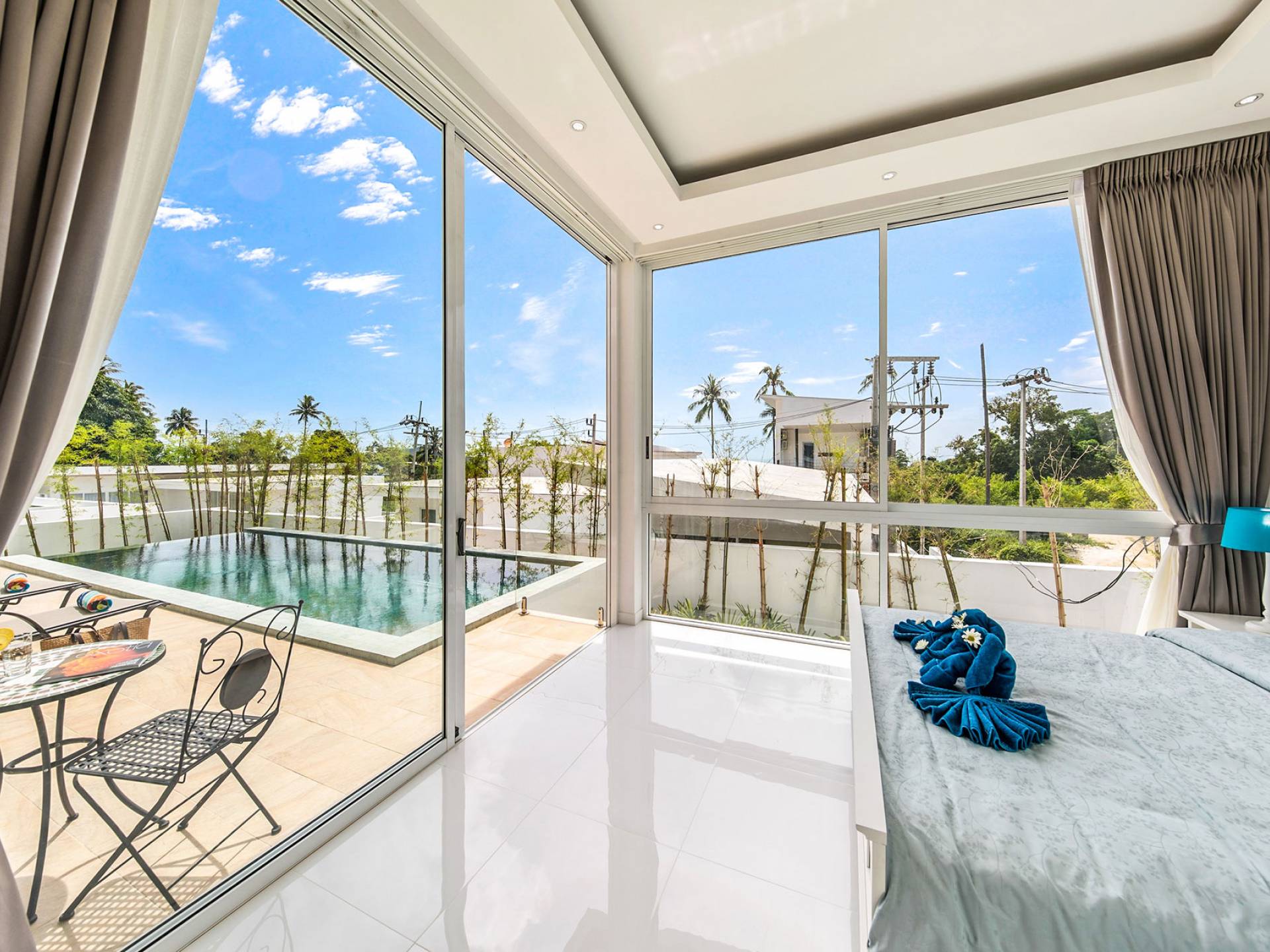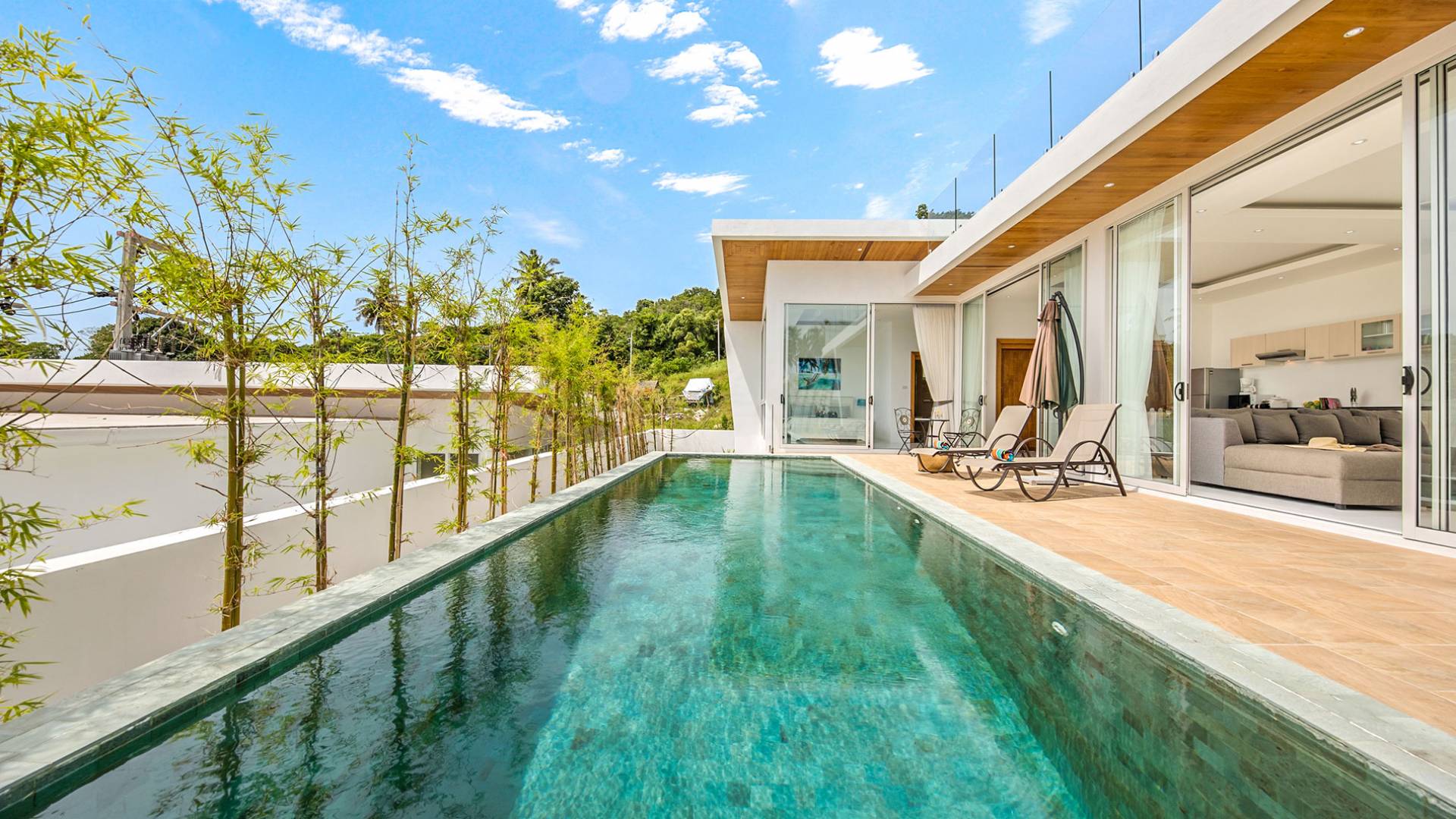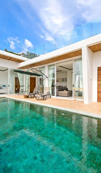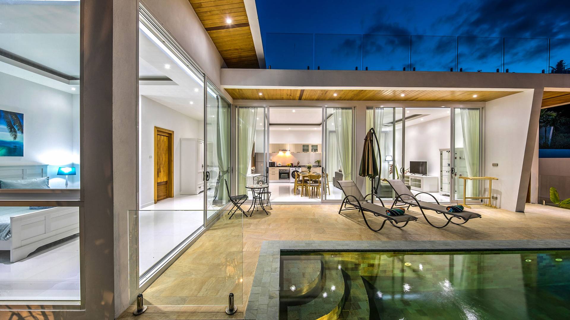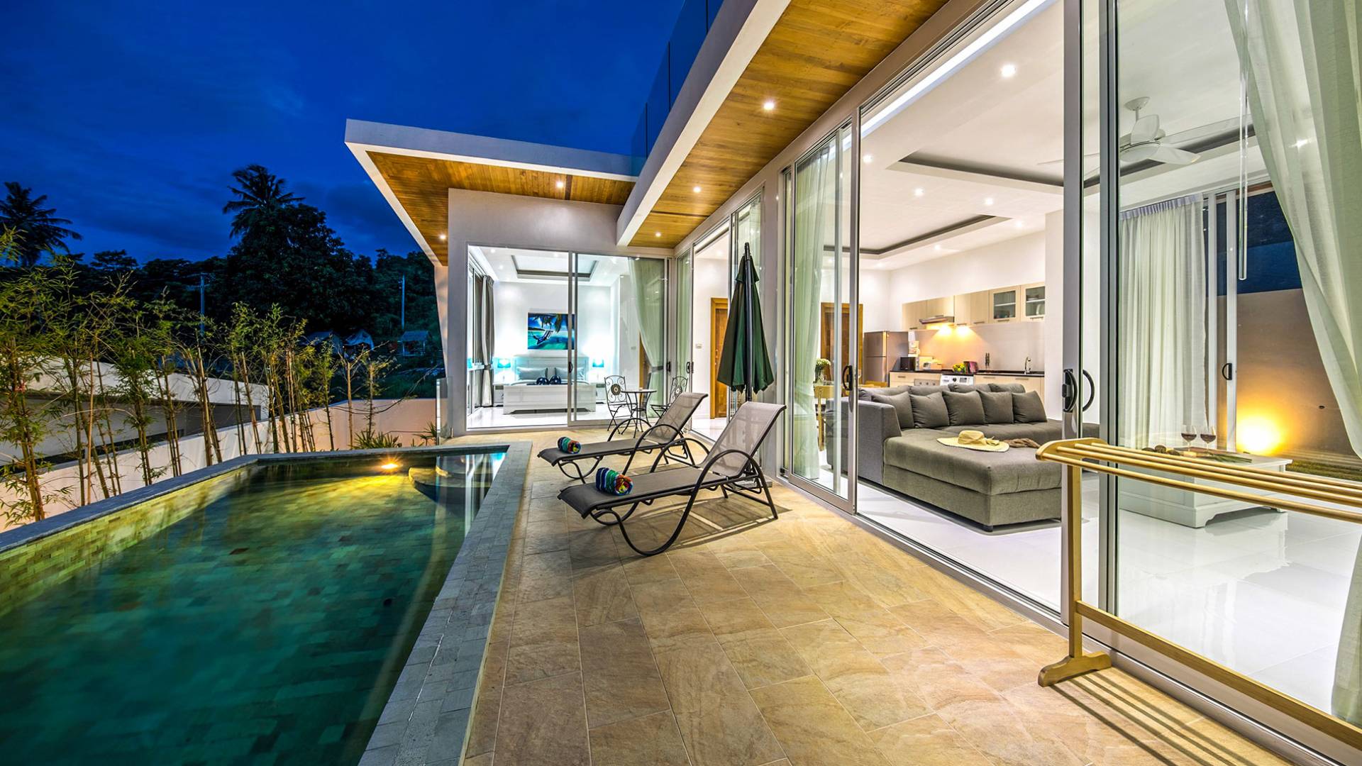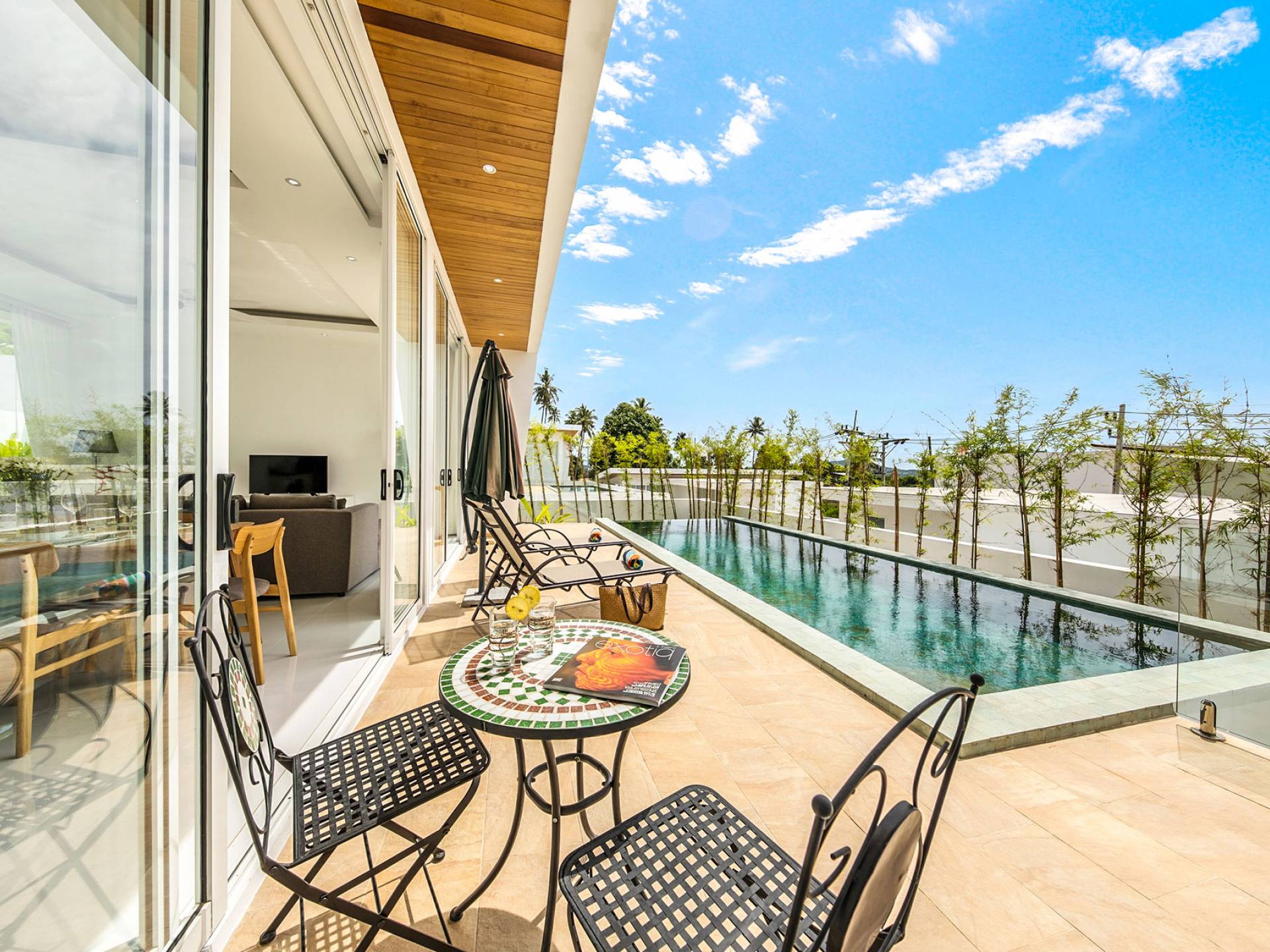 Nestled in a quaint modern development at the foot of Samui's lesser-known White Buddha, Villa Namo is the ideal holiday home for friends, couples, or small families. As you enter into the large open plan living and dining area you are surrounded by floor-to-ceiling windows and sliding doors giving a bright and warm feeling. Open the large sliding doors and step out on the large poolside patio with the pool mere feet away from the living room.