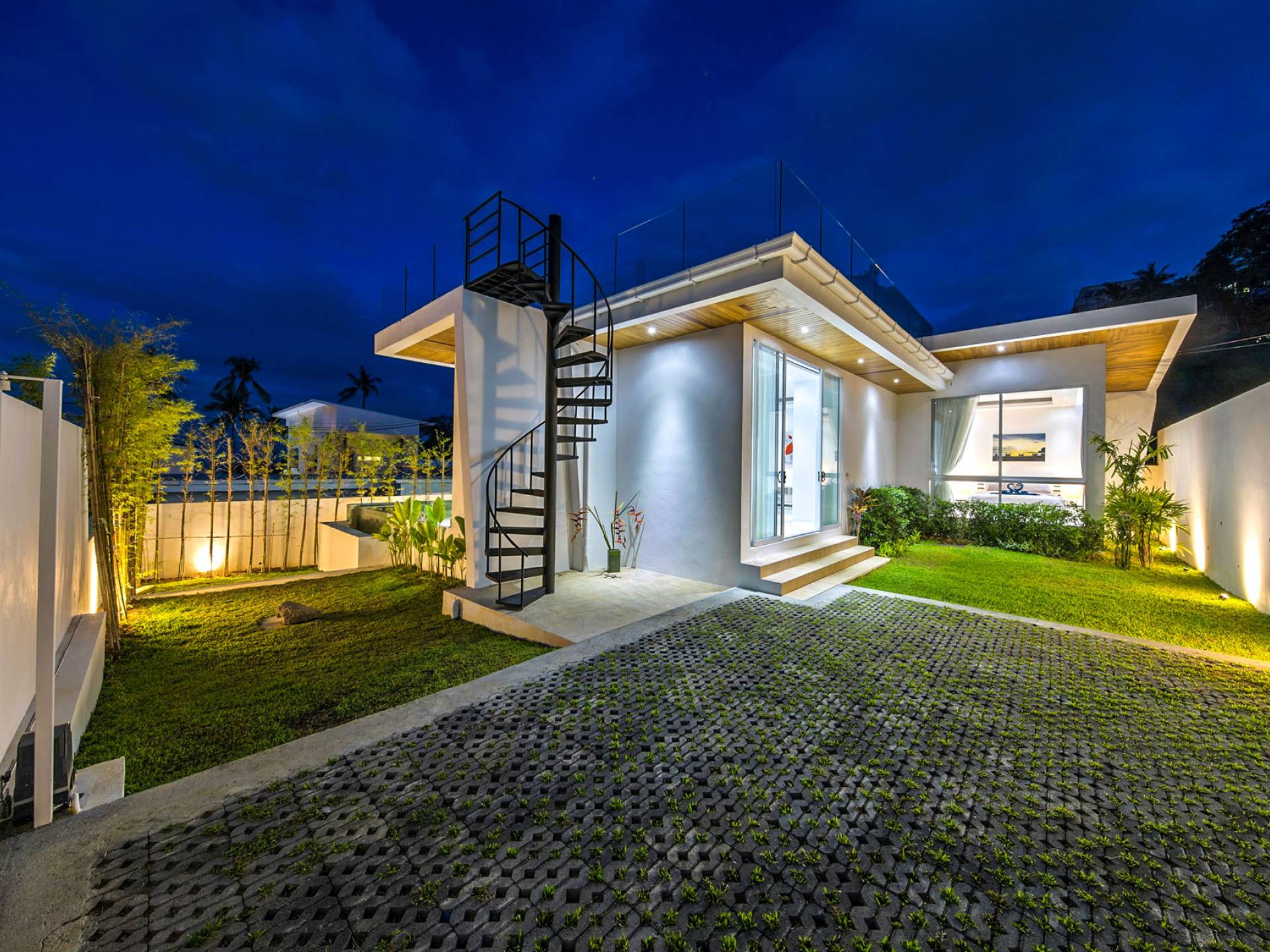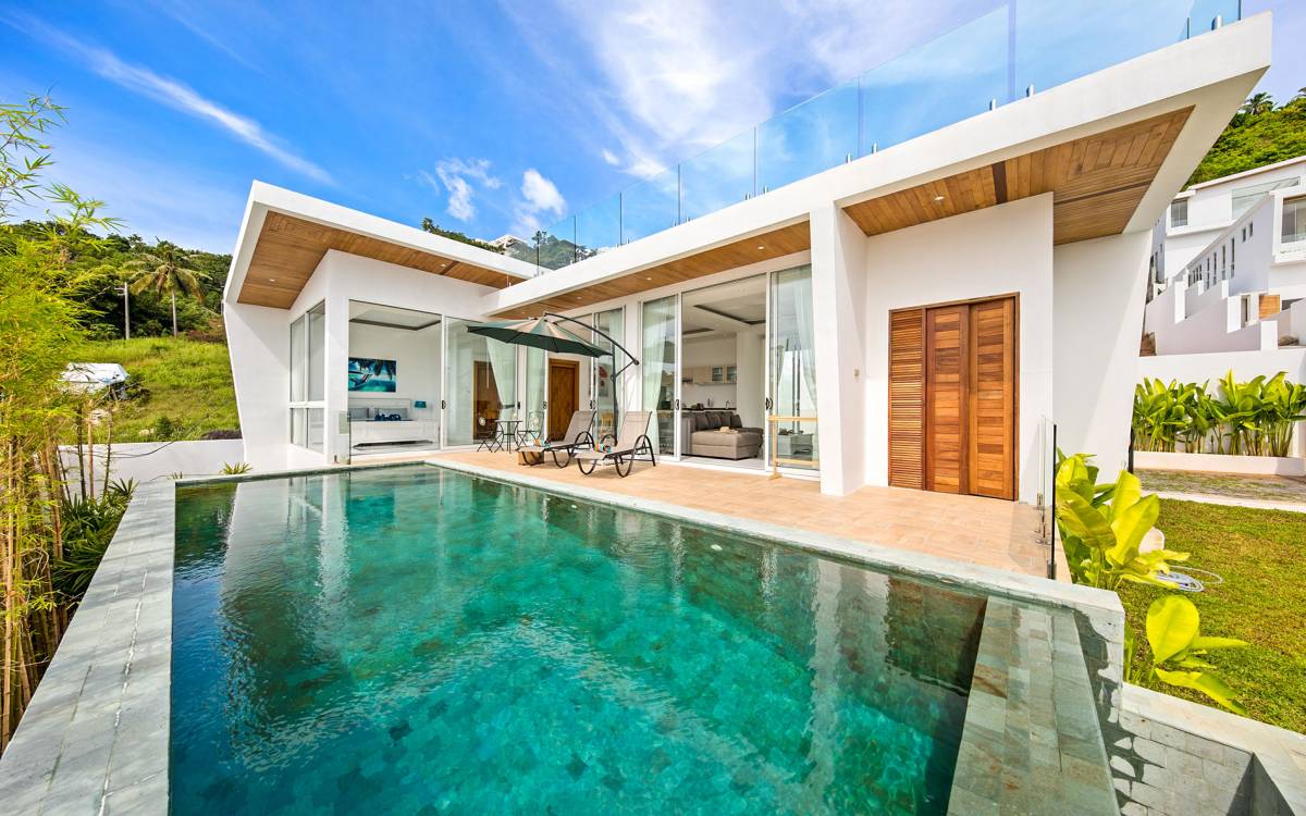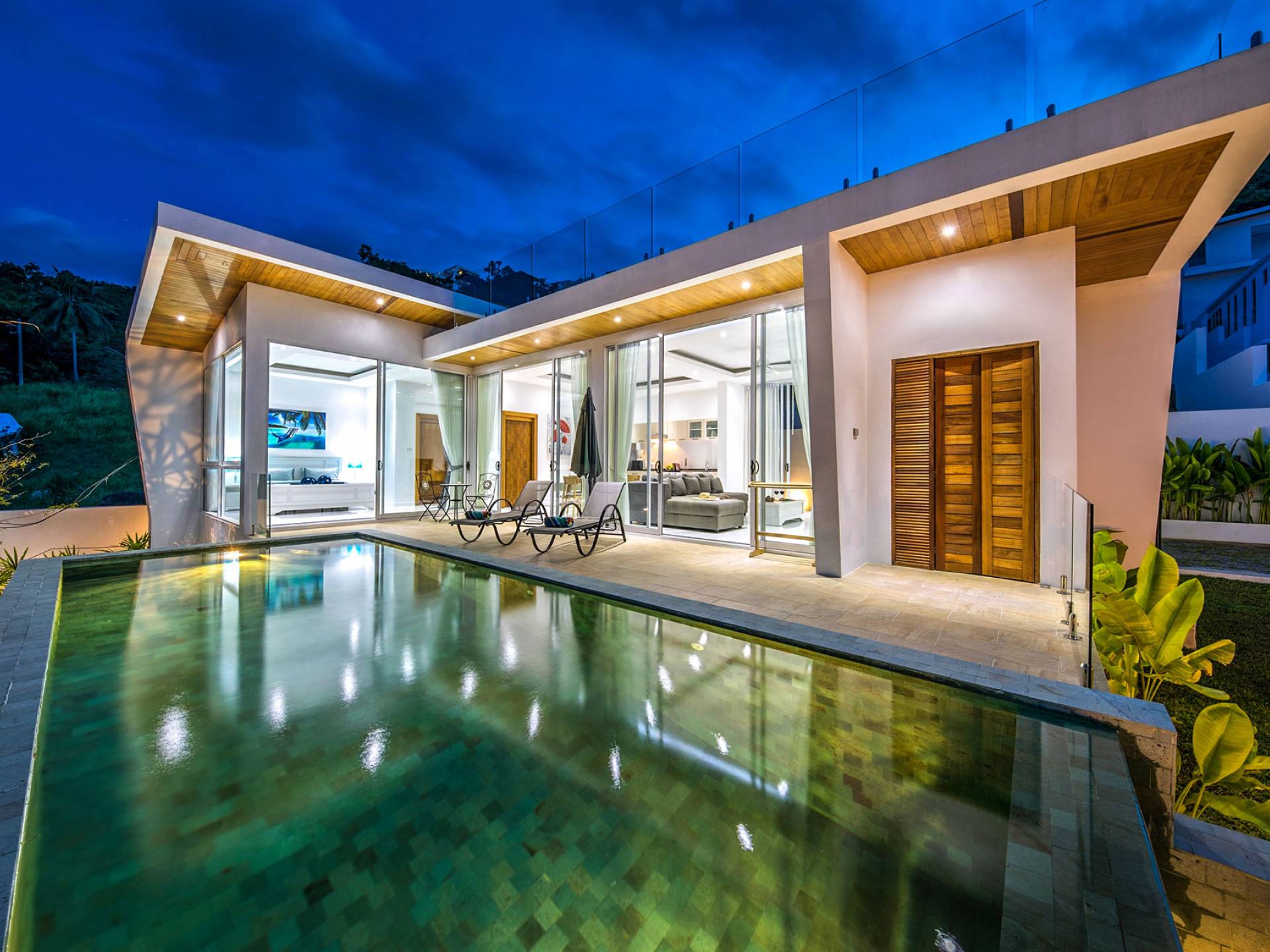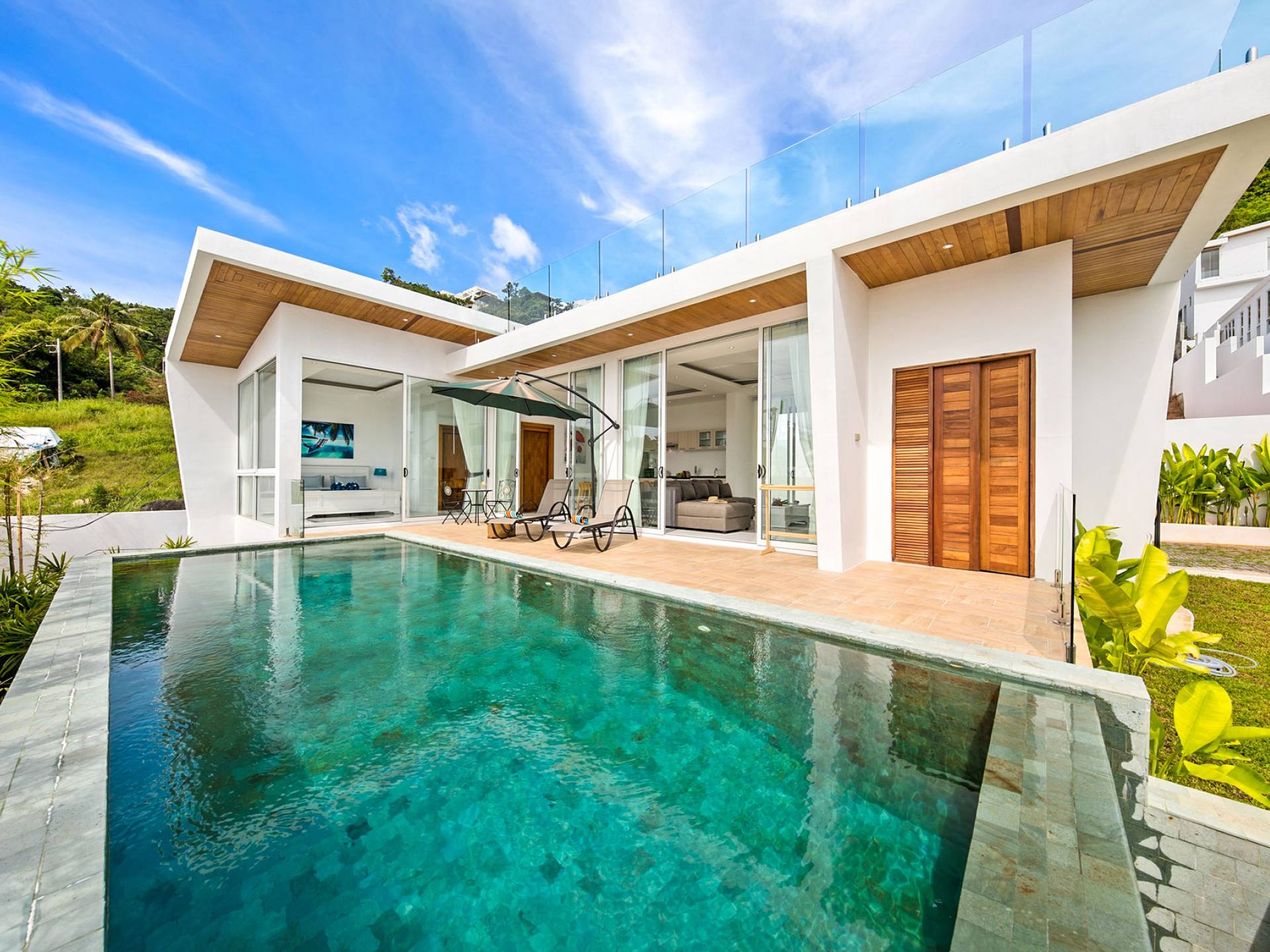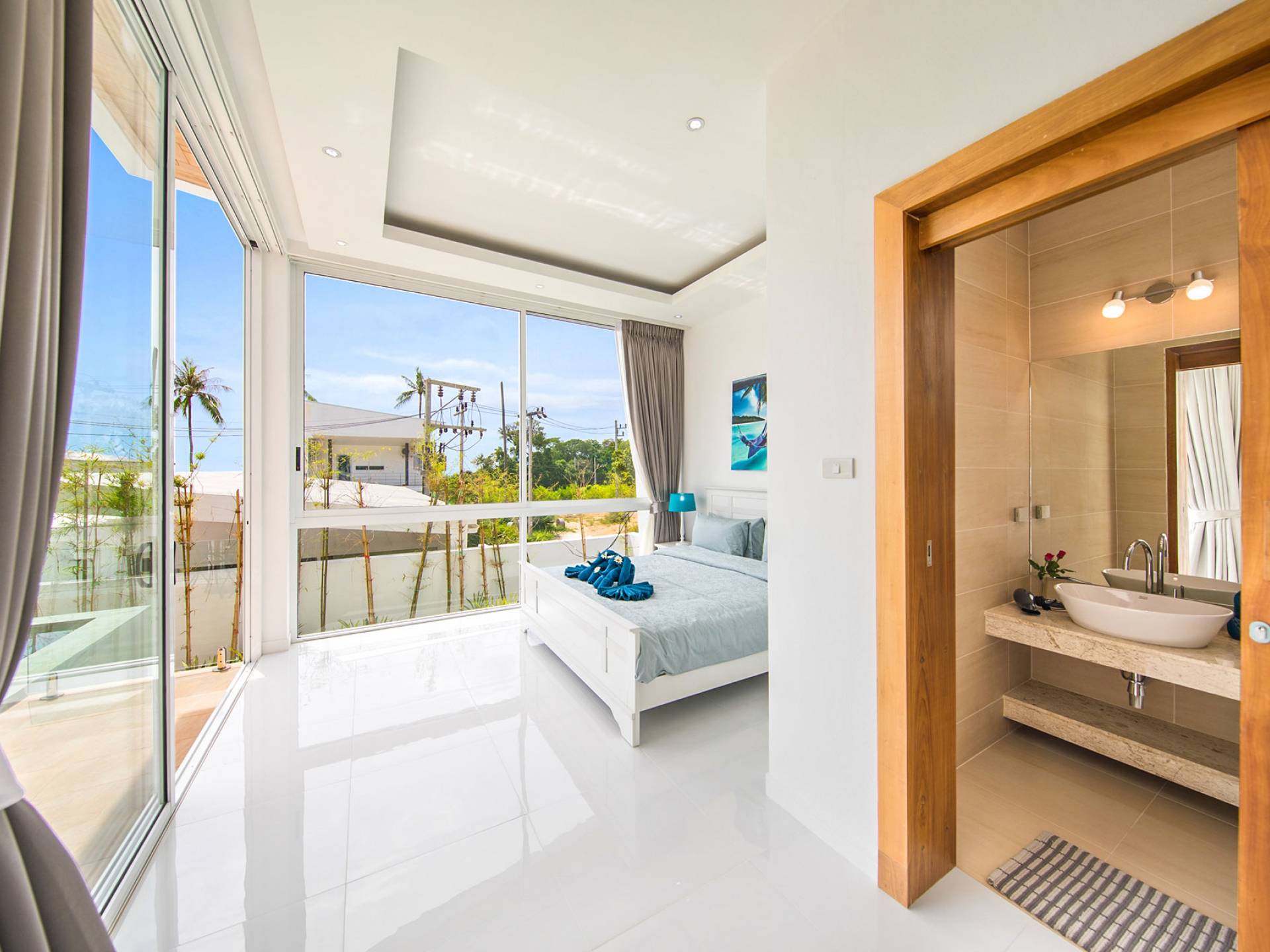 Nestled in a quaint modern development at the foot of Samui's lesser-known White Buddha, Villa Namo is the ideal holiday home for friends, couples, or small families. As you enter into the large open plan living and dining area you are surrounded by floor-to-ceiling windows and sliding doors giving a bright and warm feeling. Open the large sliding doors and step out on the large poolside patio with the pool mere feet away from the living room.