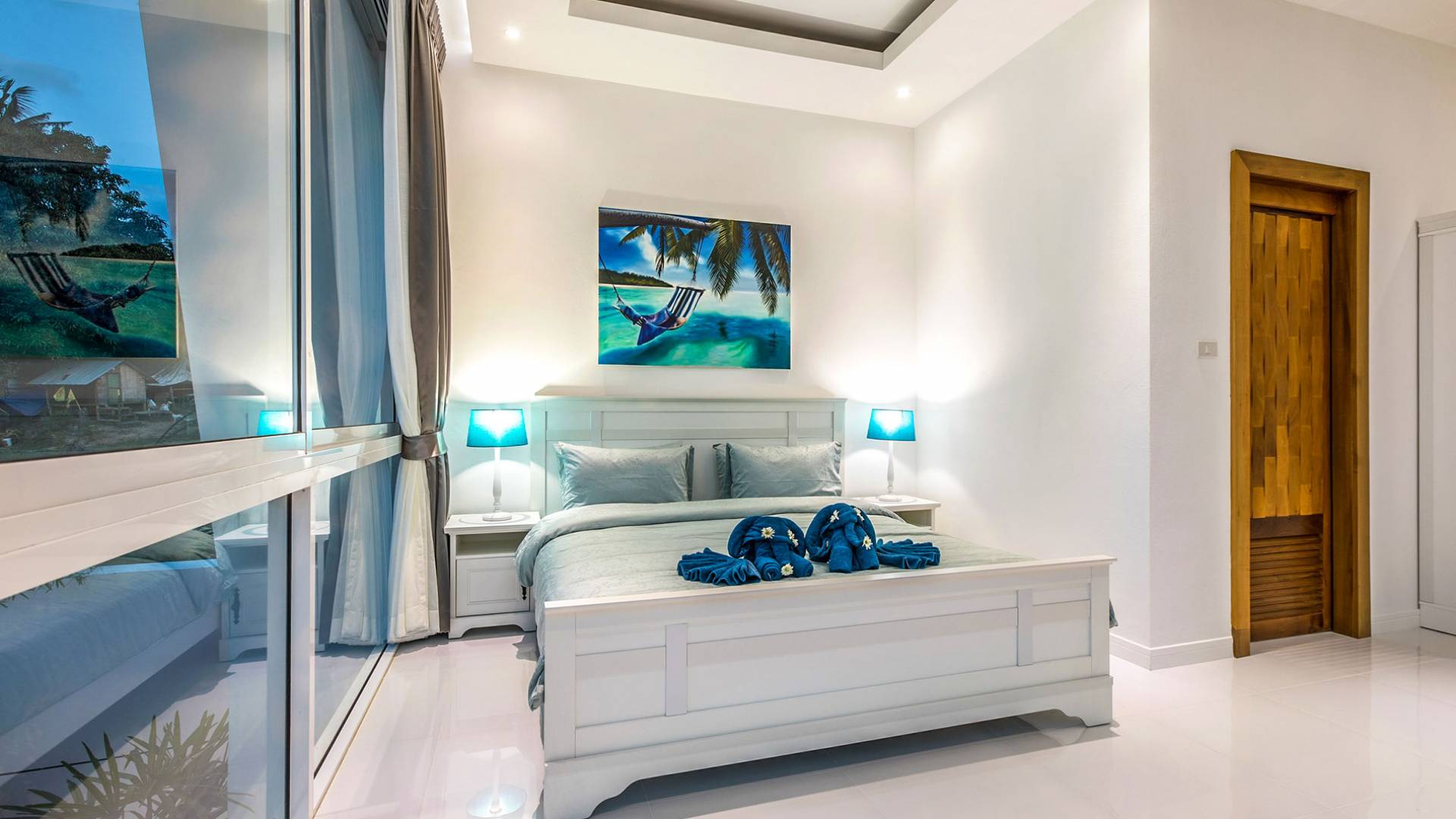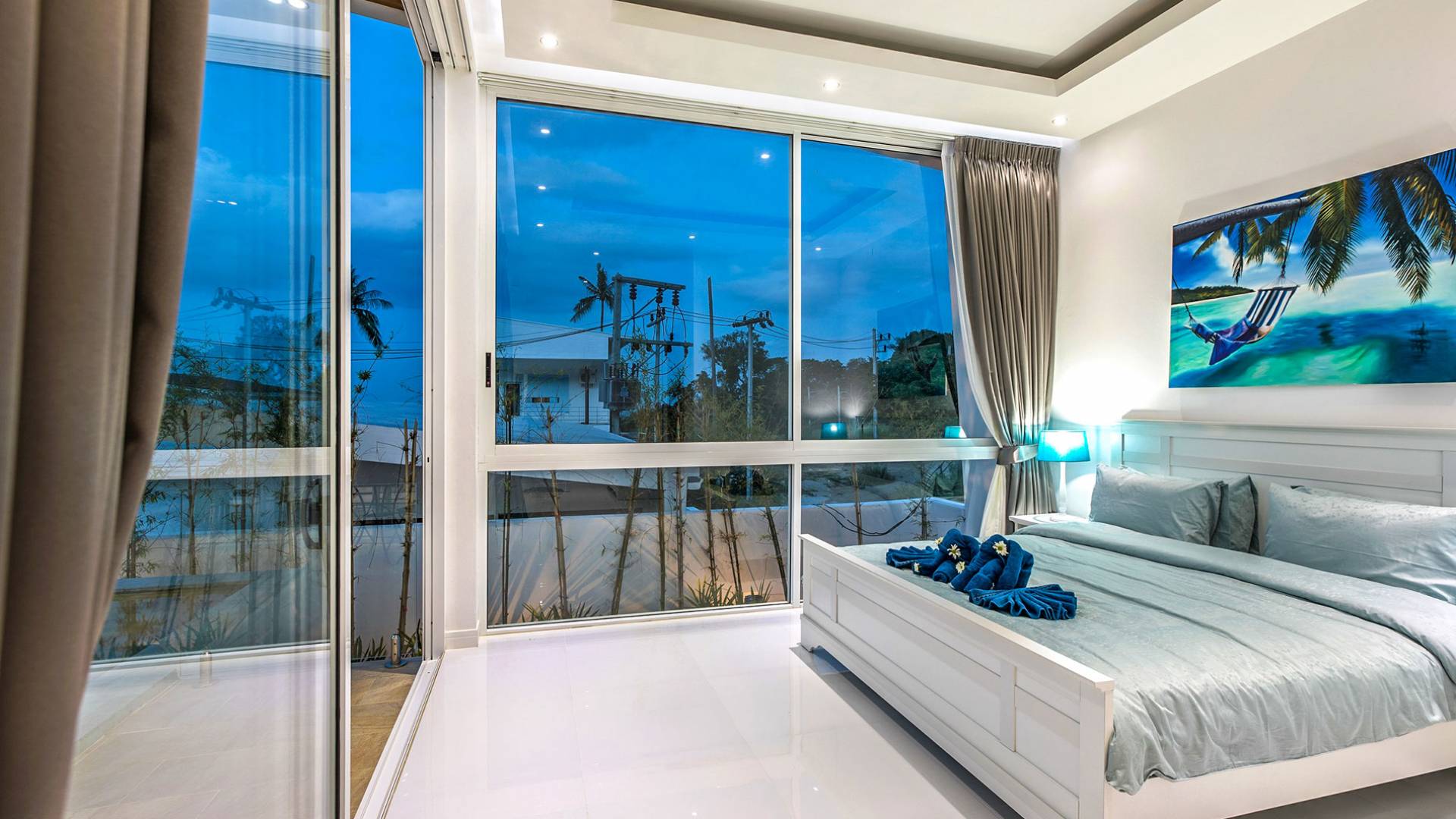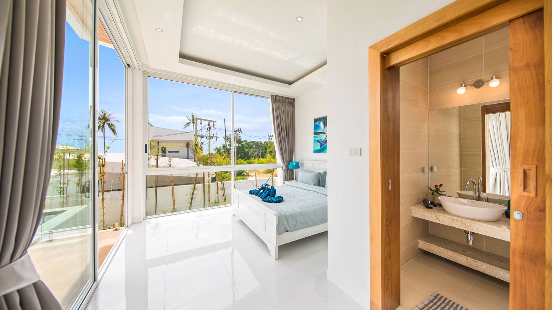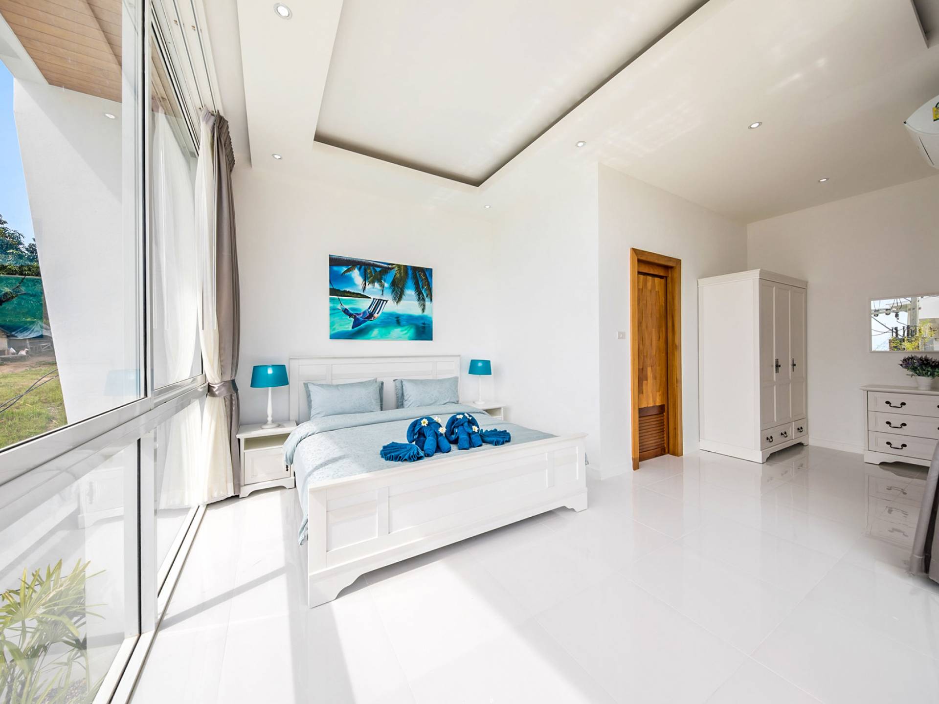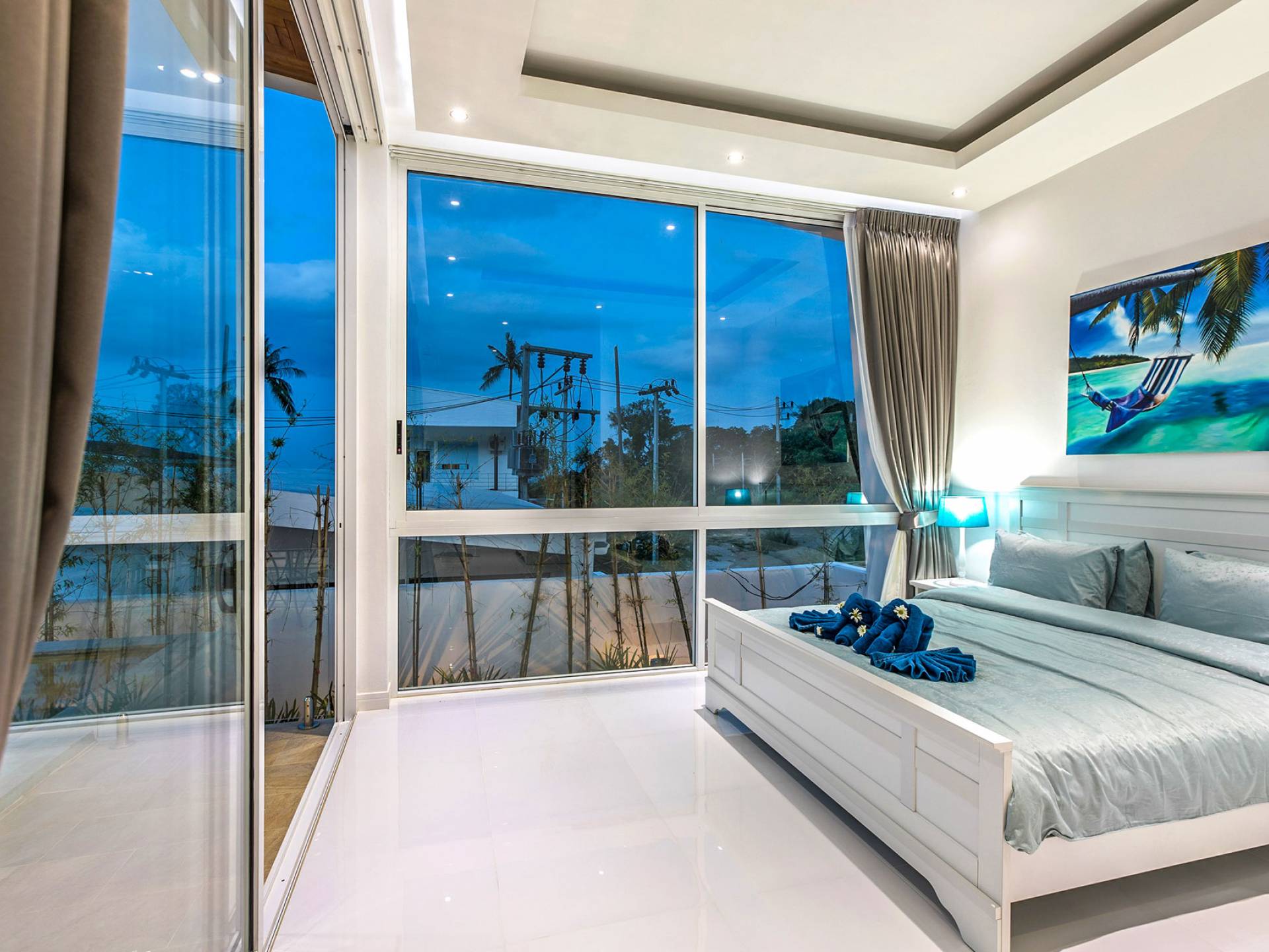 Nestled in a quaint modern development at the foot of Samui's lesser-known White Buddha, Villa Namo is the ideal holiday home for friends, couples, or small families. As you enter into the large open plan living and dining area you are surrounded by floor-to-ceiling windows and sliding doors giving a bright and warm feeling. Open the large sliding doors and step out on the large poolside patio with the pool mere feet away from the living room.