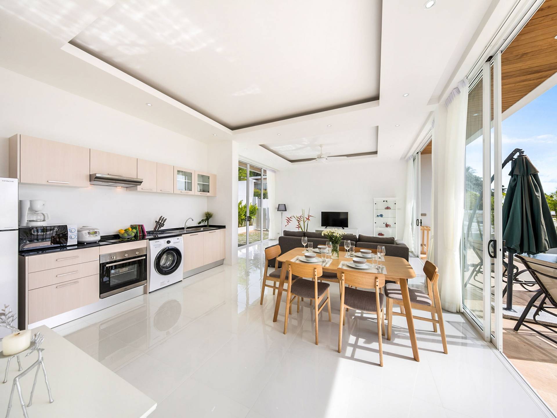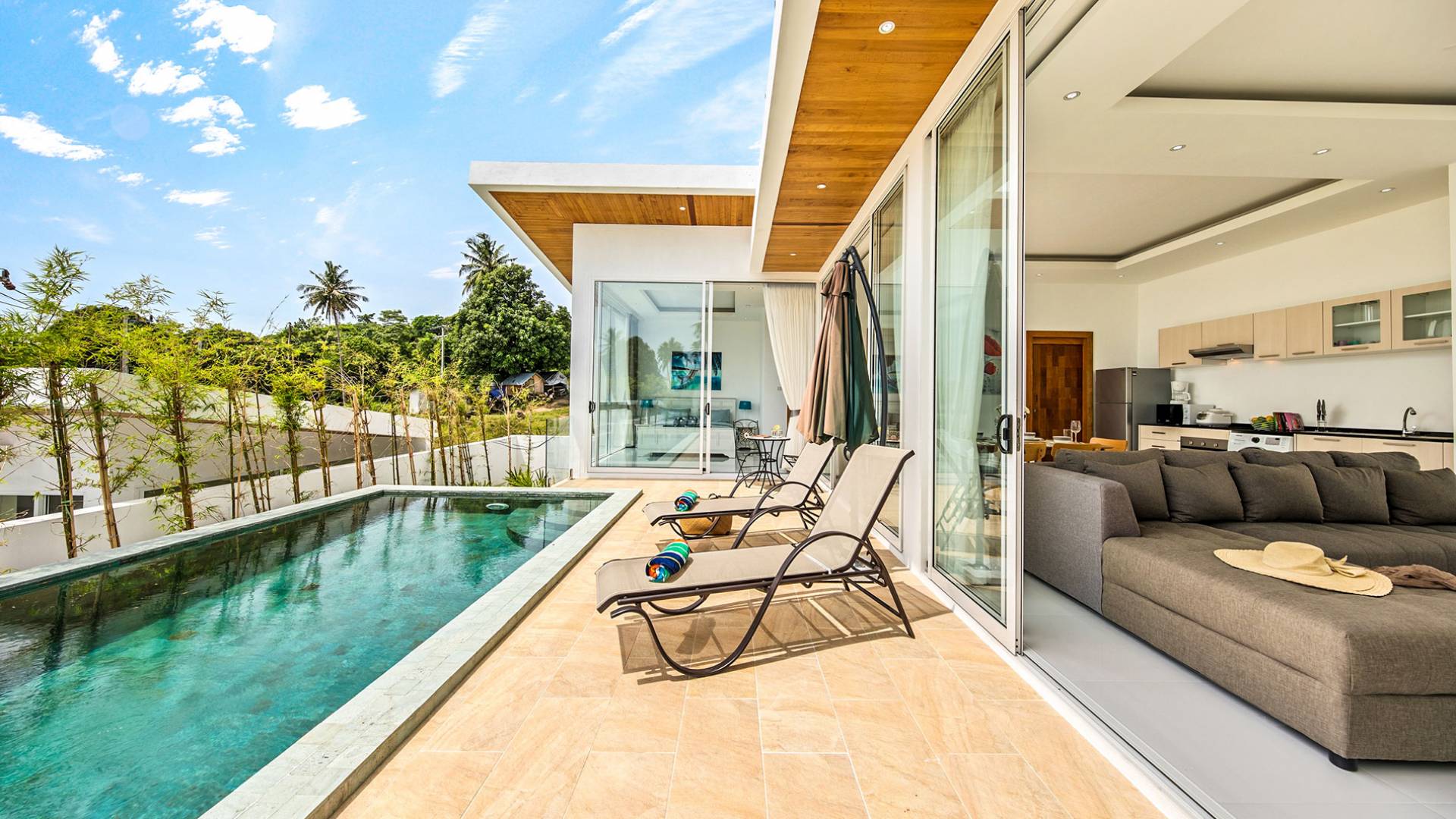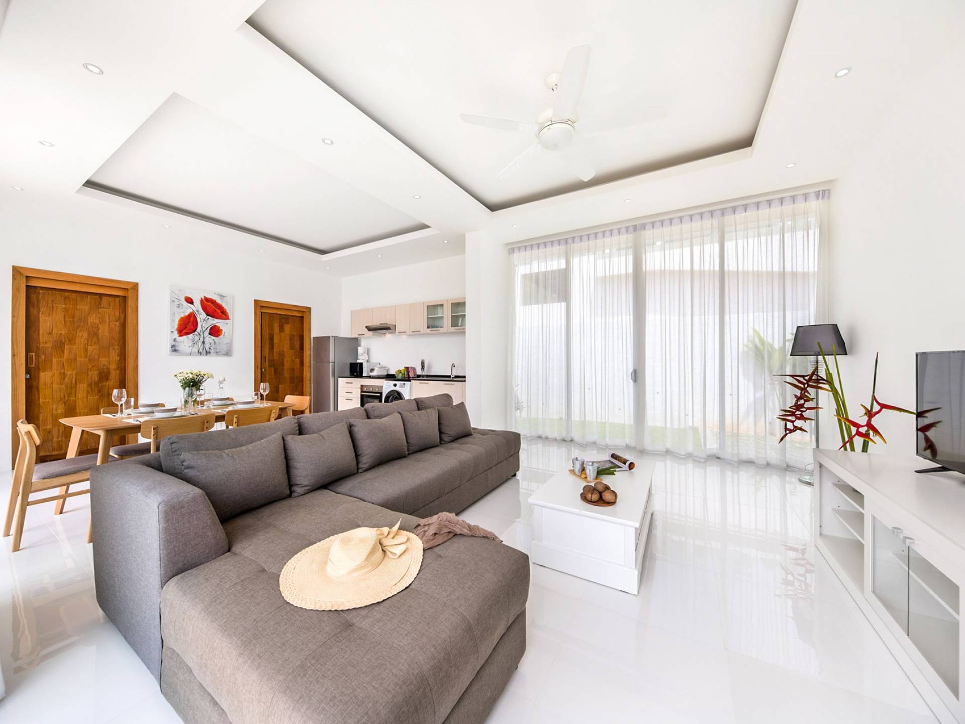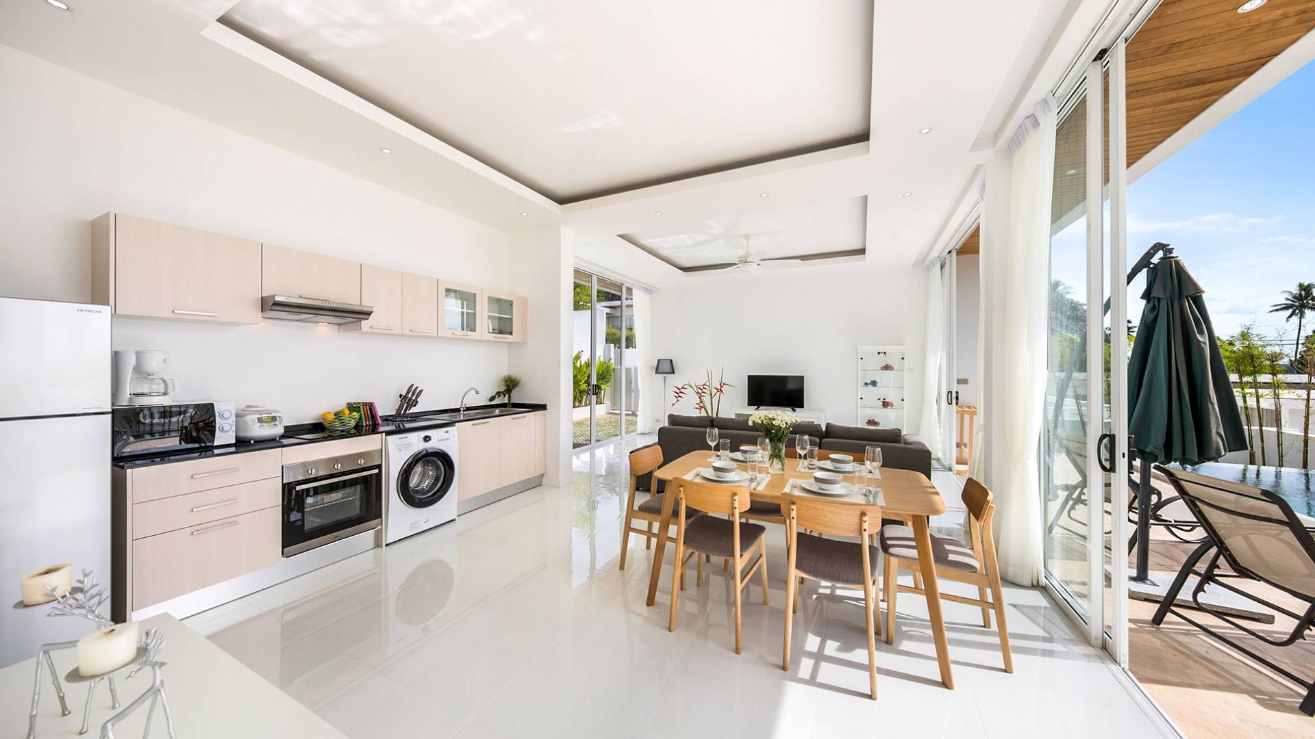 Lounge on the patio on a comfortable sun lounger with a cool drink and a good book or cool down in the family-sized pool. The living room is well equipped with a large flat-screen television as well as a Bluetooth-enabled soundbar giving you the ability to enjoy movies with high-quality sound or listen to streaming music through your phone. A fully-equipped Western-style kitchen allows you to cook anything you desire from a simple pad-thai to a full Sunday roast for you and the family, or even take advantage of the villa's private chef options