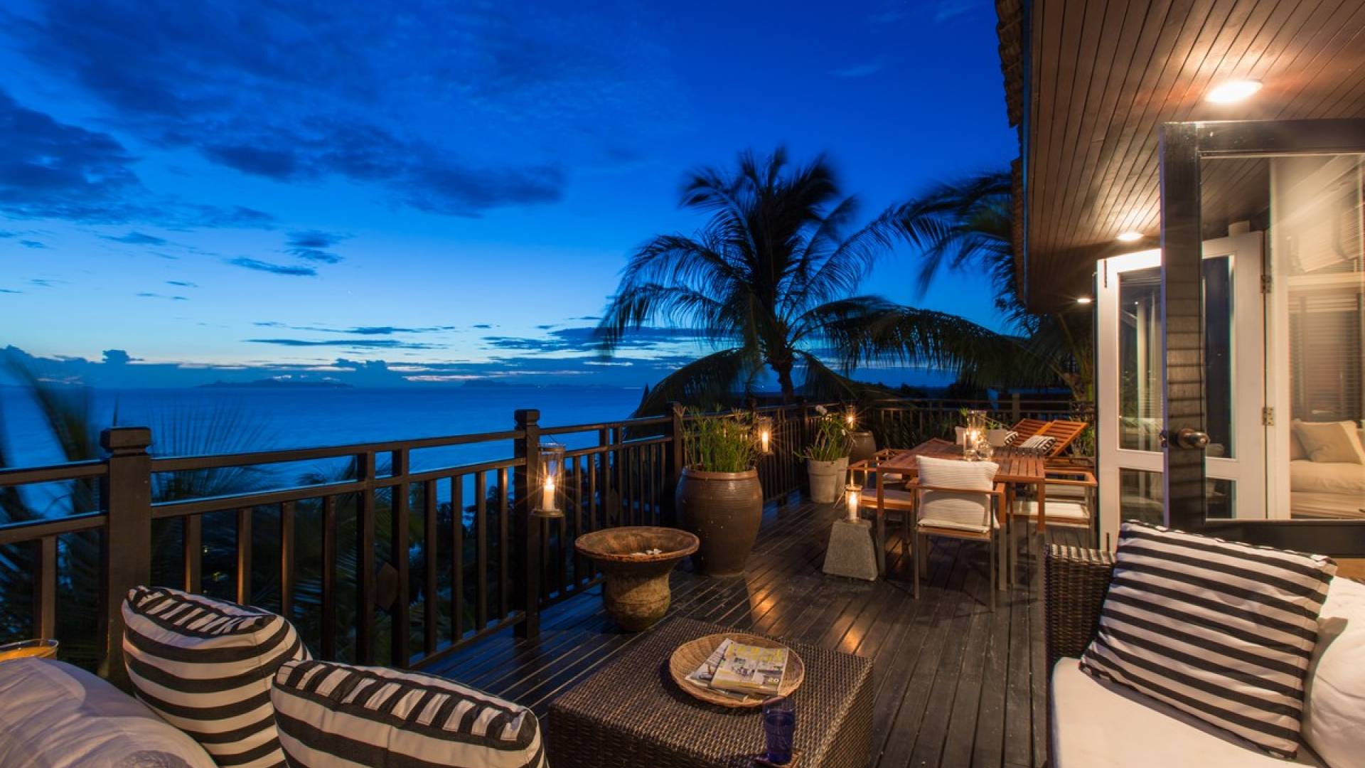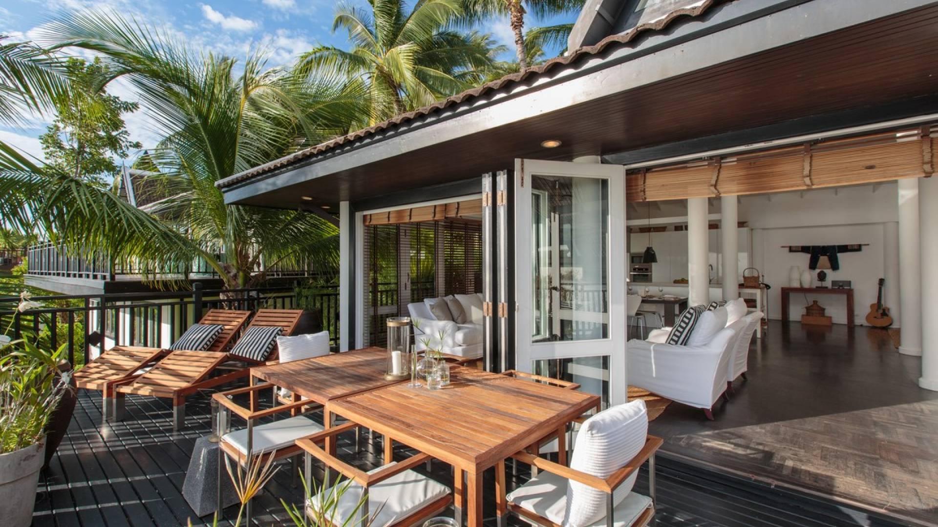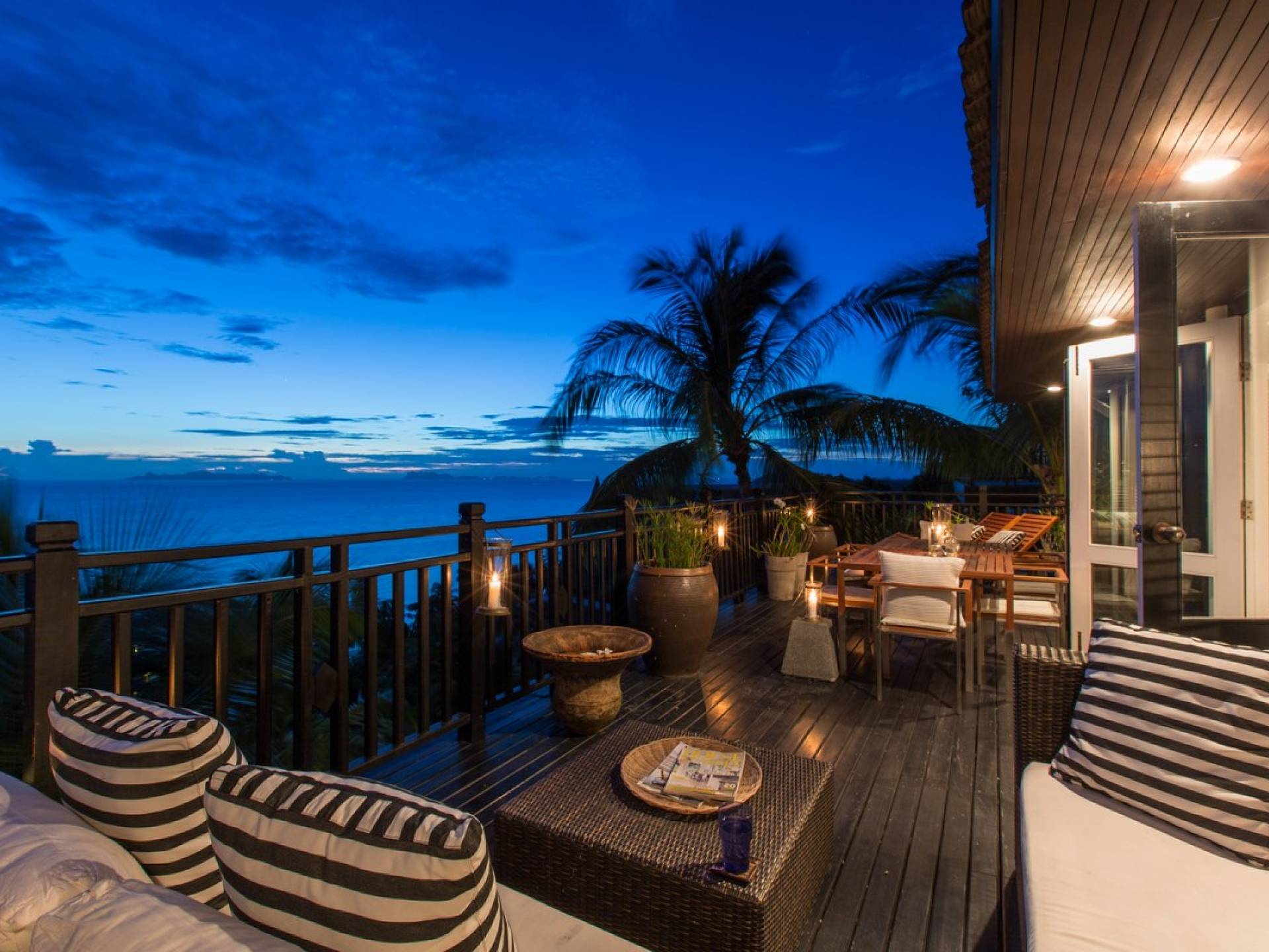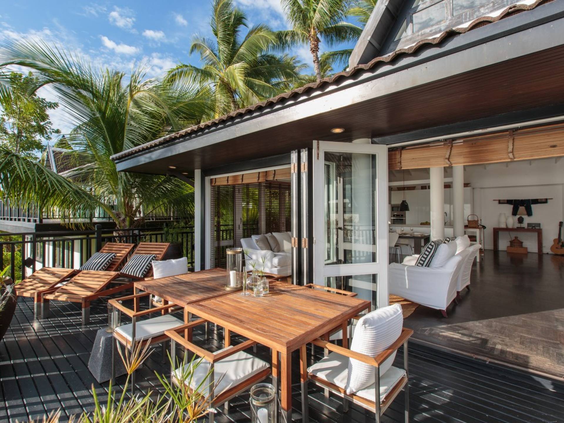 Large wooden folding accordion-style patio doors open up off the lounges onto a spacious wooden veranda that offers spectacular views of the Five Islands. Enjoying the amazing views and ocean breeze while sipping coffee or cocktails on your private balcony is a favorite activity here, and with the in-villa private dining and chef services available upon request, many guests often stay close to home. The terrace has a large and comfortable sofa seating area, a teak dining table that can accommodate up to six diners, and two teak reclining sun loungers as well as tropical plants in stylish local urns. A further narrow veranda to the right leads back up to the kitchen at the rear and an outdoor gas barbecue grill.