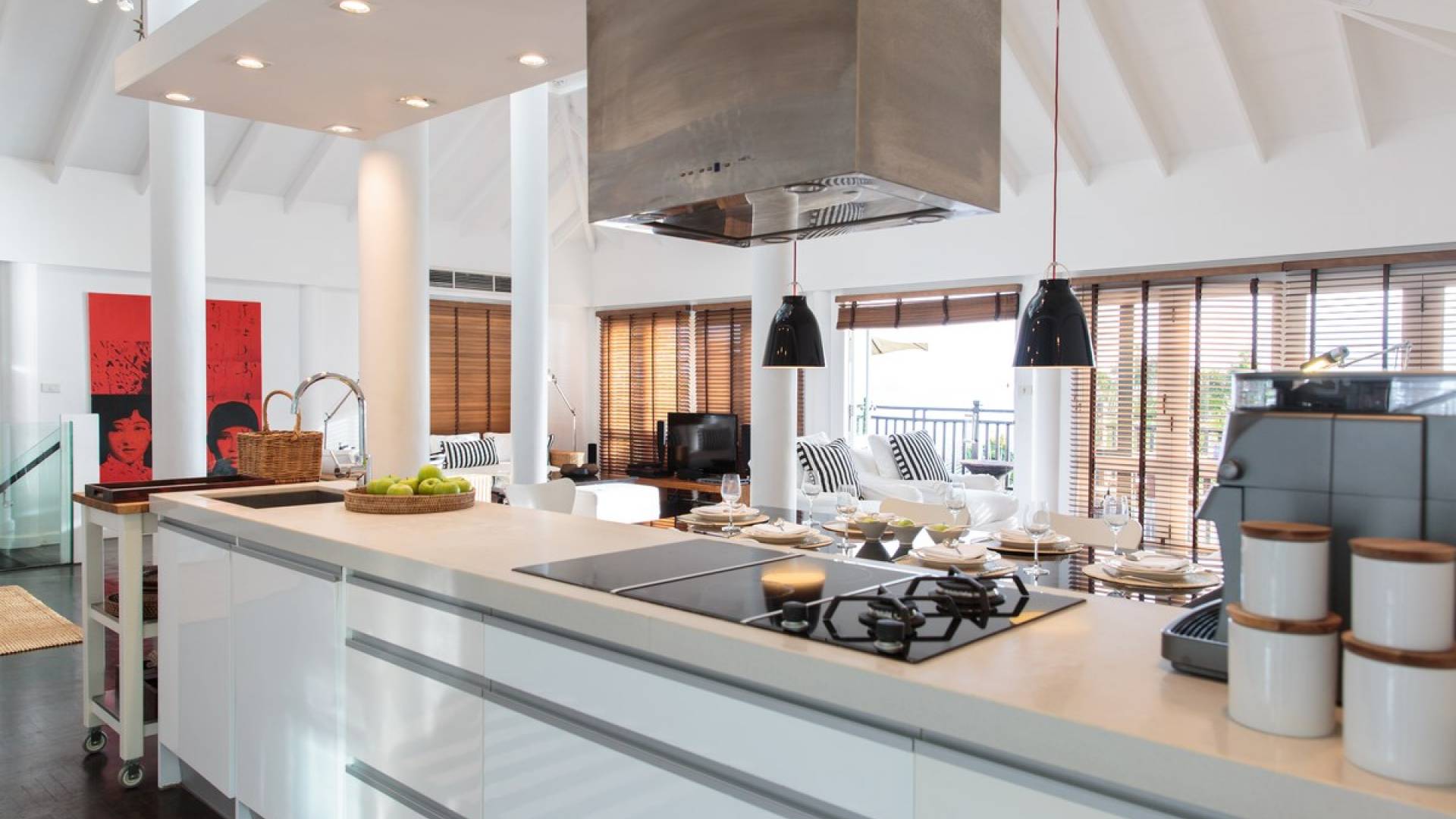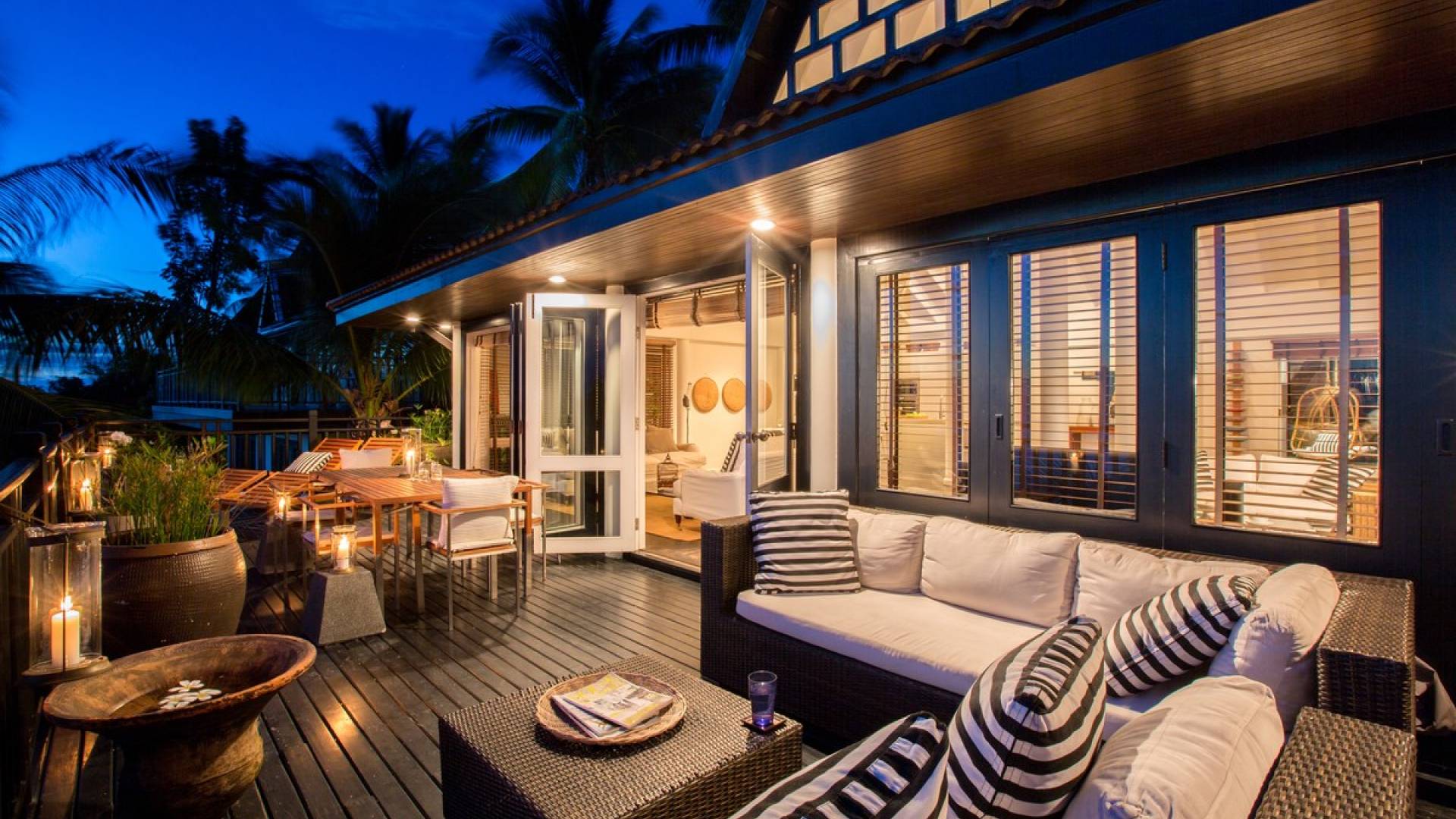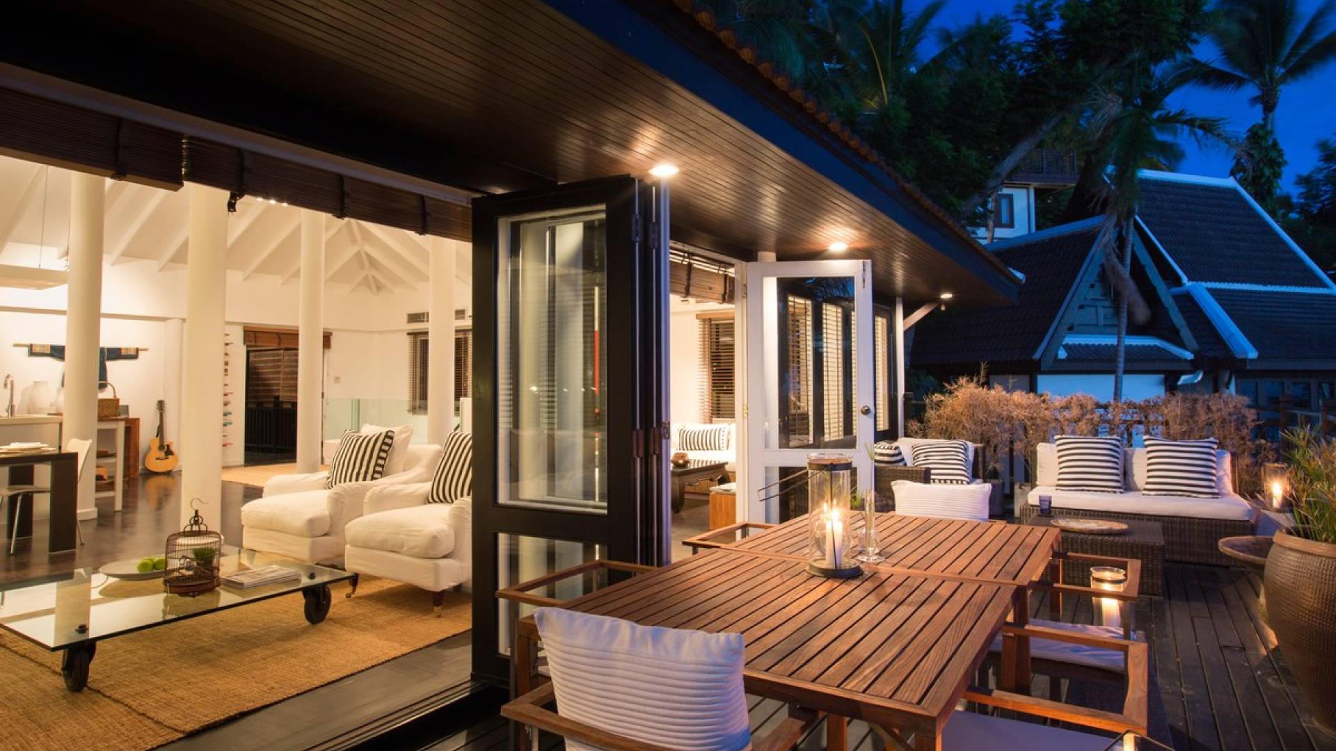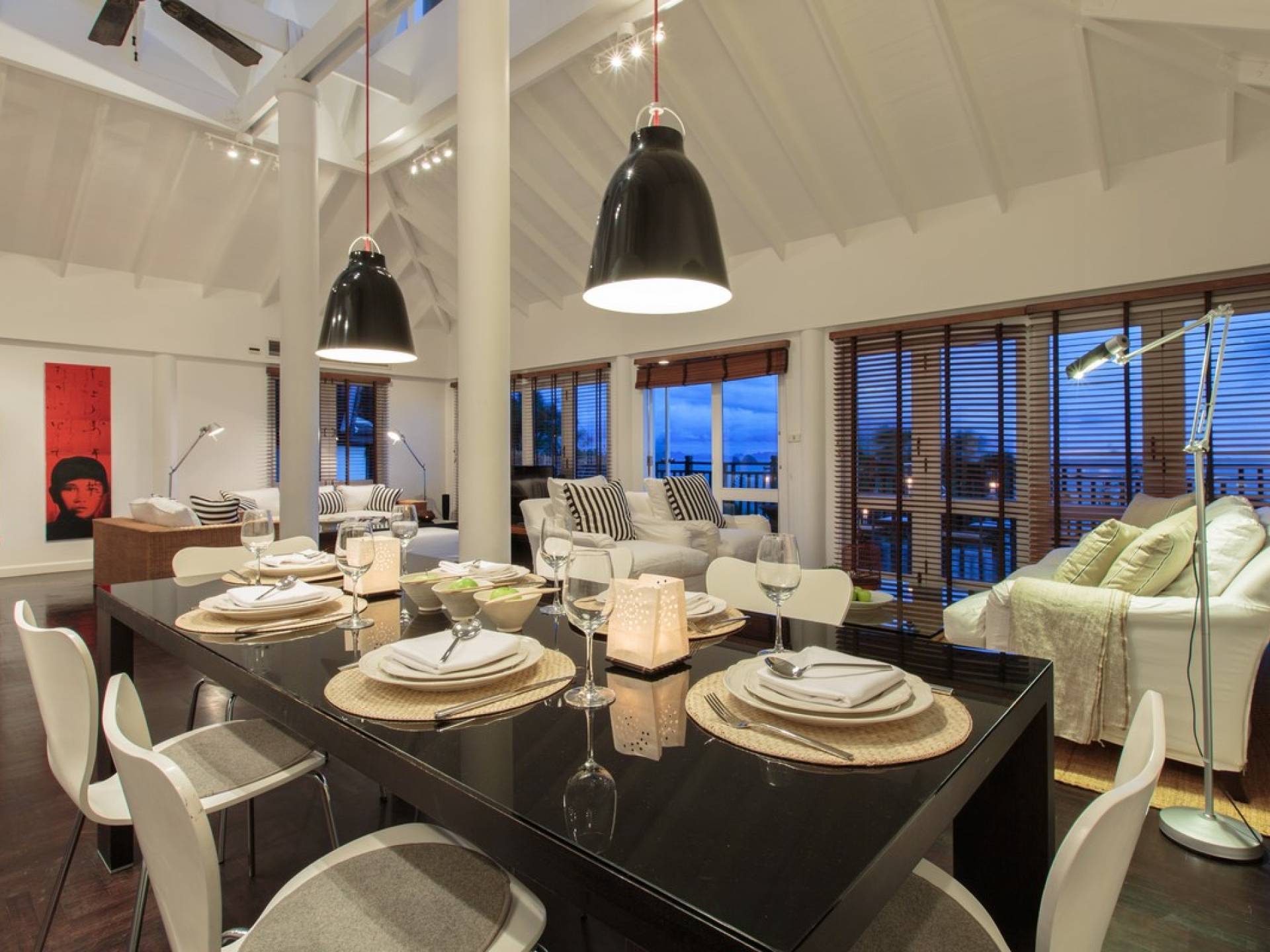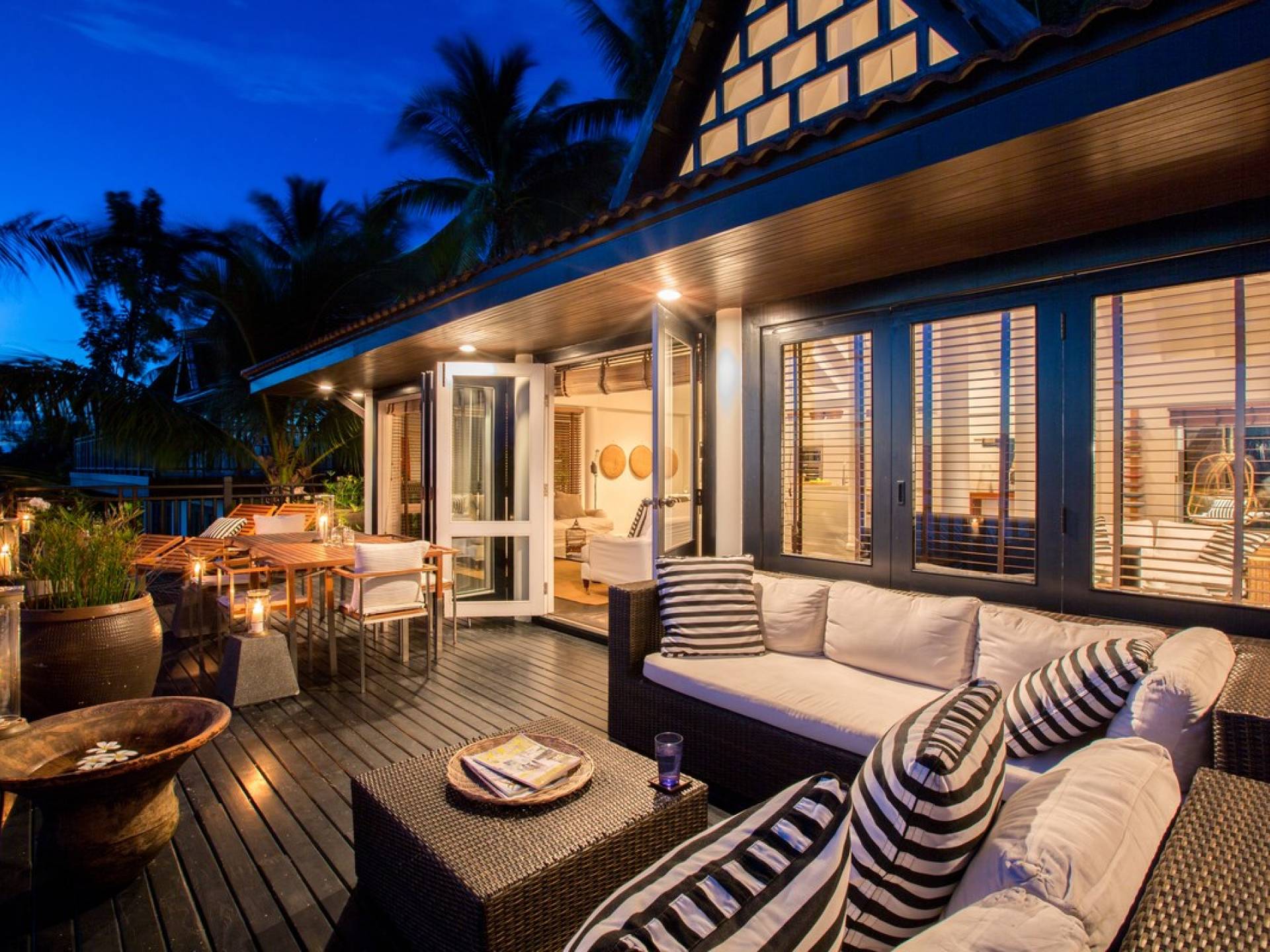 Large wooden folding accordion-style patio doors open up off the lounges onto a spacious wooden veranda that offers spectacular views of the Five Islands. Enjoying the amazing views and ocean breeze while sipping coffee or cocktails on your private balcony is a favorite activity here, and with the in-villa private dining and chef services available upon request, many guests often stay close to home. The terrace has a large and comfortable sofa seating area, a teak dining table that can accommodate up to six diners, and two teak reclining sun loungers as well as tropical plants in stylish local urns. A further narrow veranda to the right leads back up to the kitchen at the rear and an outdoor gas barbecue grill.
