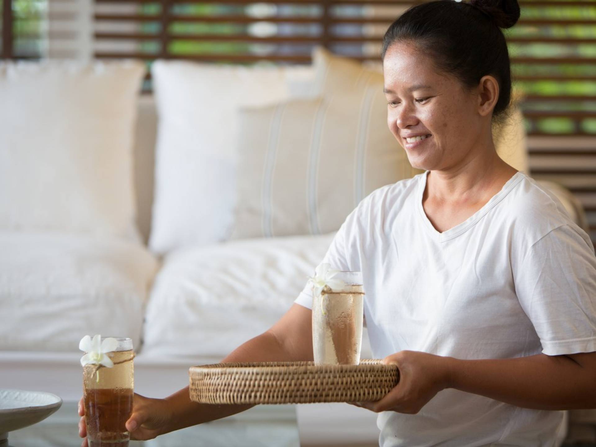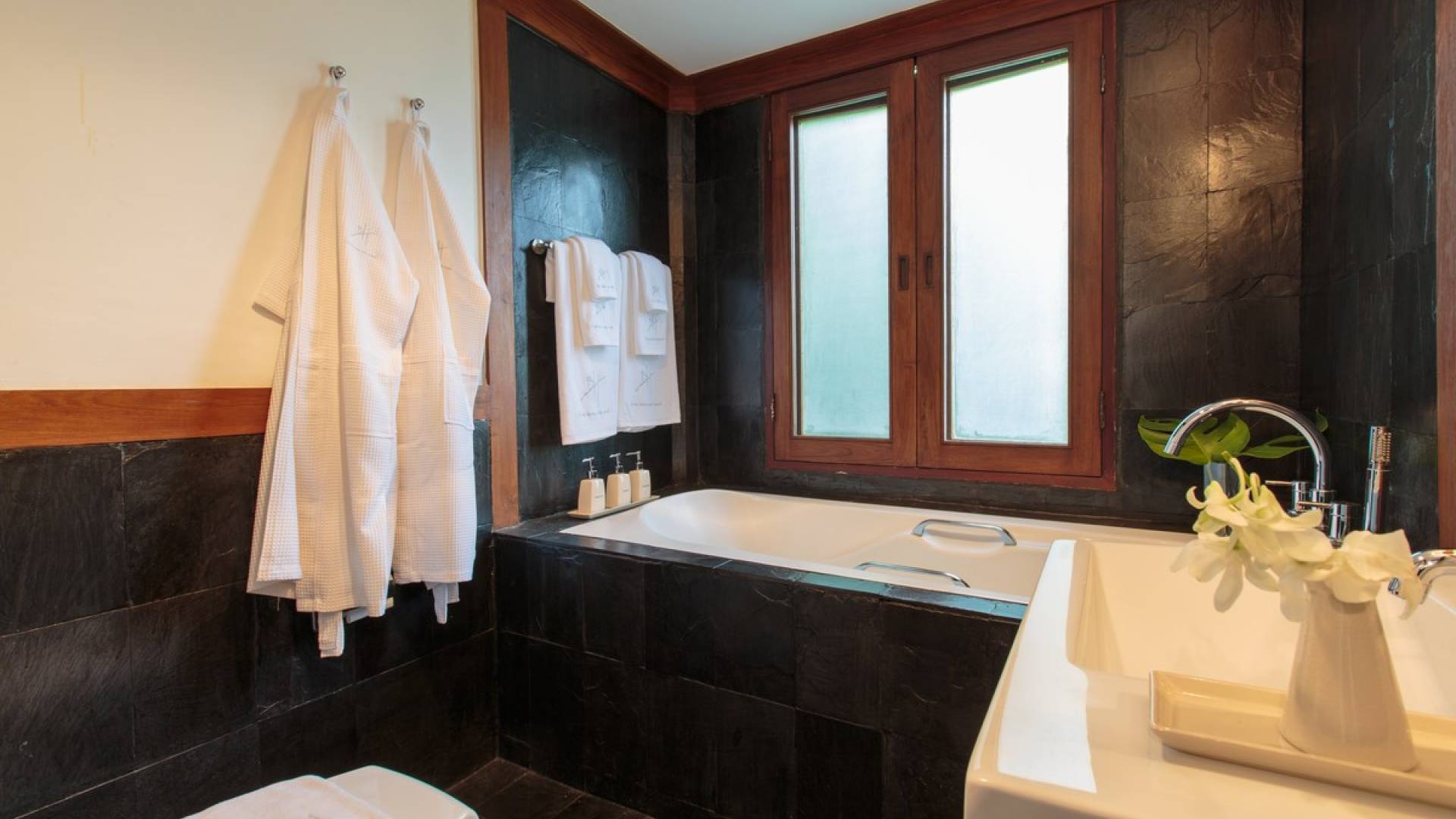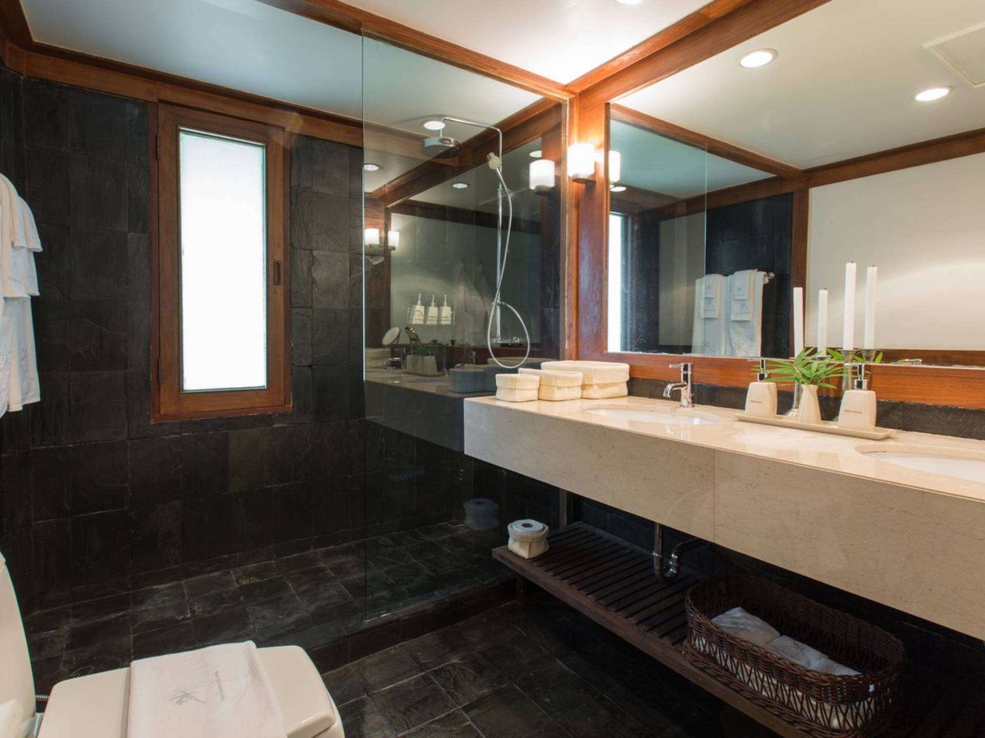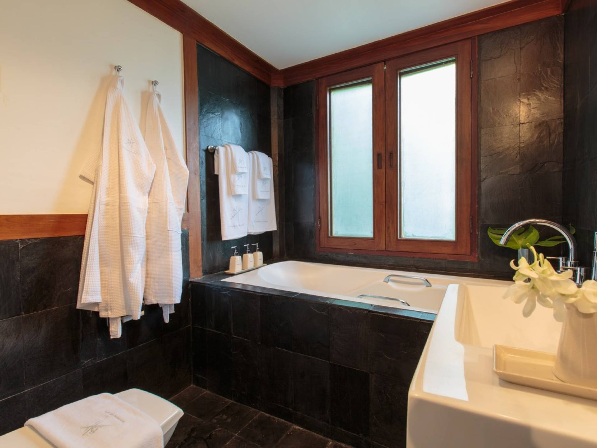 Large wooden folding accordion-style patio doors open up off the lounges onto a spacious wooden veranda that offers spectacular views of the Five Islands. Enjoying the amazing views and ocean breeze while sipping coffee or cocktails on your private balcony is a favorite activity here, and with the in-villa private dining and chef services available upon request, many guests often stay close to home. The terrace has a large and comfortable sofa seating area, a teak dining table that can accommodate up to six diners, and two teak reclining sun loungers as well as tropical plants in stylish local urns. A further narrow veranda to the right leads back up to the kitchen at the rear and an outdoor gas barbecue grill.