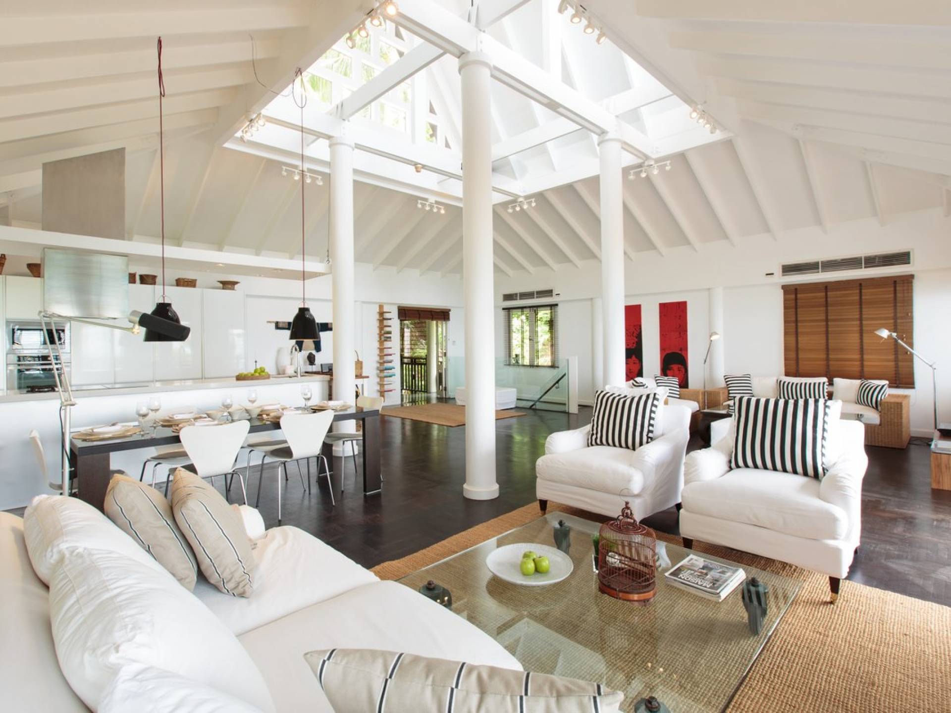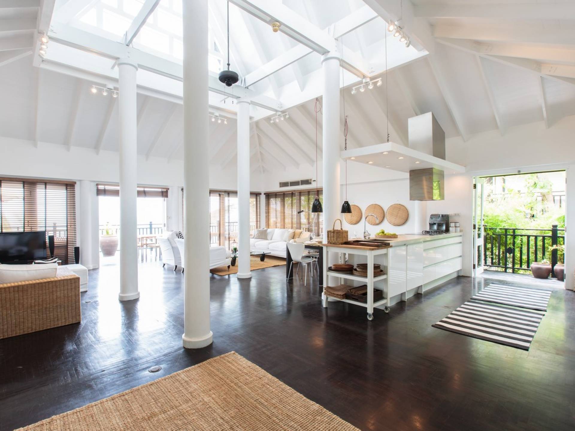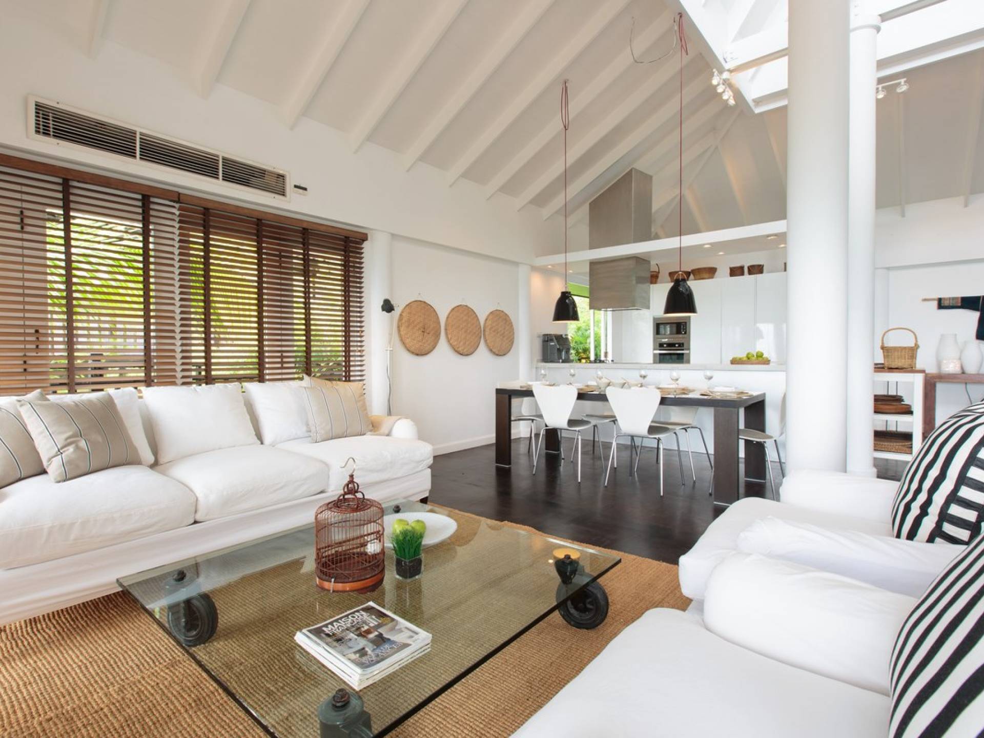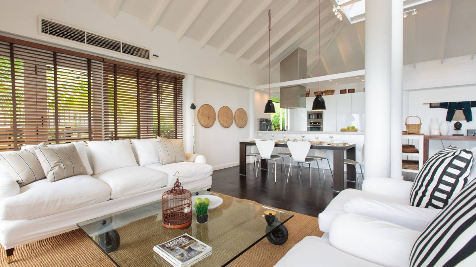The entrance to the villa opens into an airy, open-plan living, dining, and kitchen area. The white walls and pitched ceiling skylight provide a great sense of space. The hard wooden floors beautifully contrast with the inviting lounge furniture and the chic white, fully equipped, western-style kitchen. The lounge offers two separate, seating areas, with hessian rugs and central coffee tables, the larger of which boasts flat-panel TV with DVD player and satellite TV.