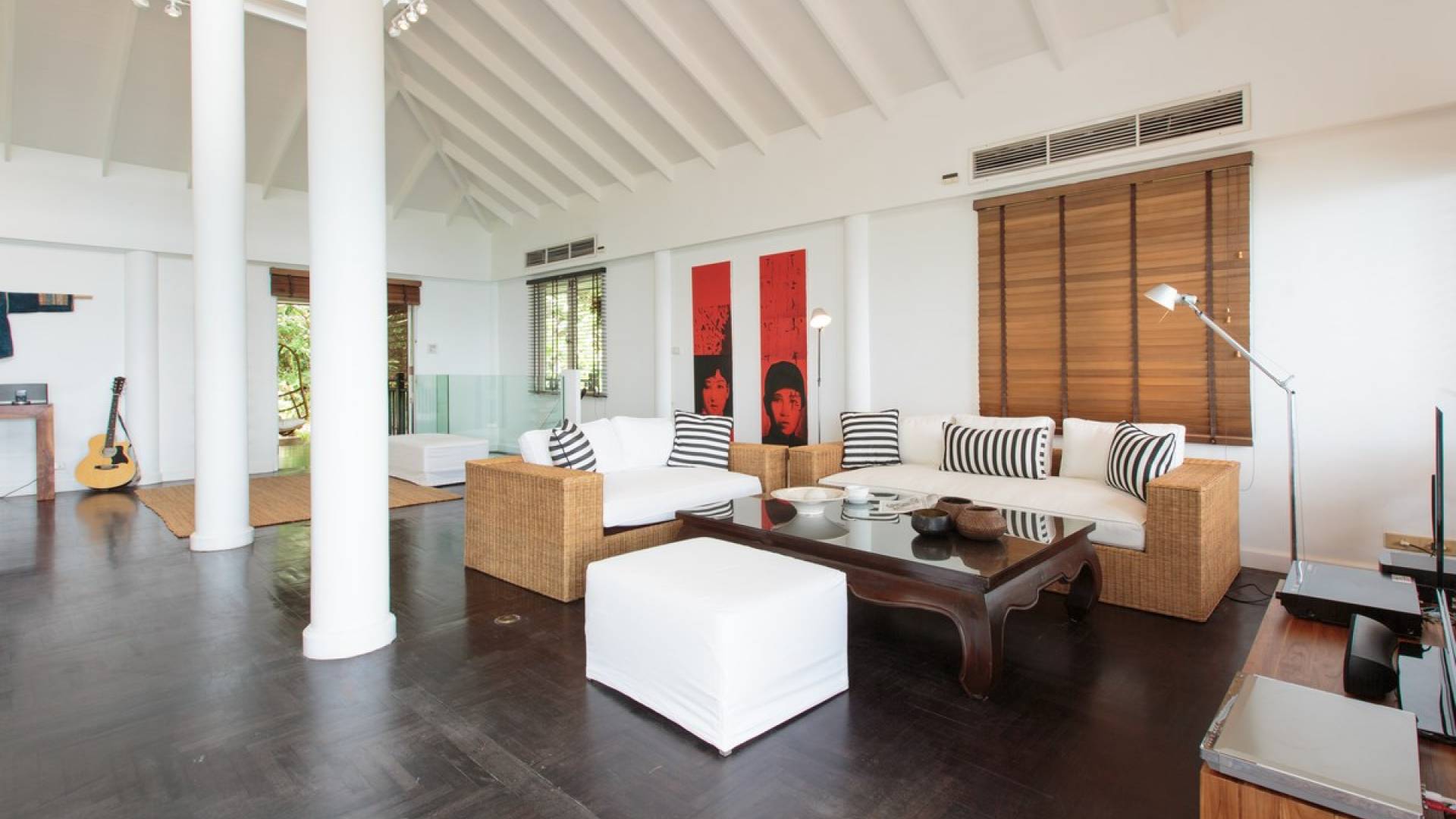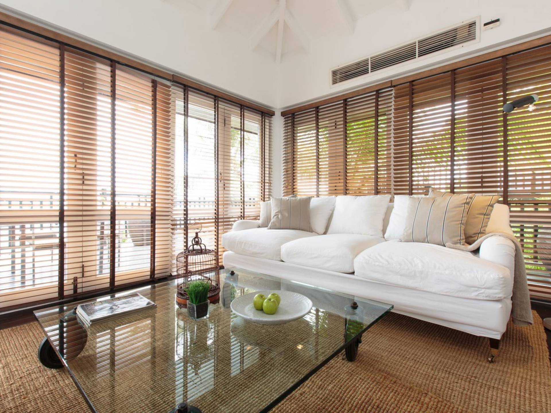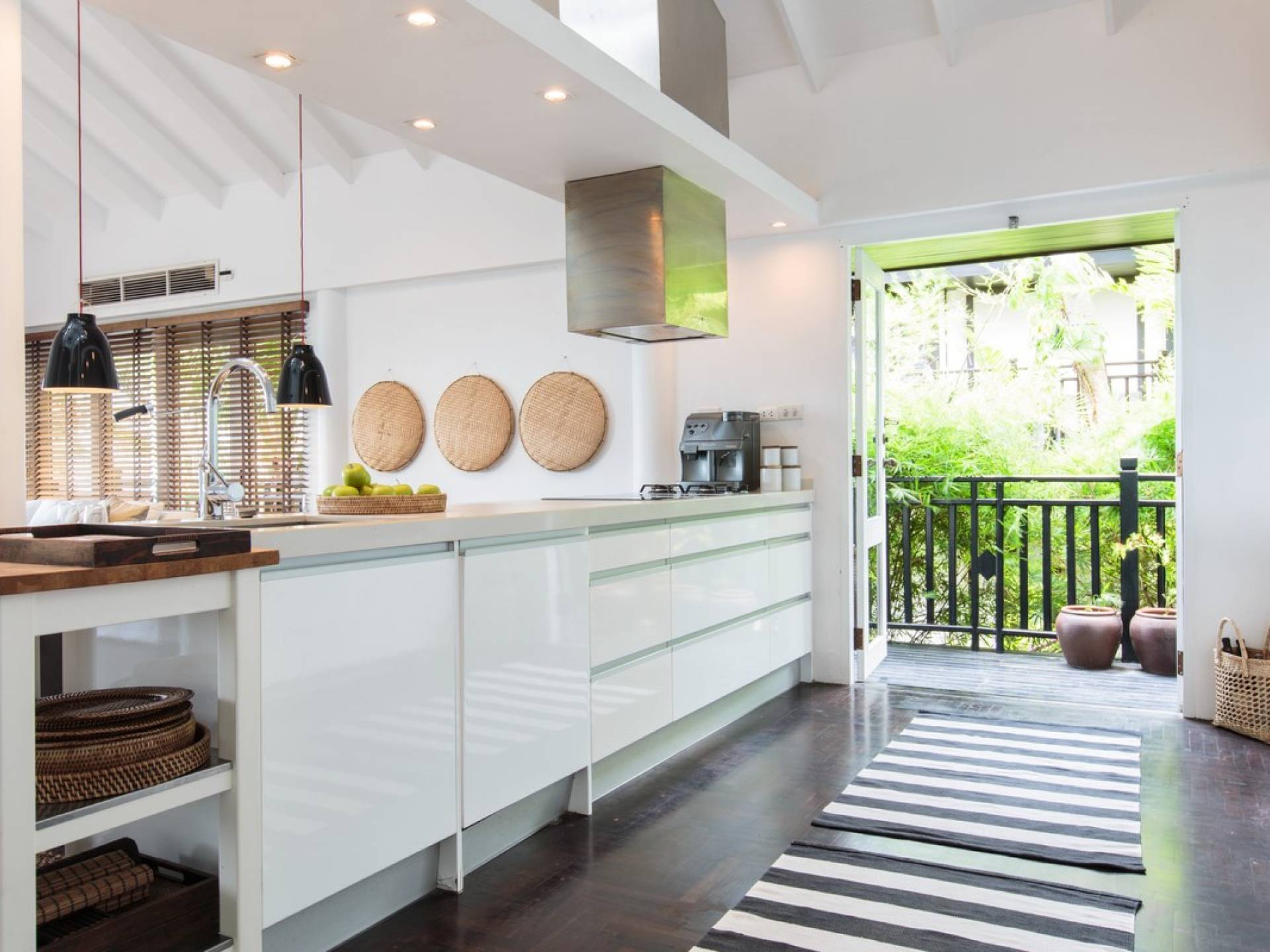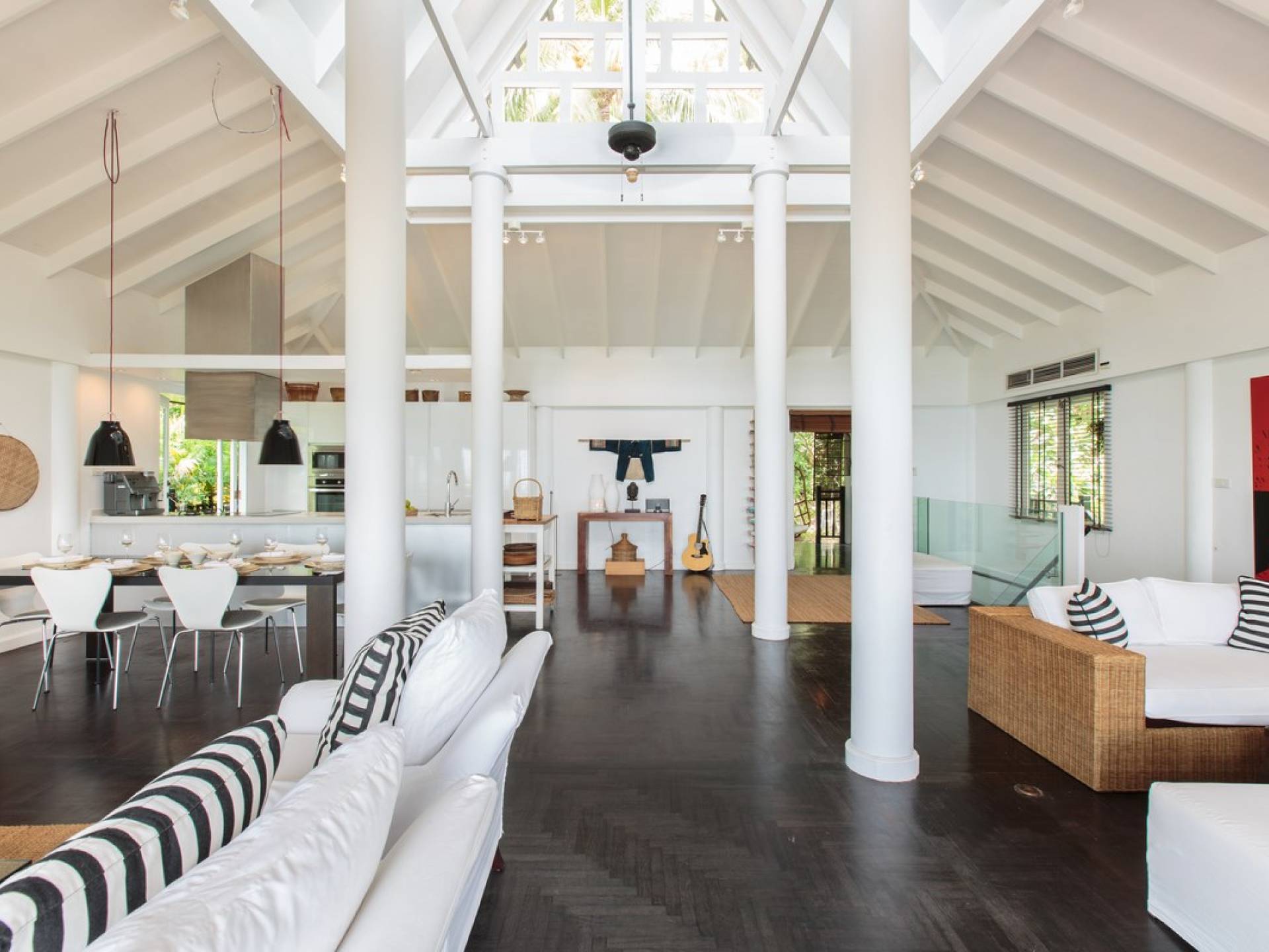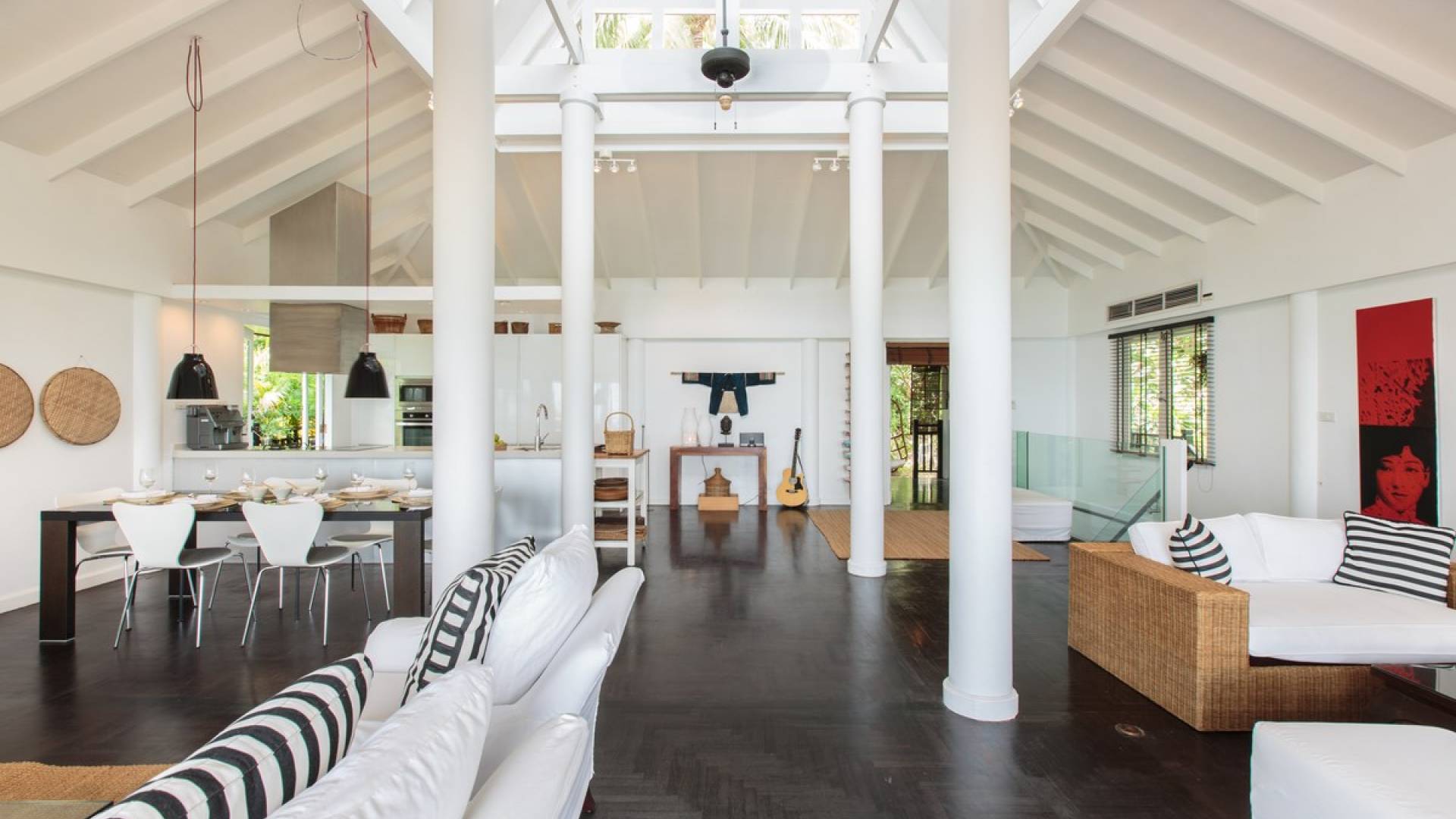 The entrance to the villa opens into an airy, open-plan living, dining, and kitchen area. The white walls and pitched ceiling skylight provide a great sense of space. The hard wooden floors beautifully contrast with the inviting lounge furniture and the chic white, fully equipped, western-style kitchen. The lounge offers two separate, seating areas, with hessian rugs and central coffee tables, the larger of which boasts flat-panel TV with DVD player and satellite TV.
