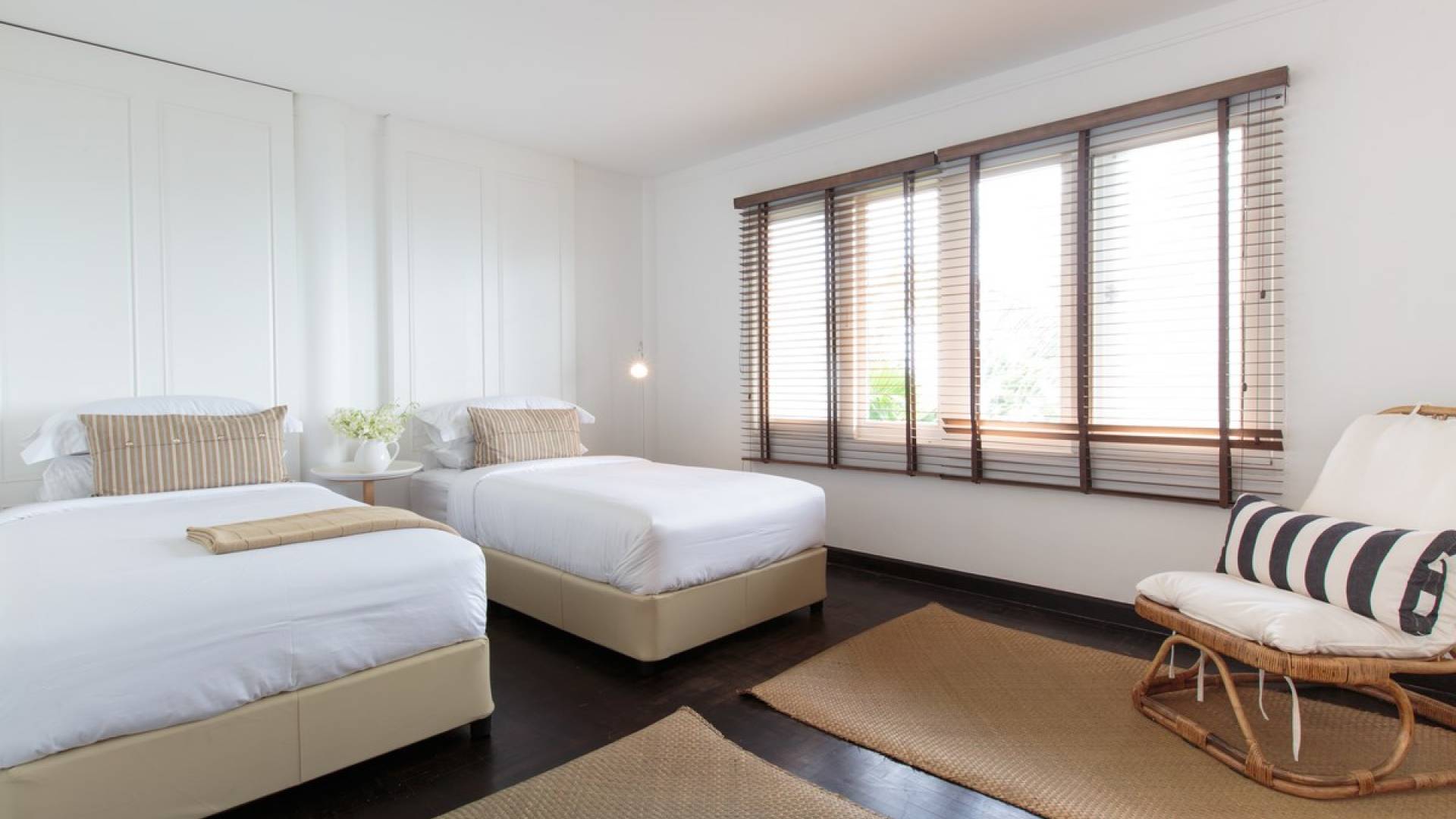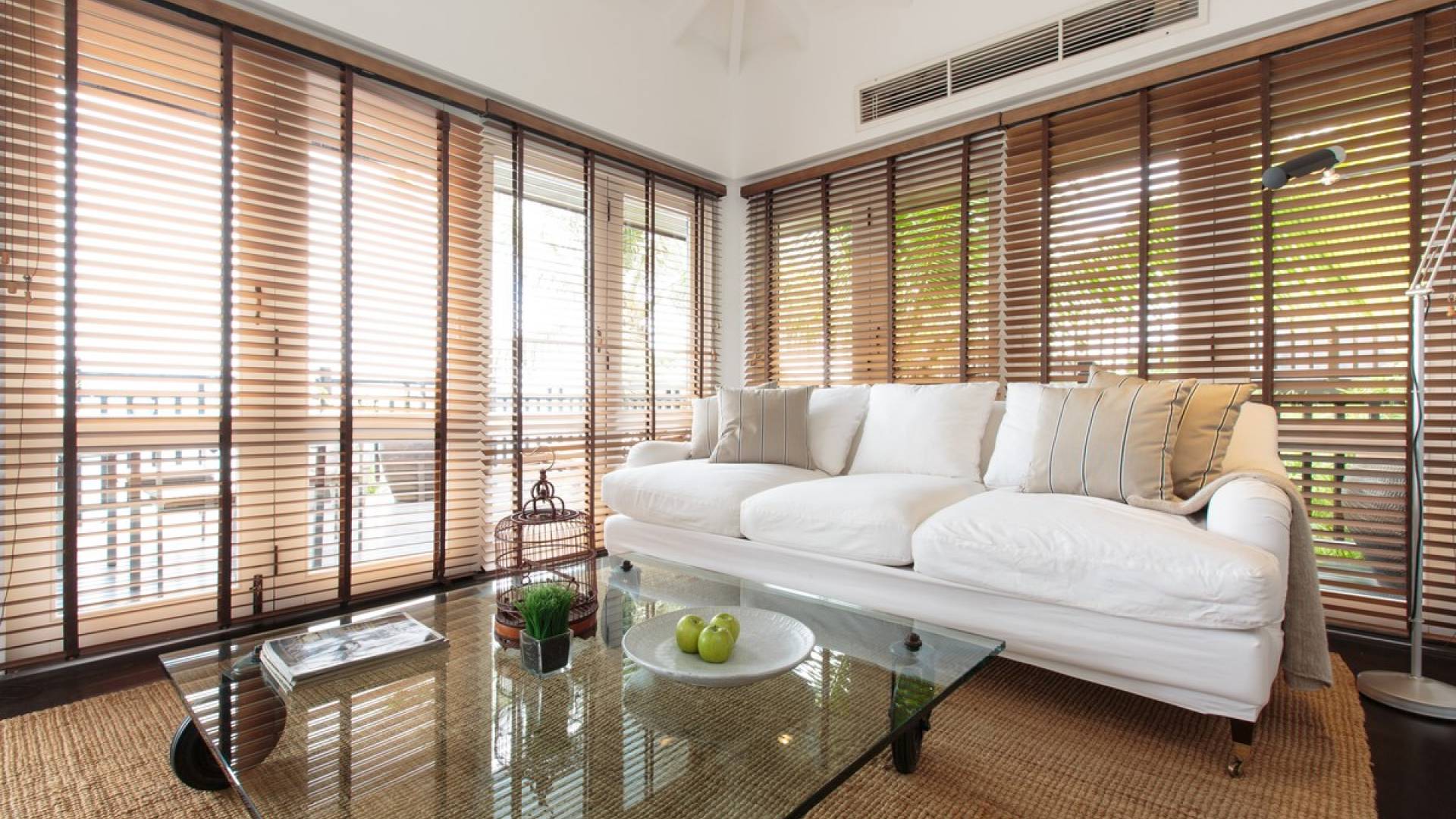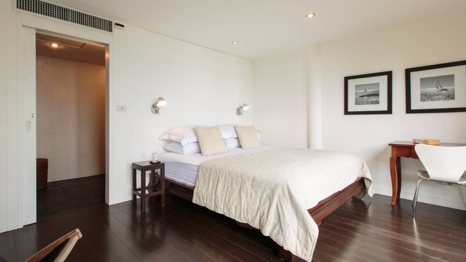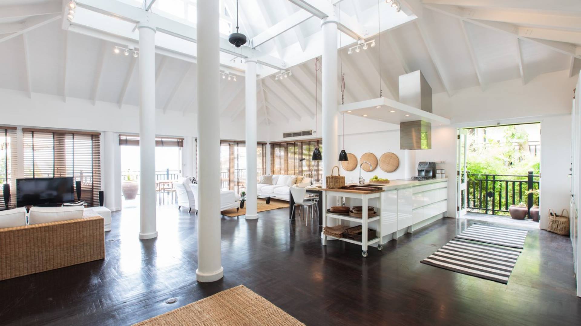 The entrance to the villa opens into an airy, open-plan living, dining, and kitchen area. The white walls and pitched ceiling skylight provide a great sense of space. The hard wooden floors beautifully contrast with the inviting lounge furniture and the chic white, fully equipped, western-style kitchen. The lounge offers two separate, seating areas, with hessian rugs and central coffee tables, the larger of which boasts flat-panel TV with DVD player and satellite TV.