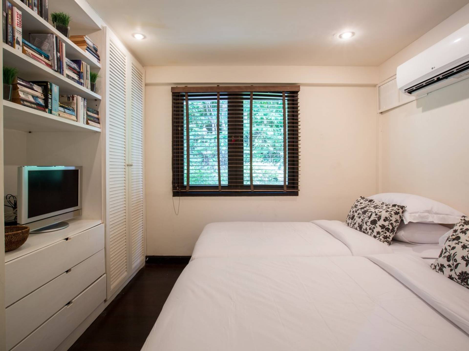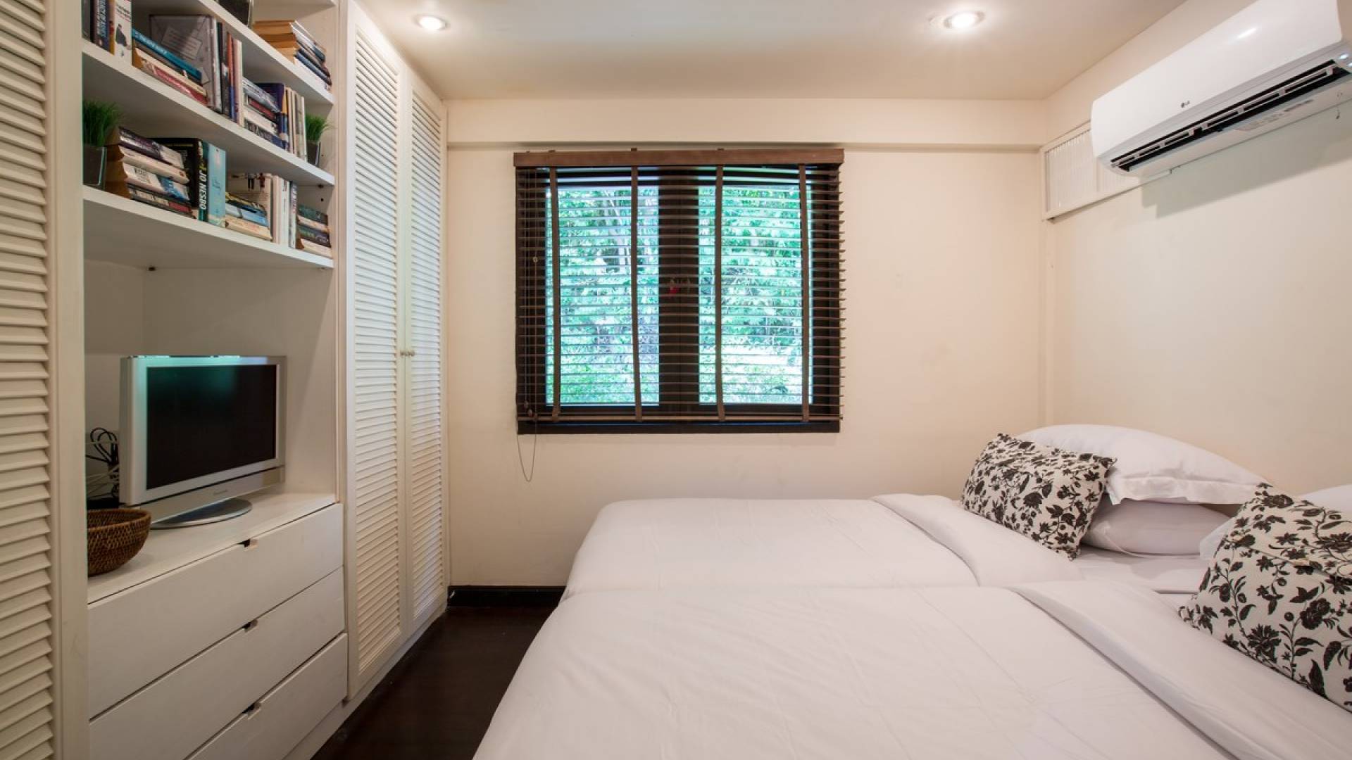 Back up on the top level a small corridor from the front porch, lead past another storage room and the fifth bedroom that has a cozy ambiance, twin beds, hillside views, and flat-screen TV with DVD and satellite linkup as well as ample storage space making for a stairs-free bedroom option. The guest washroom can also be found here.