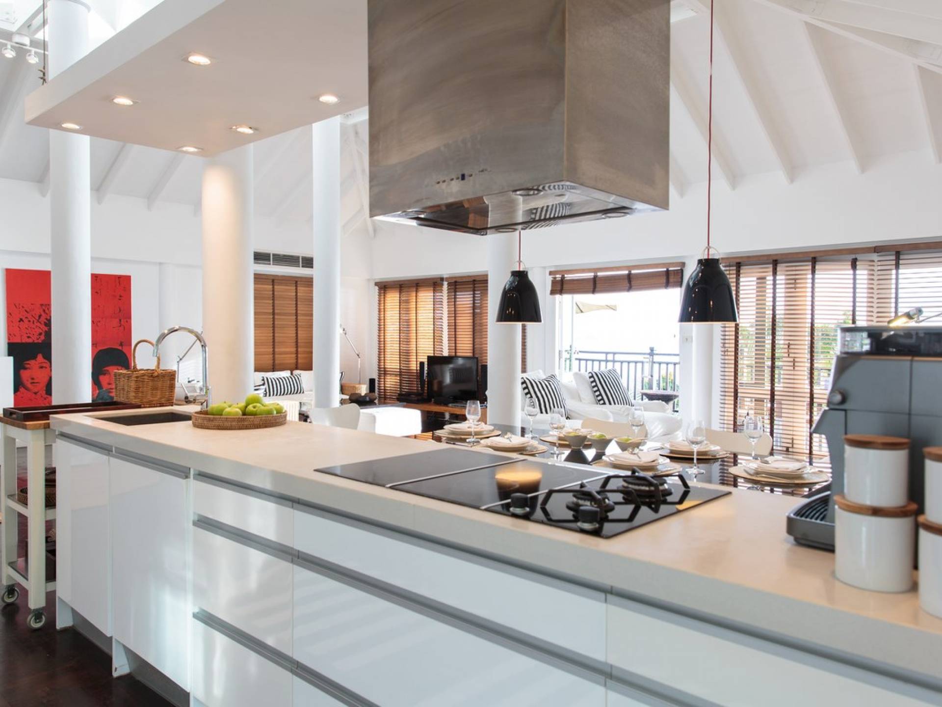 The dining area is located between the seating area and the kitchen and comprises an elegant black lacquered table and six stylish white chairs. The breakfast bar houses a cooking hob and a modern fresh coffee and cappuccino maker (fresh coffee provided). The built-in microwave and an electric oven can be found amid a large wall of units that offer ample storage space for groceries, crockery, and cooking utensils.