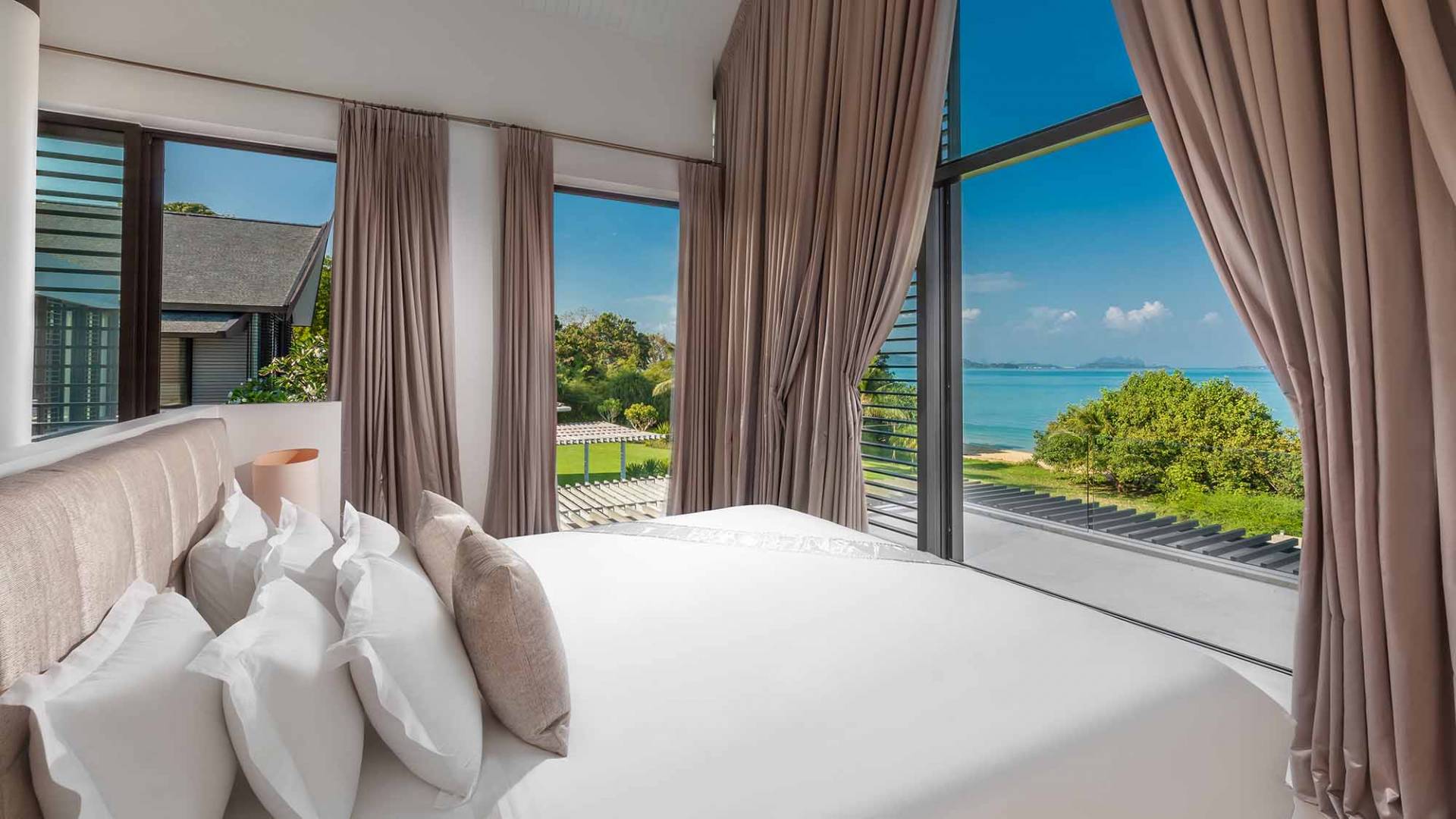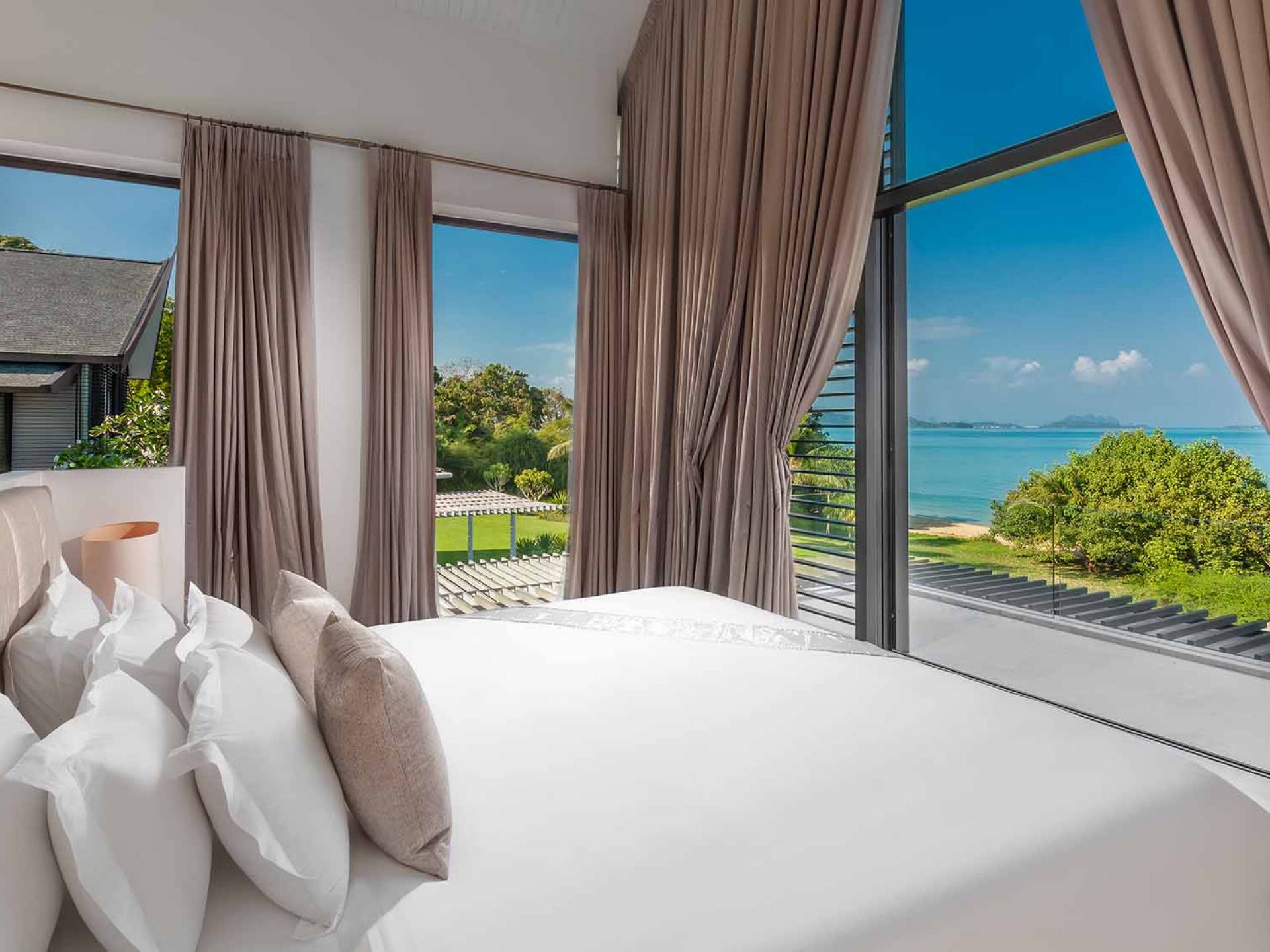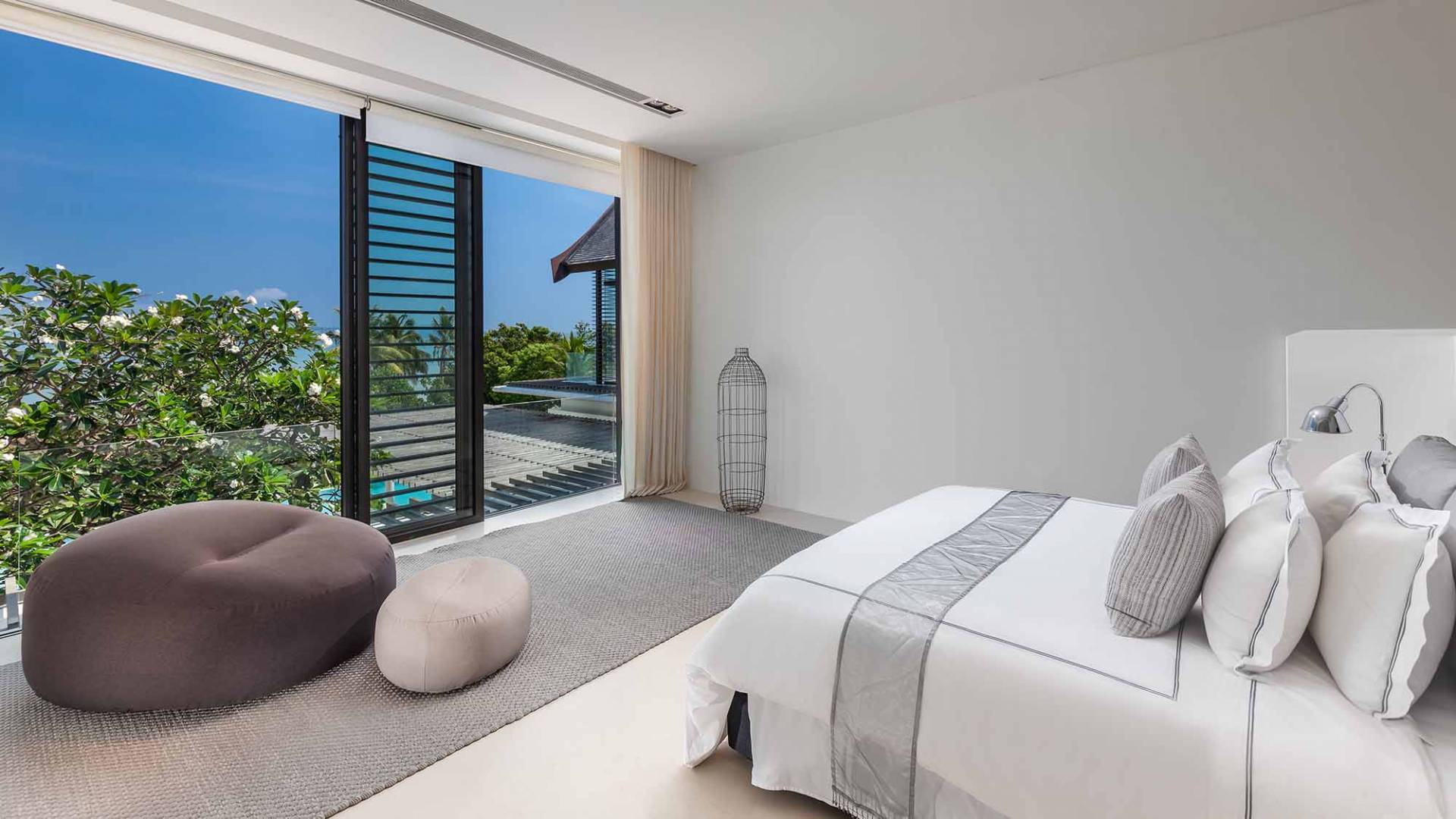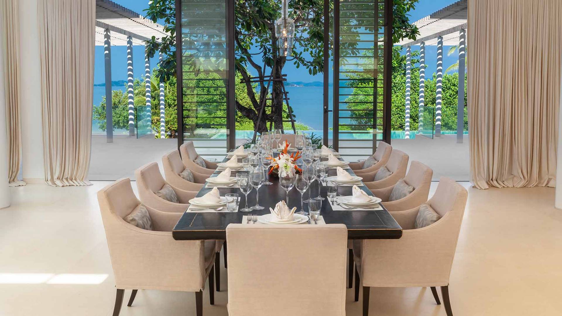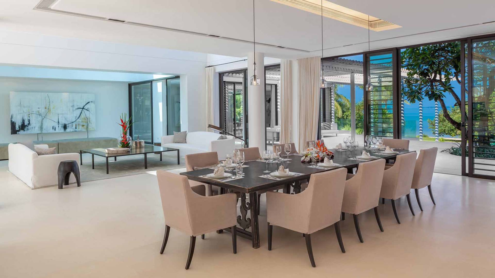 An open-plan living and dining room is a hallmark of luxury villas in Thailand, and at Villa Verai this space is grand yet inviting with sliding glass doors extending to the pool and views out to the sea. The full kitchen is incredible too, whilst in-villa staff makes the vision of luxury villa living a reality during every stay. Bedrooms, on both levels of the gabled-roof villa, are surrounded by terraces and exquisite ponds that give Villa Verai an unforgettable dream-like quality.