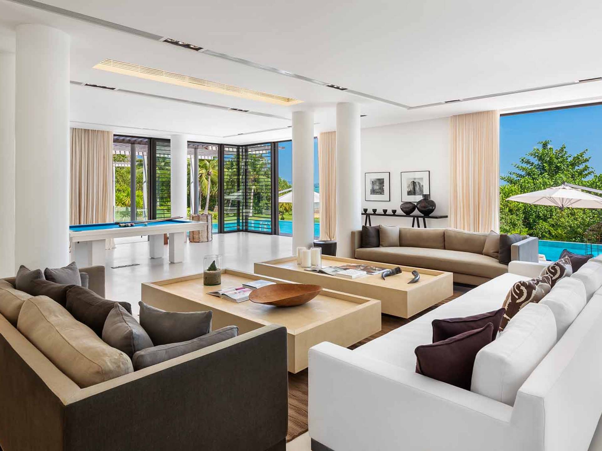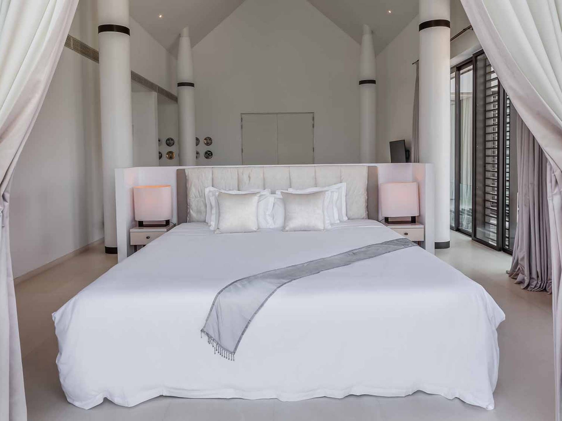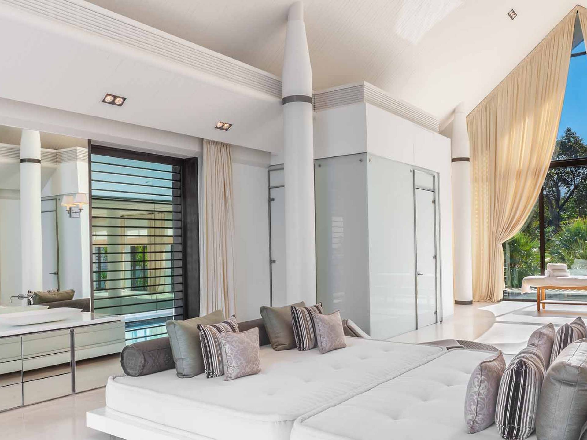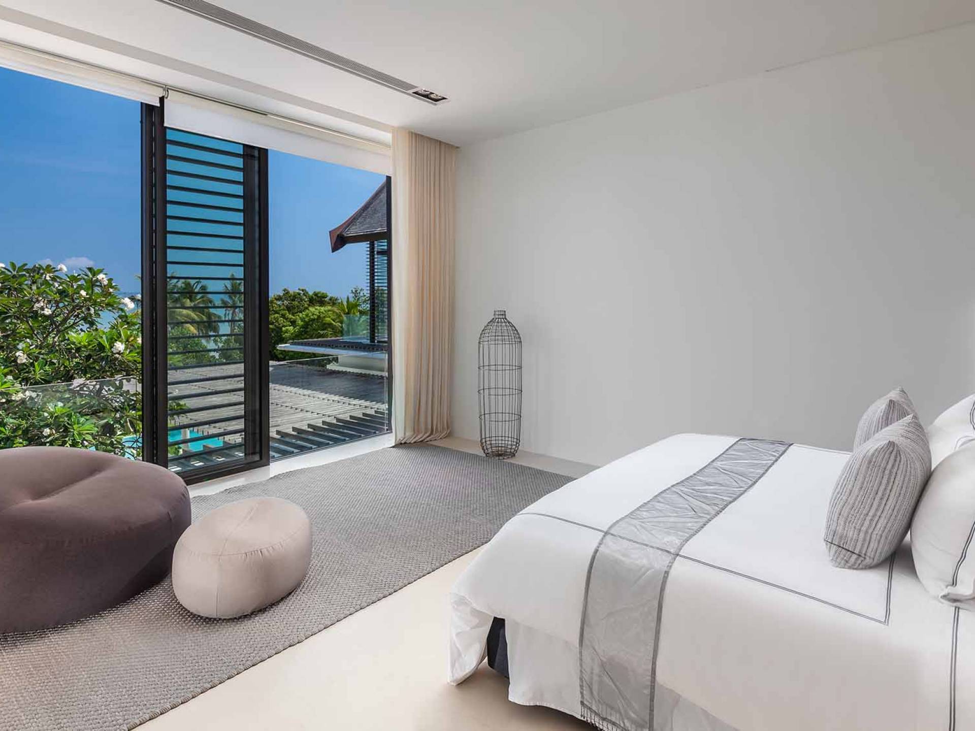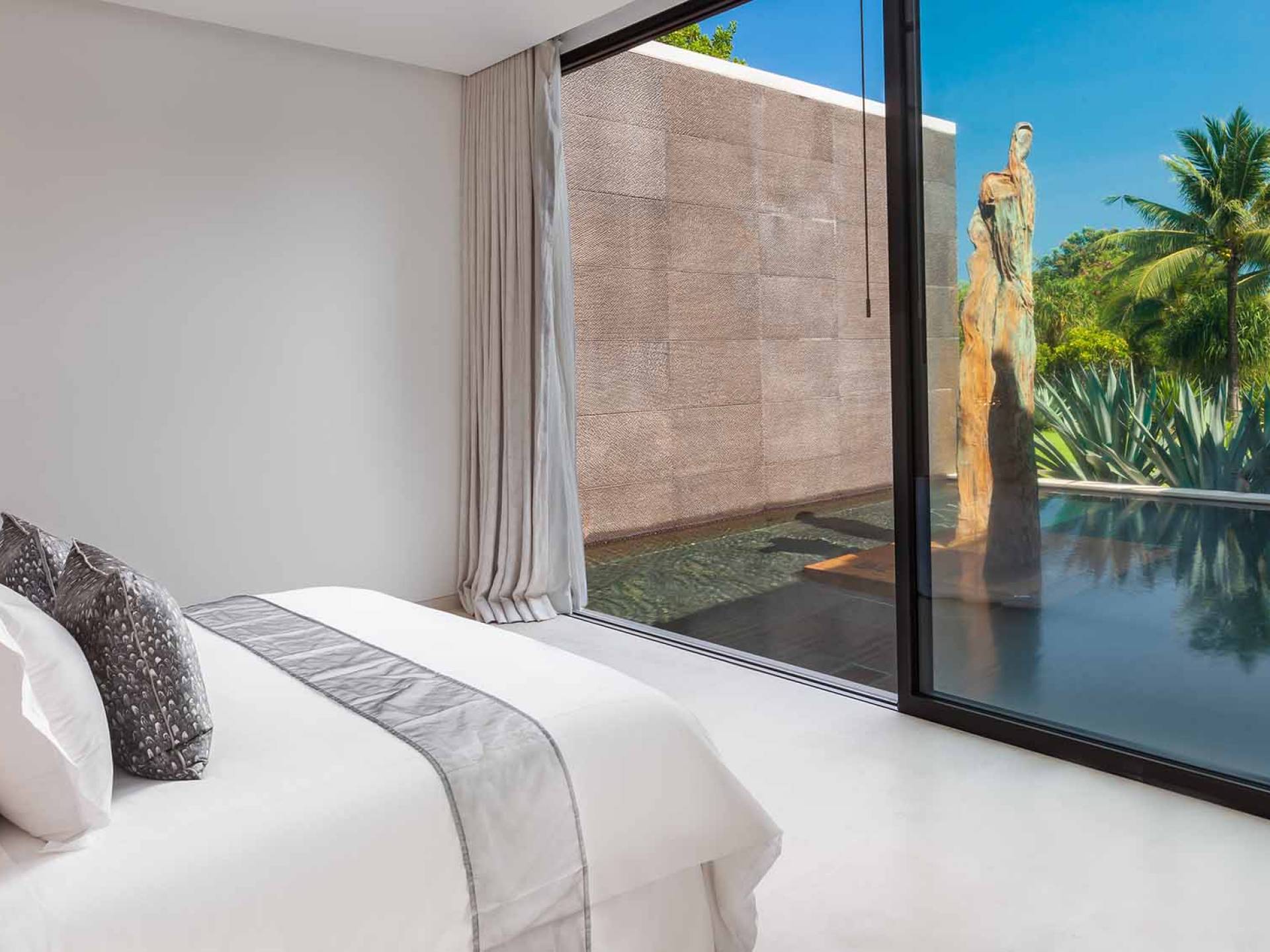 Villa Verai Phuket is a modern masterpiece with 4,500 square meters of indoor and outdoor living accommodations in the exclusive gated community of Cape Yamu. Designed by internationally renowned interior designer Deborah Oppenheimer, the mastermind behind harmonious interior spaces. From the entrance to the double-height atrium and every style detail, there is a sense of being able to breathe and stretch out in Villa Verai’s minimalist, wide-open spaces. At the same time, dramatic design details create a distinctly cool, designer feel. White interiors are touched with black in a contemporary style to give Villa Verai a light, airy atmosphere with plenty of natural light. A sweeping spiral staircase adds drama, whilst the upper-level glass-bottomed pond adds a fun, James Bondesque touch. Every room seems to boast a day-bed or ottoman-style seating to inspire true relaxation. Meanwhile, the living-room bathroom has a sensual boudoir style whilst en-suites, with freestanding tubs and picturesque views have a spa, star quality.