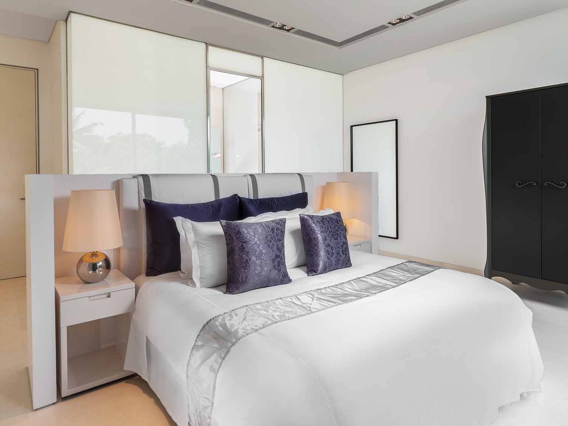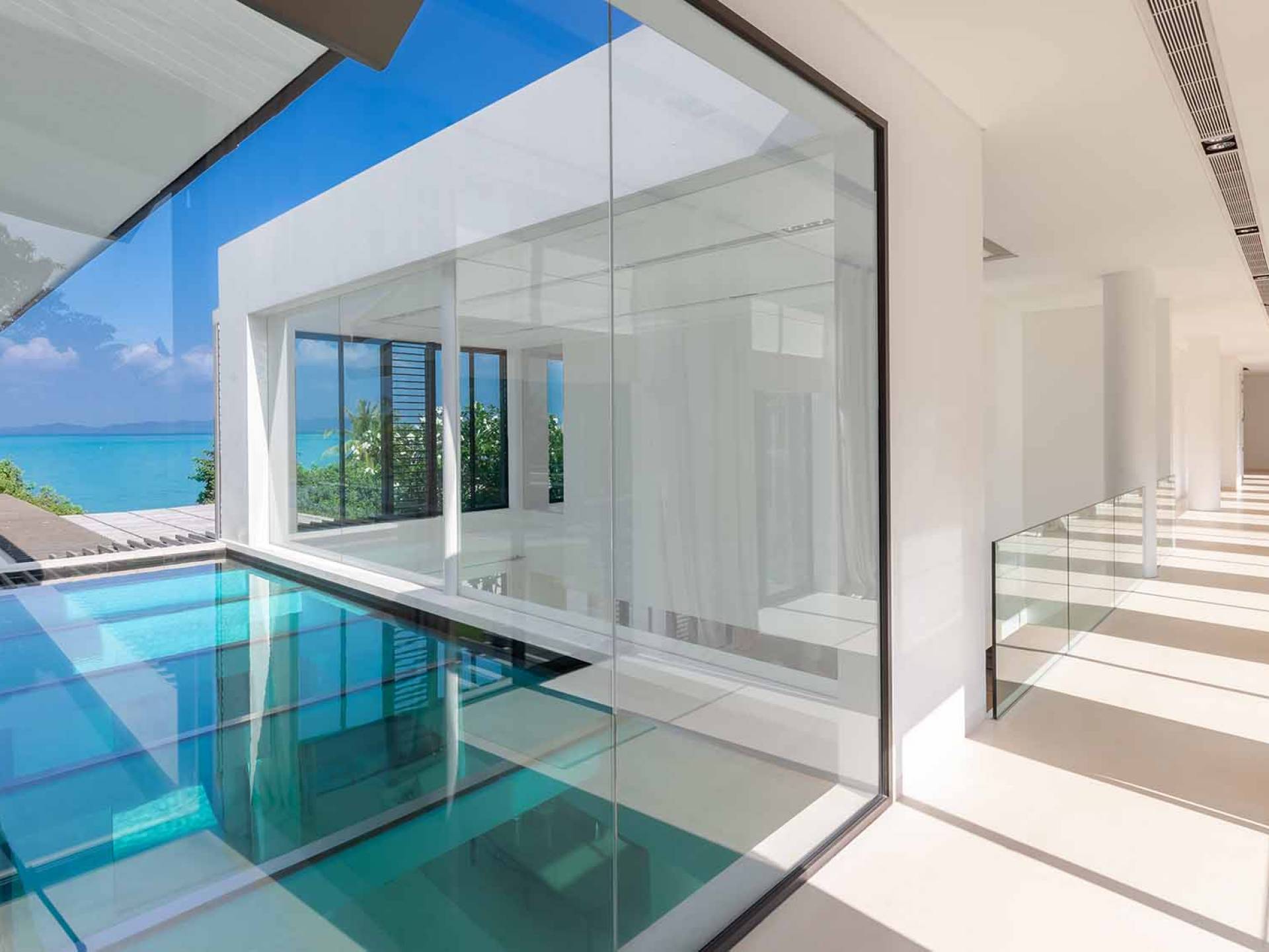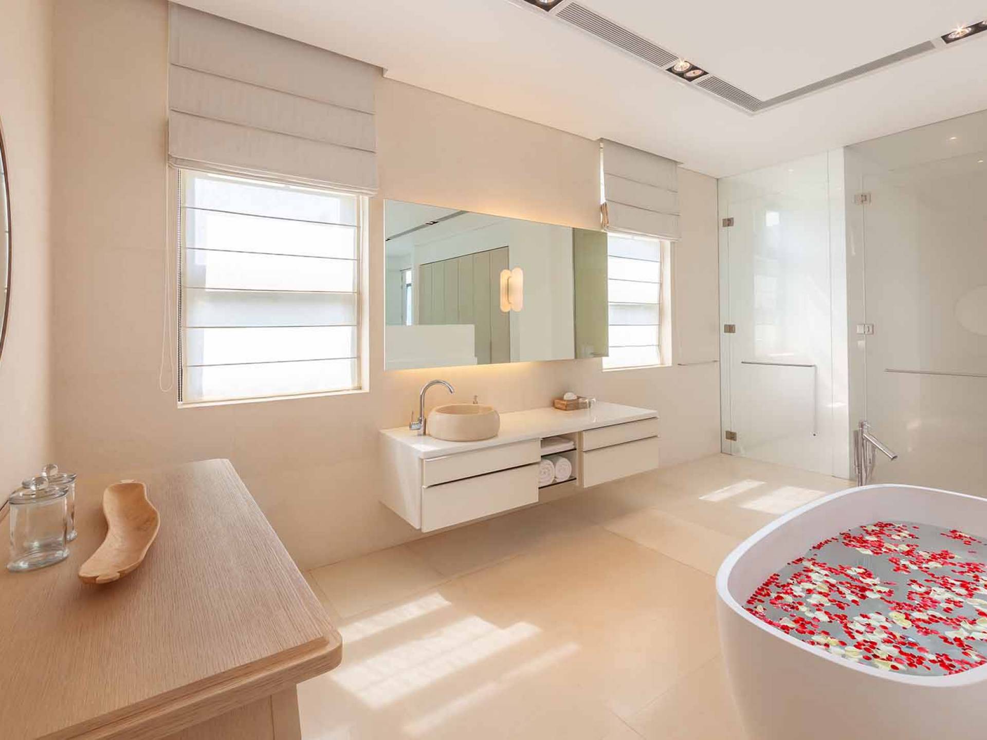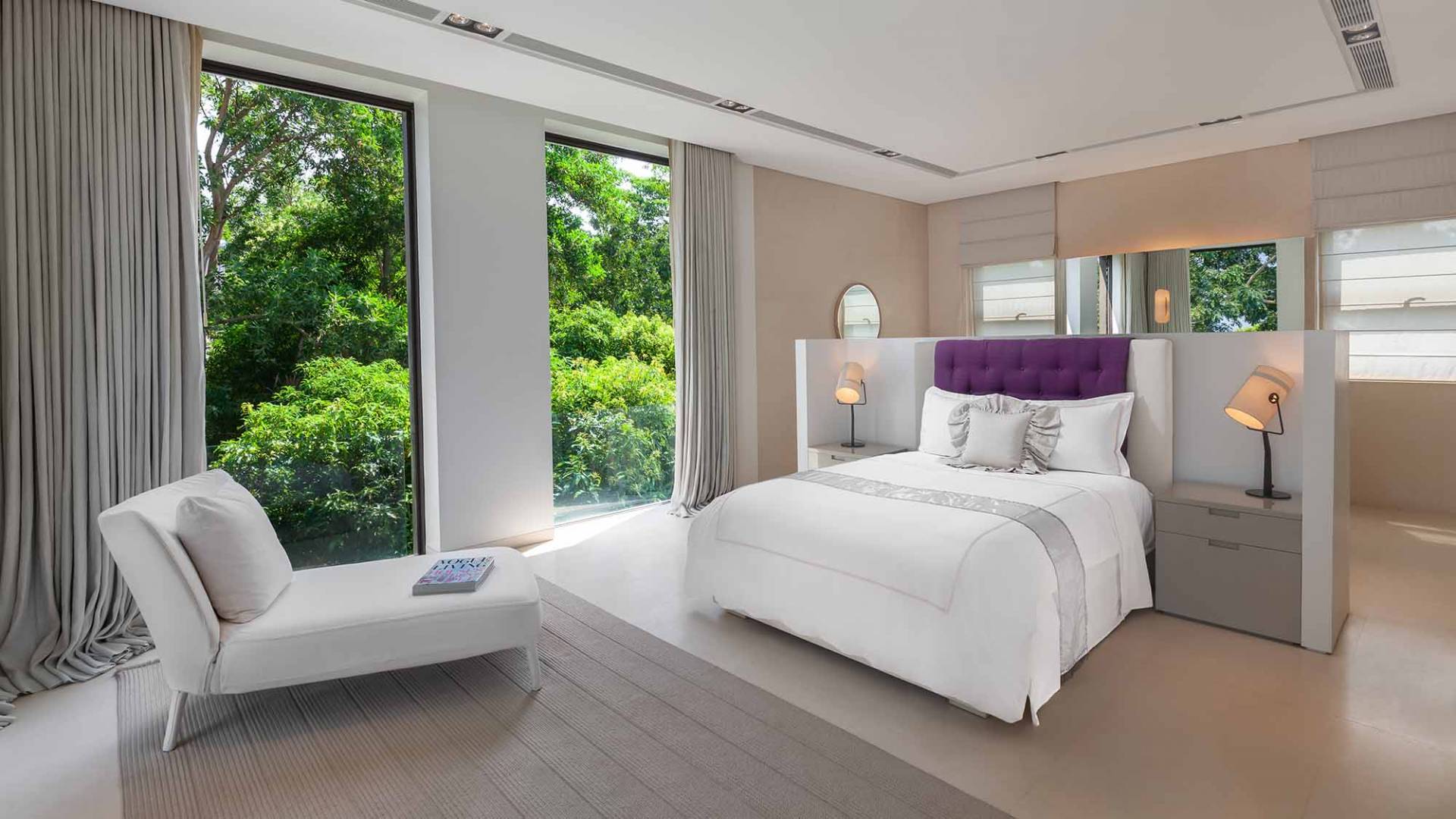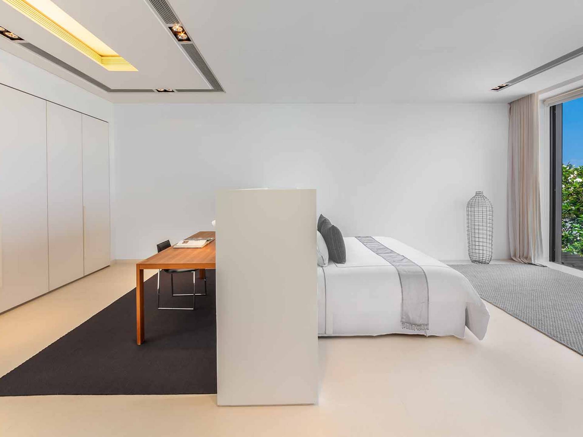 Villa Verai Phuket is a modern masterpiece with 4,500 square meters of indoor and outdoor living accommodations in the exclusive gated community of Cape Yamu. Designed by internationally renowned interior designer Deborah Oppenheimer, the mastermind behind harmonious interior spaces. From the entrance to the double-height atrium and every style detail, there is a sense of being able to breathe and stretch out in Villa Verai’s minimalist, wide-open spaces. At the same time, dramatic design details create a distinctly cool, designer feel. White interiors are touched with black in a contemporary style to give Villa Verai a light, airy atmosphere with plenty of natural light. A sweeping spiral staircase adds drama, whilst the upper-level glass-bottomed pond adds a fun, James Bondesque touch. Every room seems to boast a day-bed or ottoman-style seating to inspire true relaxation. Meanwhile, the living-room bathroom has a sensual boudoir style whilst en-suites, with freestanding tubs and picturesque views have a spa, star quality.