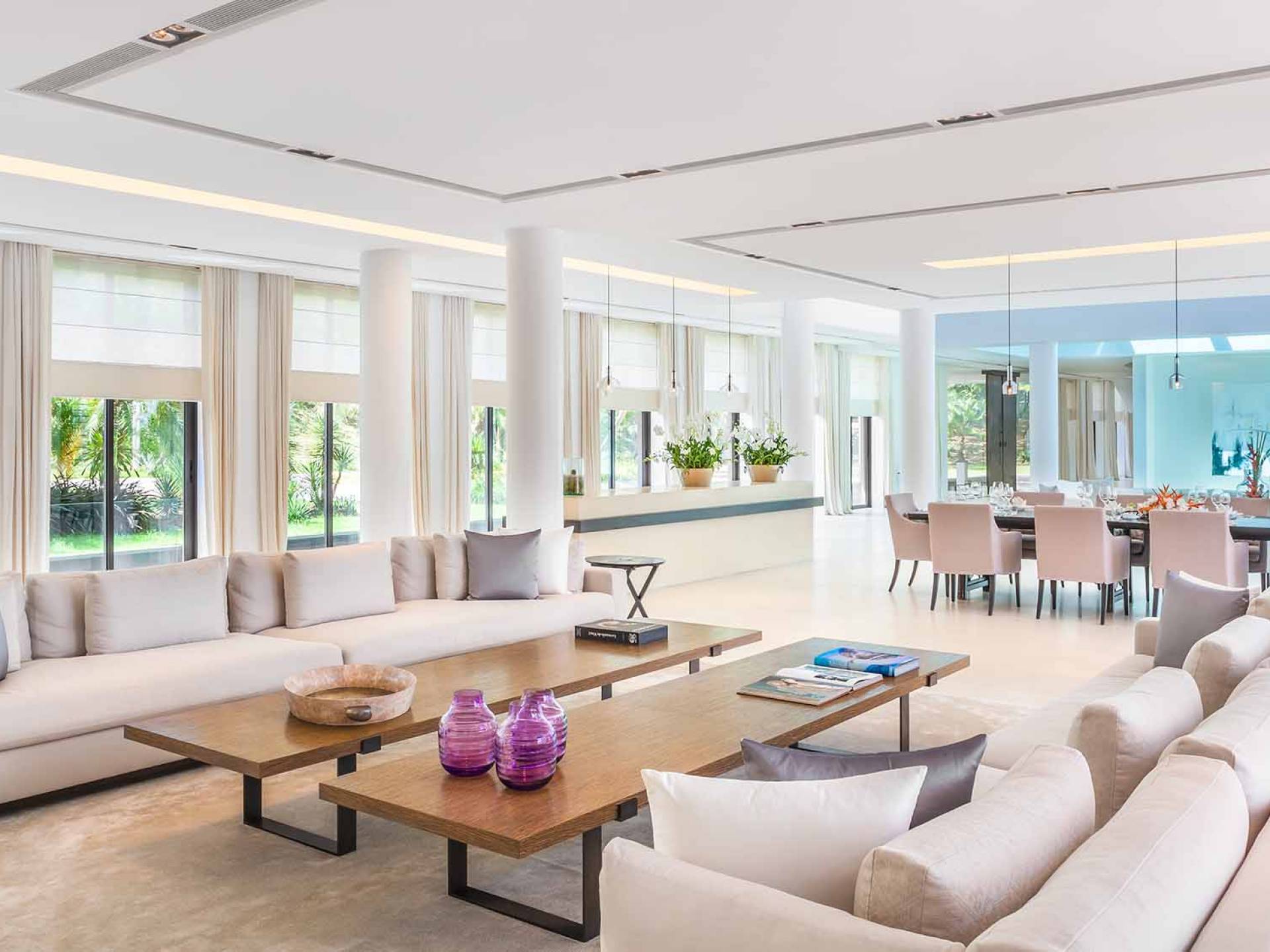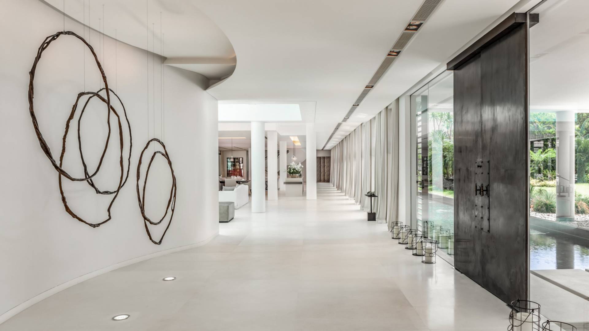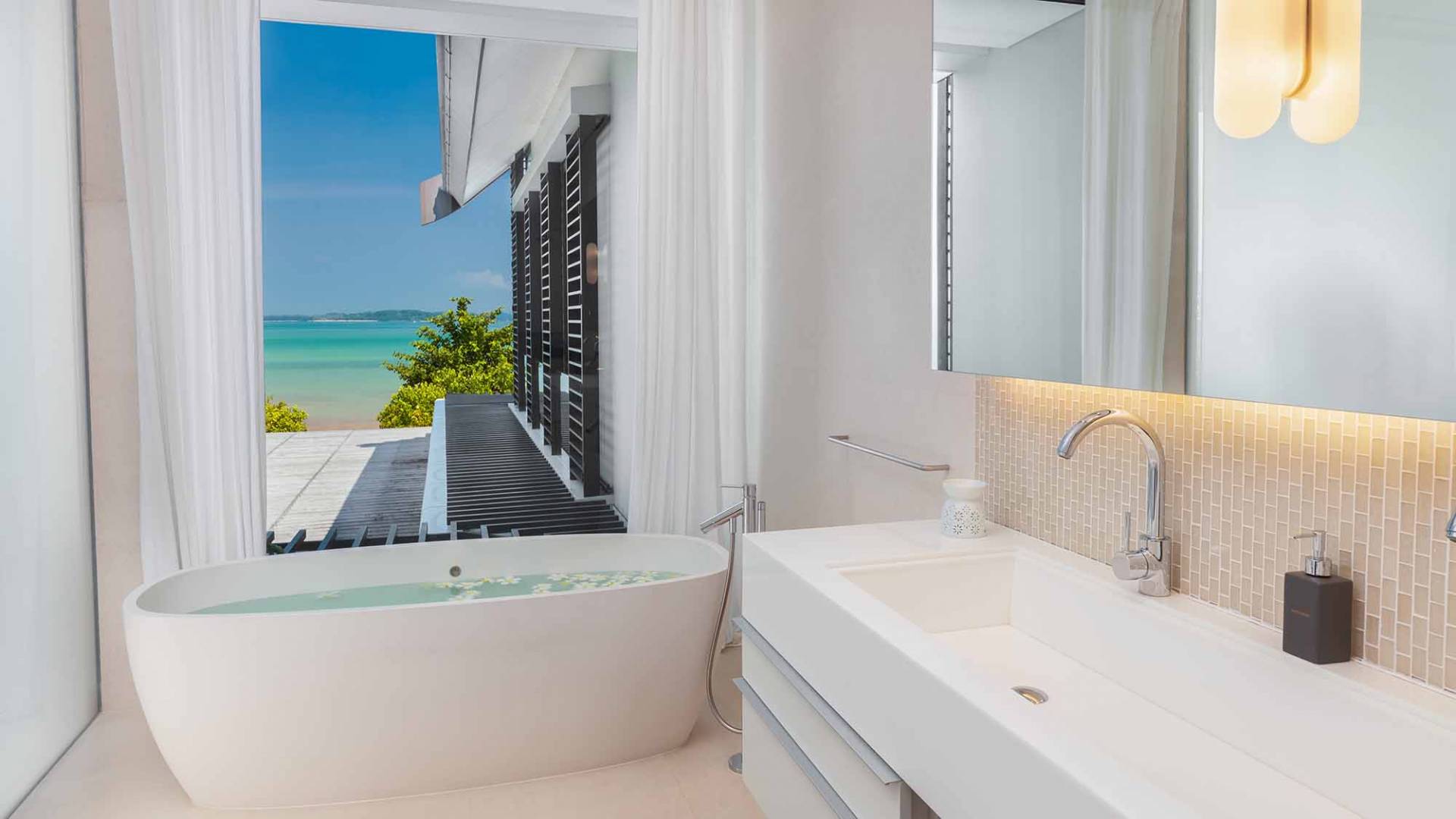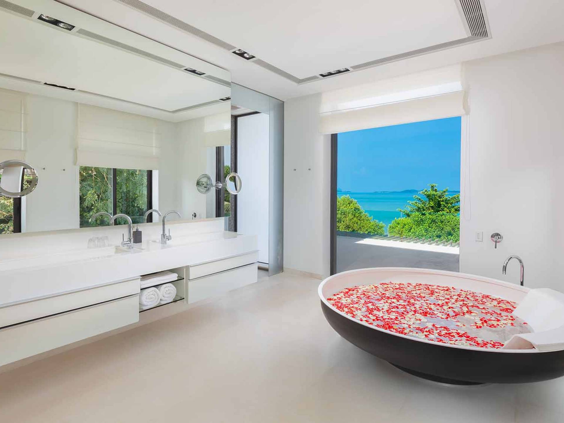 Villa Verai Phuket is a modern masterpiece with 4,500 square meters of indoor and outdoor living accommodations in the exclusive gated community of Cape Yamu. Designed by internationally renowned interior designer Deborah Oppenheimer, the mastermind behind harmonious interior spaces. From the entrance to the double-height atrium and every style detail, there is a sense of being able to breathe and stretch out in Villa Verai’s minimalist, wide-open spaces. At the same time, dramatic design details create a distinctly cool, designer feel. White interiors are touched with black in a contemporary style to give Villa Verai a light, airy atmosphere with plenty of natural light. A sweeping spiral staircase adds drama, whilst the upper-level glass-bottomed pond adds a fun, James Bondesque touch. Every room seems to boast a day-bed or ottoman-style seating to inspire true relaxation. Meanwhile, the living-room bathroom has a sensual boudoir style whilst en-suites, with freestanding tubs and picturesque views have a spa, star quality.