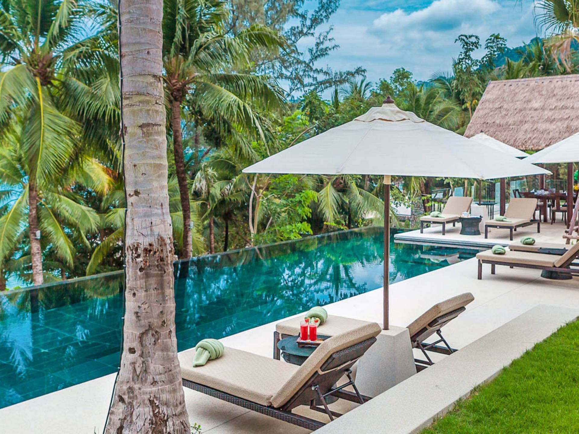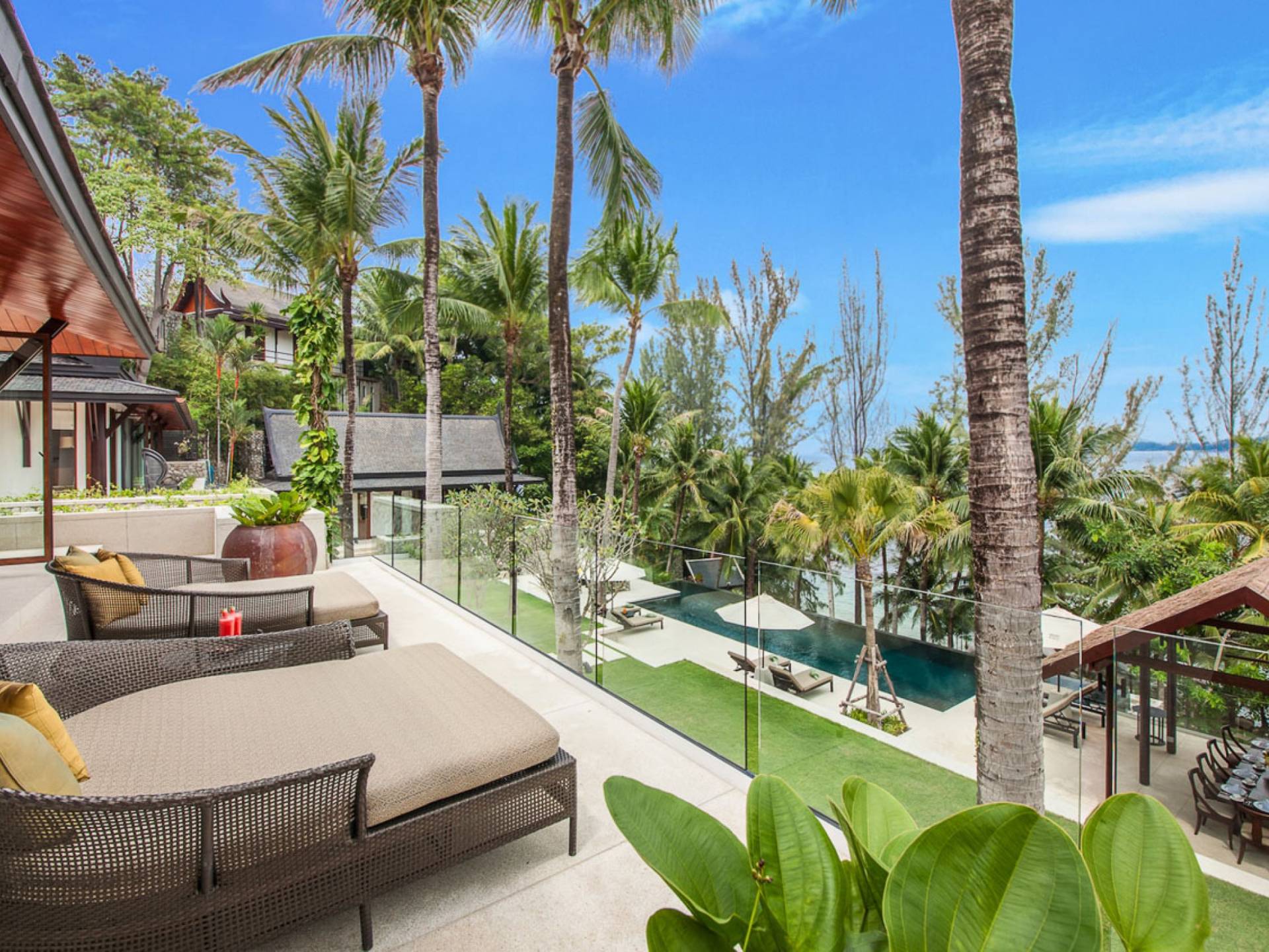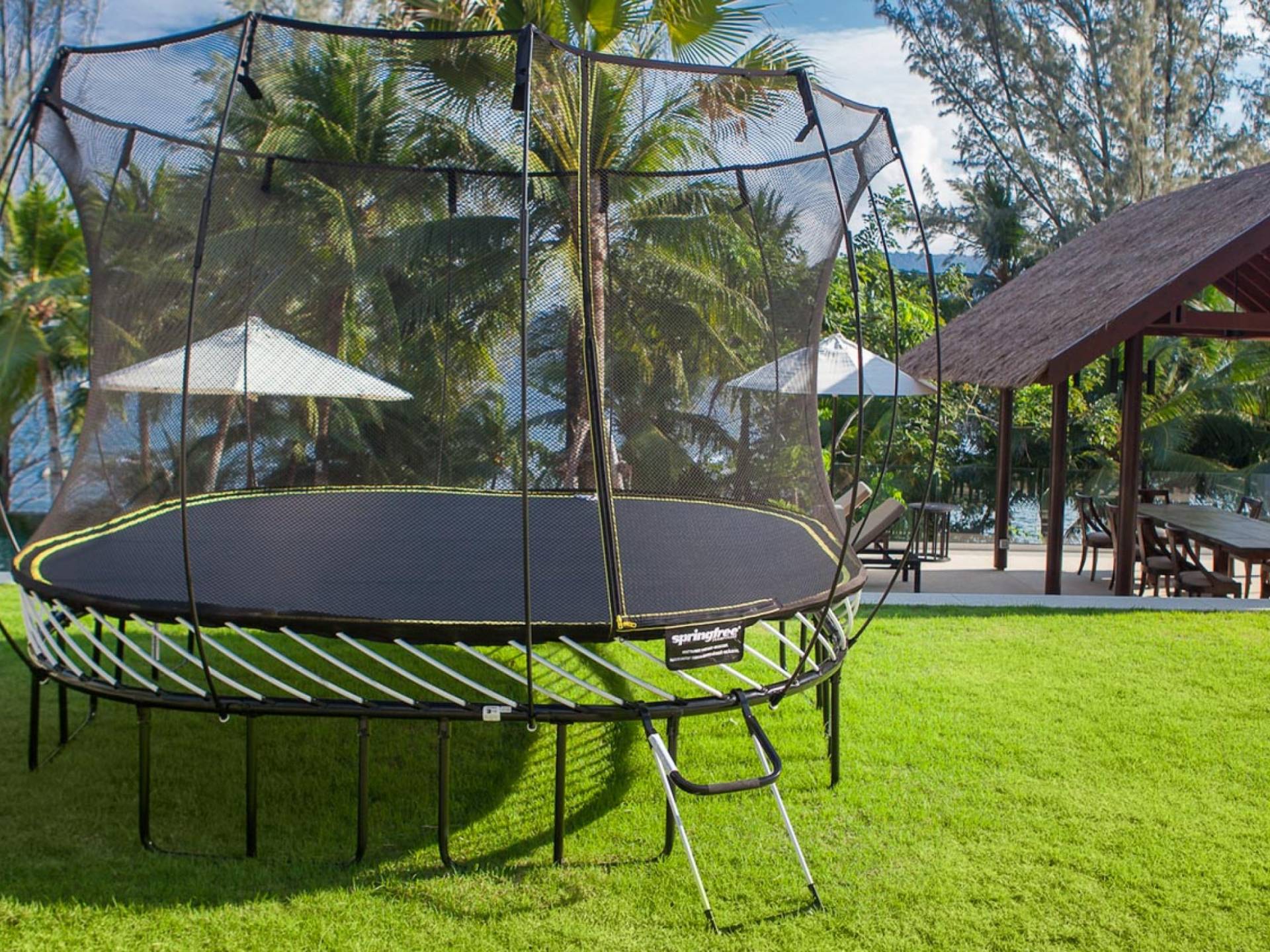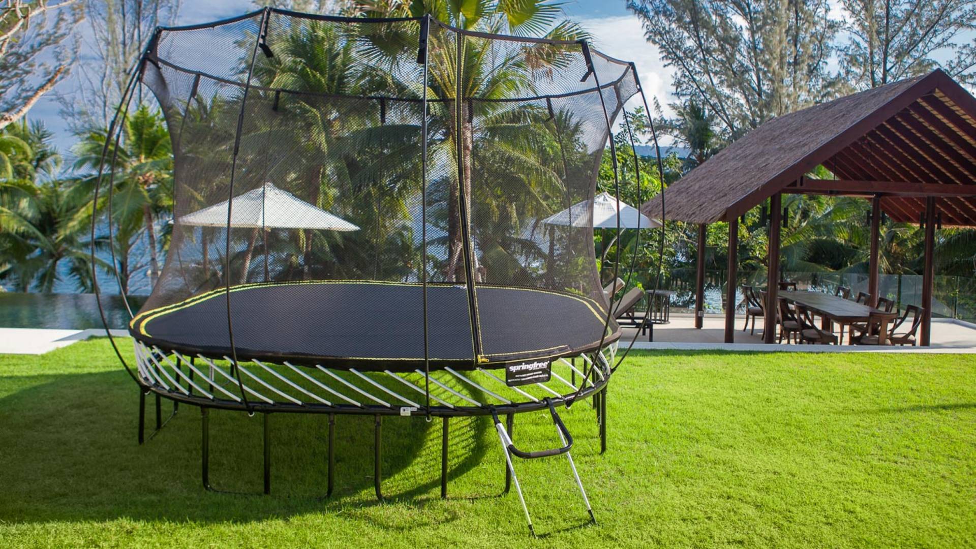 Analaya villa’s highlight is definitely its beautiful zero-edge infinity pool. Facing the Andaman Sea and embraced by palm trees and other tropical trees, swimming at the pool will make you feel like you’re smack in the middle of nature. Around the pool are plenty of sun loungers, a comfortable outdoor sala, as well as an alfresco dining area. Manicured, tropical gardens surround the pool area, where a large trampoline is placed for both kids and adults to have fun with.