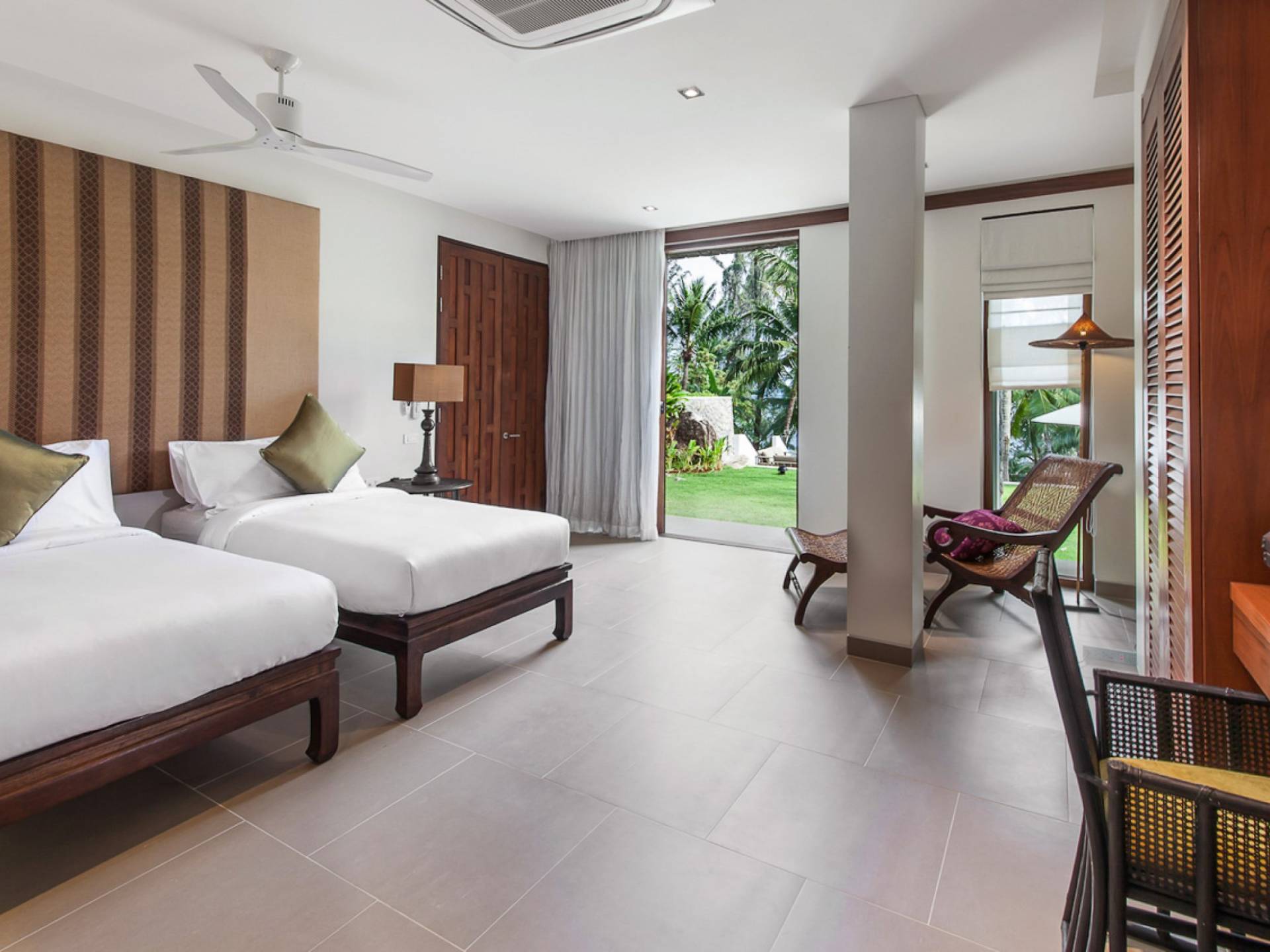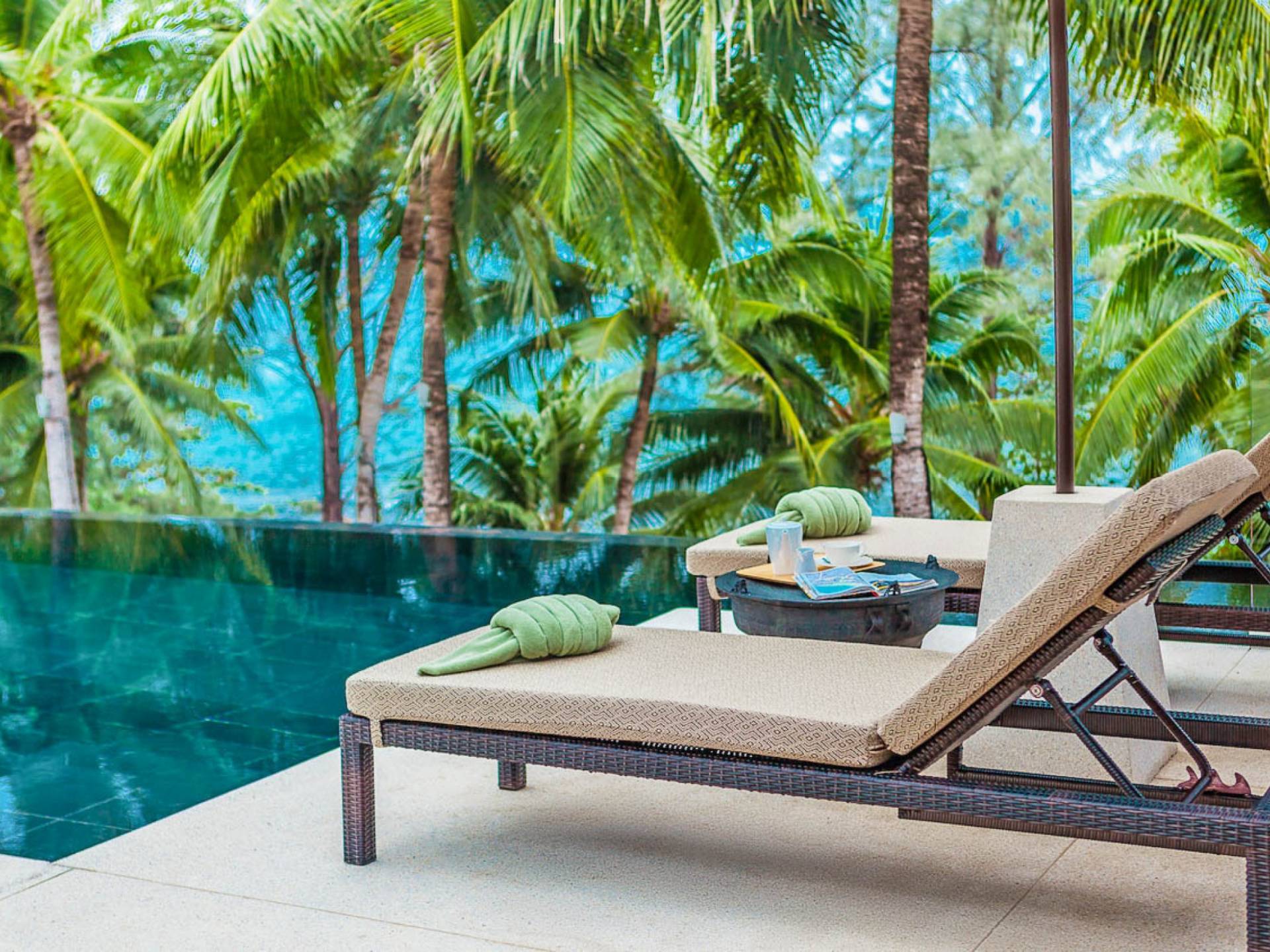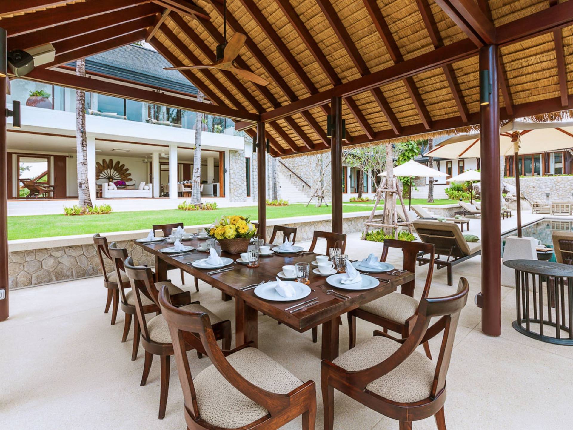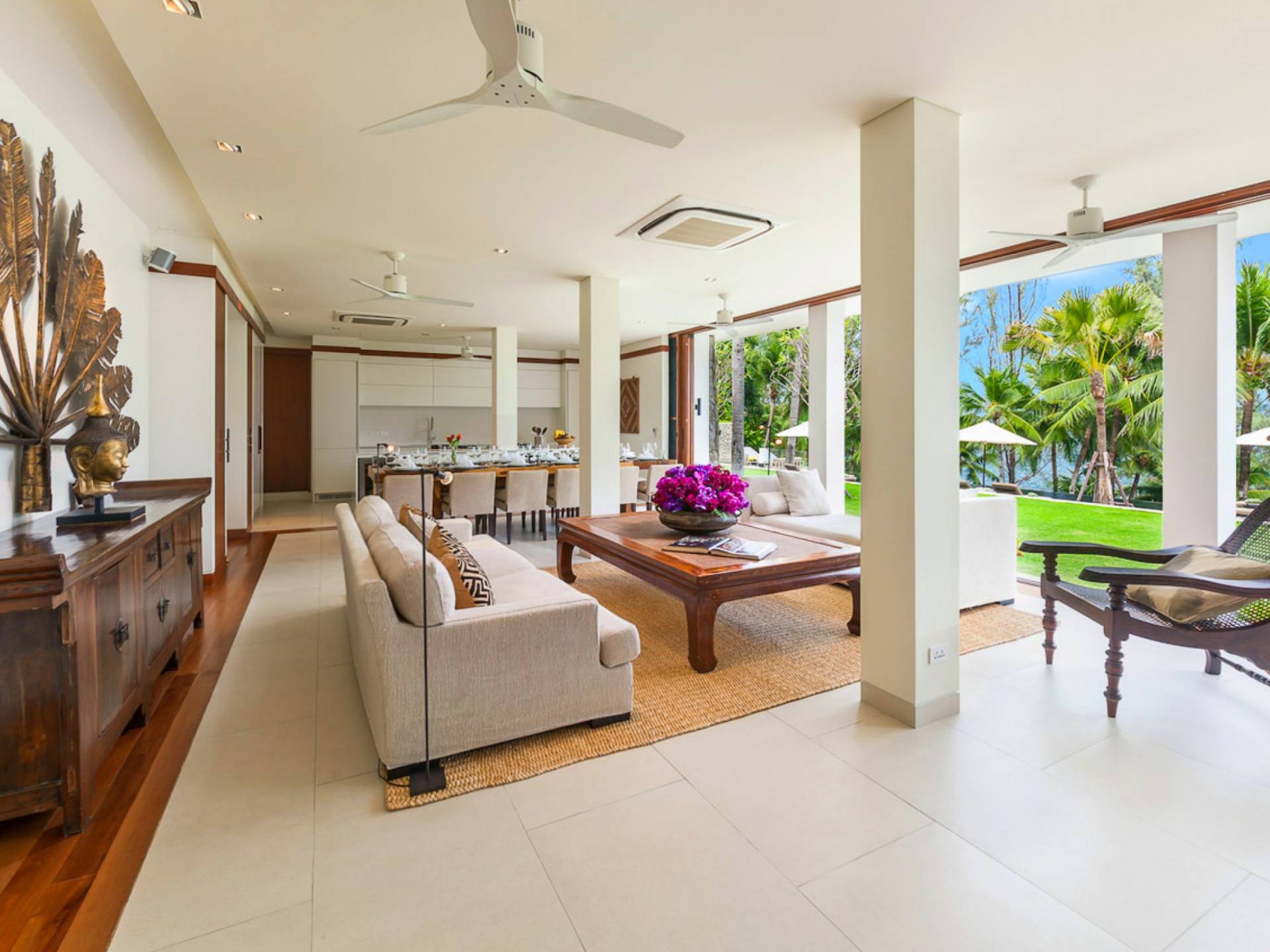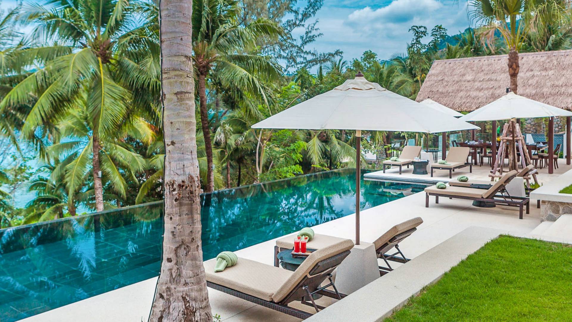 Analaya villa’s highlight is definitely its beautiful zero-edge infinity pool. Facing the Andaman Sea and embraced by palm trees and other tropical trees, swimming at the pool will make you feel like you’re smack in the middle of nature. Around the pool are plenty of sun loungers, a comfortable outdoor sala, as well as an alfresco dining area. Manicured, tropical gardens surround the pool area, where a large trampoline is placed for both kids and adults to have fun with.