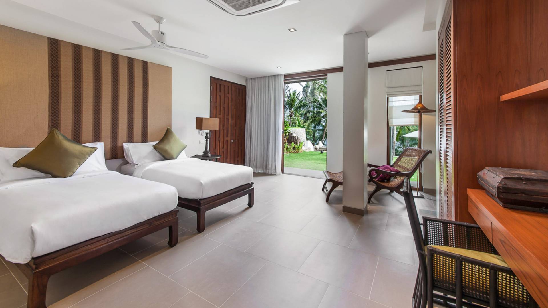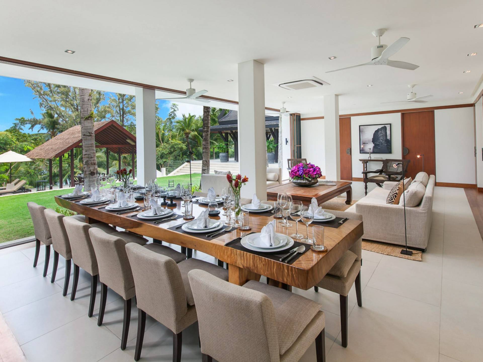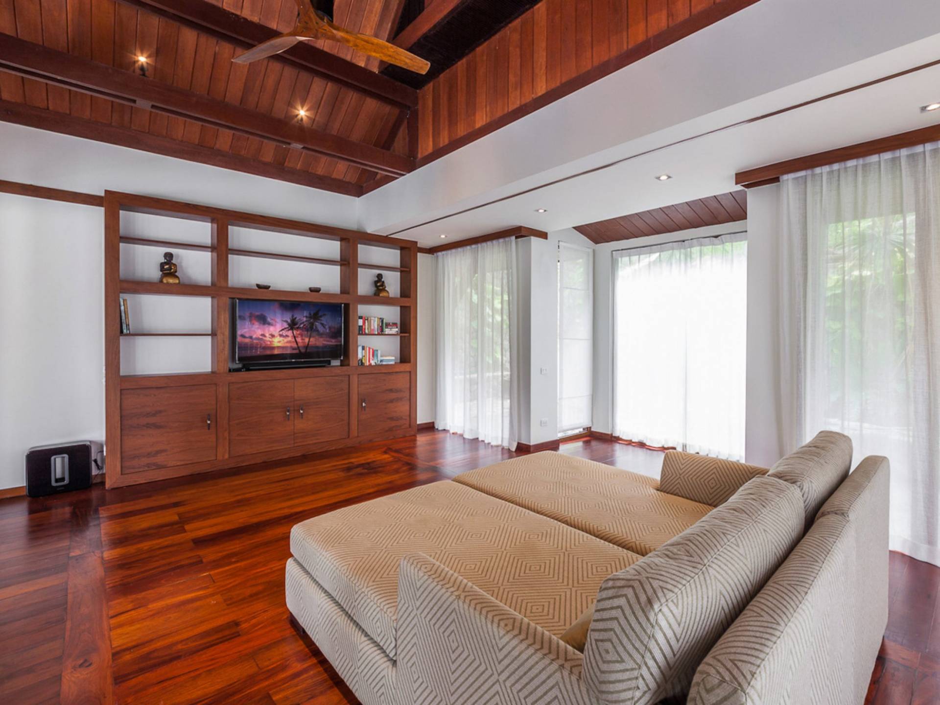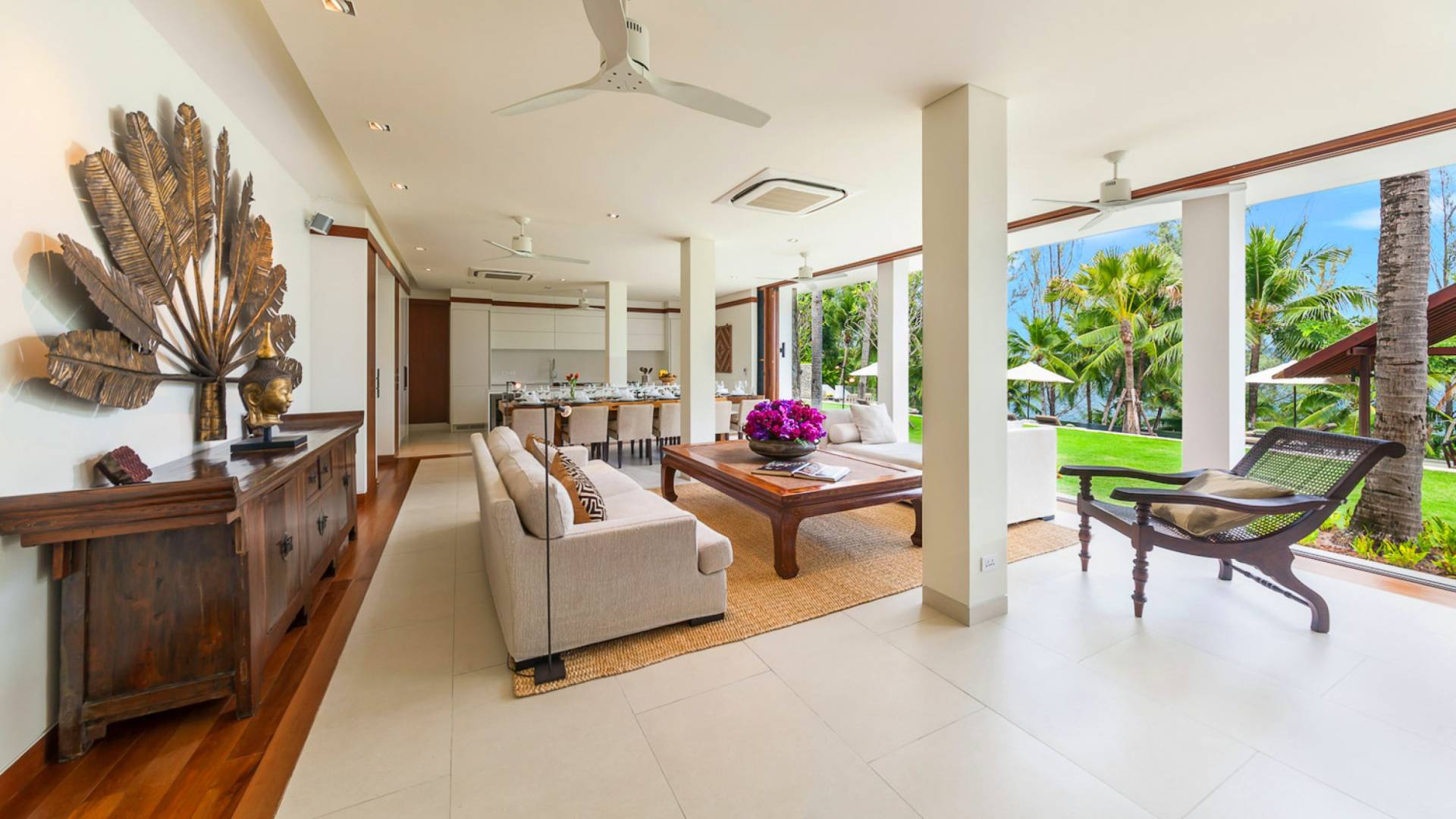 Analaya villa’s highlight is definitely its beautiful zero-edge infinity pool. Facing the Andaman Sea and embraced by palm trees and other tropical trees, swimming at the pool will make you feel like you’re smack in the middle of nature. Around the pool are plenty of sun loungers, a comfortable outdoor sala, as well as an alfresco dining area. Manicured, tropical gardens surround the pool area, where a large trampoline is placed for both kids and adults to have fun with.