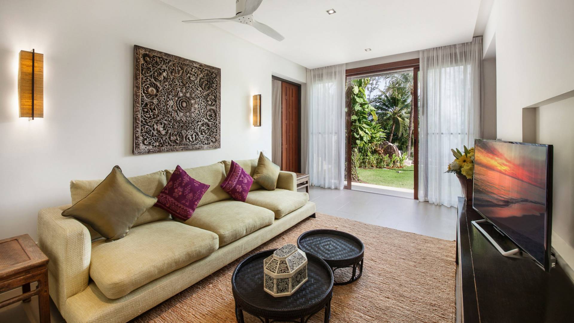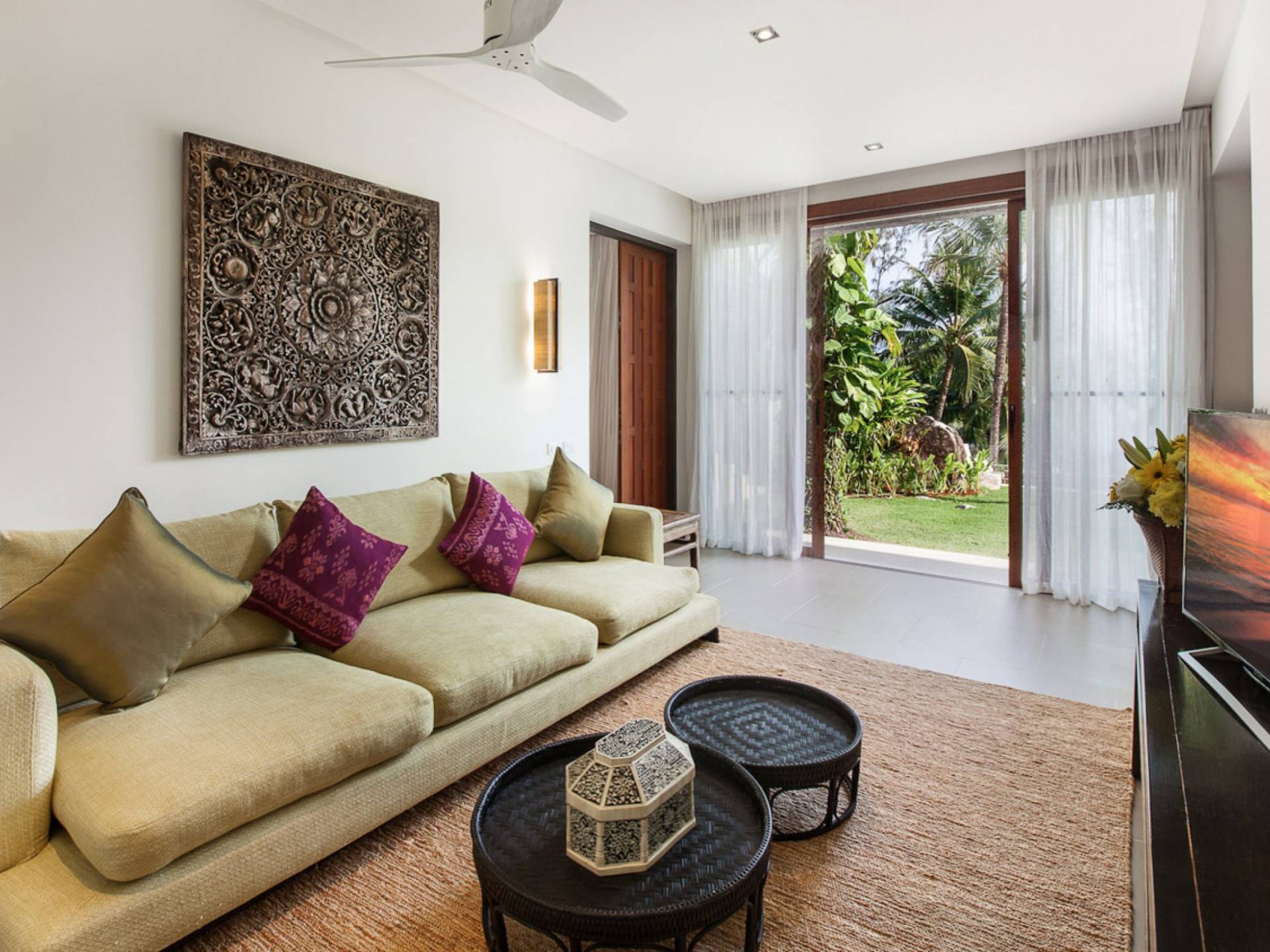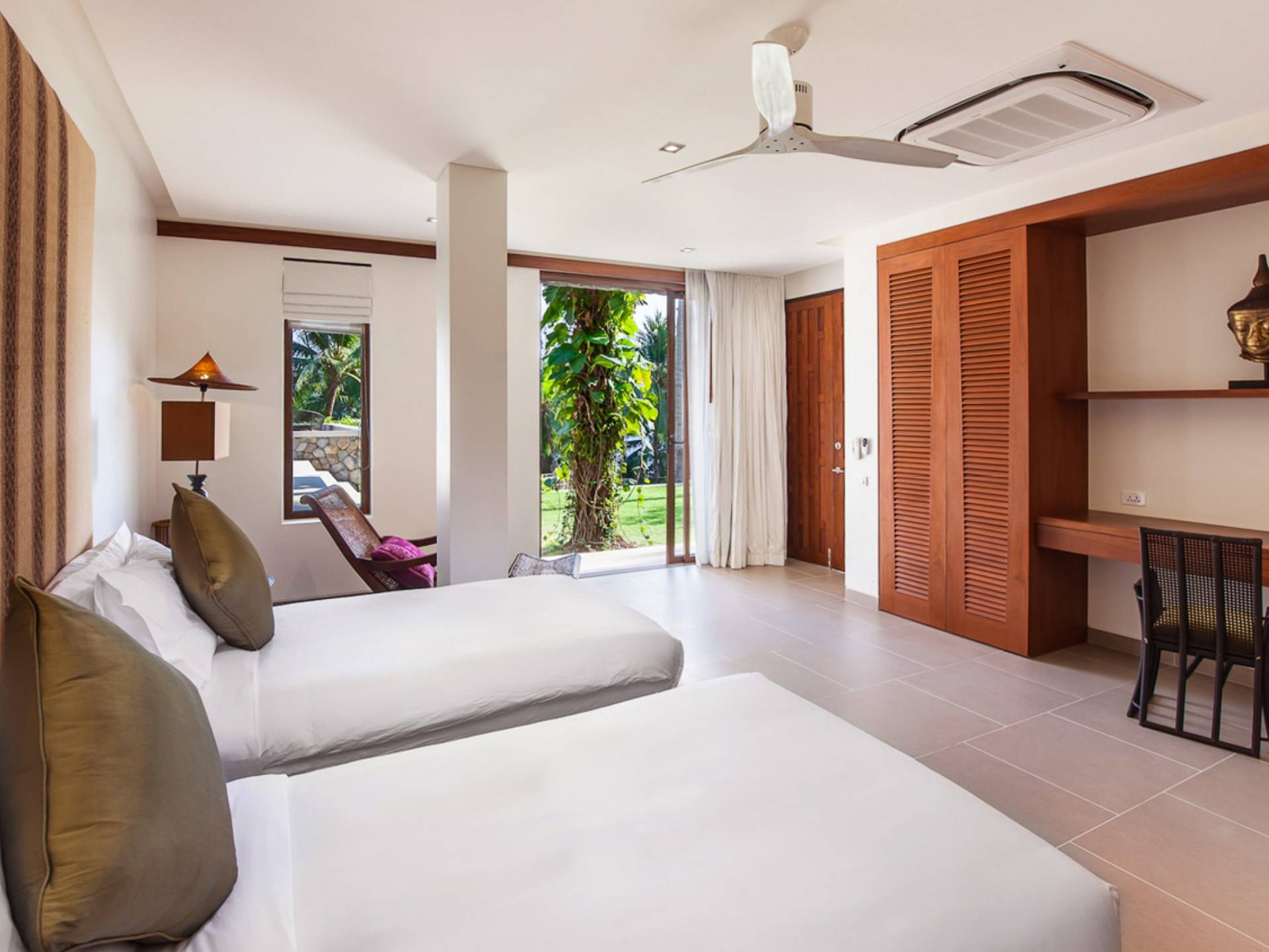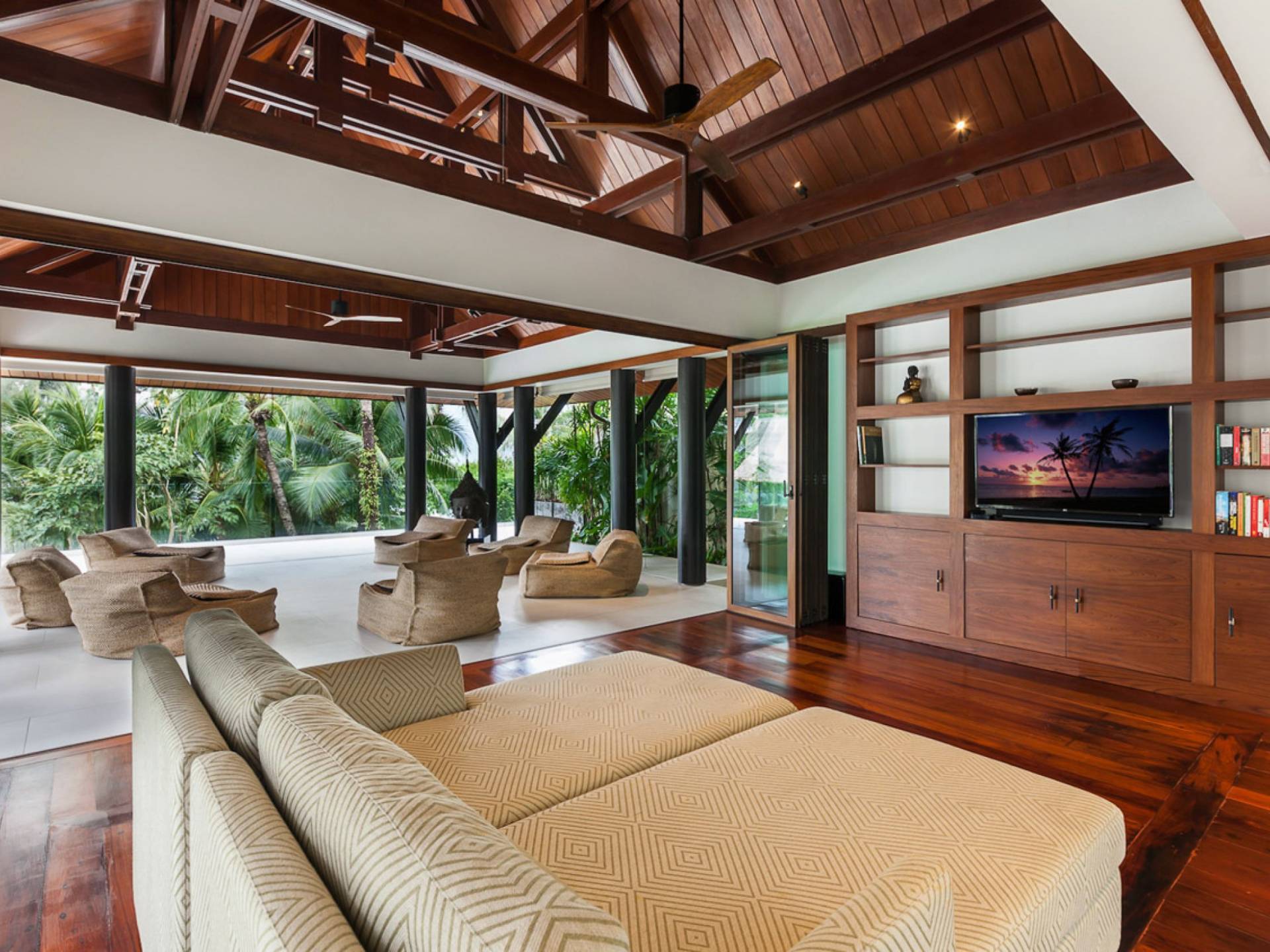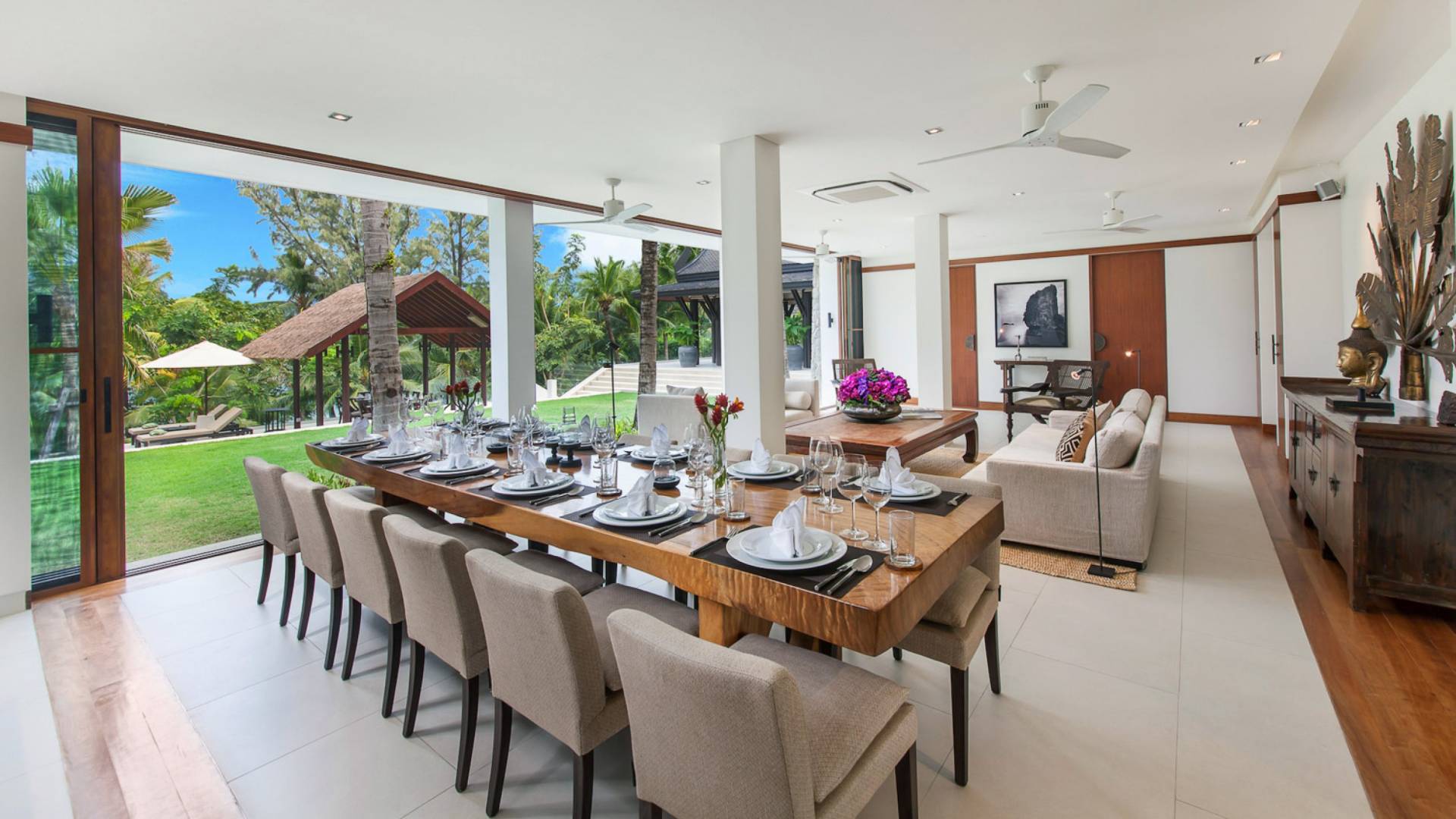 Analaya villa’s highlight is definitely its beautiful zero-edge infinity pool. Facing the Andaman Sea and embraced by palm trees and other tropical trees, swimming at the pool will make you feel like you’re smack in the middle of nature. Around the pool are plenty of sun loungers, a comfortable outdoor sala, as well as an alfresco dining area. Manicured, tropical gardens surround the pool area, where a large trampoline is placed for both kids and adults to have fun with.