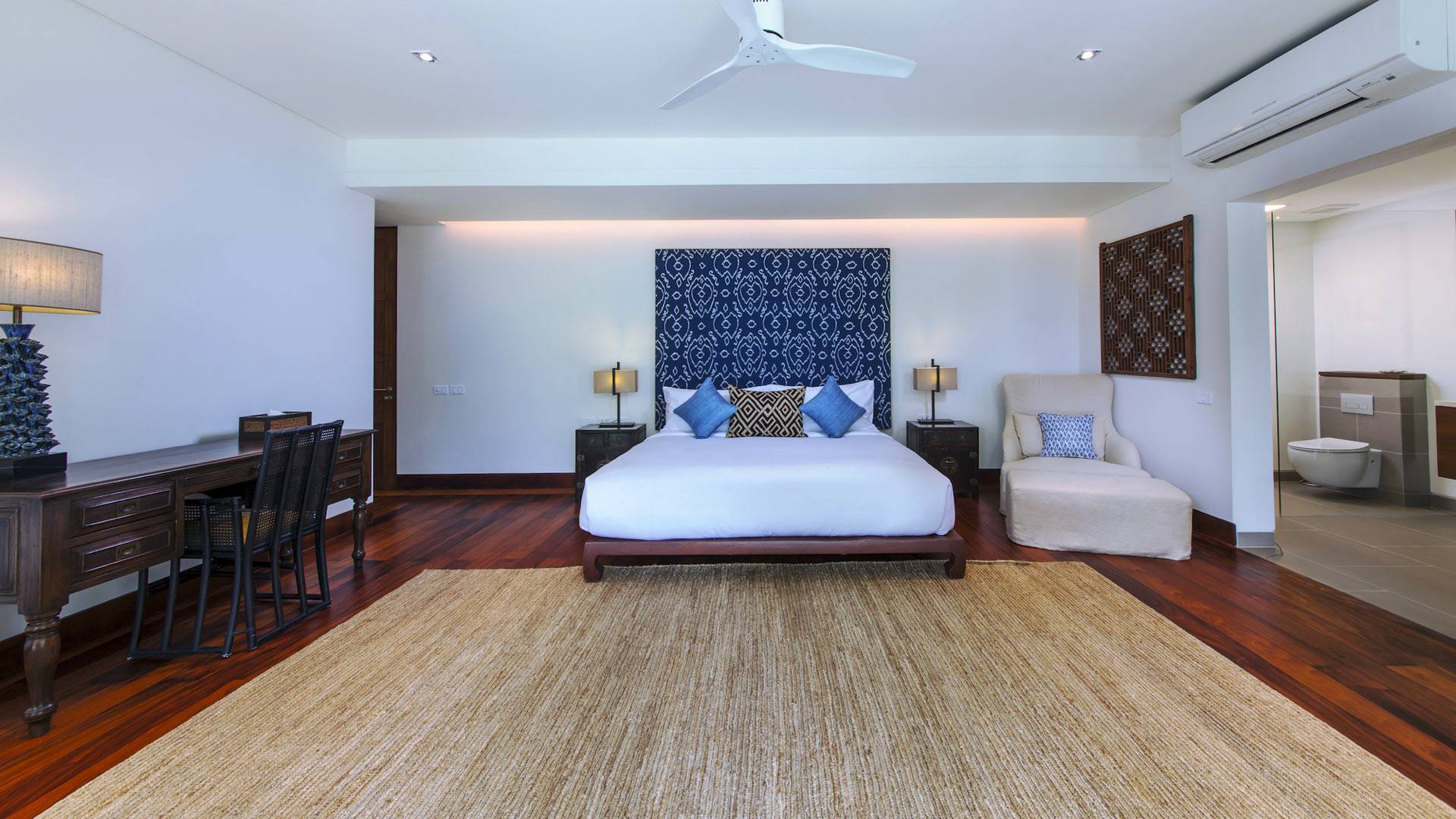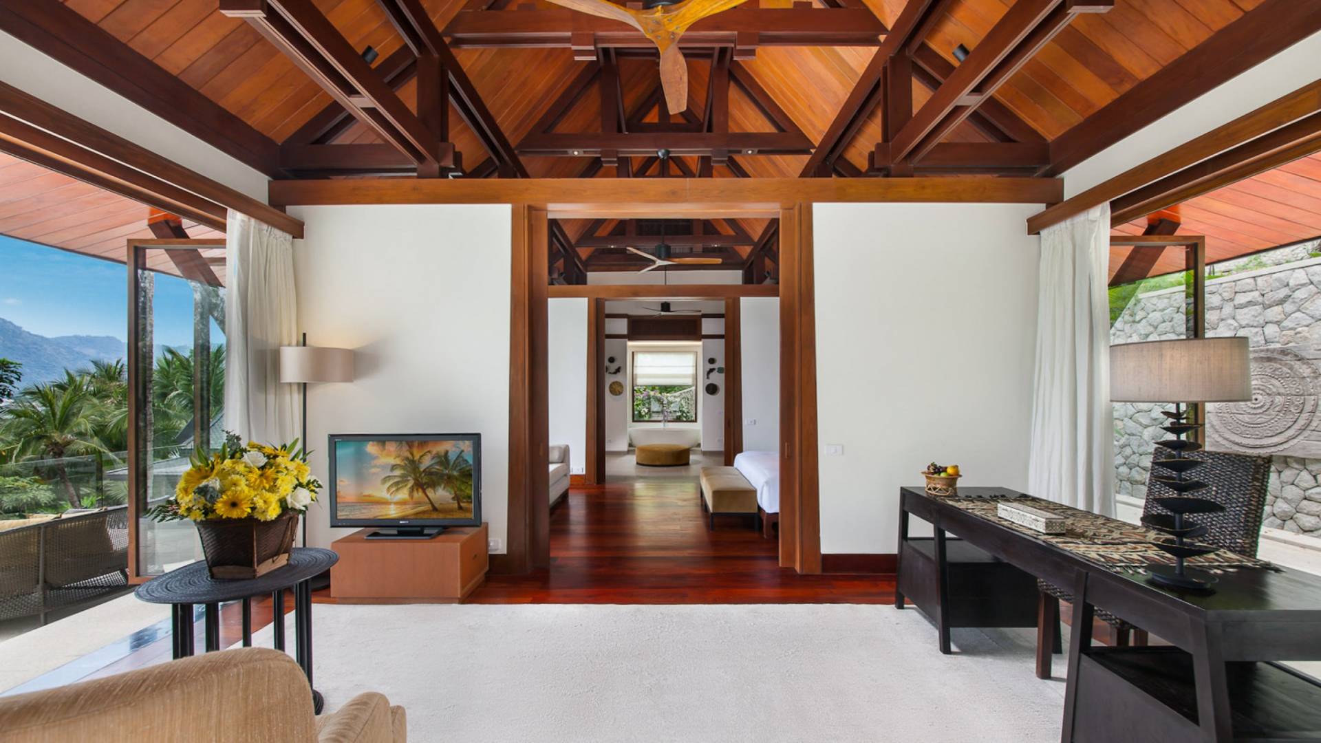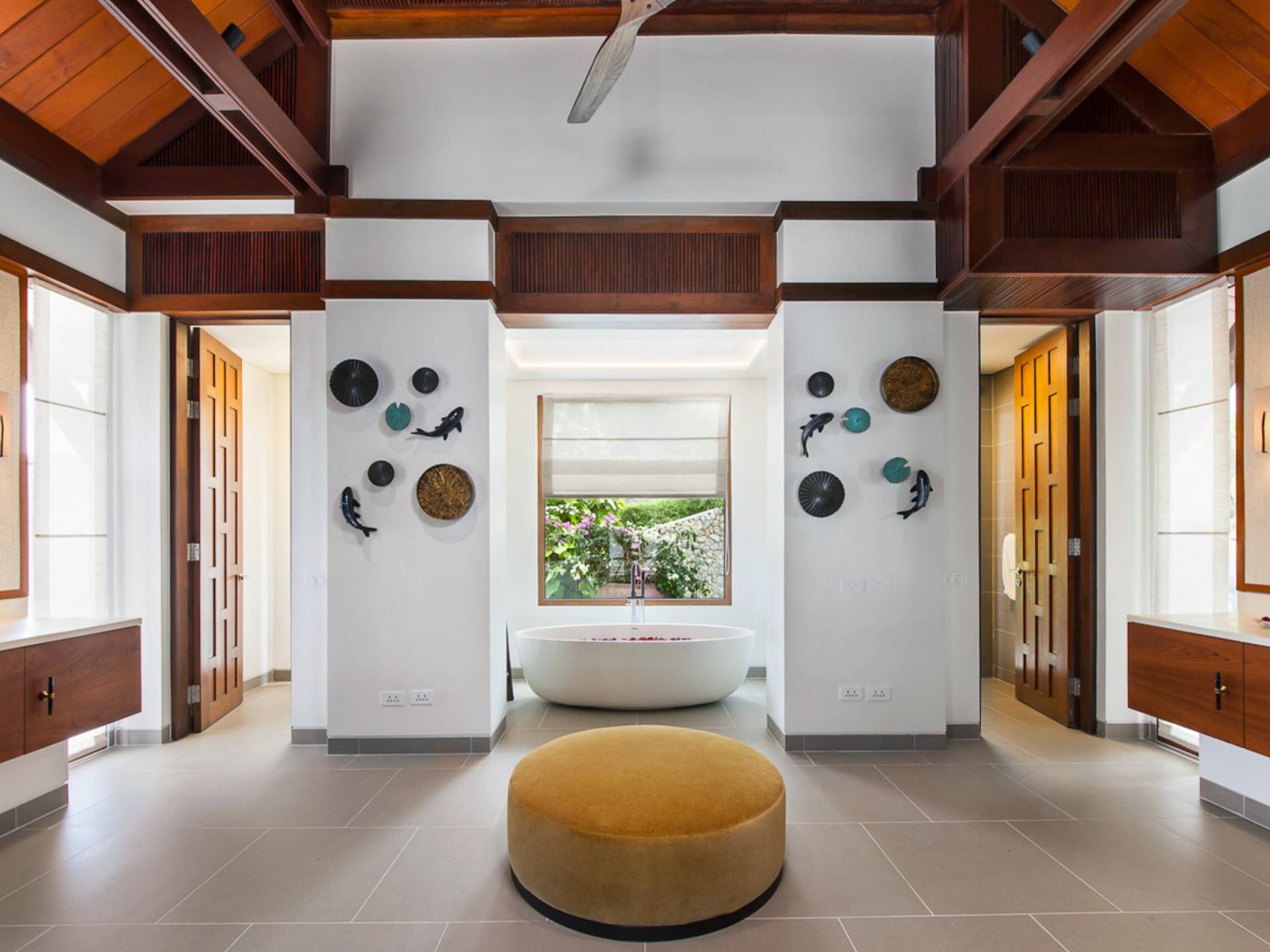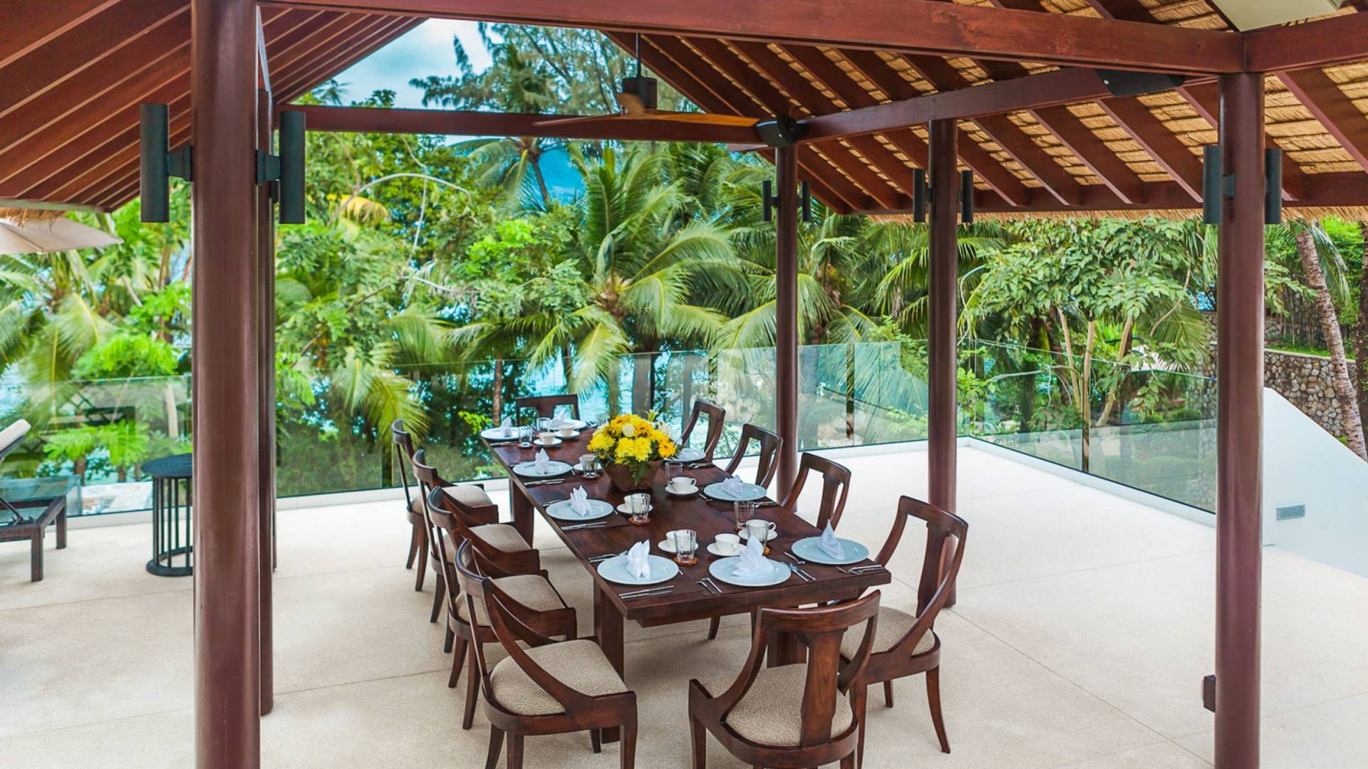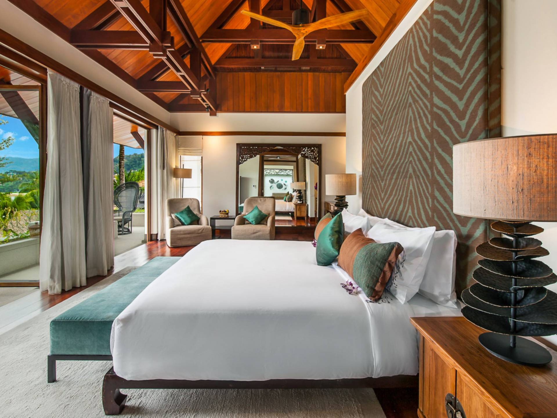 Villa Analaya Phuket is perched on a headland, with 5 individual pavilions housing the property’s massive 6 bedrooms, all equipped with immaculate furnishings, ensuite bathrooms with bathtubs, and large glass doors and windows that frame breathtaking ocean views. Facing the Andaman Sea, you’ve got endless views of the blue sky and crystal, blue waters of the famous Phuket coast. The villa pays homage to traditional Thai architectural details with a dominant contemporary aesthetic. Large, open spaces welcome bright natural light, and the use of floor-to-ceiling glass sliding doors on the living areas and bedrooms allow guests to have an open-air experience welcoming the cool breeze that the lush forest that surrounds brings.