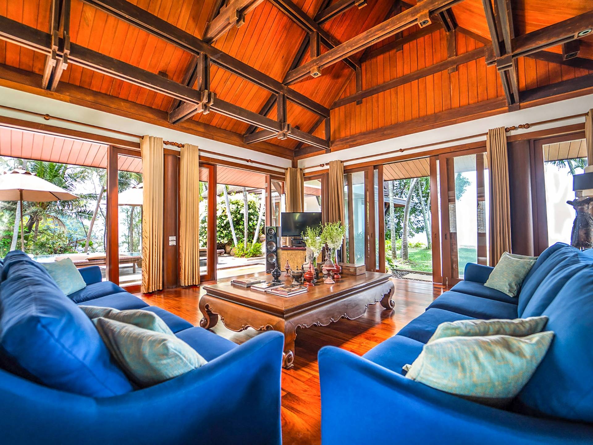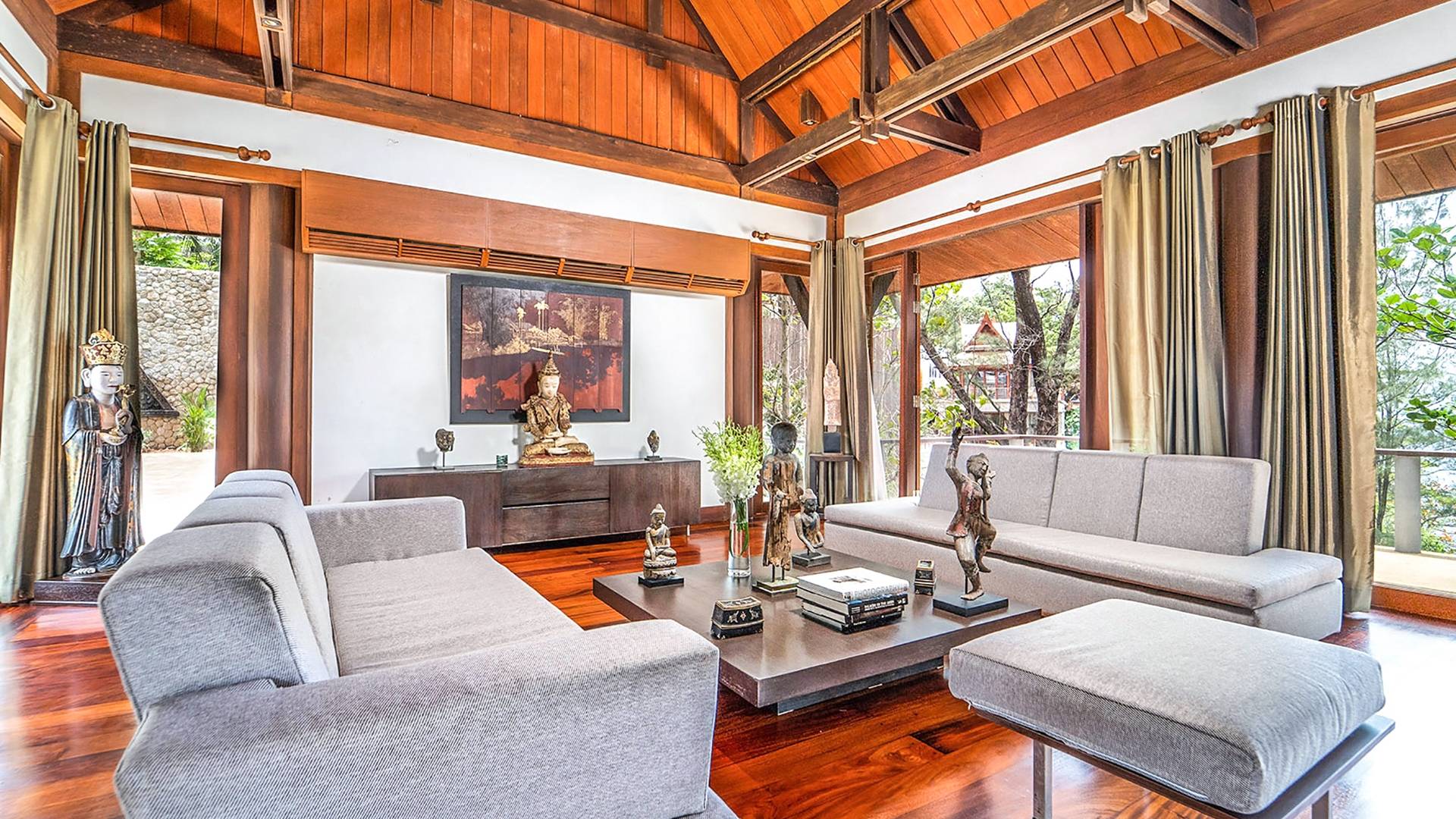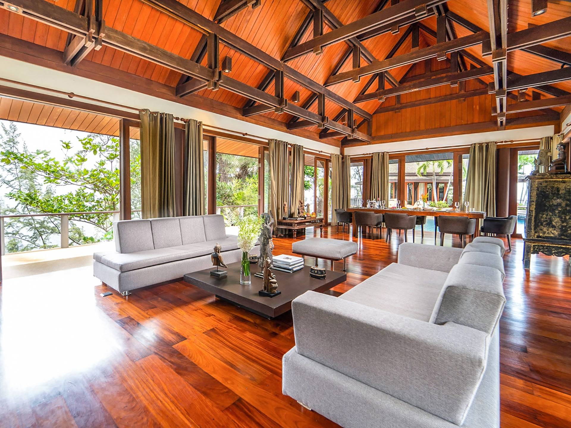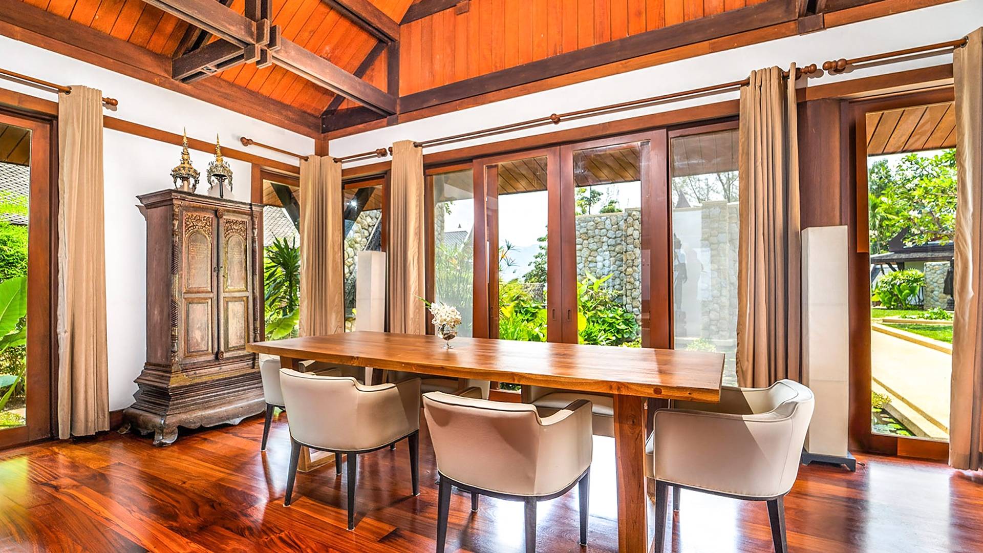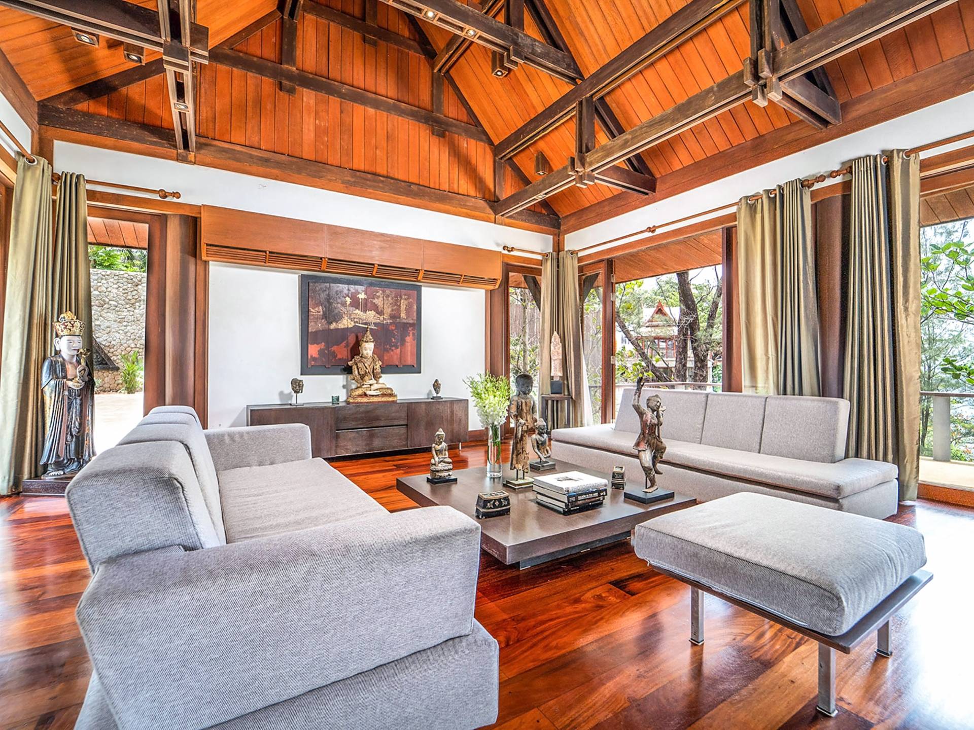 The villa follows a classic Thai design with four stand-alone pavilions, a mix of open-plan living spaces, and private bedrooms, each one embracing the sea views. Brimming with character, it features pitched-roofs, floor-to-ceiling windows, and polished hardwood floors, making it a spectacular paradise retreat. The villa is decorated throughout with a unique collection of beautiful antique furniture, Asian art and artifacts, and intricate wood carvings.