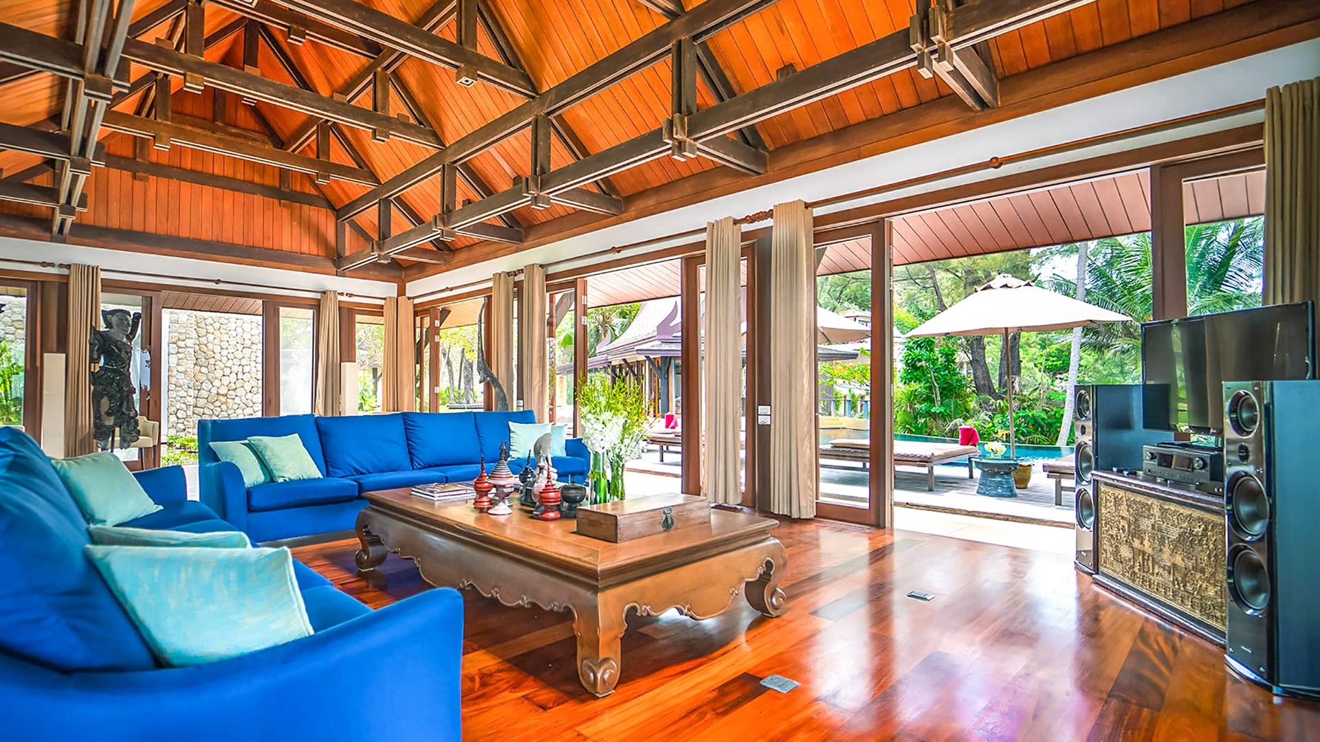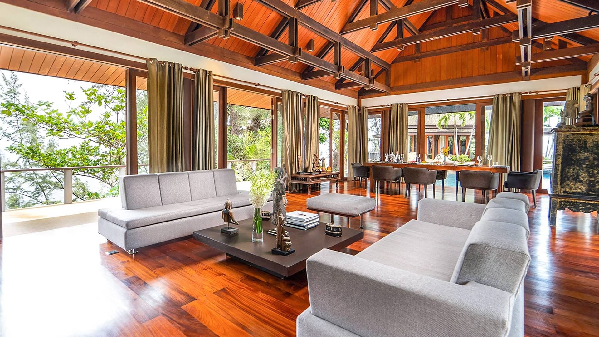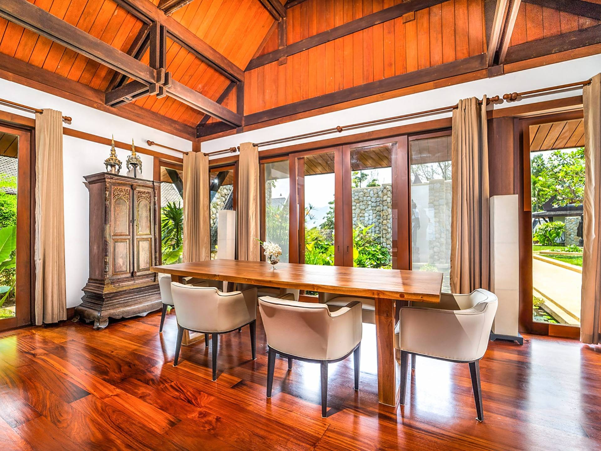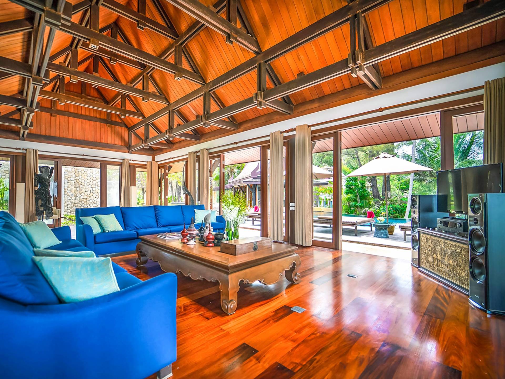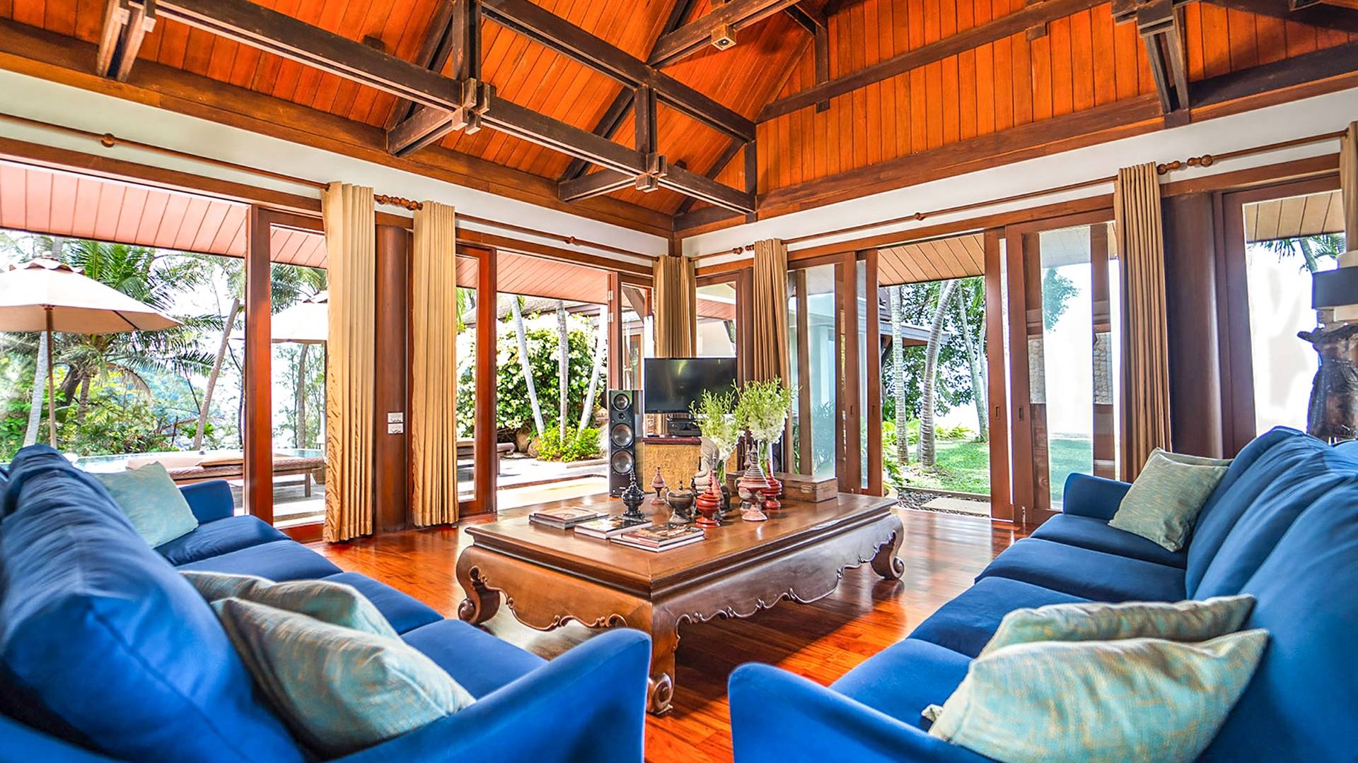 The villa follows a classic Thai design with four stand-alone pavilions, a mix of open-plan living spaces, and private bedrooms, each one embracing the sea views. Brimming with character, it features pitched-roofs, floor-to-ceiling windows, and polished hardwood floors, making it a spectacular paradise retreat. The villa is decorated throughout with a unique collection of beautiful antique furniture, Asian art and artifacts, and intricate wood carvings.