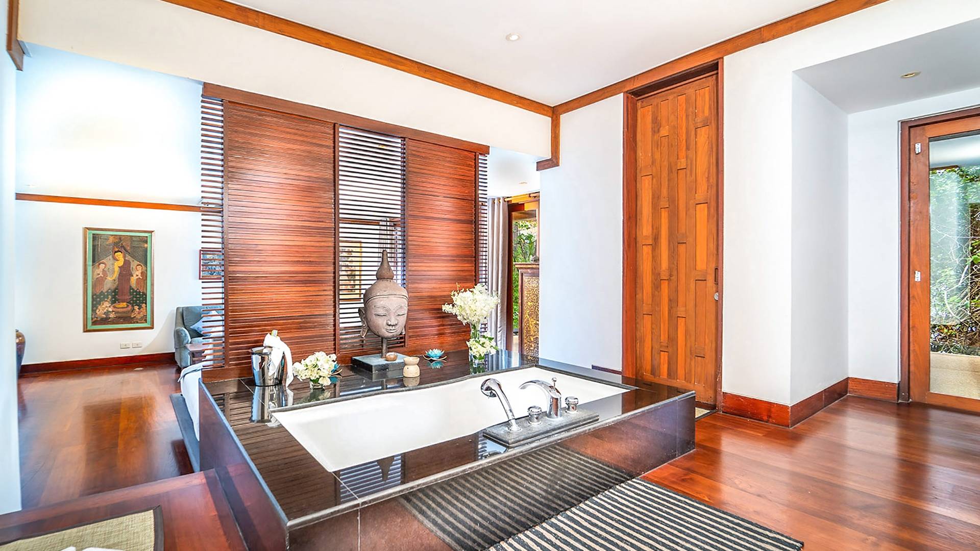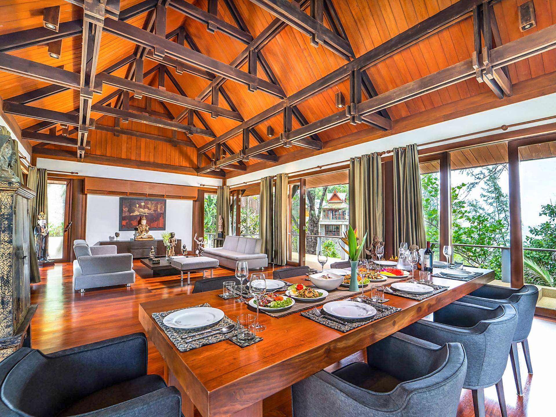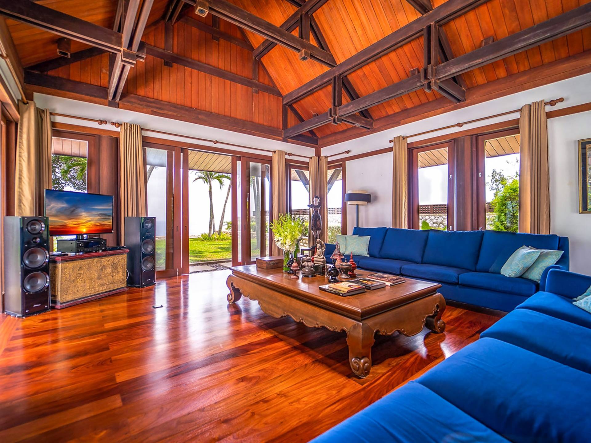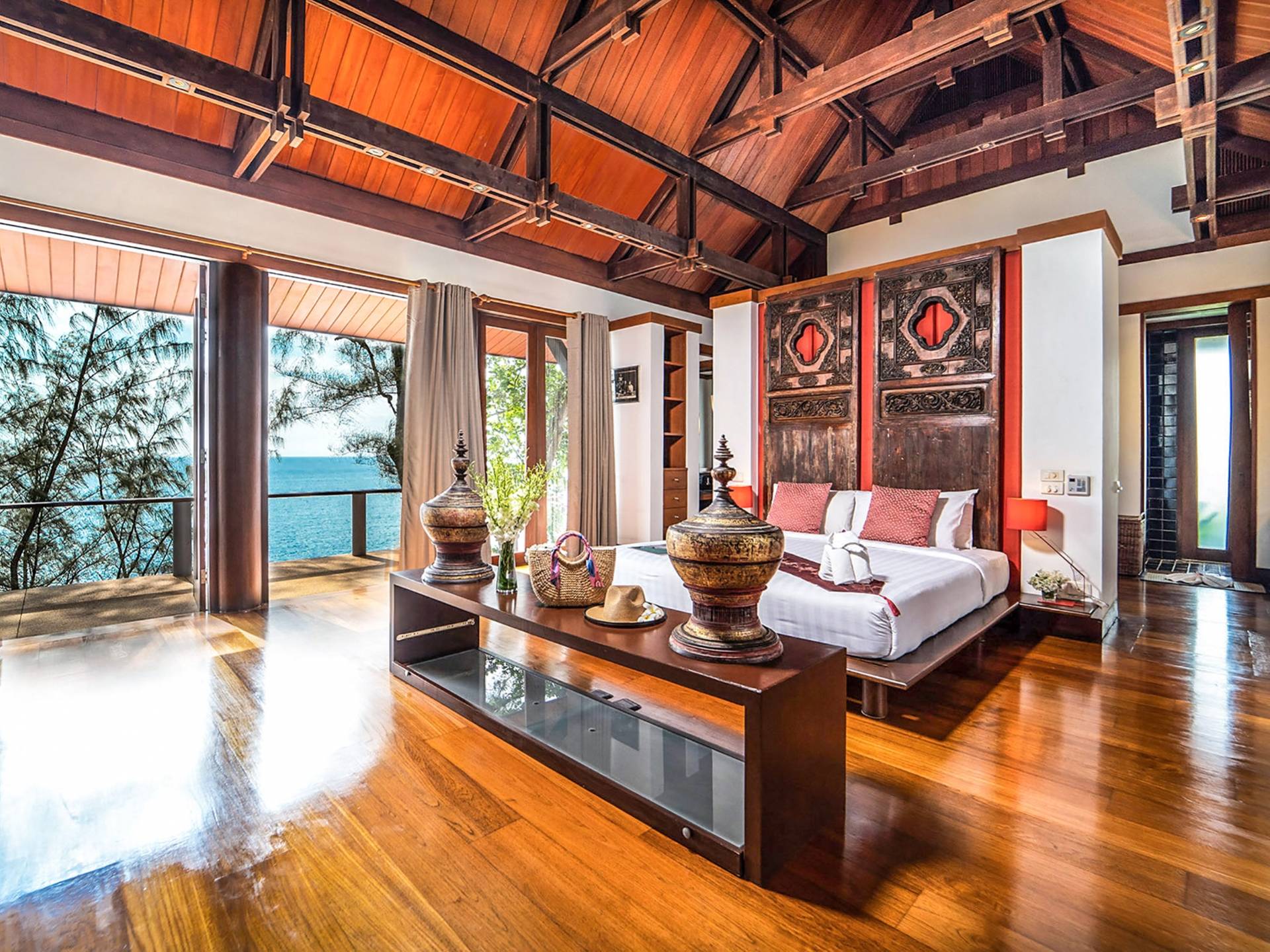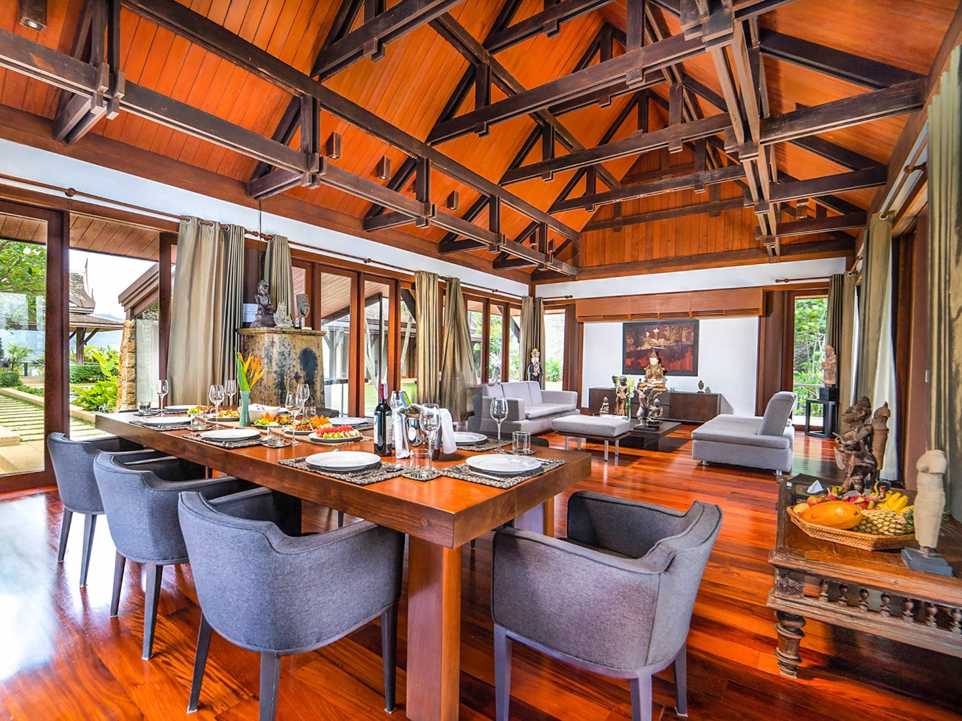 The villa follows a classic Thai design with four stand-alone pavilions, a mix of open-plan living spaces, and private bedrooms, each one embracing the sea views. Brimming with character, it features pitched-roofs, floor-to-ceiling windows, and polished hardwood floors, making it a spectacular paradise retreat. The villa is decorated throughout with a unique collection of beautiful antique furniture, Asian art and artifacts, and intricate wood carvings.
