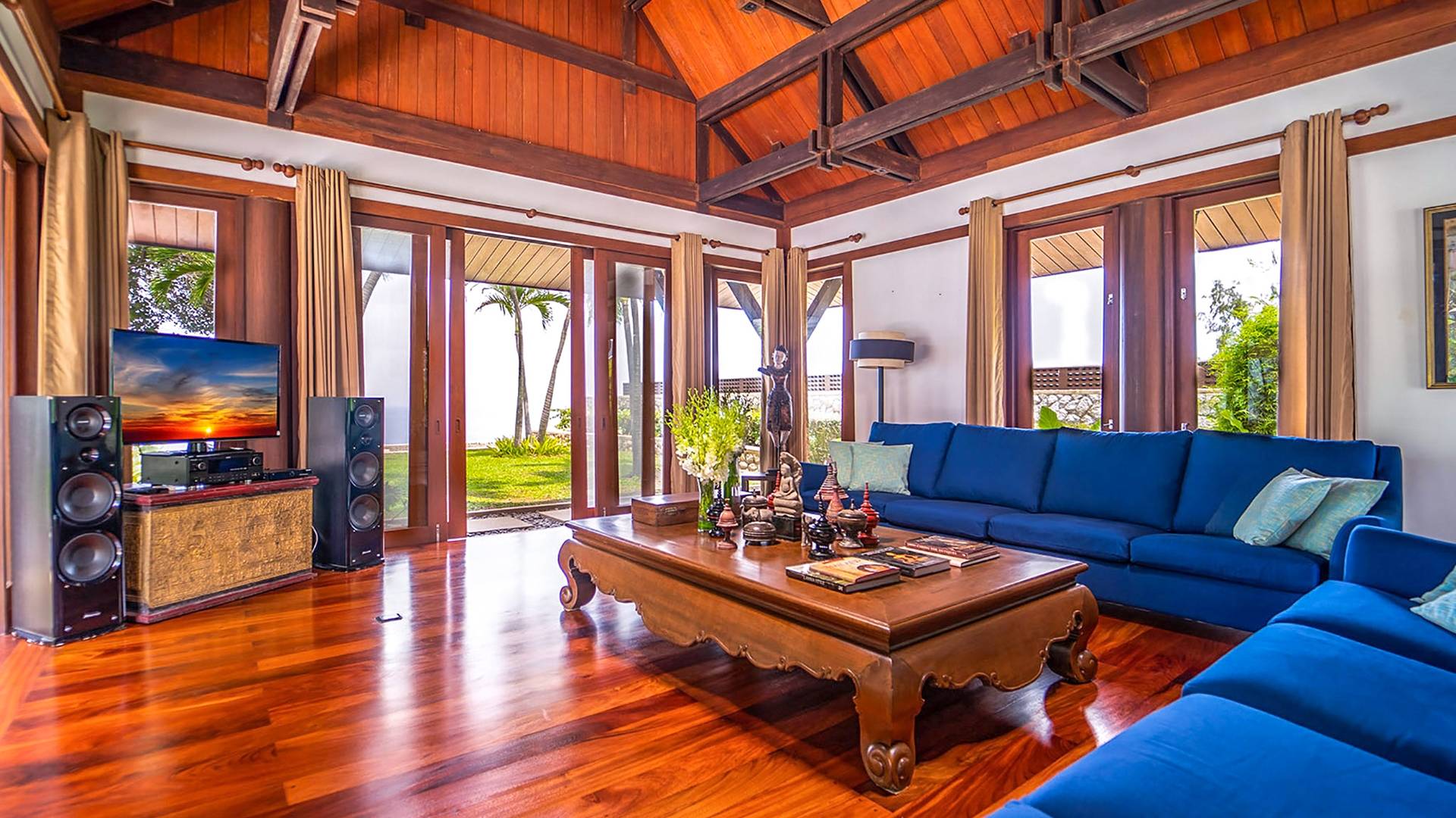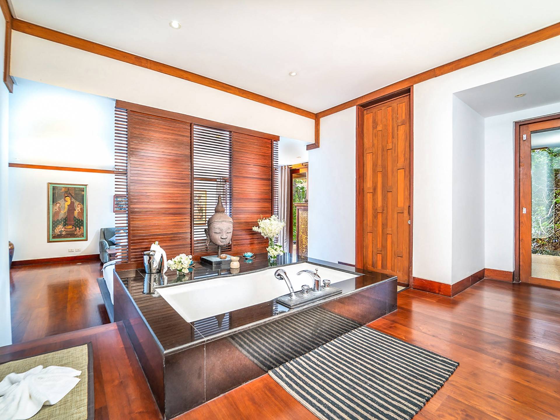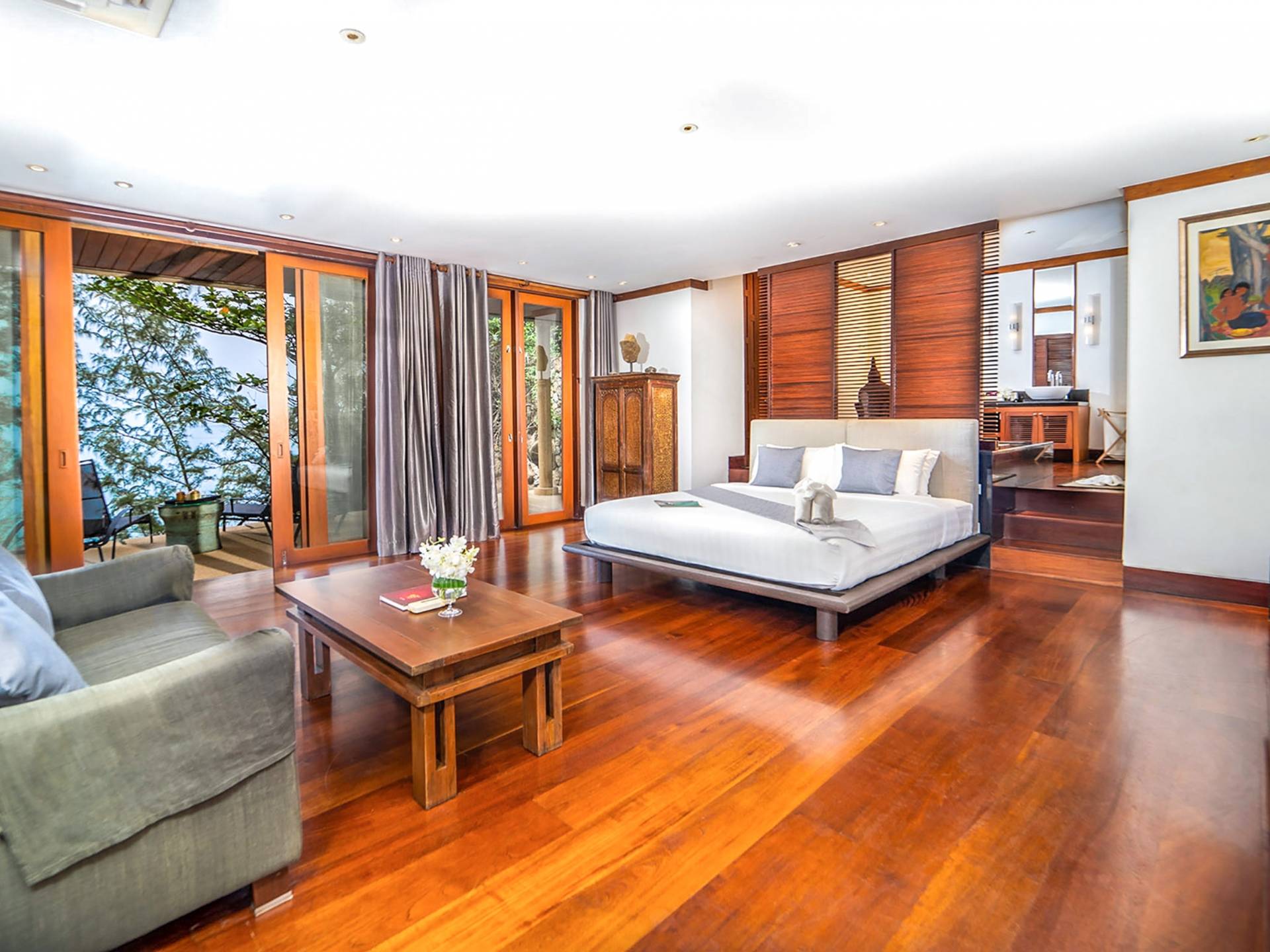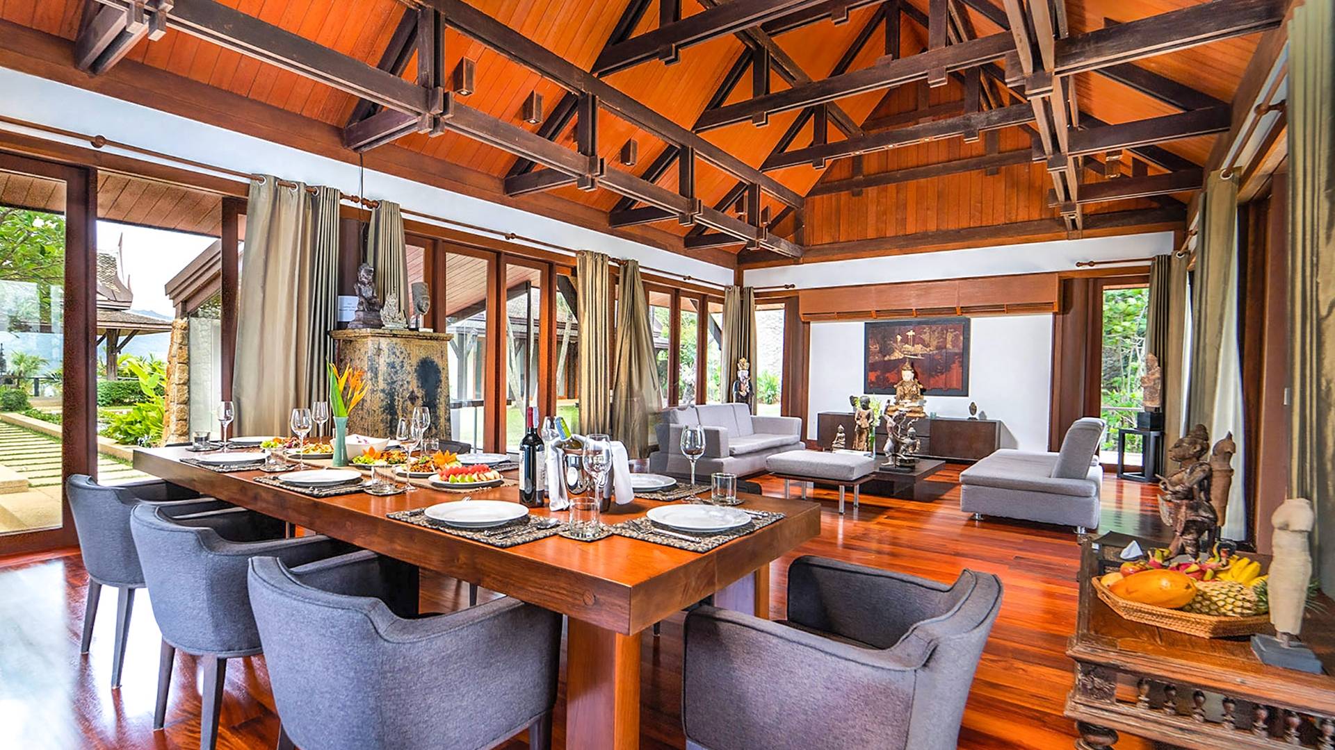 The villa follows a classic Thai design with four stand-alone pavilions, a mix of open-plan living spaces, and private bedrooms, each one embracing the sea views. Brimming with character, it features pitched-roofs, floor-to-ceiling windows, and polished hardwood floors, making it a spectacular paradise retreat. The villa is decorated throughout with a unique collection of beautiful antique furniture, Asian art and artifacts, and intricate wood carvings.