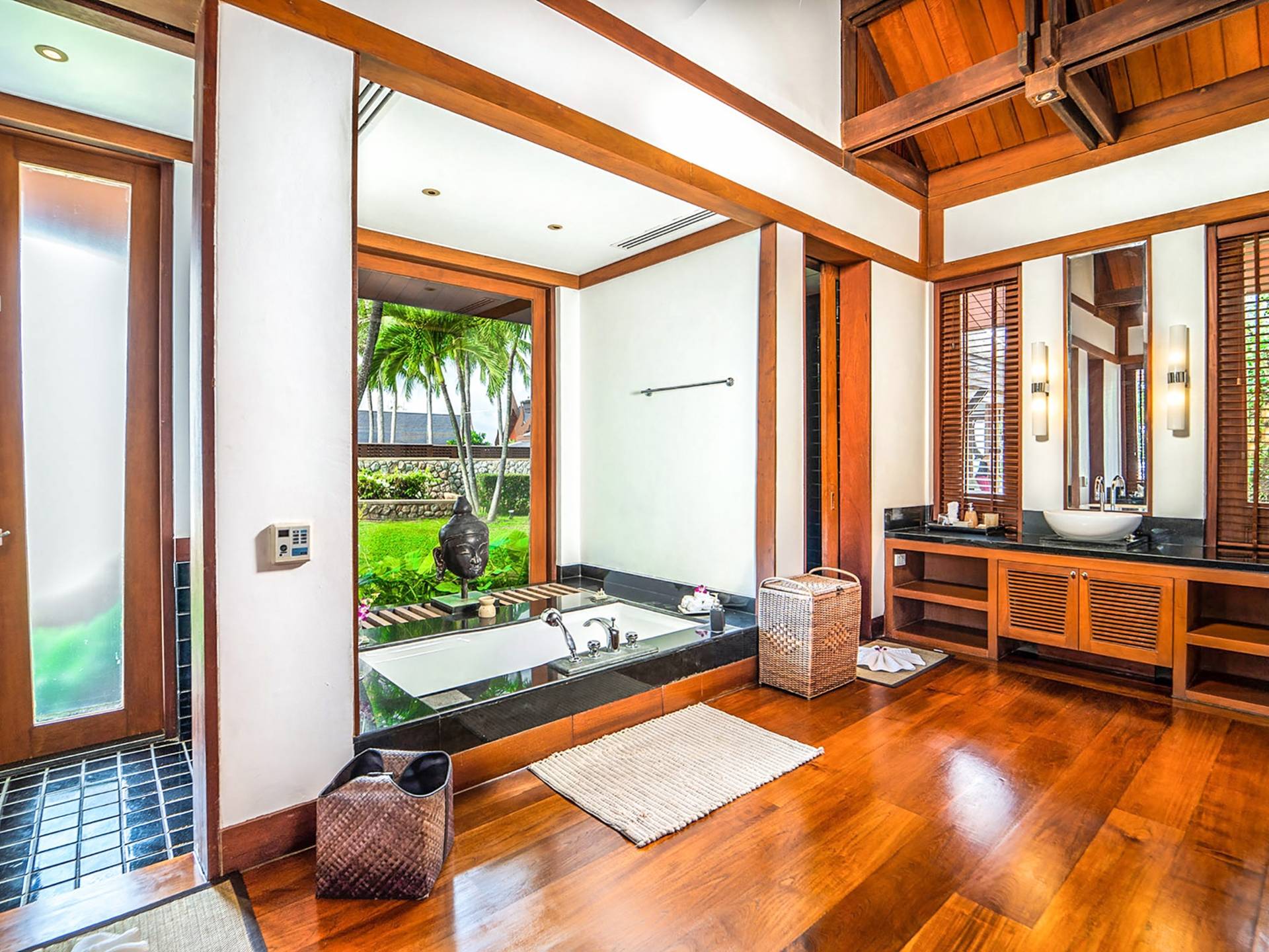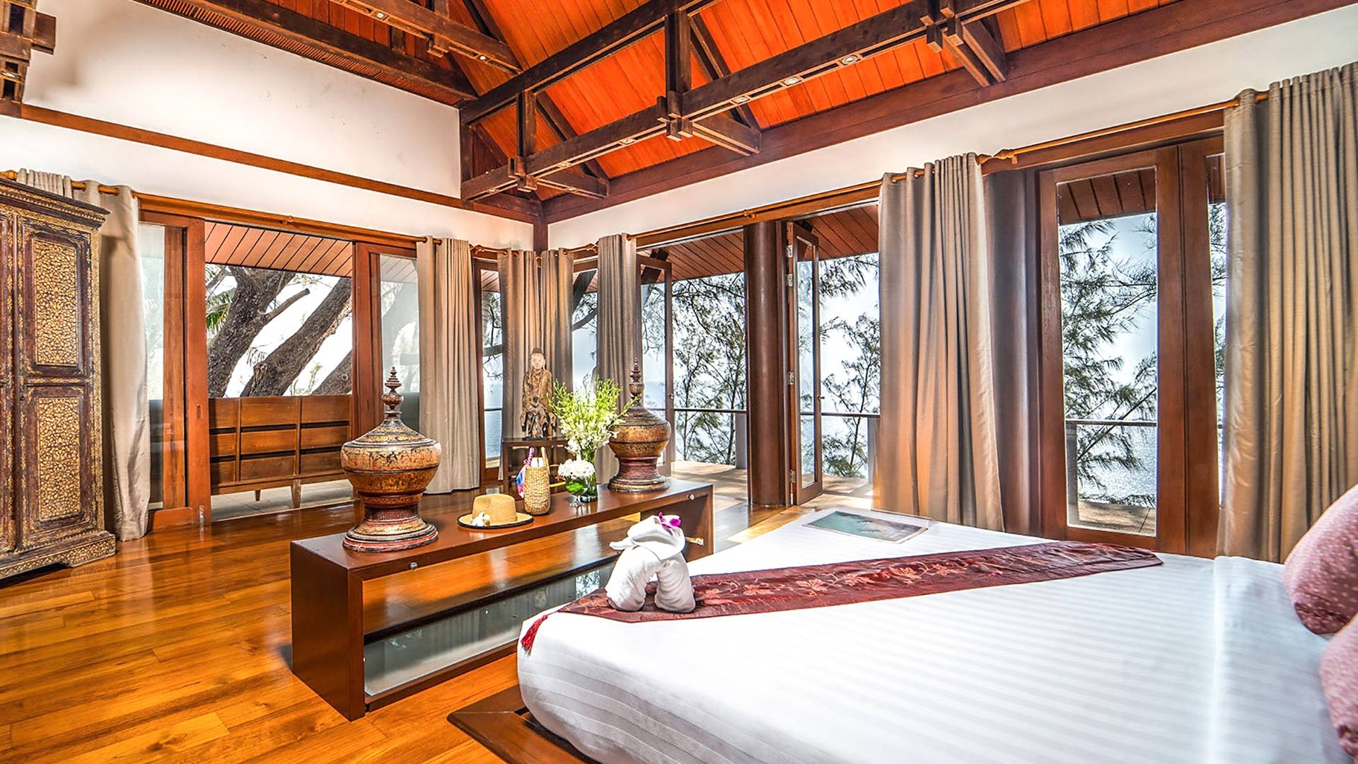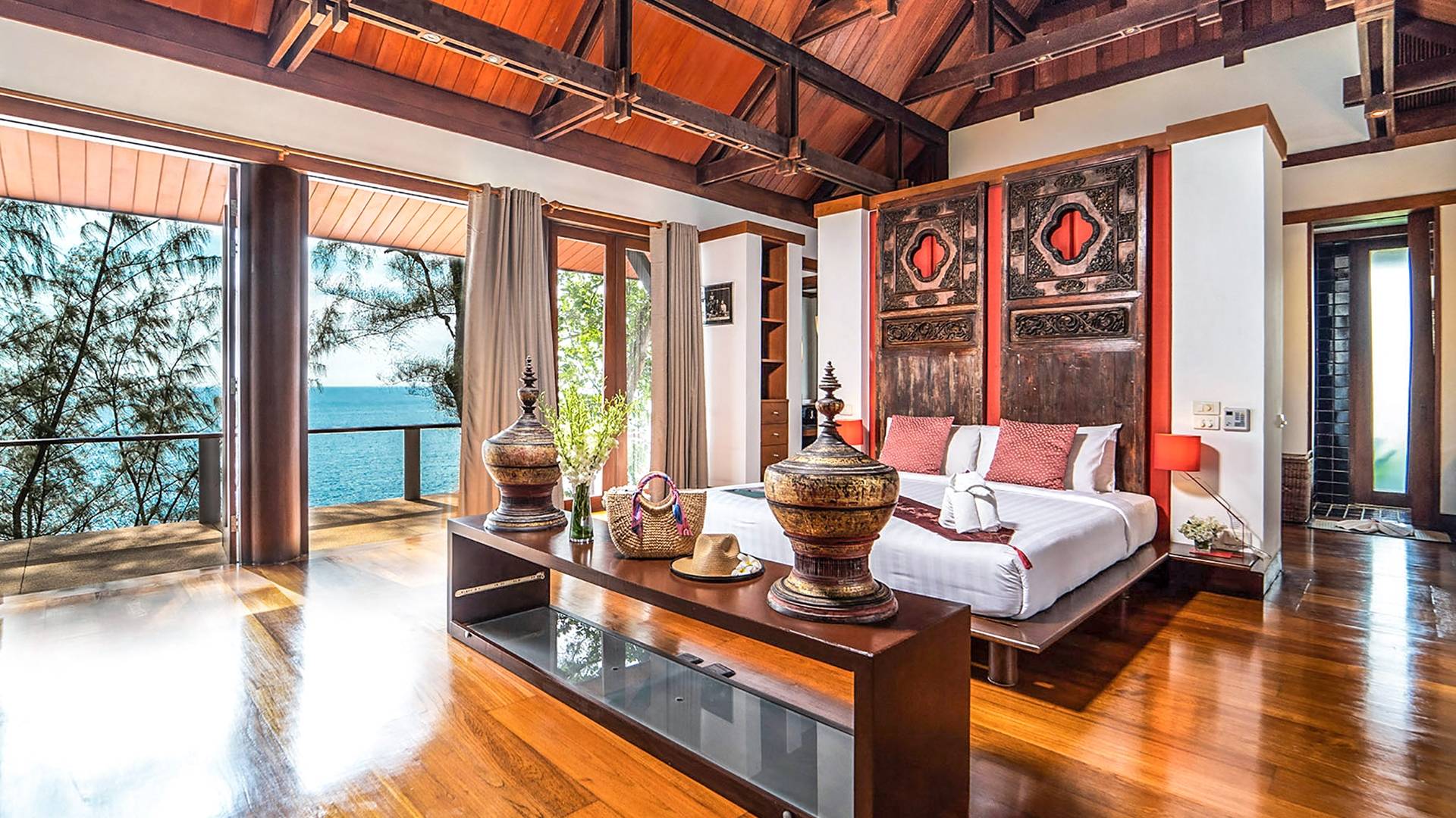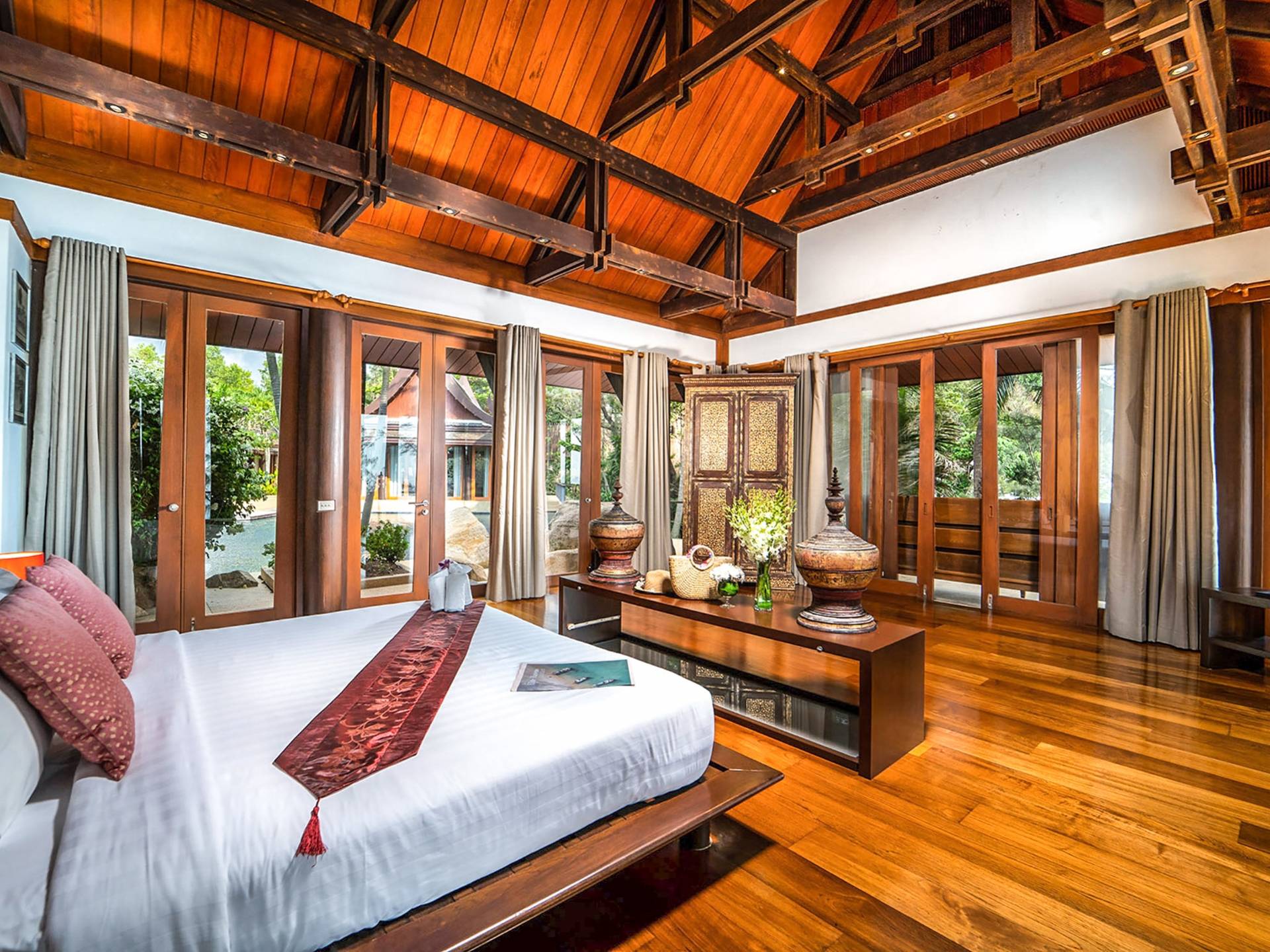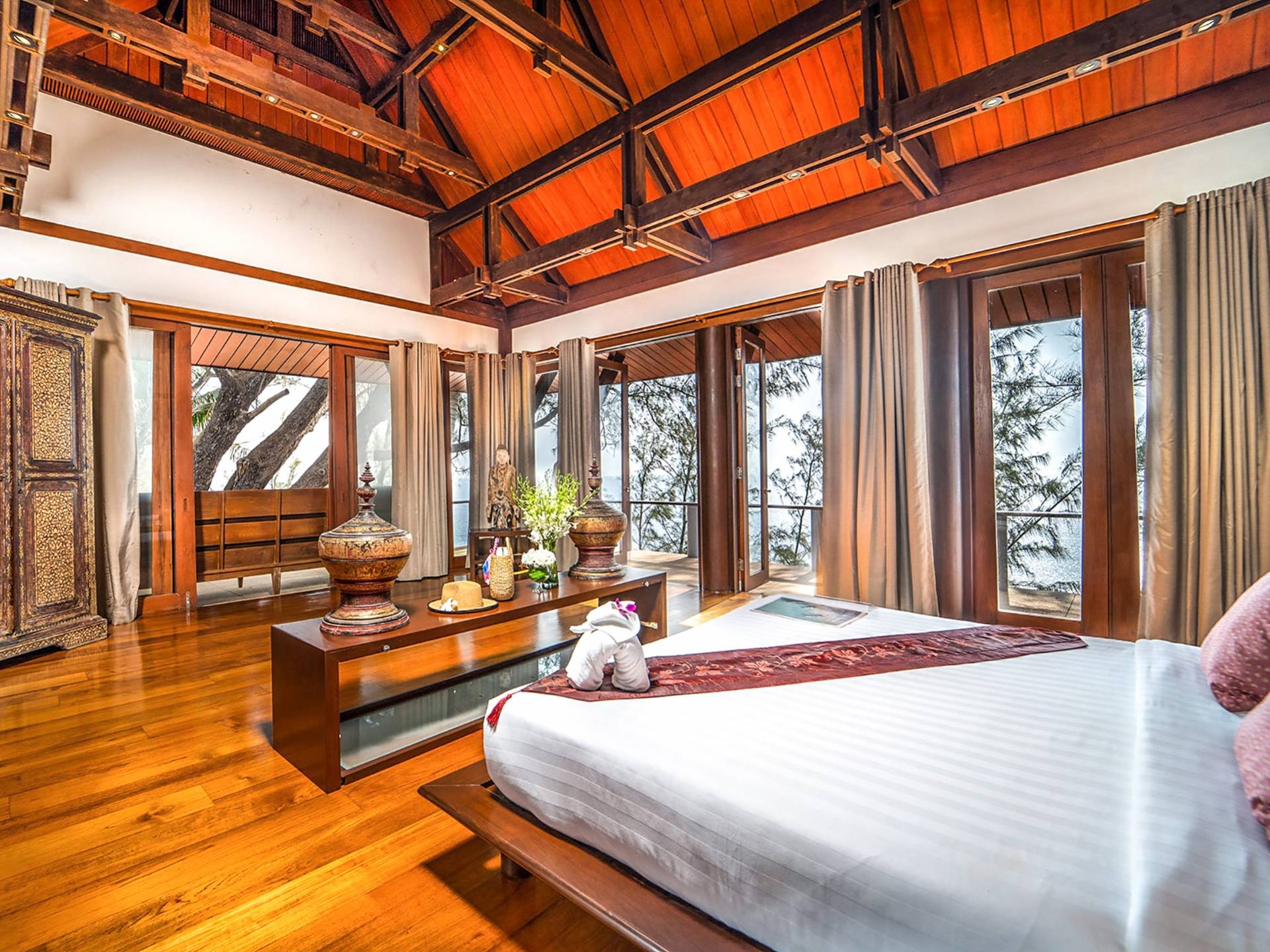 The villa follows a classic Thai design with four stand-alone pavilions, a mix of open-plan living spaces, and private bedrooms, each one embracing the sea views. Brimming with character, it features pitched-roofs, floor-to-ceiling windows, and polished hardwood floors, making it a spectacular paradise retreat. The villa is decorated throughout with a unique collection of beautiful antique furniture, Asian art and artifacts, and intricate wood carvings.
