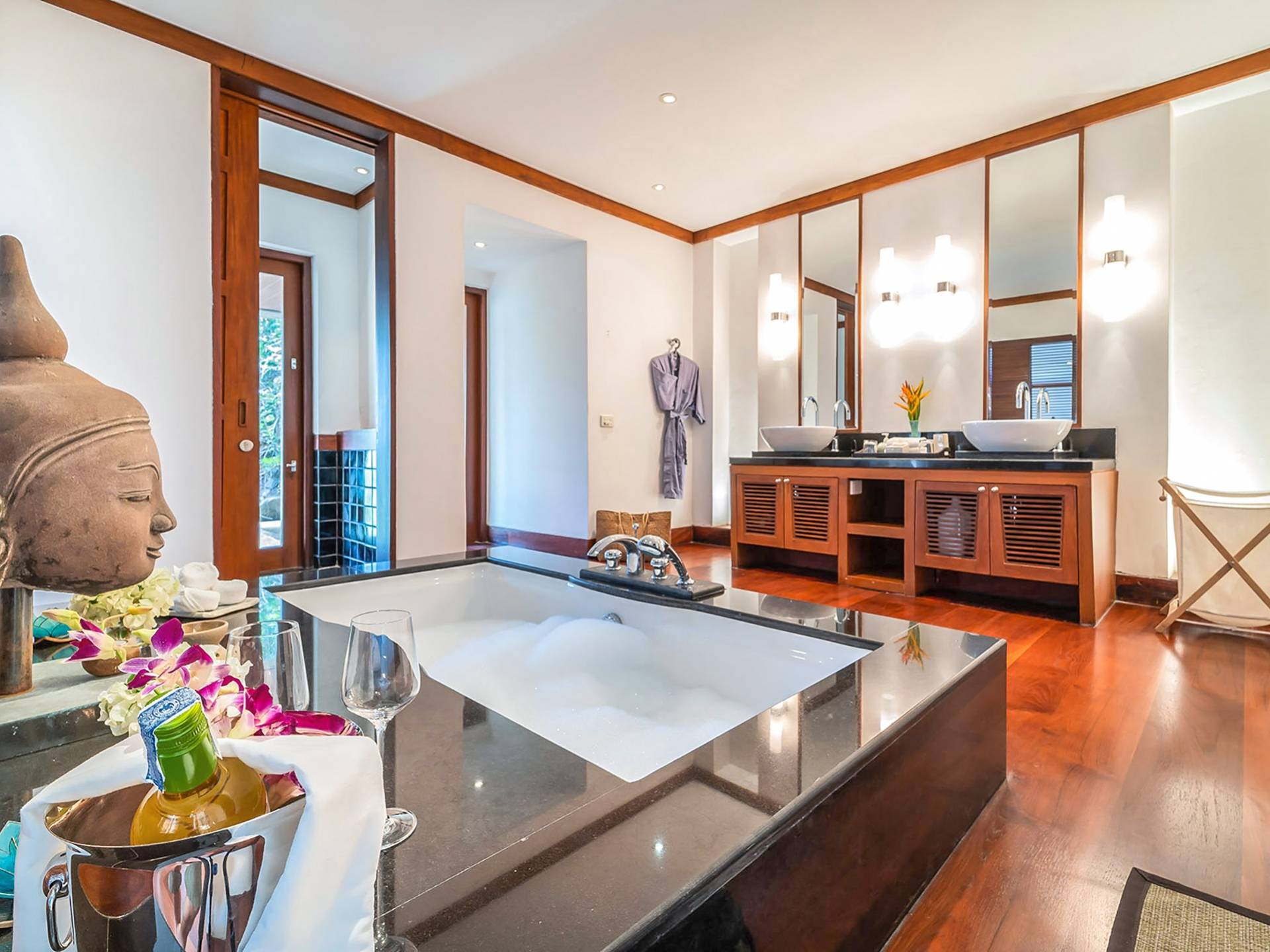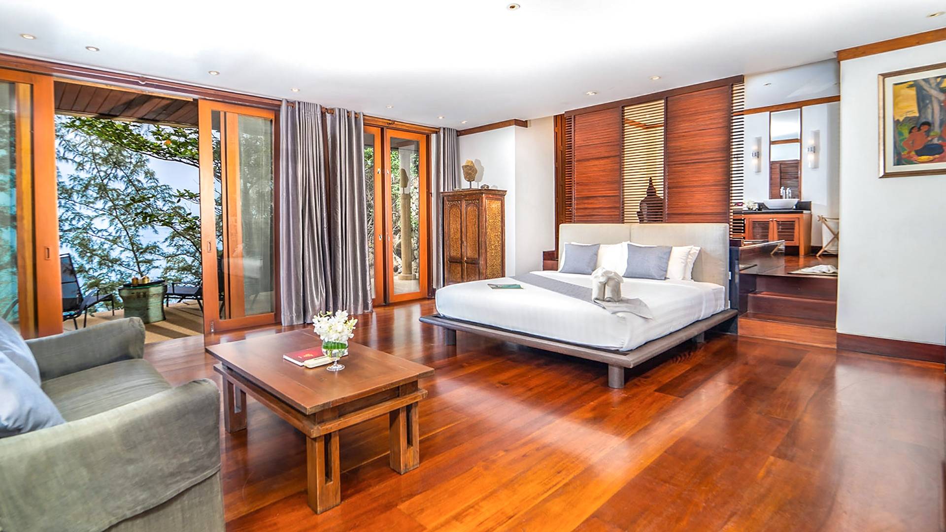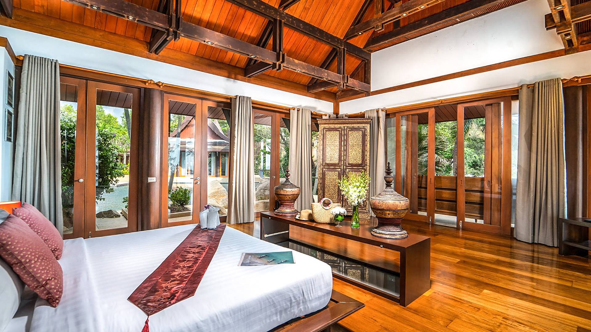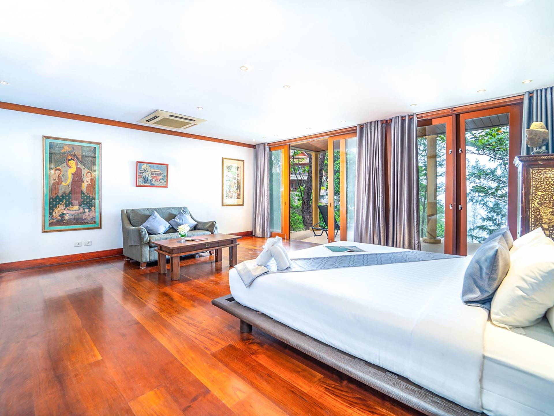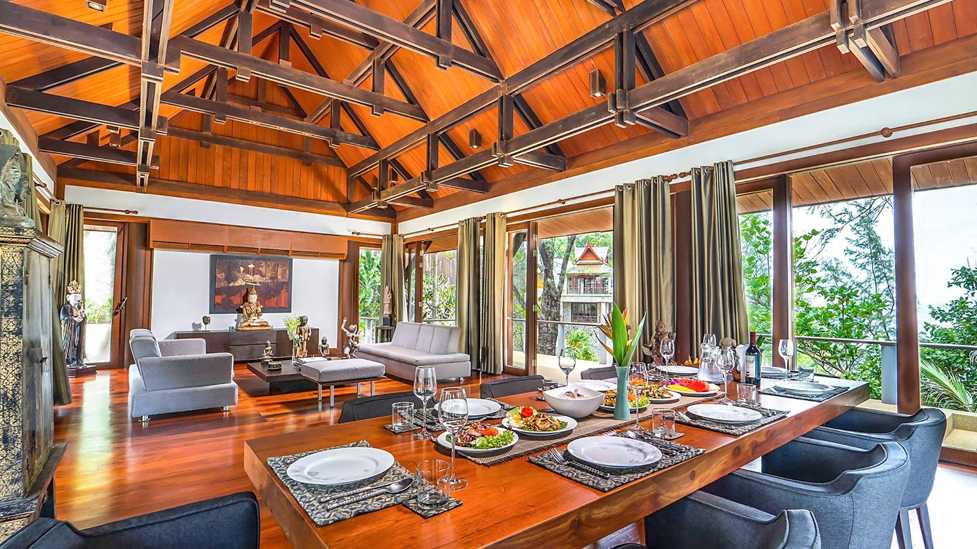 The villa follows a classic Thai design with four stand-alone pavilions, a mix of open-plan living spaces, and private bedrooms, each one embracing the sea views. Brimming with character, it features pitched-roofs, floor-to-ceiling windows, and polished hardwood floors, making it a spectacular paradise retreat. The villa is decorated throughout with a unique collection of beautiful antique furniture, Asian art and artifacts, and intricate wood carvings.