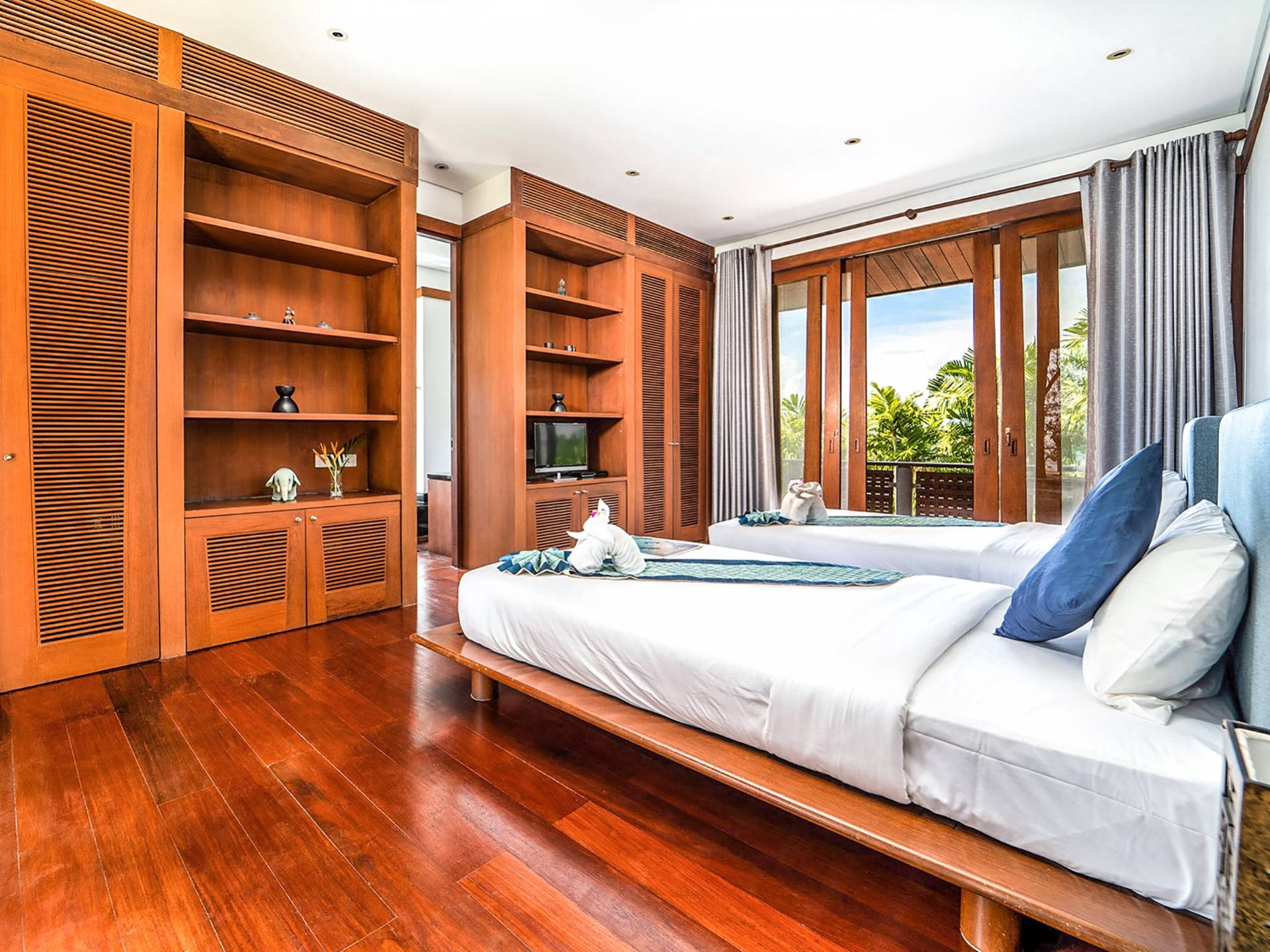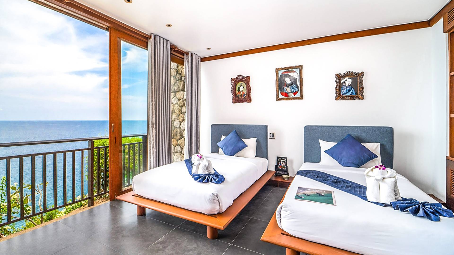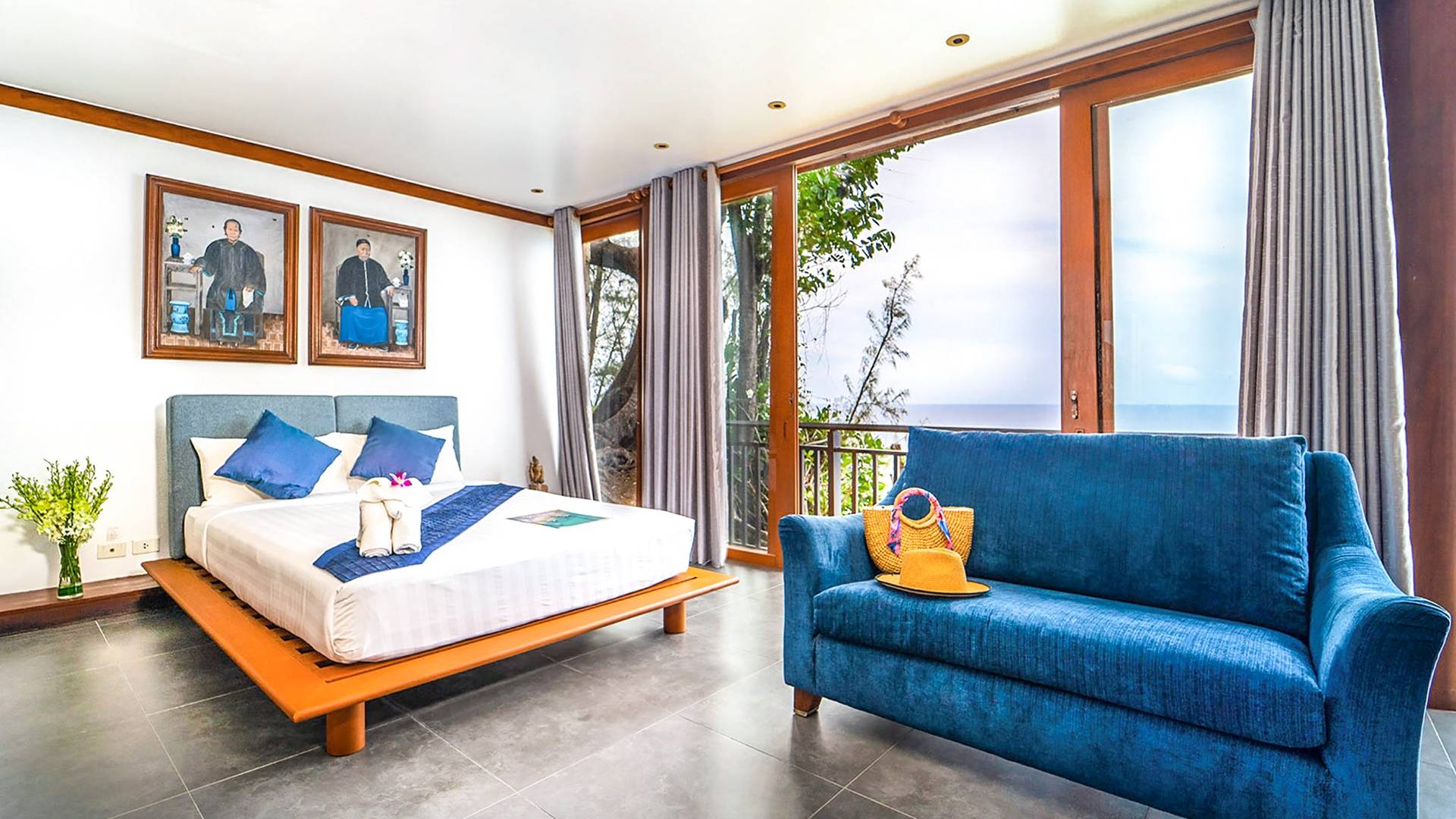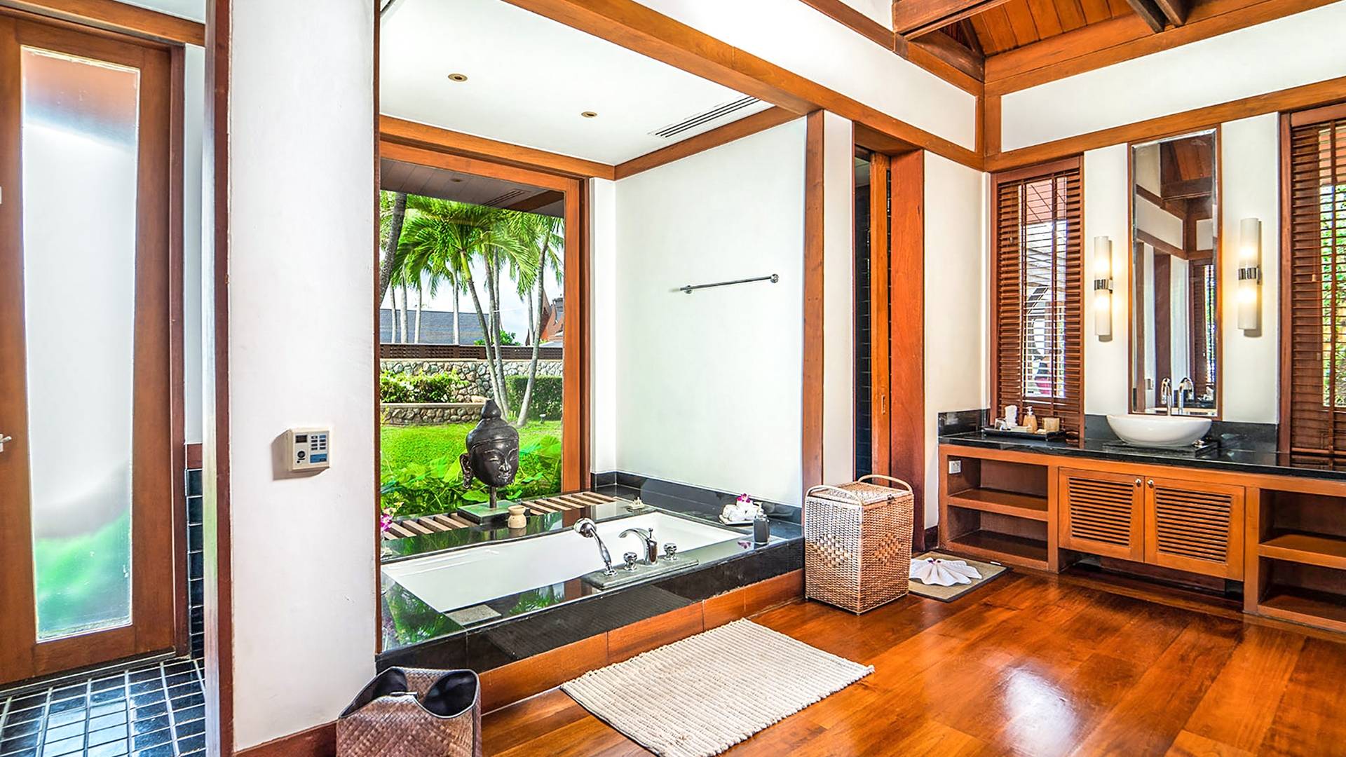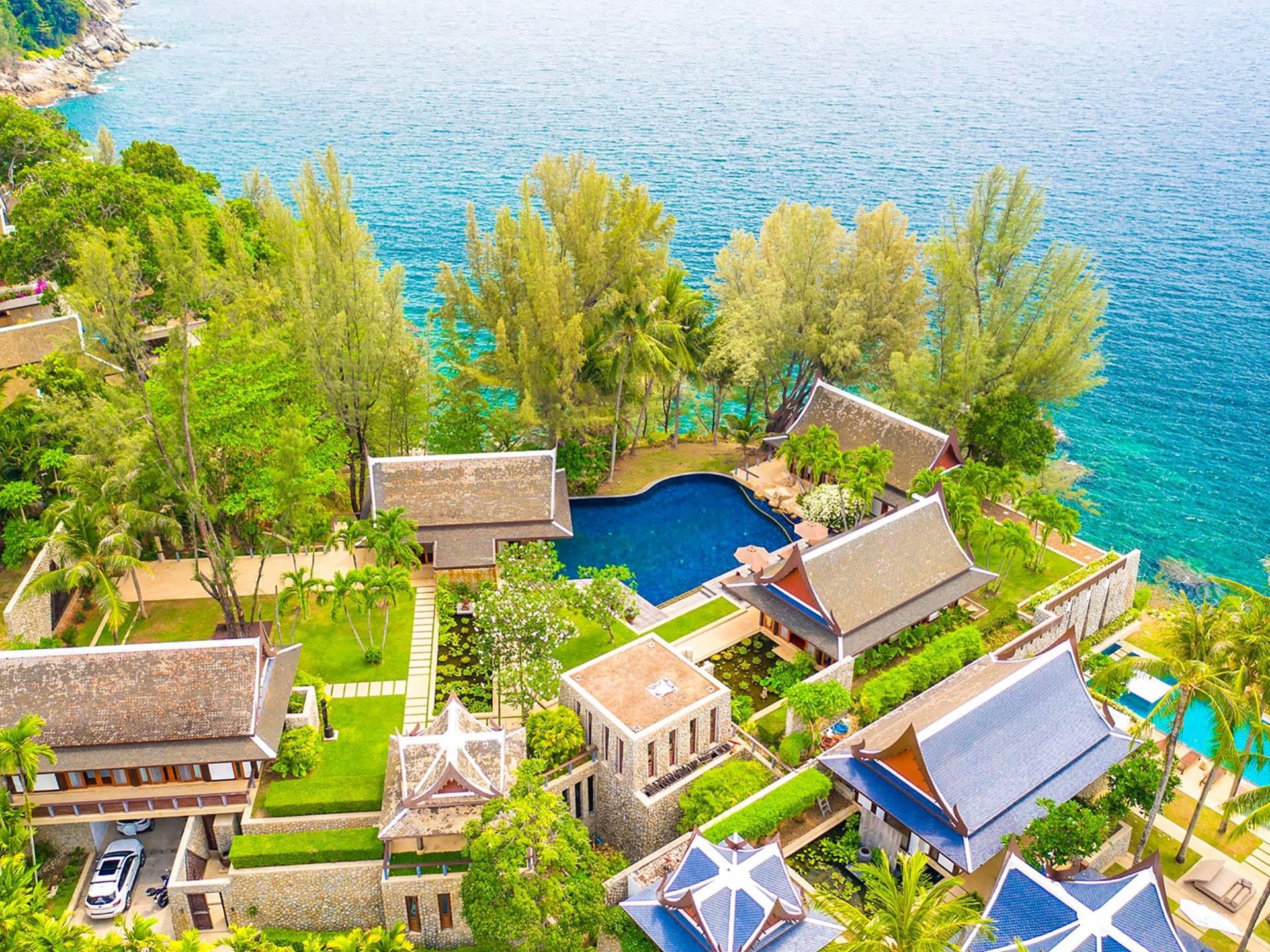 The villa follows a classic Thai design with four stand-alone pavilions, a mix of open-plan living spaces, and private bedrooms, each one embracing the sea views. Brimming with character, it features pitched-roofs, floor-to-ceiling windows, and polished hardwood floors, making it a spectacular paradise retreat. The villa is decorated throughout with a unique collection of beautiful antique furniture, Asian art and artifacts, and intricate wood carvings.