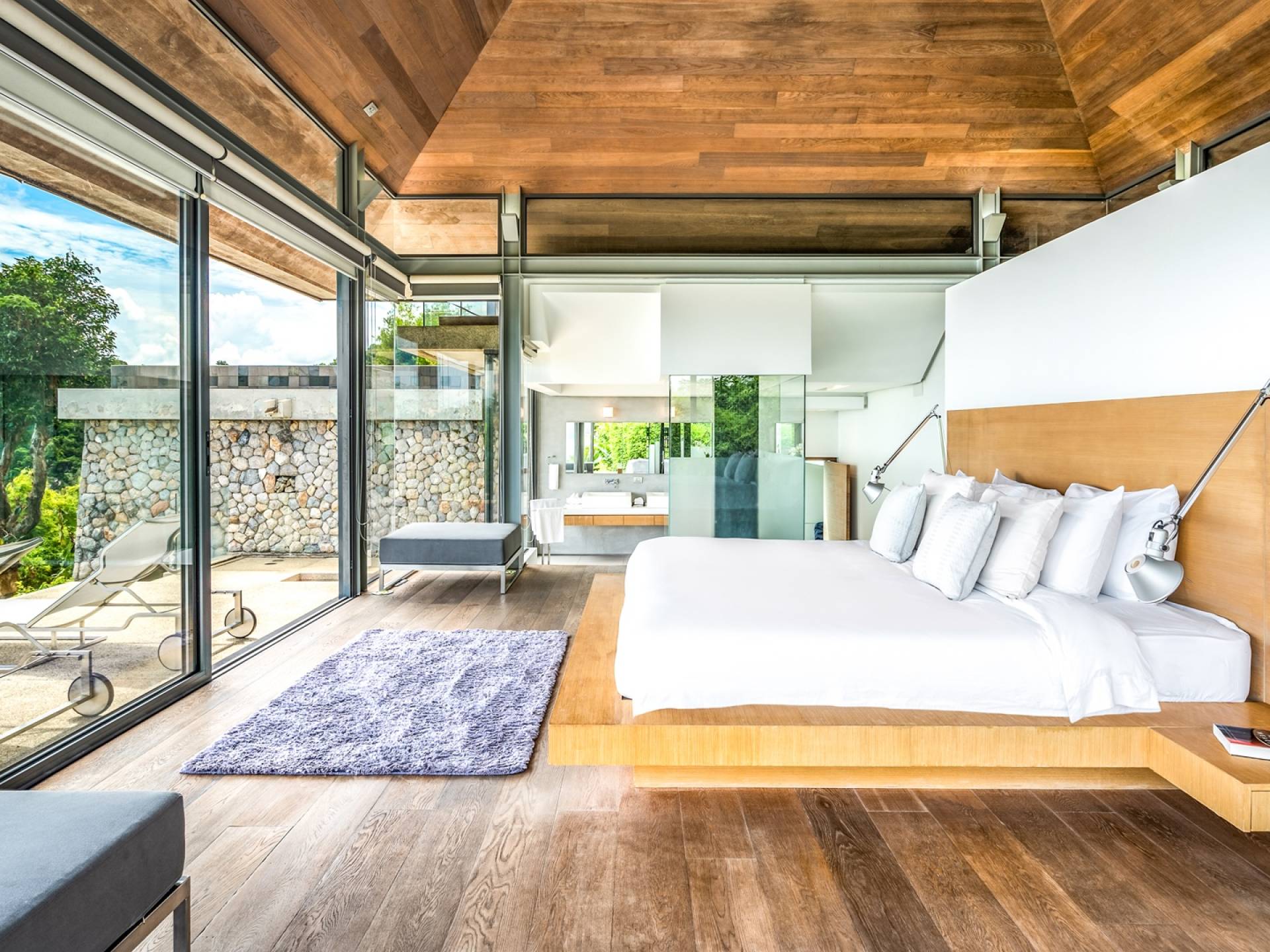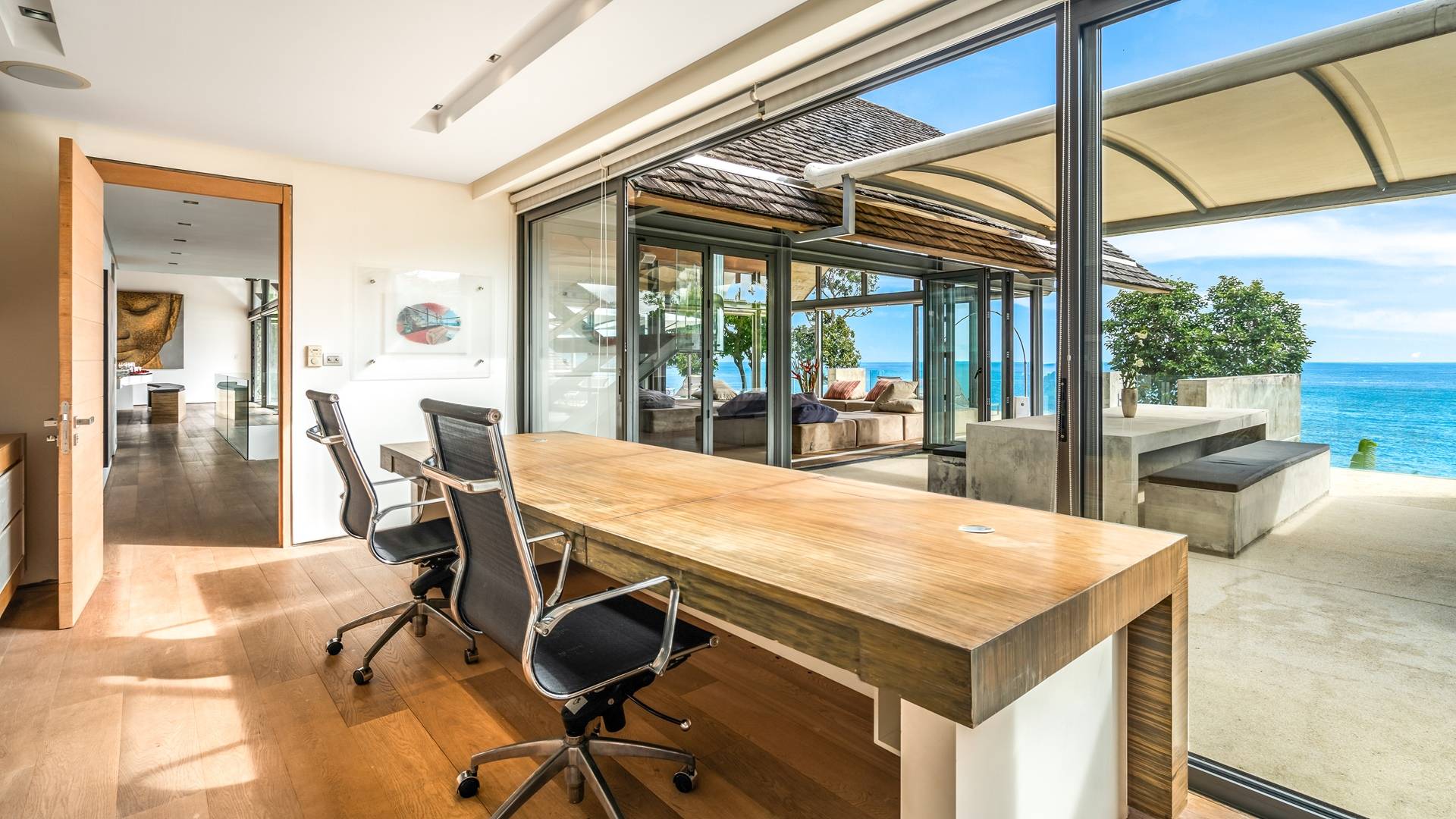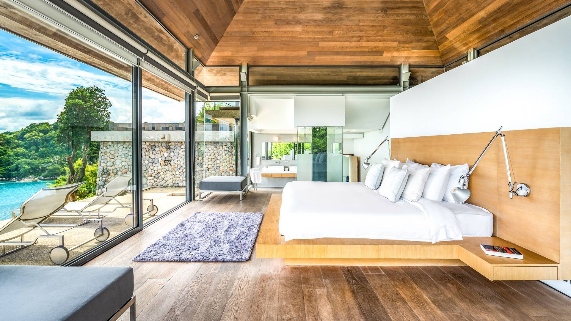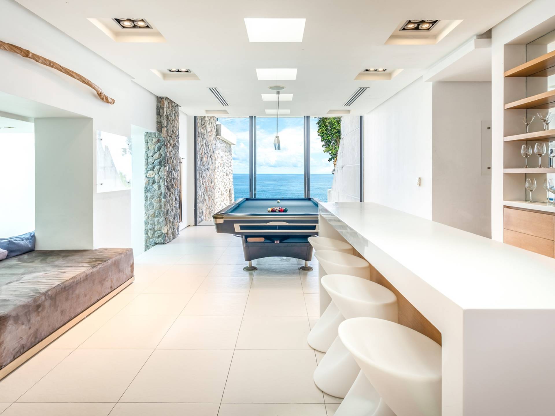 Oozing industrial chic, the covered outdoor dining space features a top-of-the-line barbecue unit built into the granite island kitchen counter and a long dinner table and benches made of matching brushed concrete. The addition of a poolside sala, perched on the corner of the plot and overlooking the Andaman sea, means sundowner rituals easily become an irresistible part of the stay. Meanwhile, an on-site office dedicated AV room, and an attached games room with a billiards table ensure there’s plenty to keep friends or colleagues entertained after a day of exploring or brainstorming without ever leaving the villa’s enchanting view-soaked surrounds.